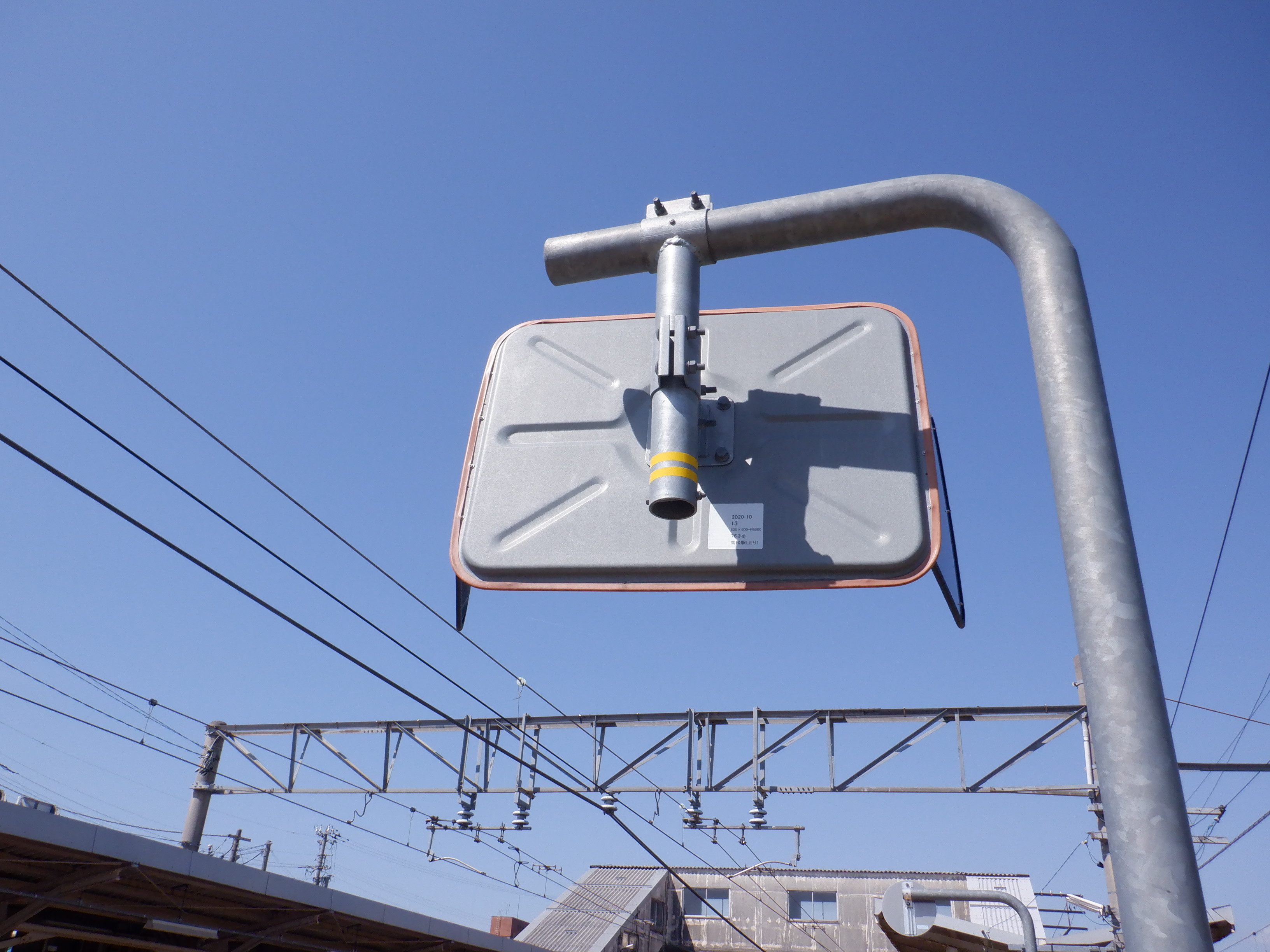 1番のりばのワンマンミラー。なぜか設置場所が「金丸駅」の表示になっています。実は金丸駅のワンマンミラーの一つが設置場所が「高松駅」になっていますが、そのミラーが少し複雑な形をしているため、何か事情ができたのだと思います。