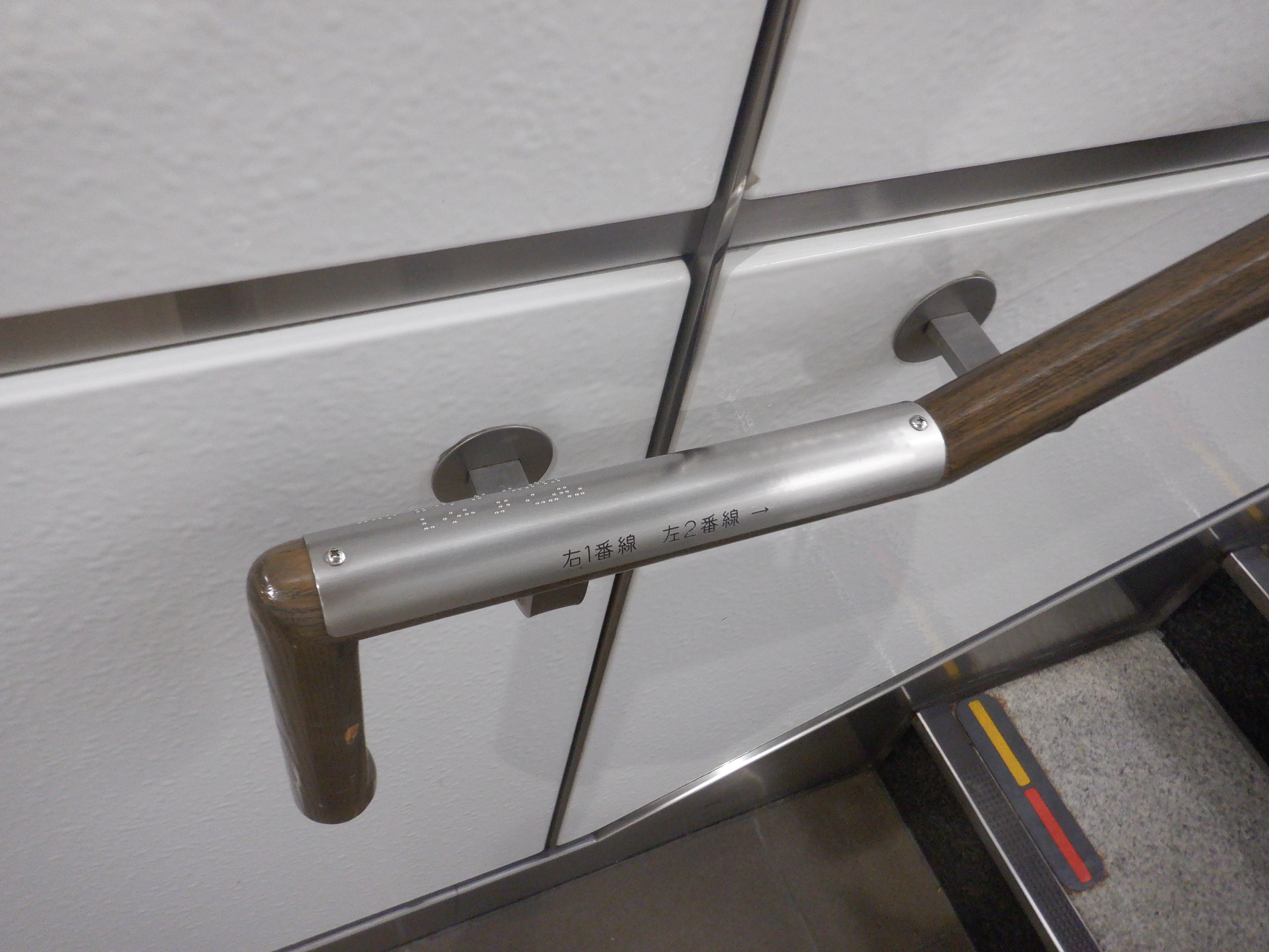 階段とエスカレーターの間。駅名標には階段とエスカレーターの案内が貼られています。