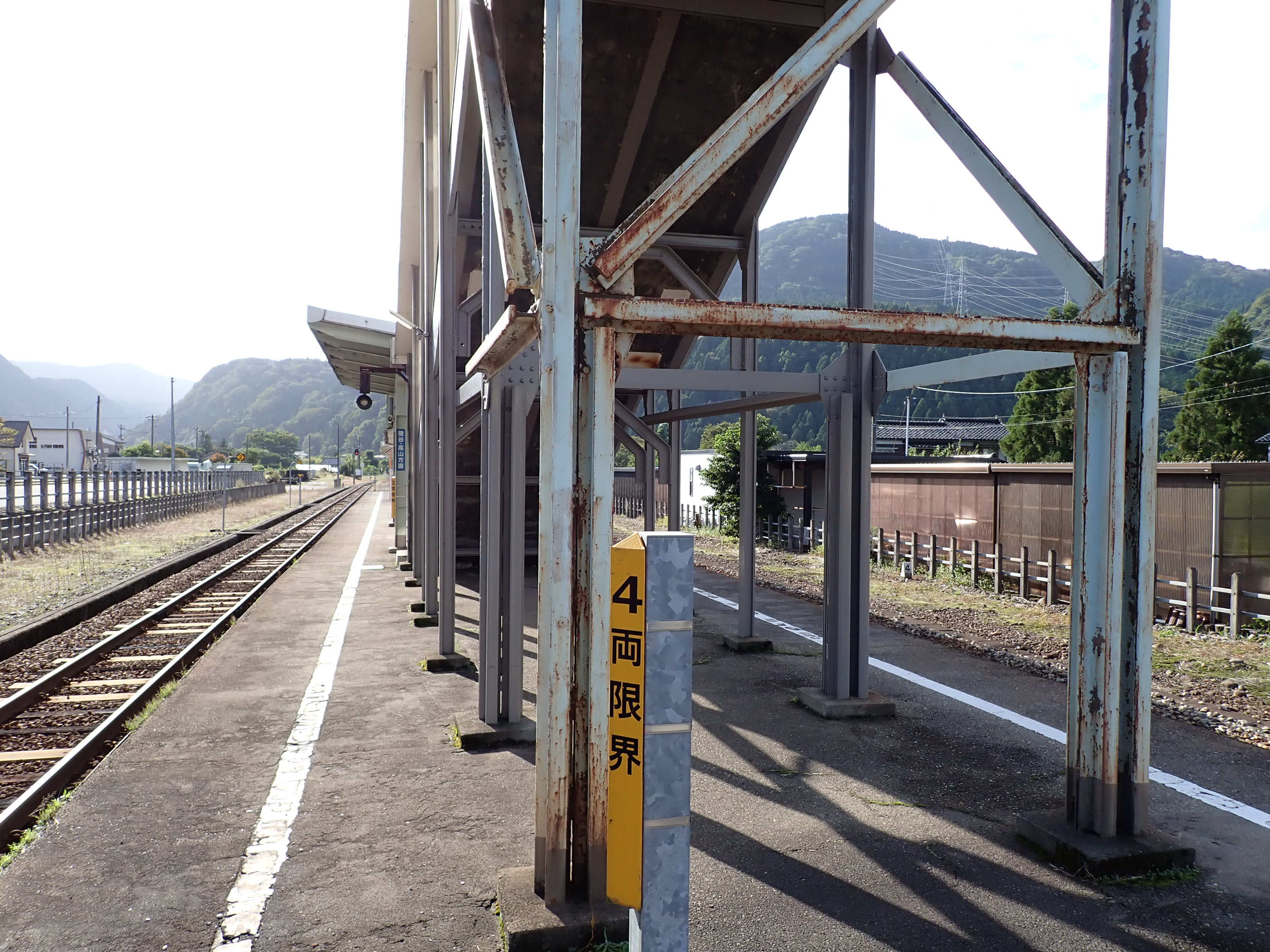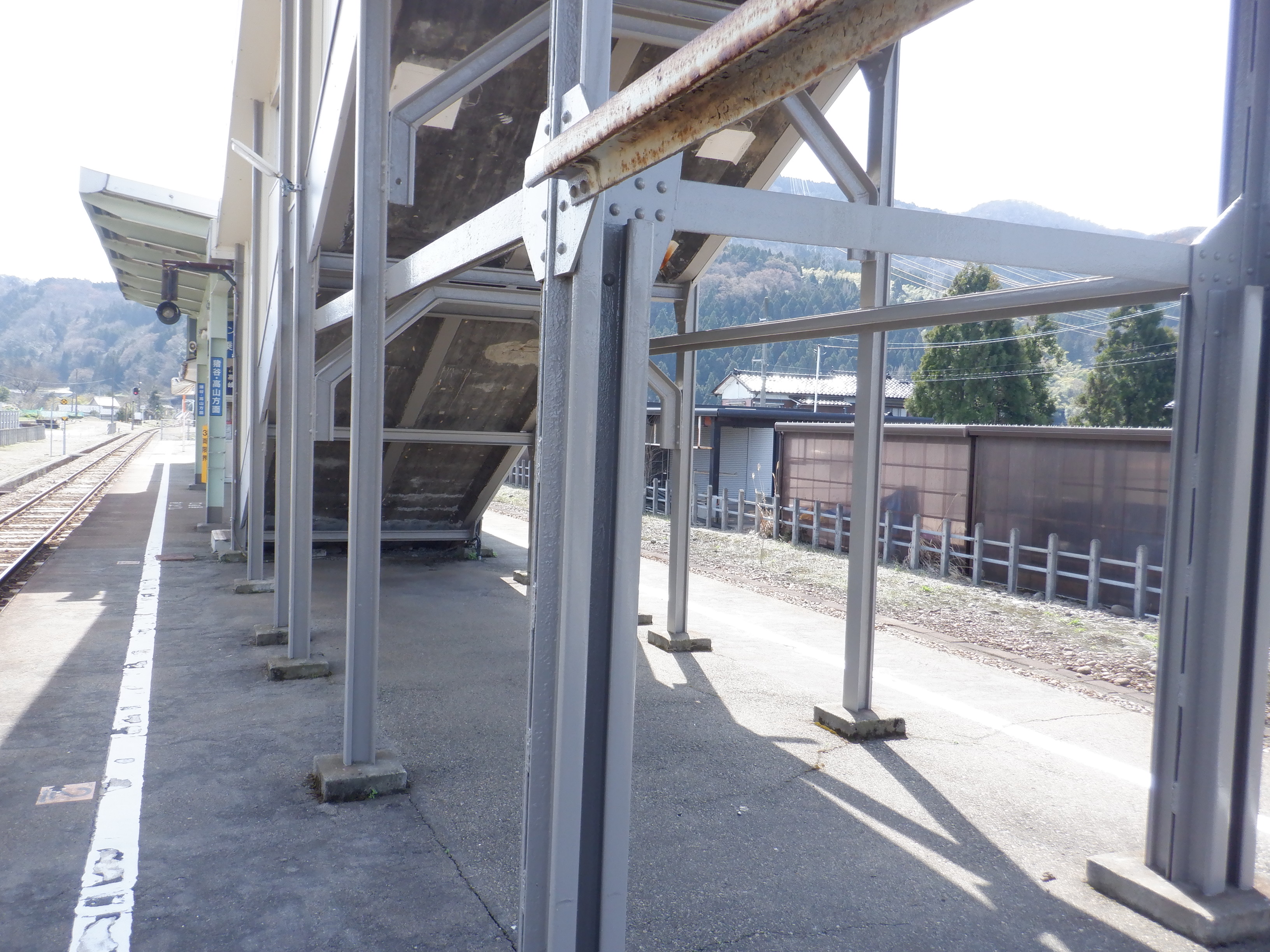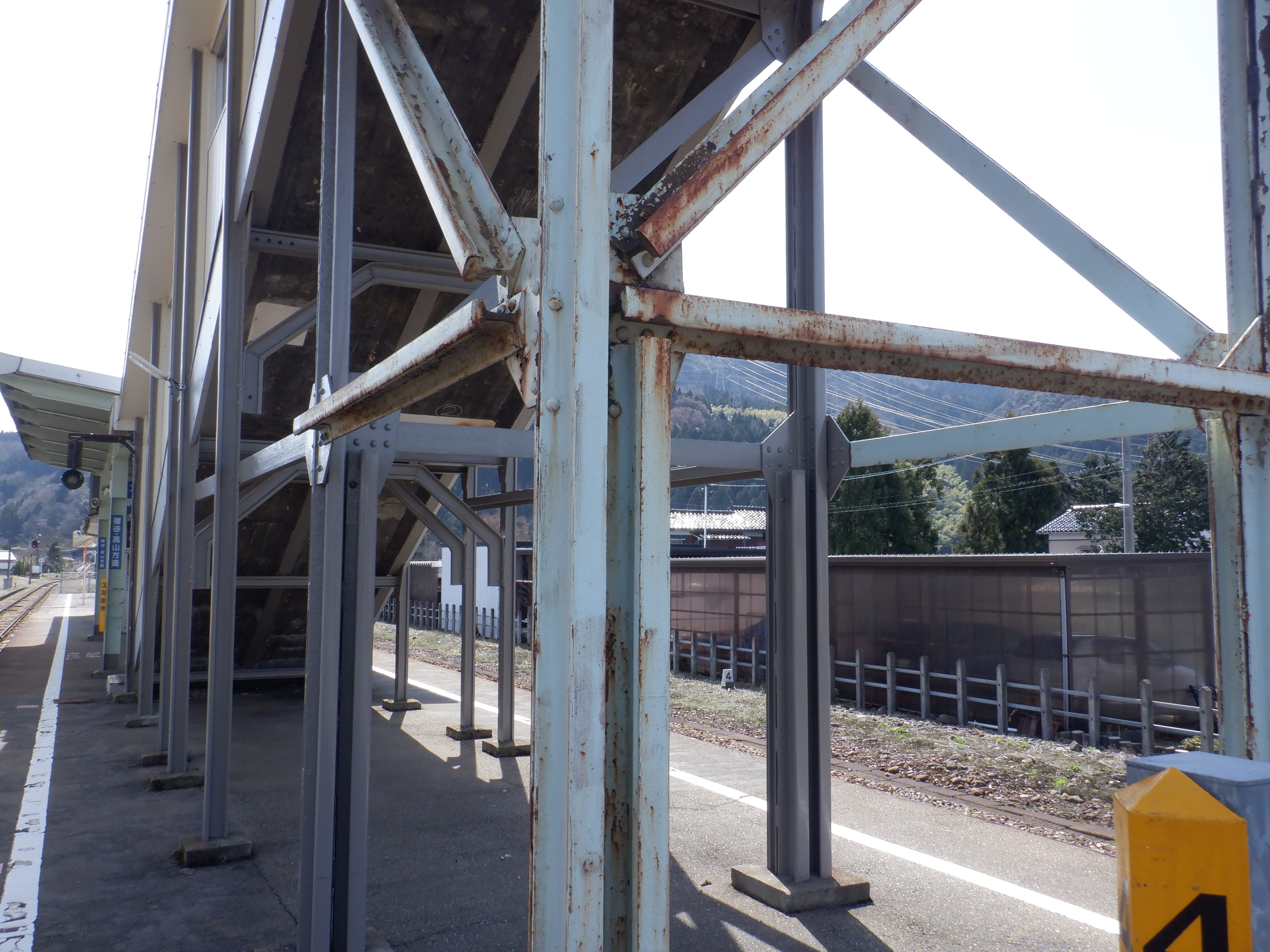 ホームの跨線橋付近から。支柱も塗装がされていますが、東八尾駅側だけそのままのようです。