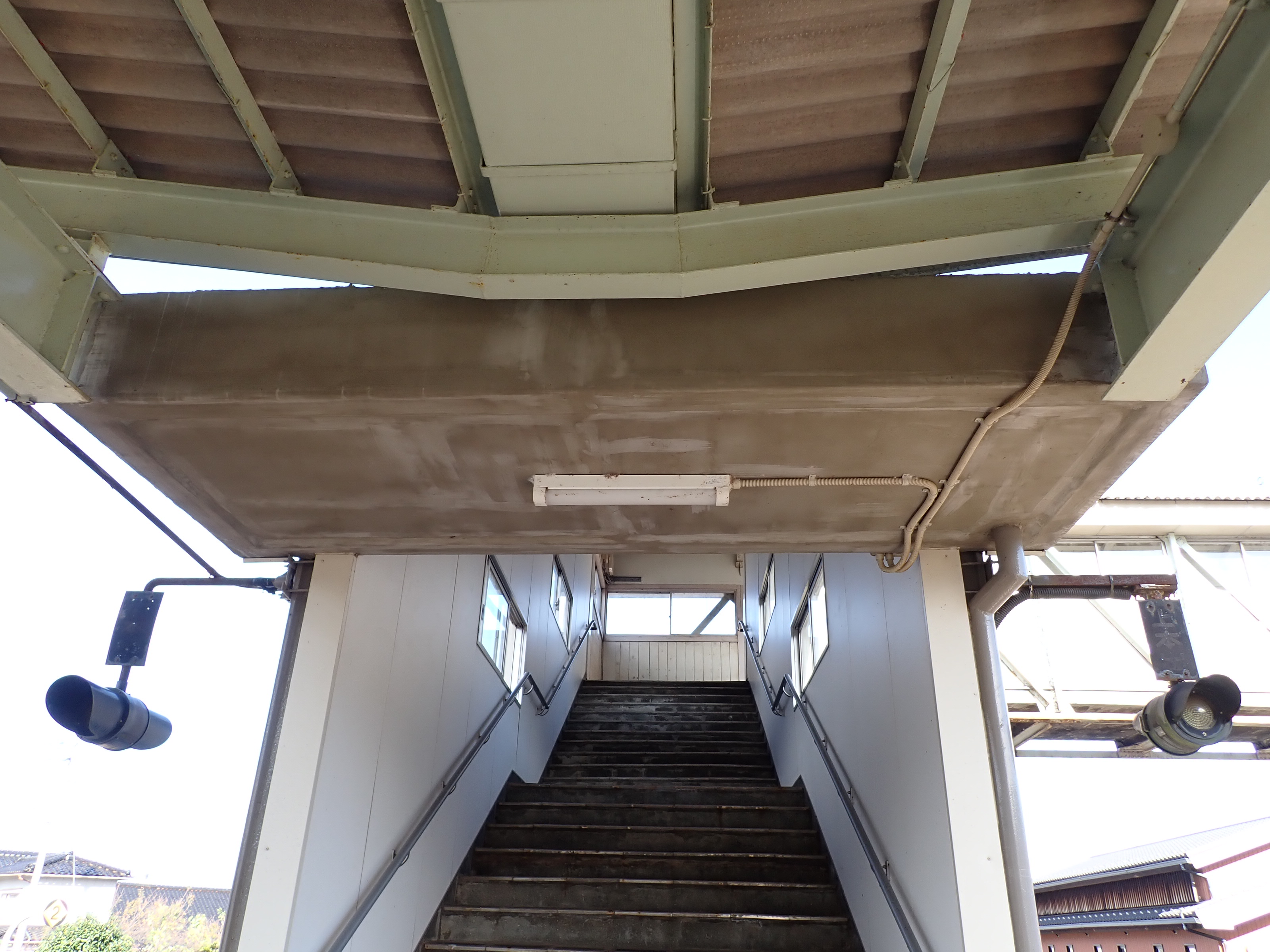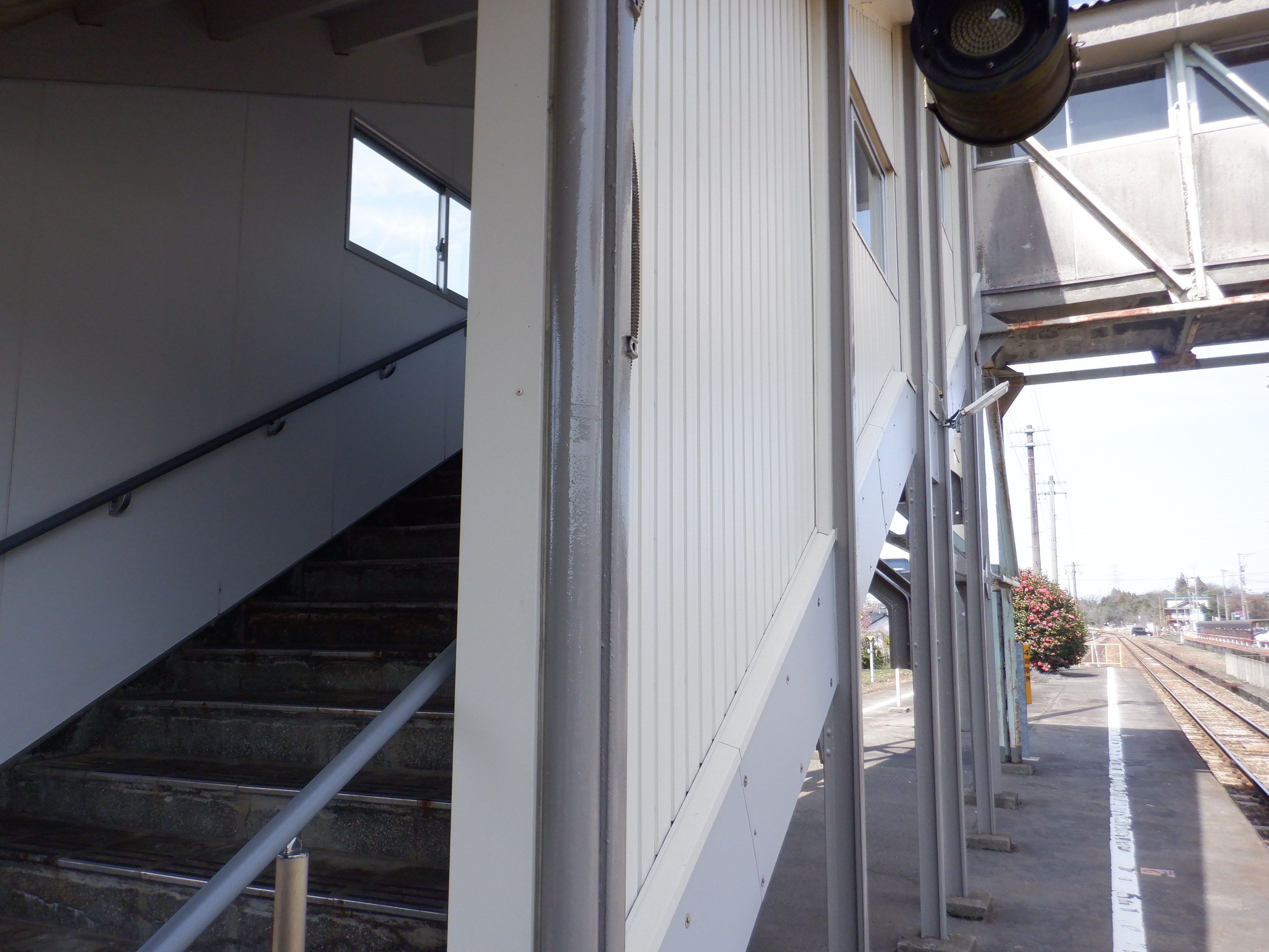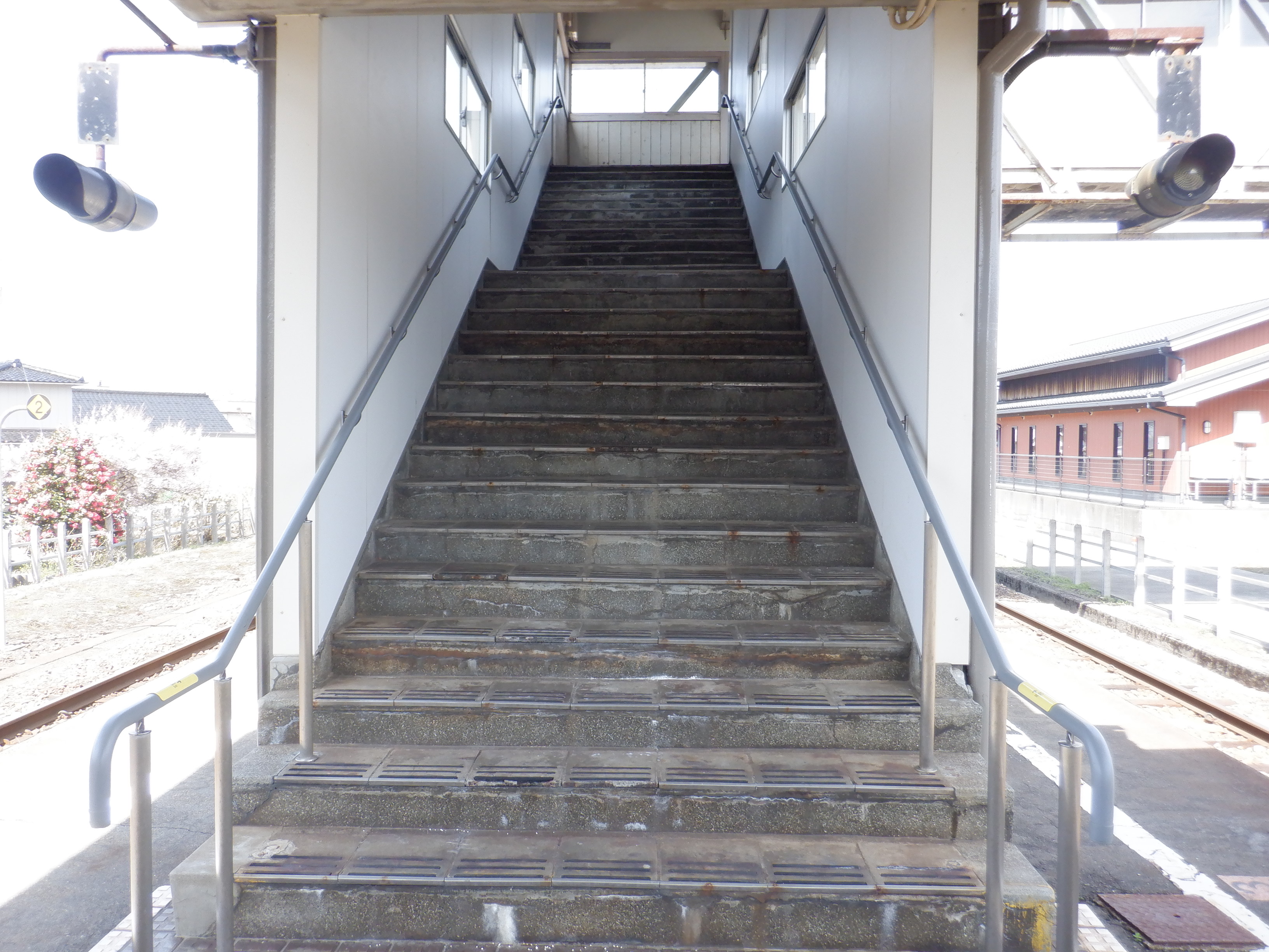 駅舎横から見た跨線橋階段。