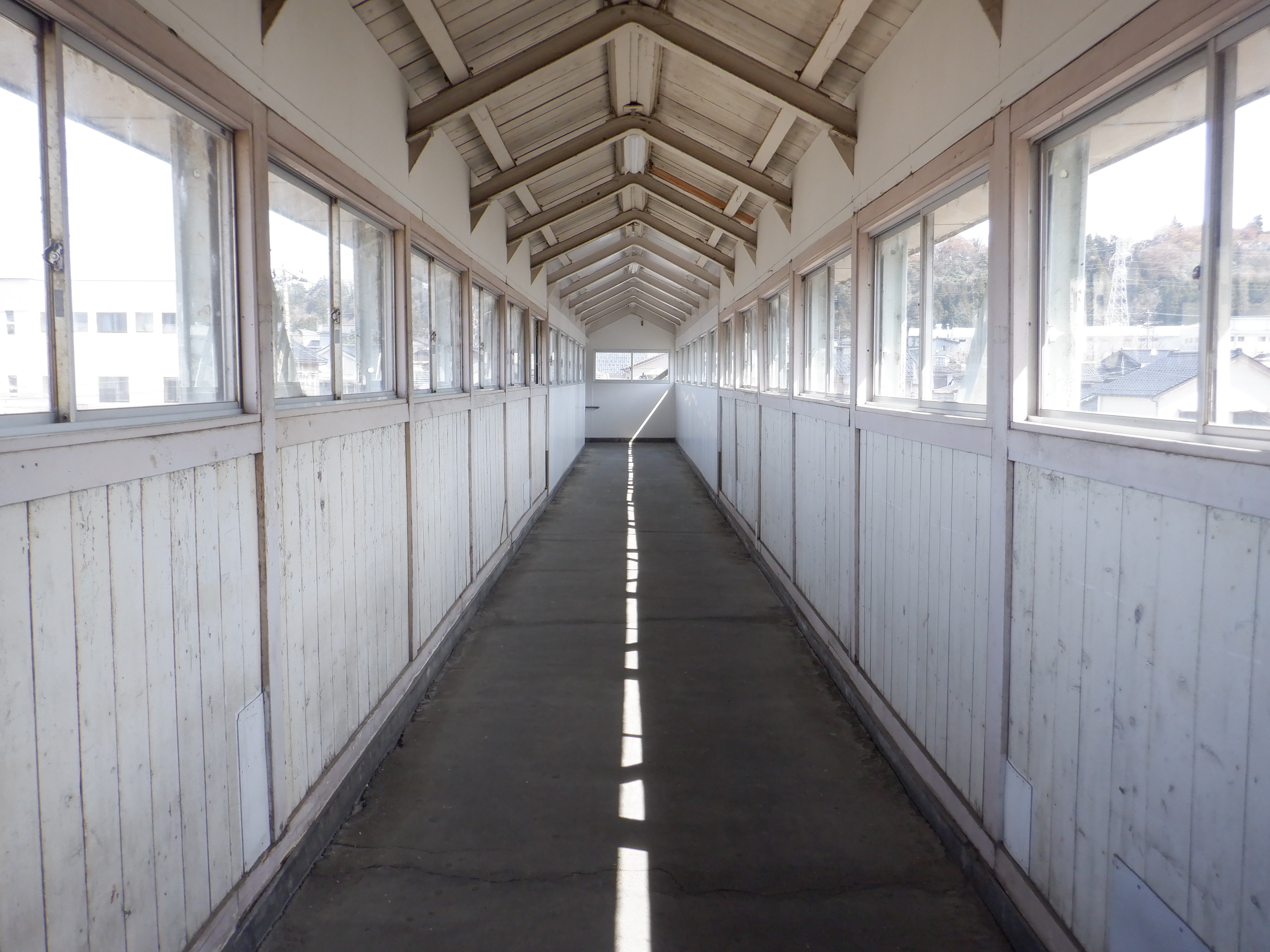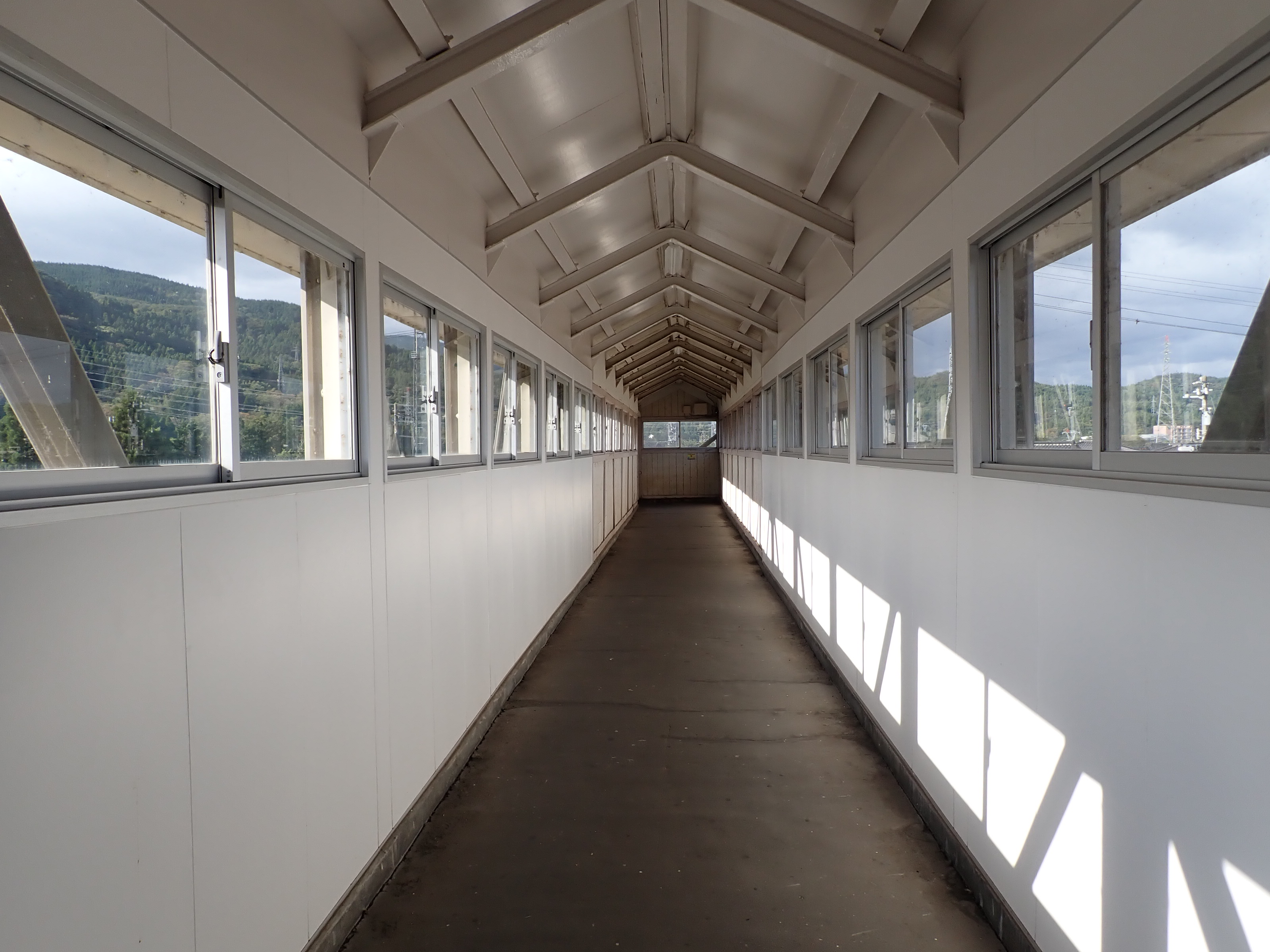 跨線橋内の様子。駅舎側半分が新しくなっていて、ホーム側半分が古いままです。