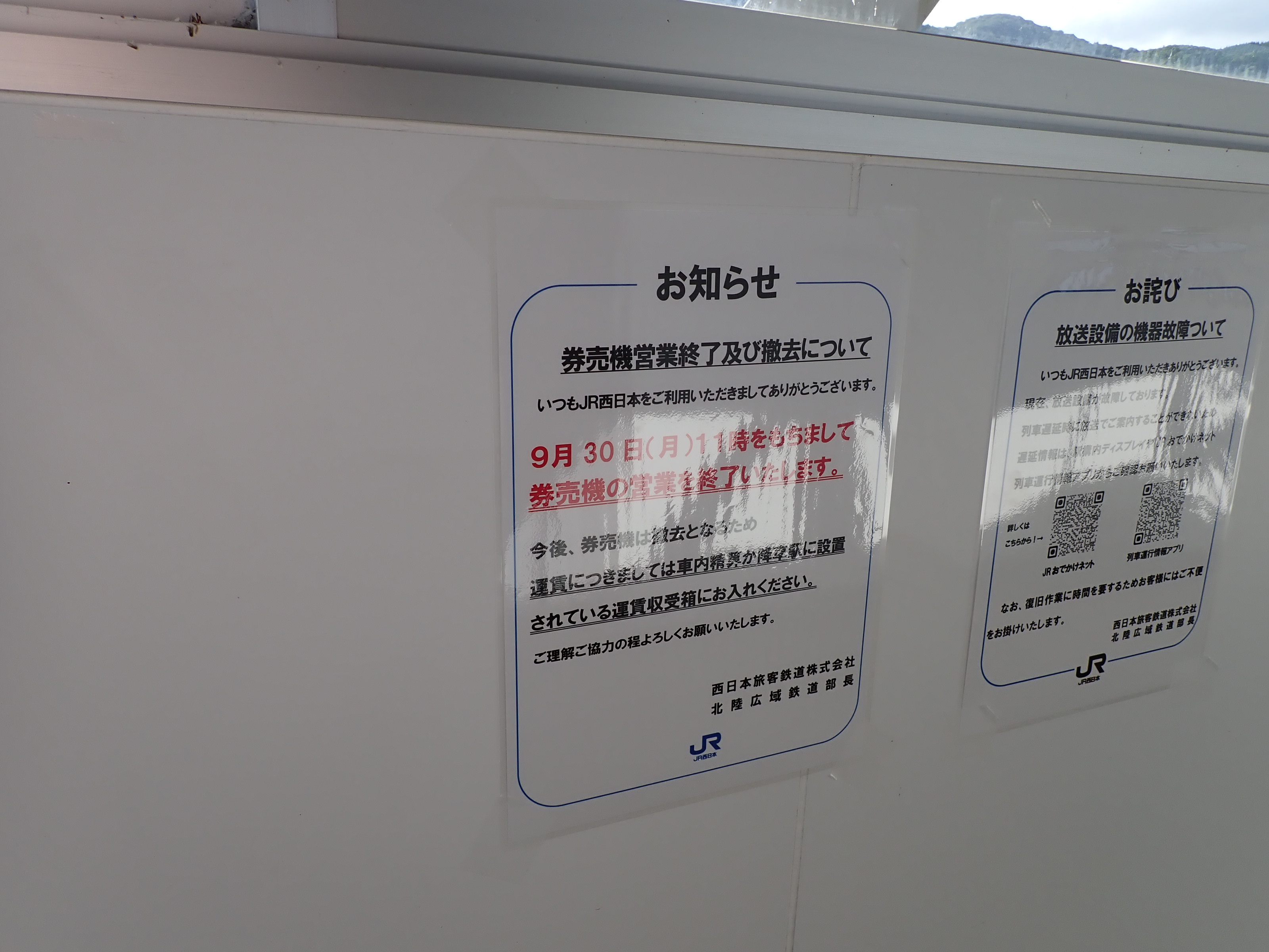 跨線橋に貼られた券売機撤去の案内。