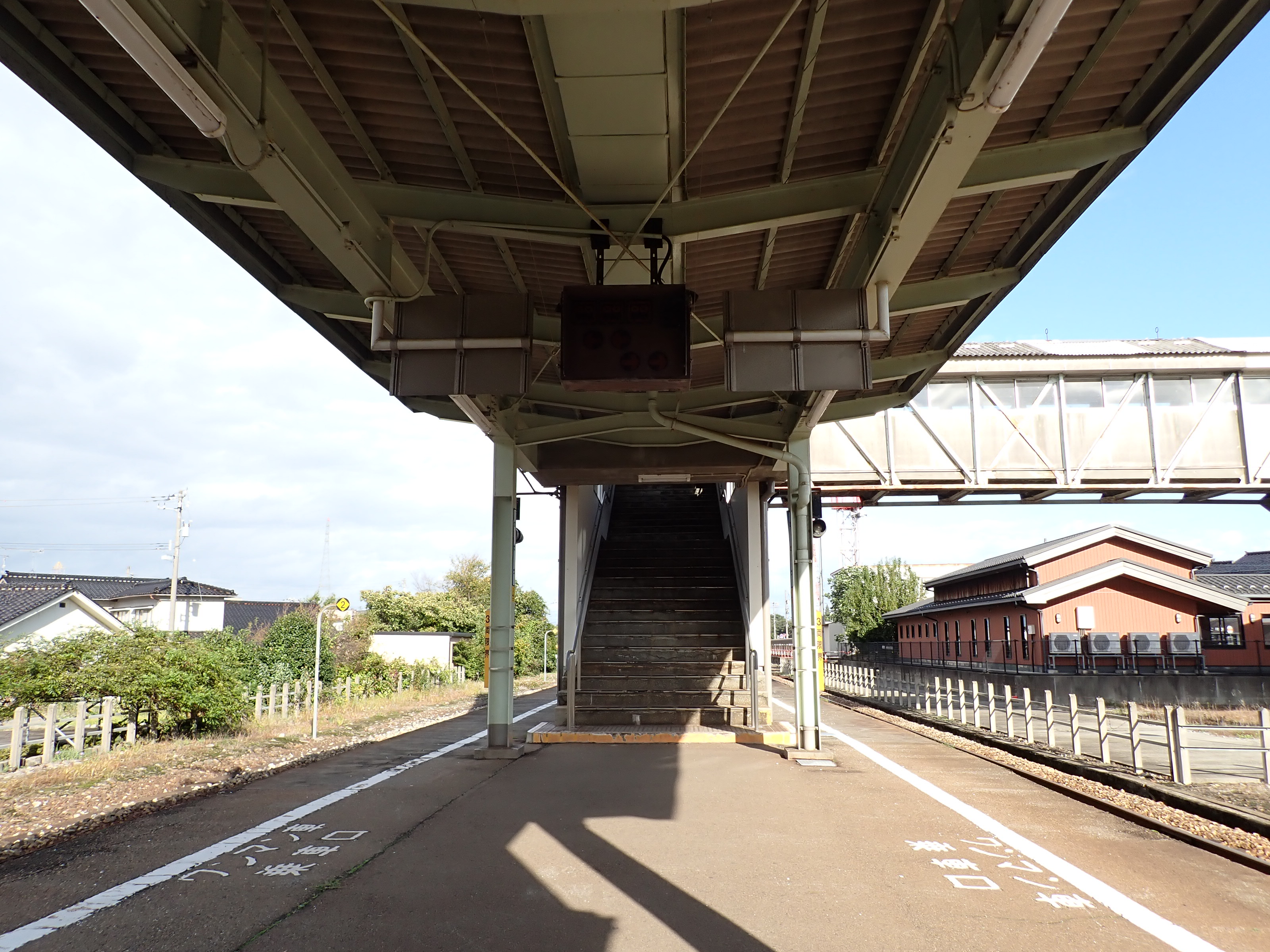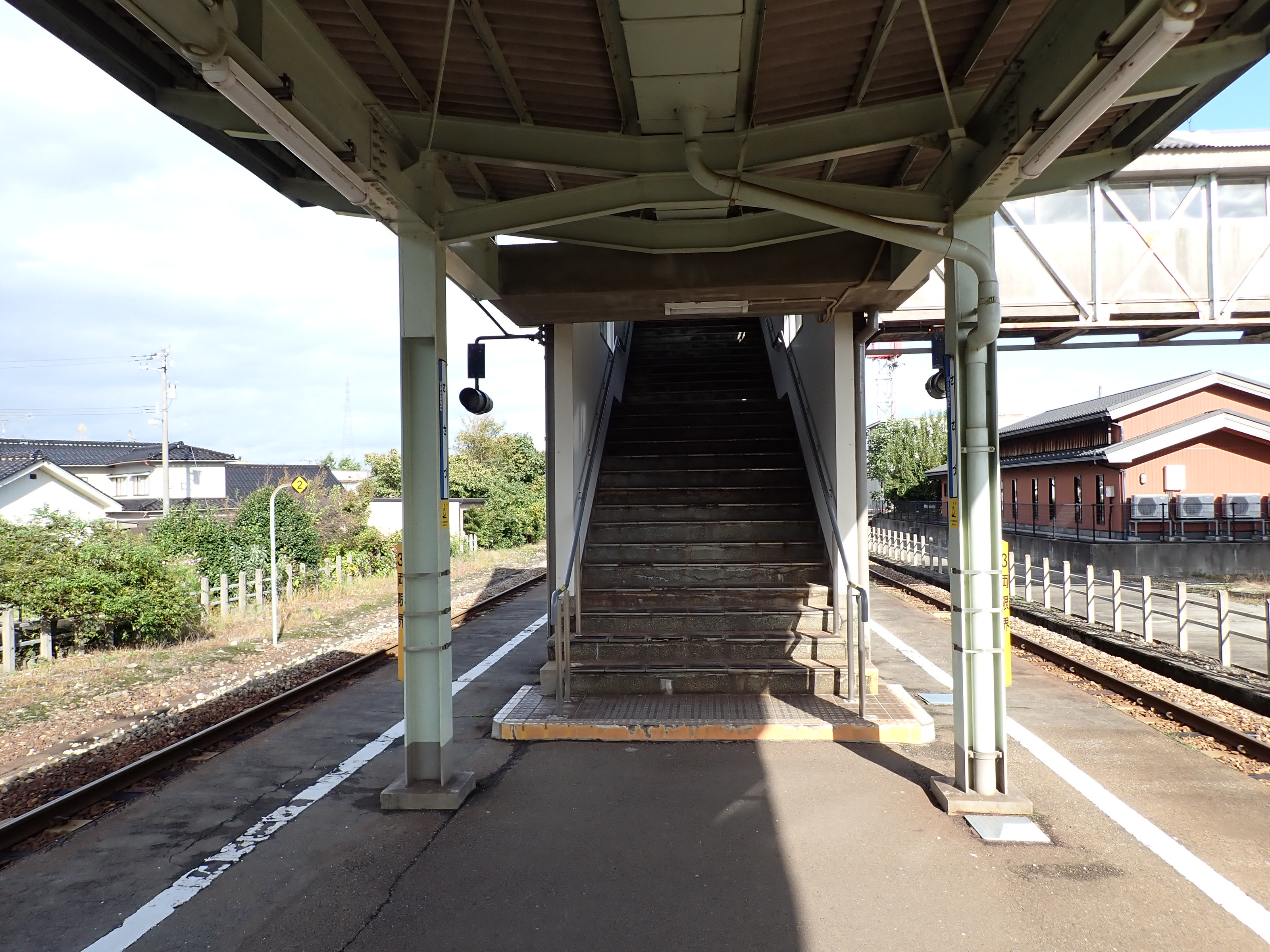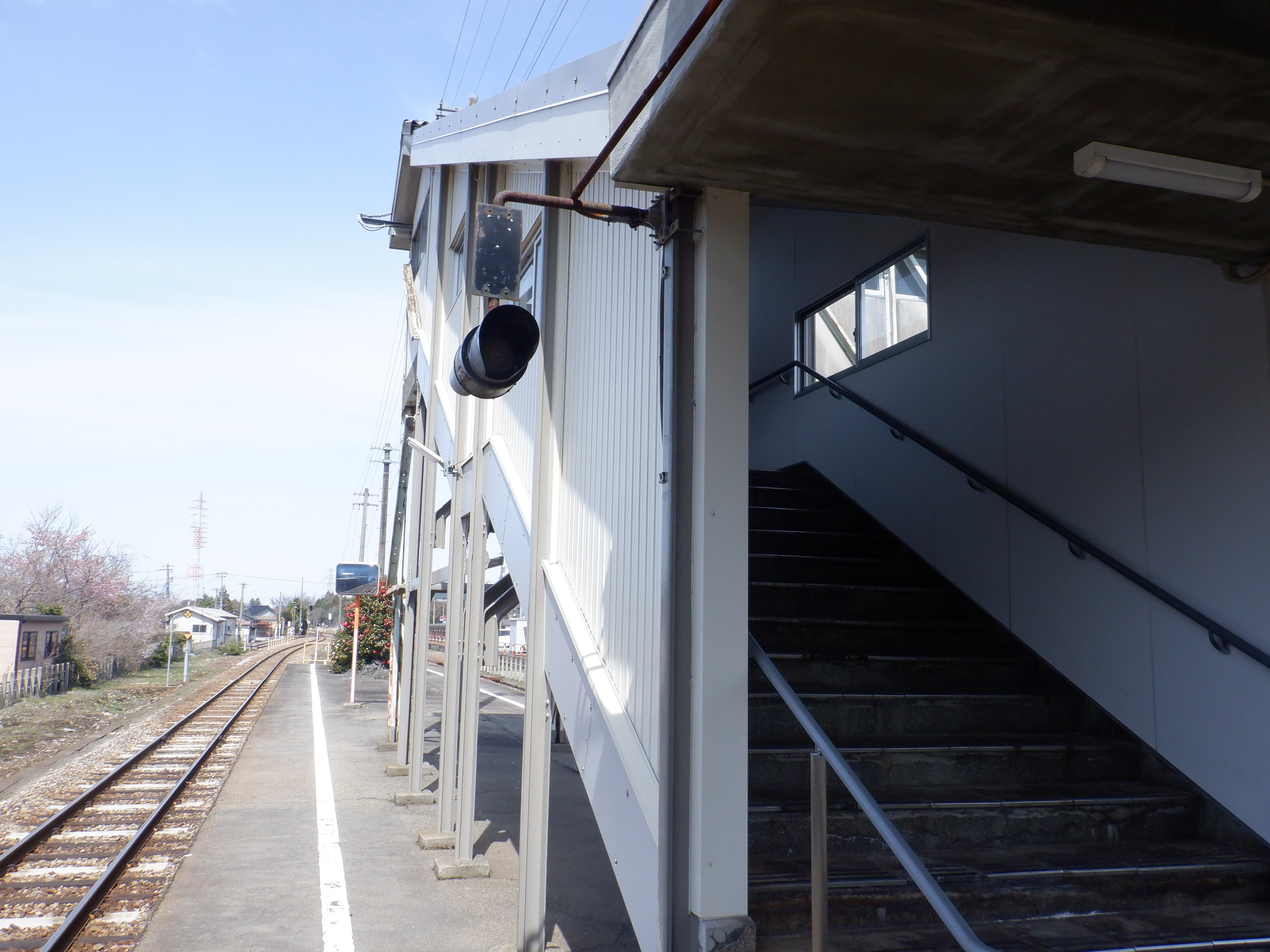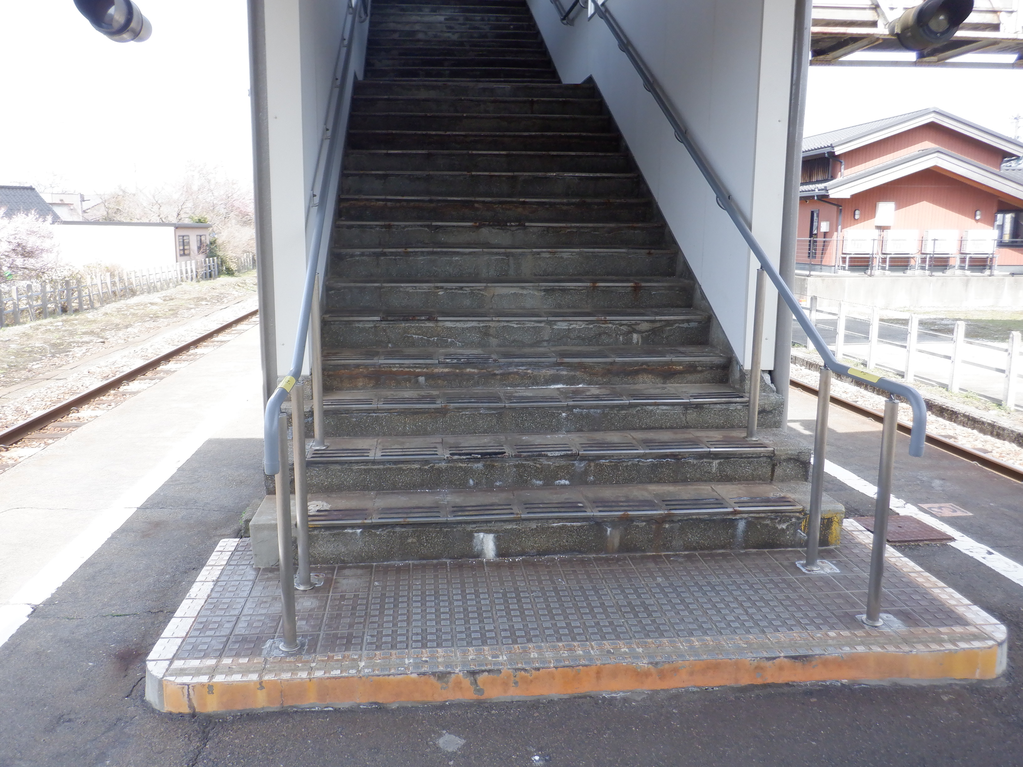 駅舎横から見た跨線橋のホーム側階段。