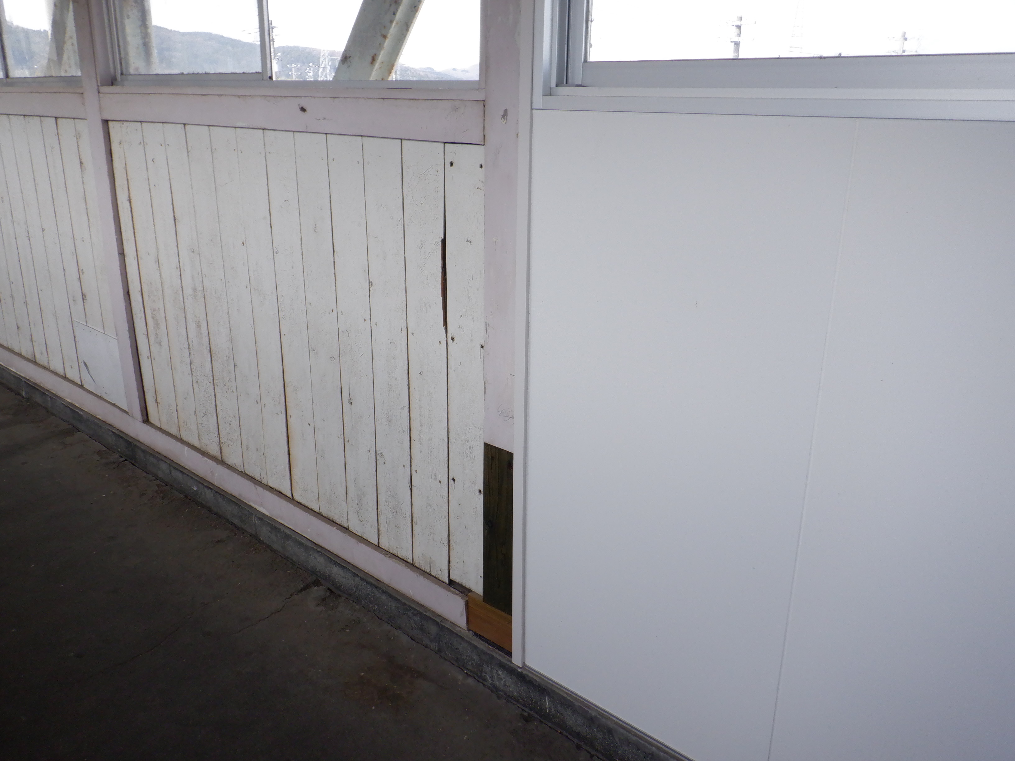駅舎横から見た跨線橋の跨線部分。半分だけ新しいのが分かります。