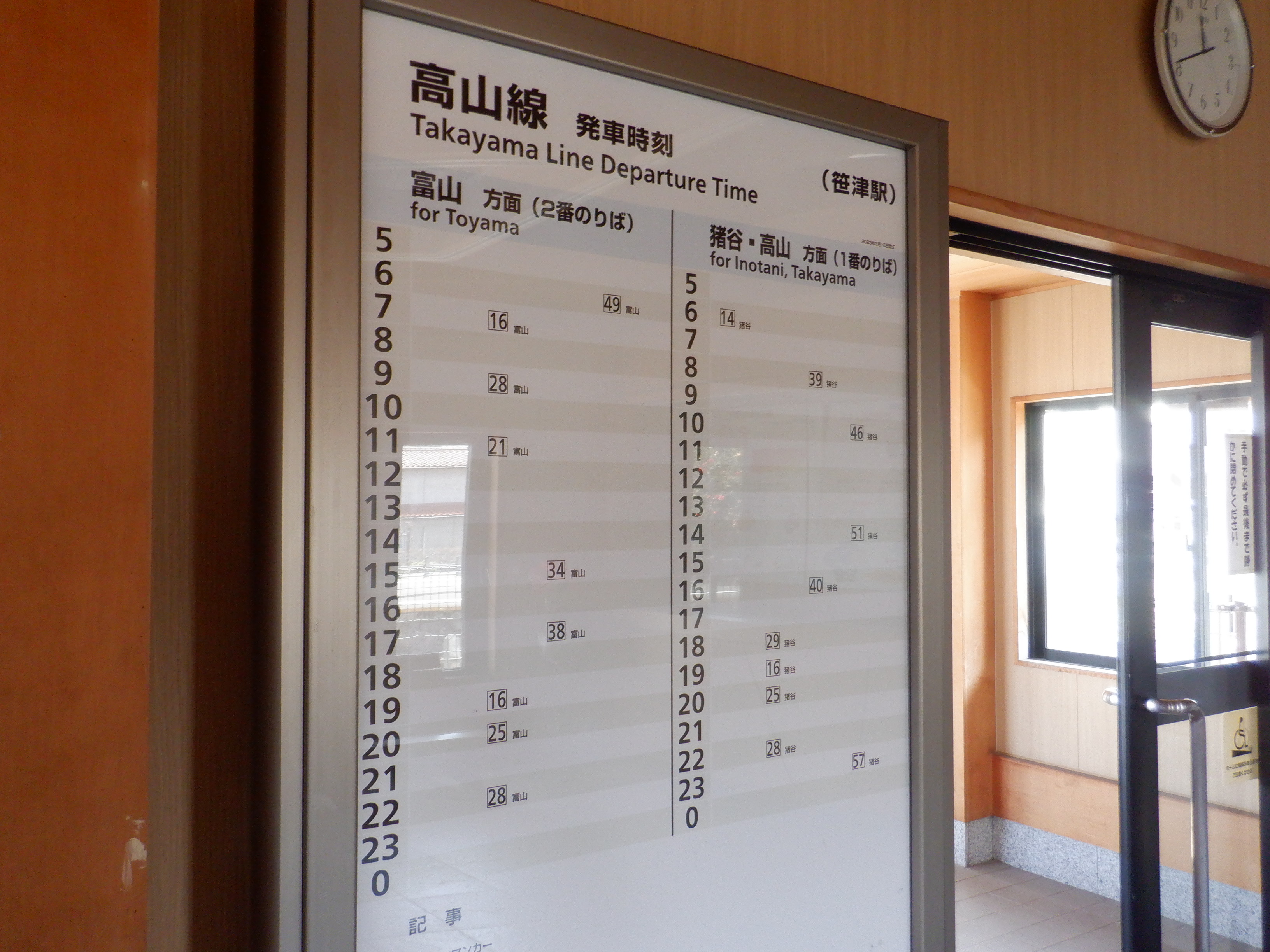 笹津駅の2023年と2024年の様子です。跨線橋階段部分の壁が新しくなり、そこにあった駅名標がなくなったり、2024年は券売機が撤去されました。