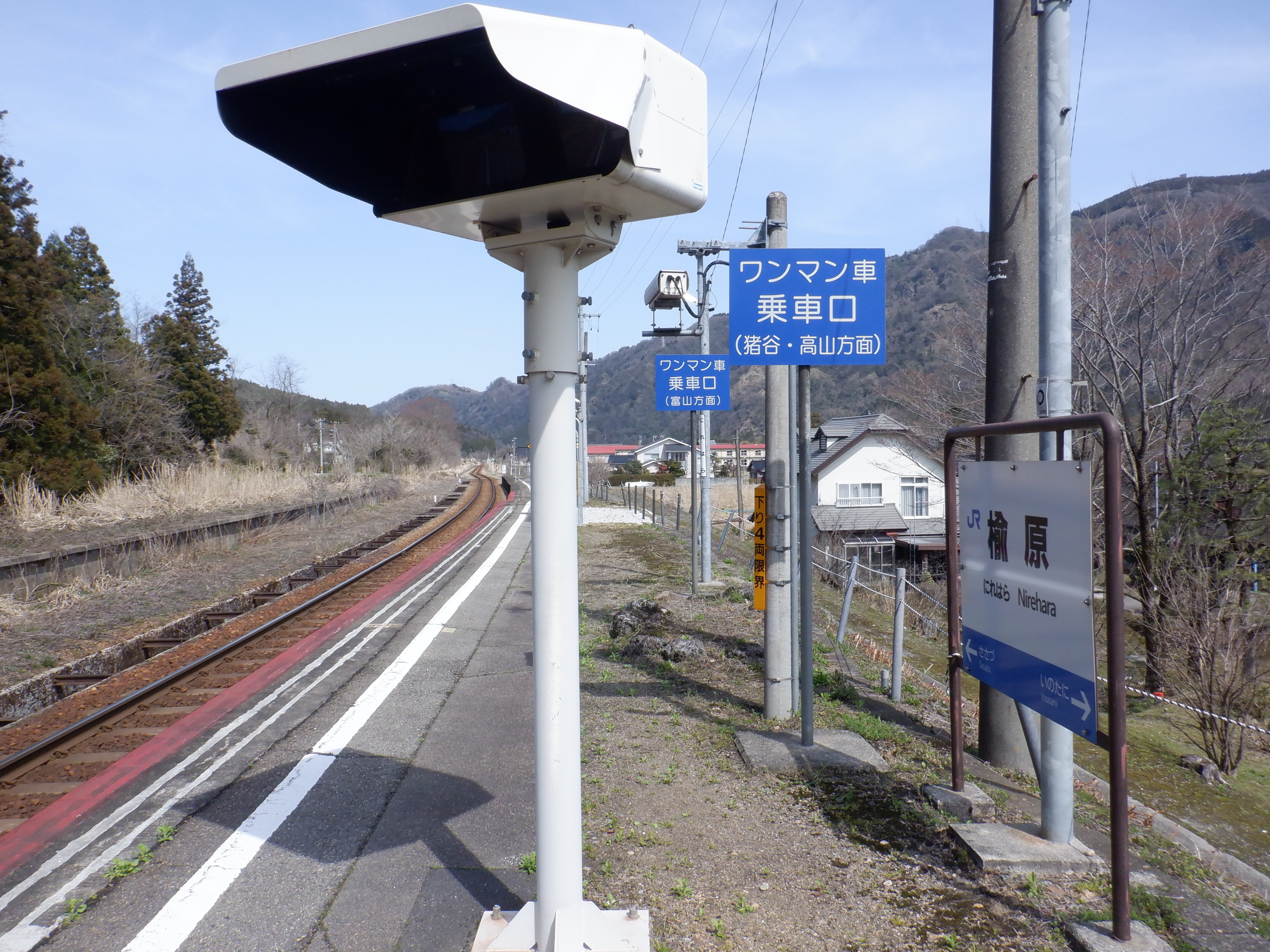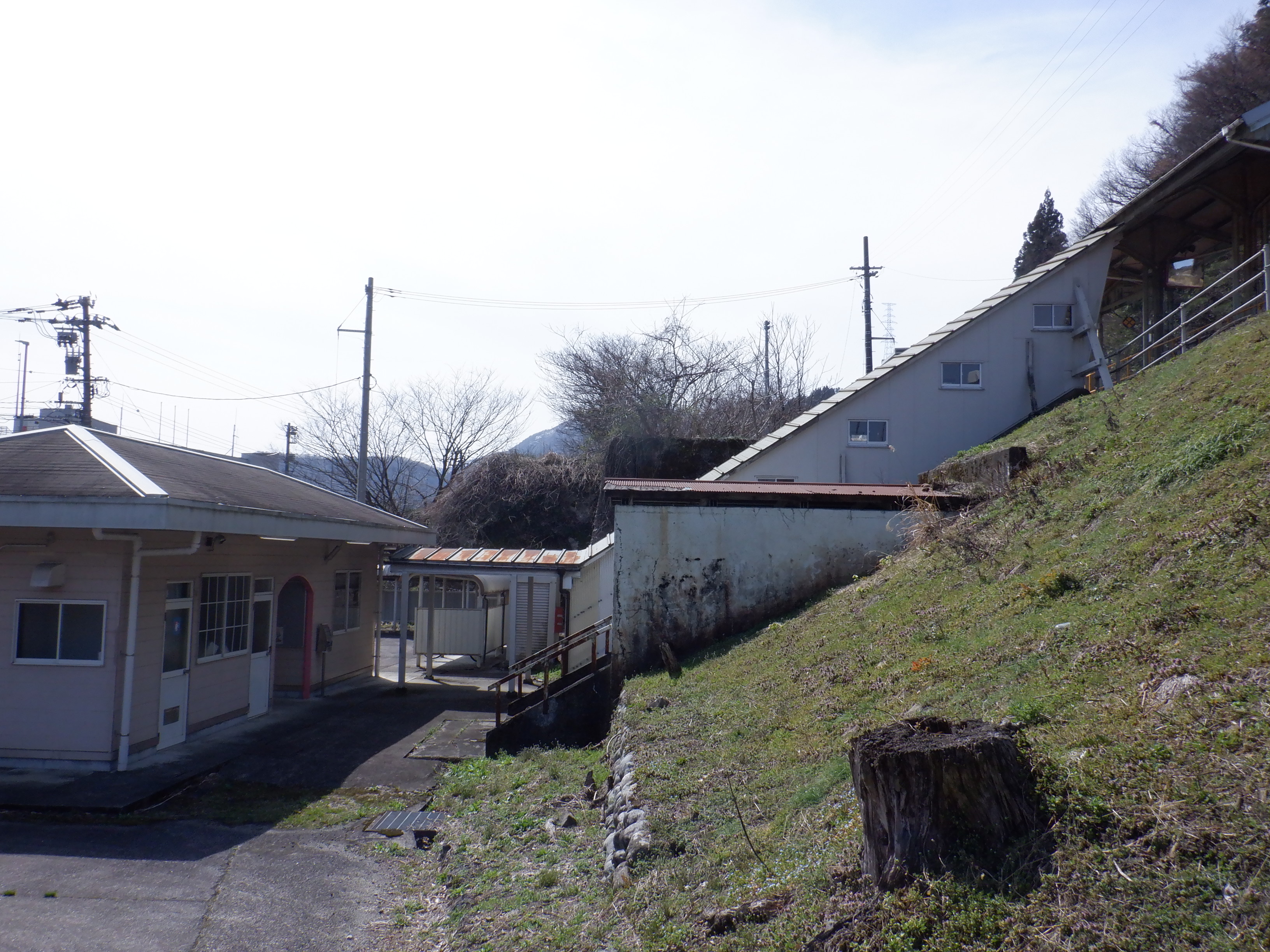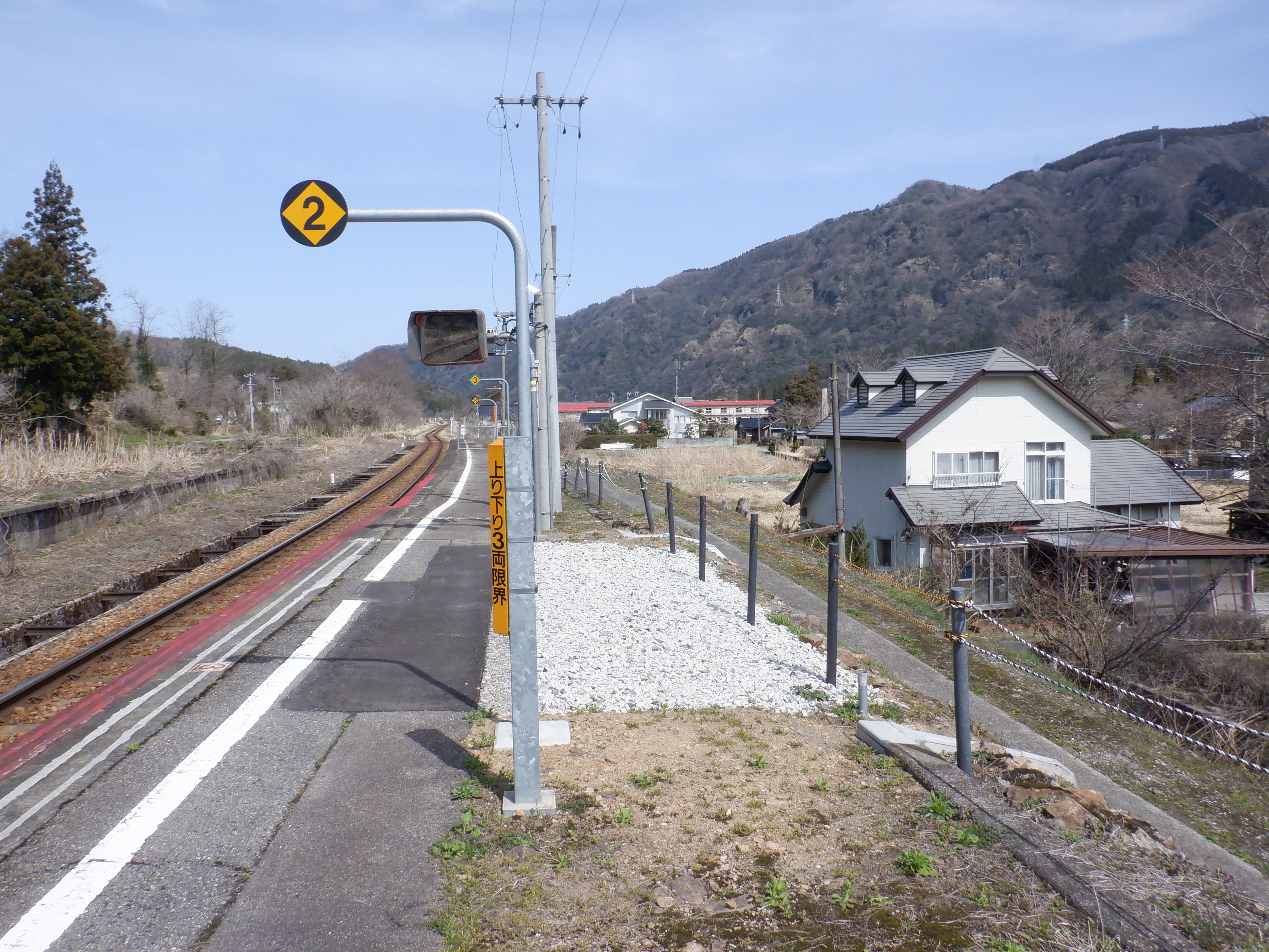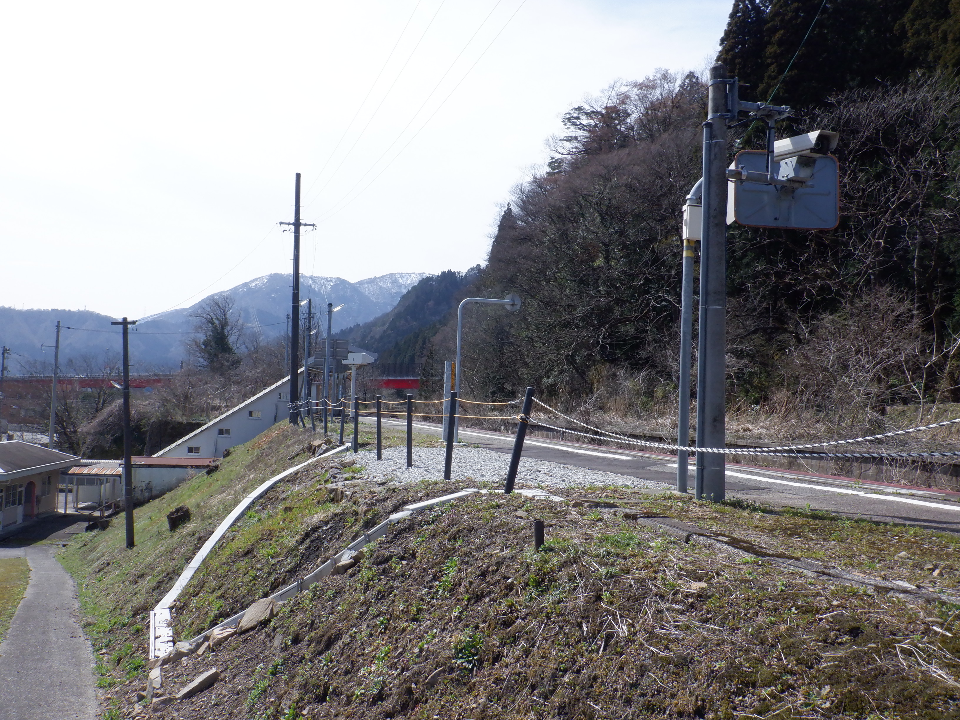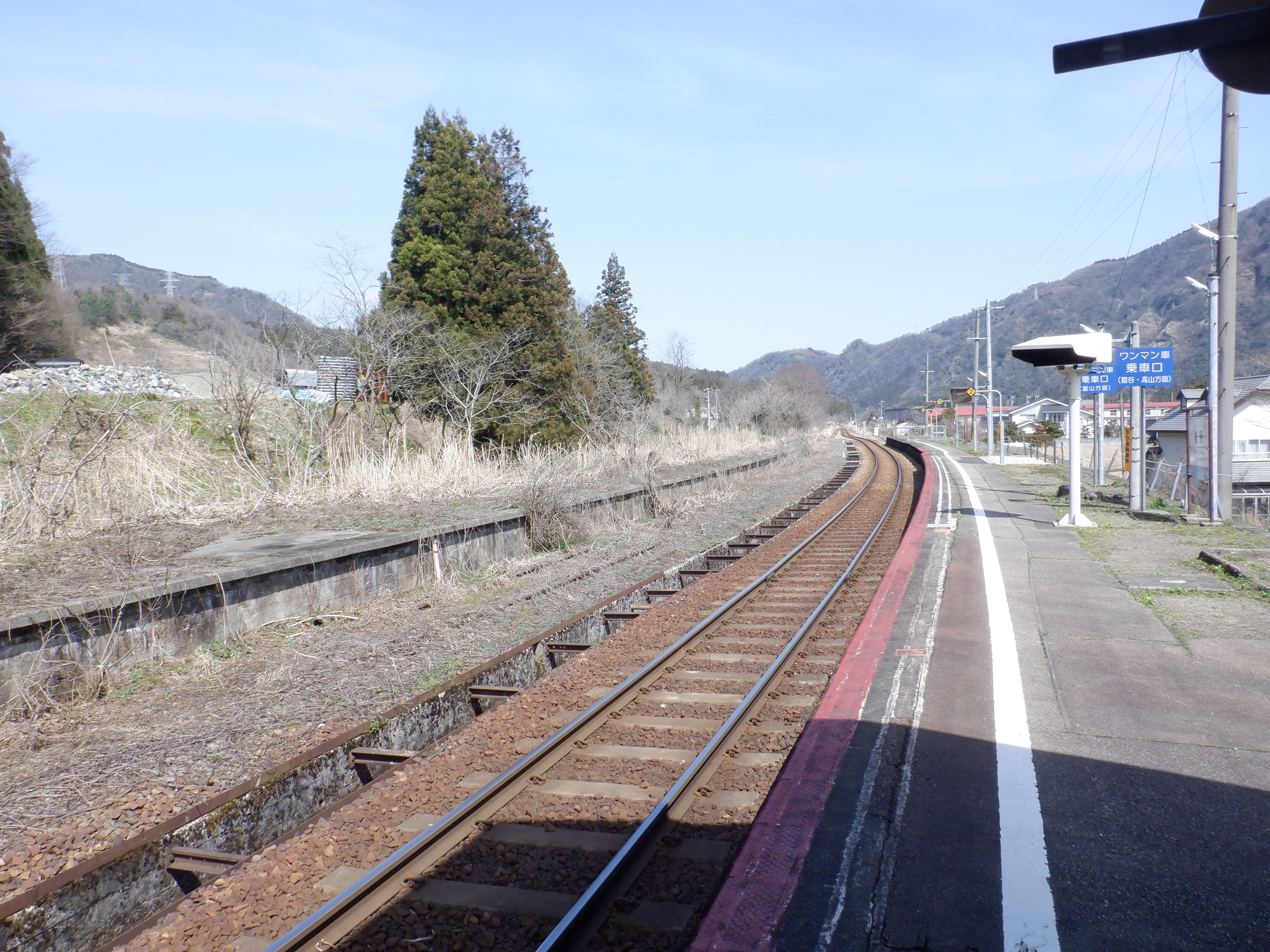 季節的に草などがないため、反対側のホーム跡を改めて撮ってあります。また、ホームの待合室が撤去されており、さらに猪谷駅側のワンマンミラーの位置が変わっていました。