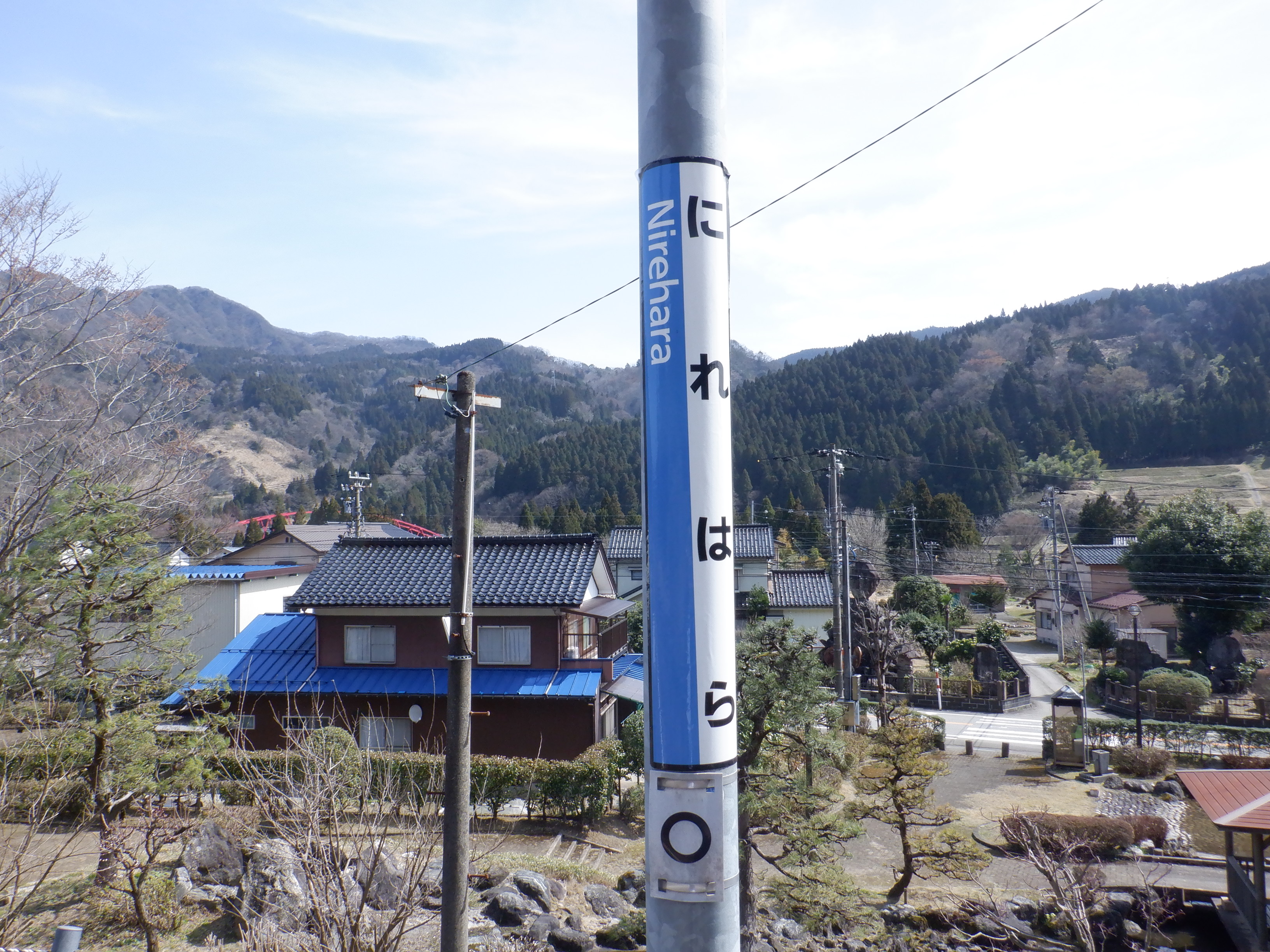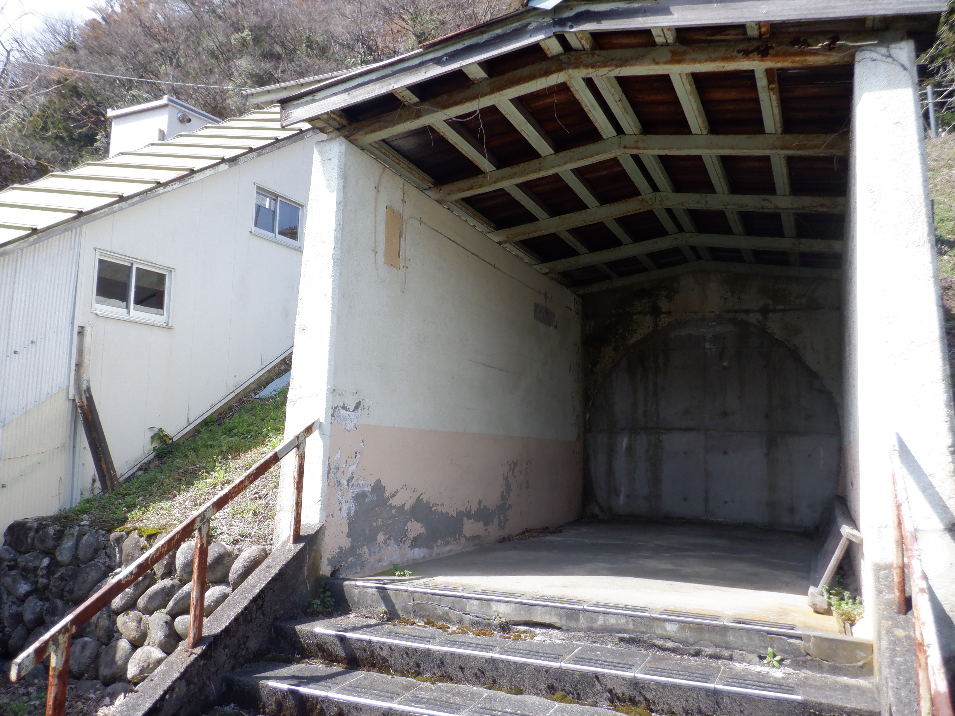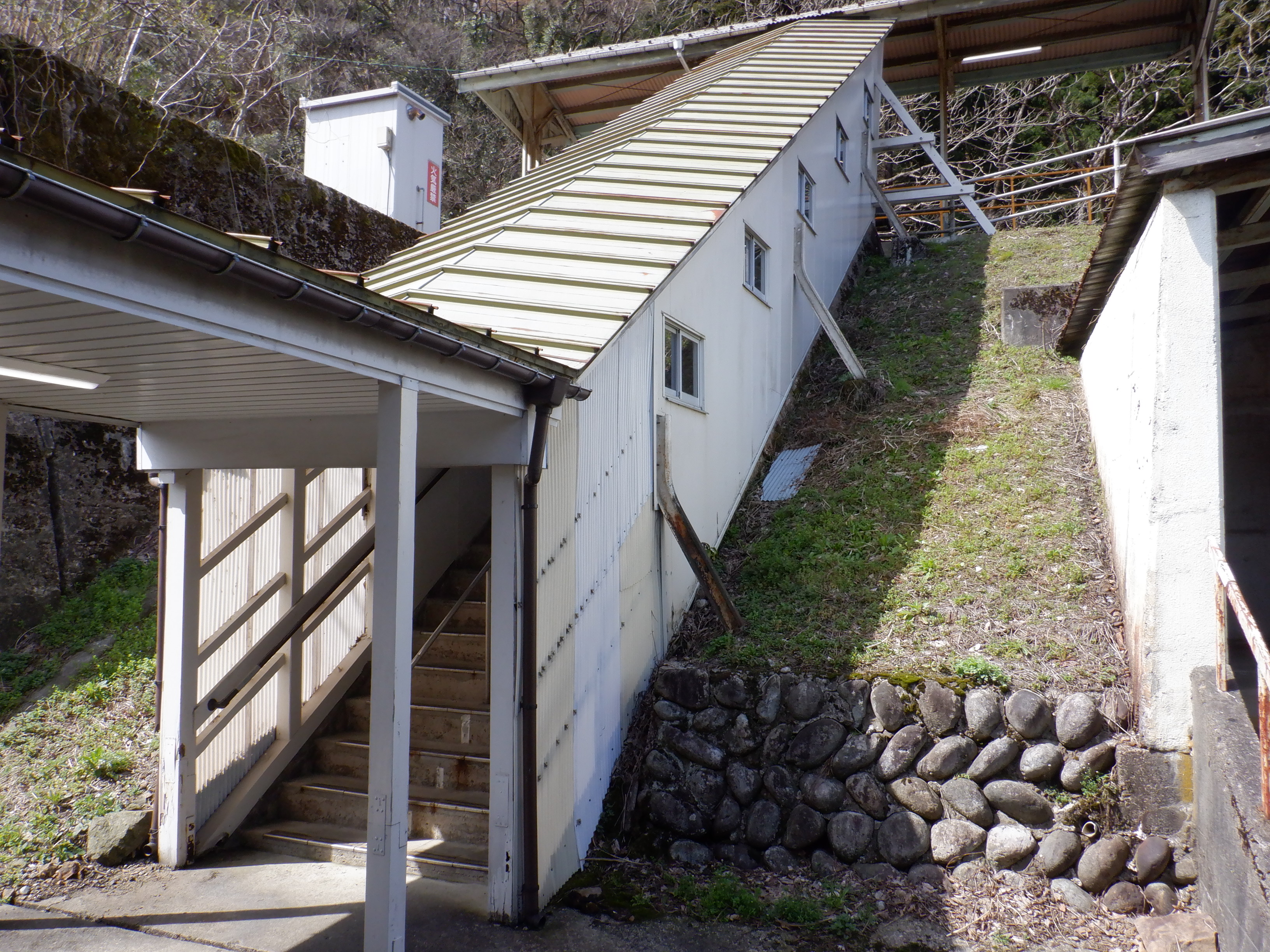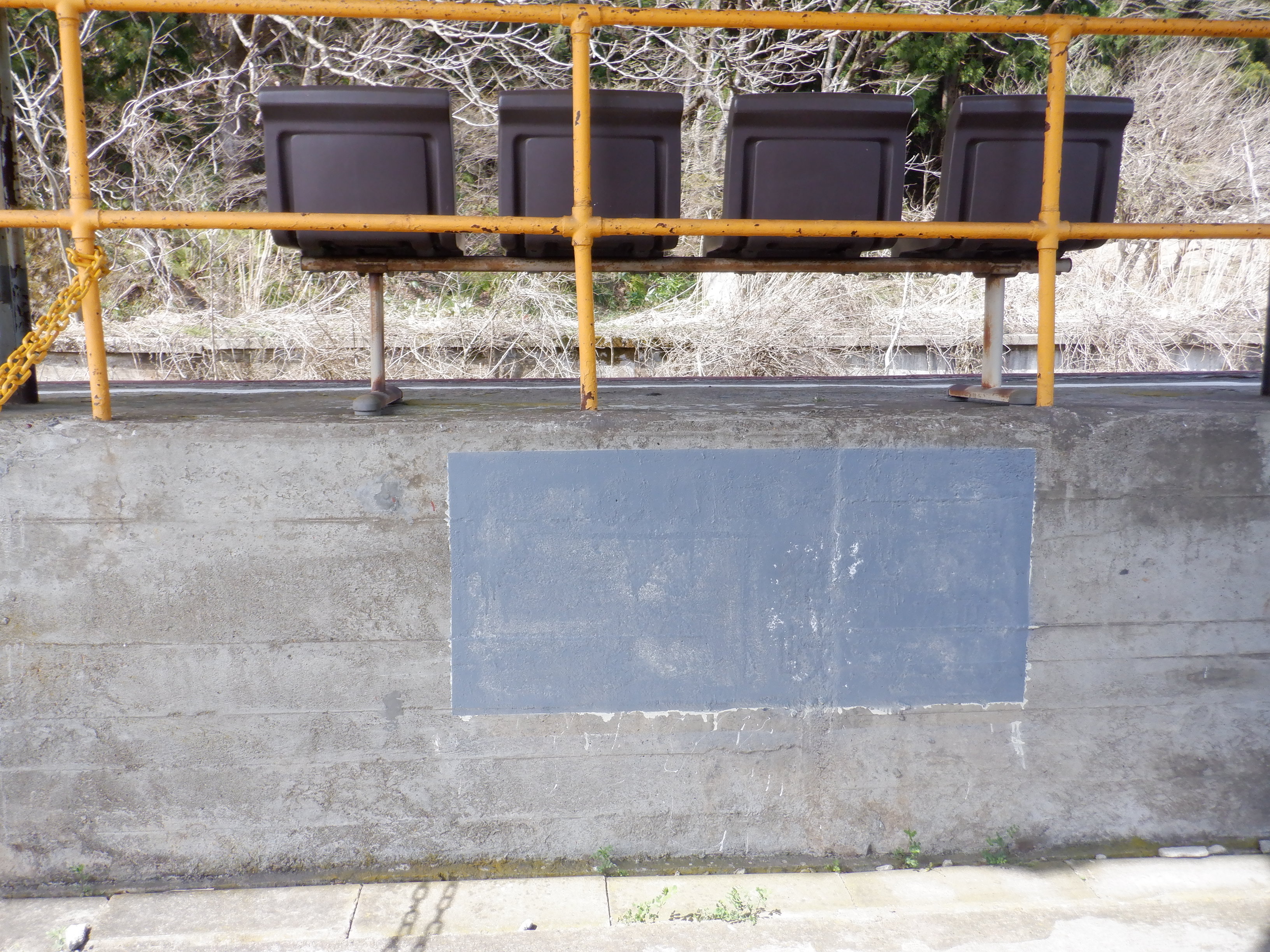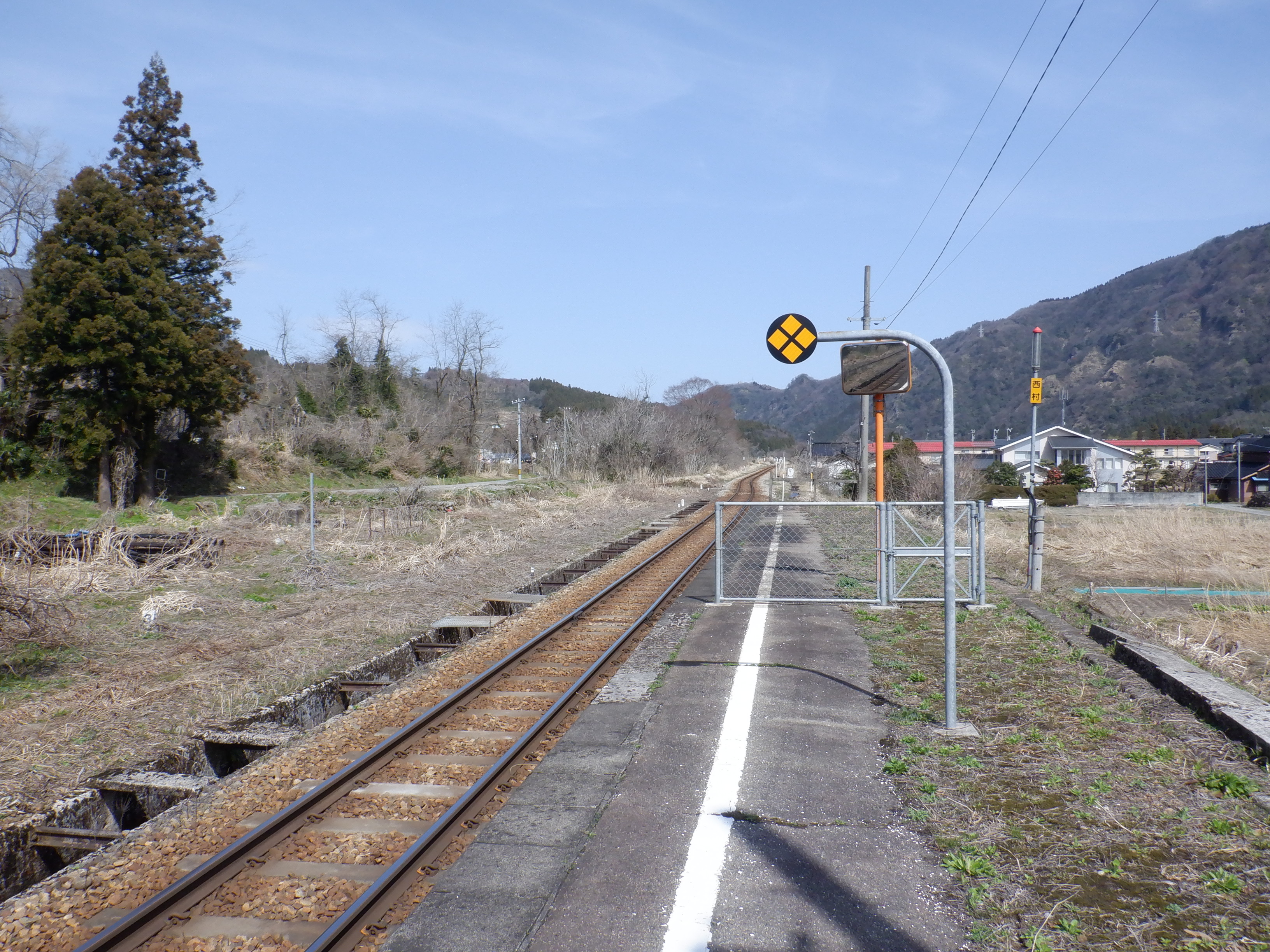 季節的に草などがないため、反対側のホーム跡を改めて撮ってあります。また、ホームの待合室が撤去されており、さらに猪谷駅側のワンマンミラーの位置が変わっていました。