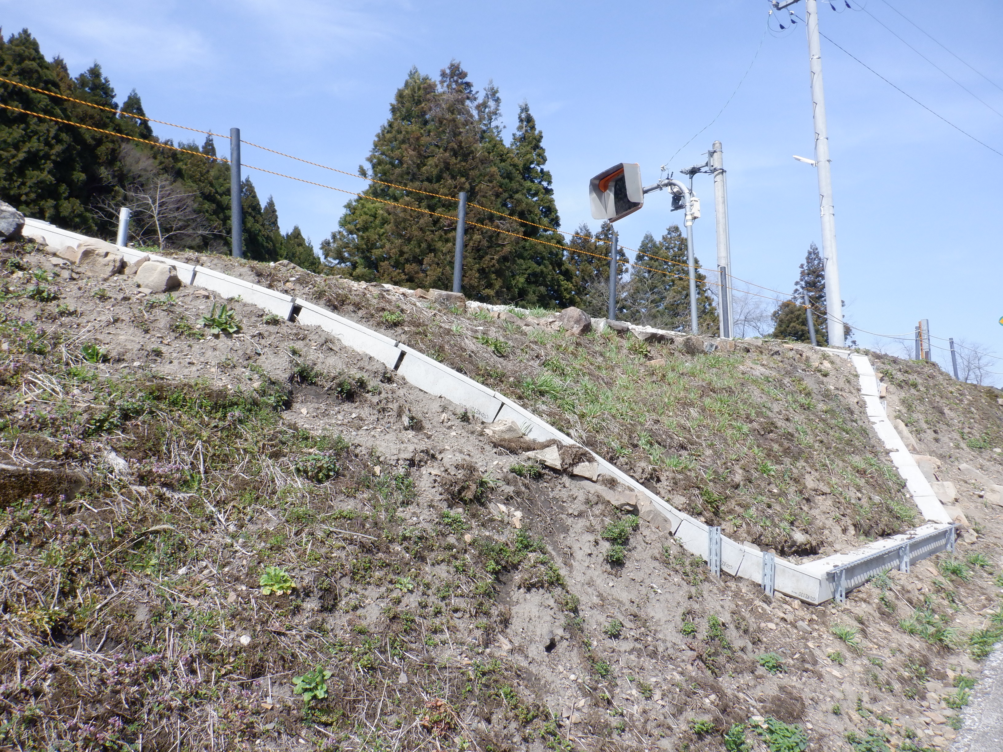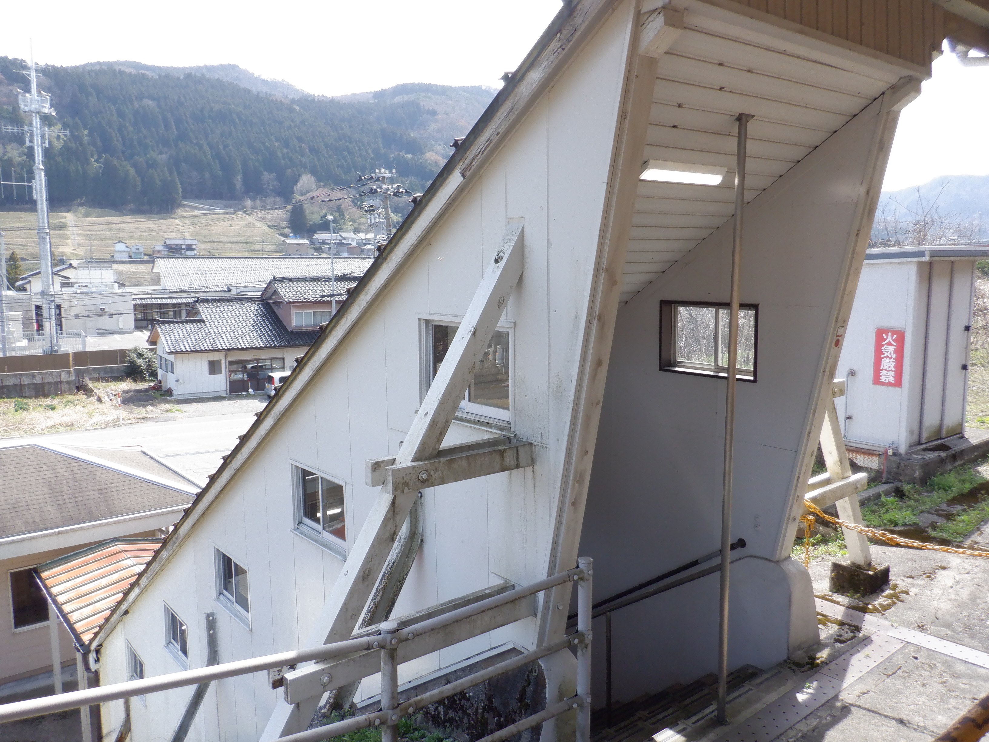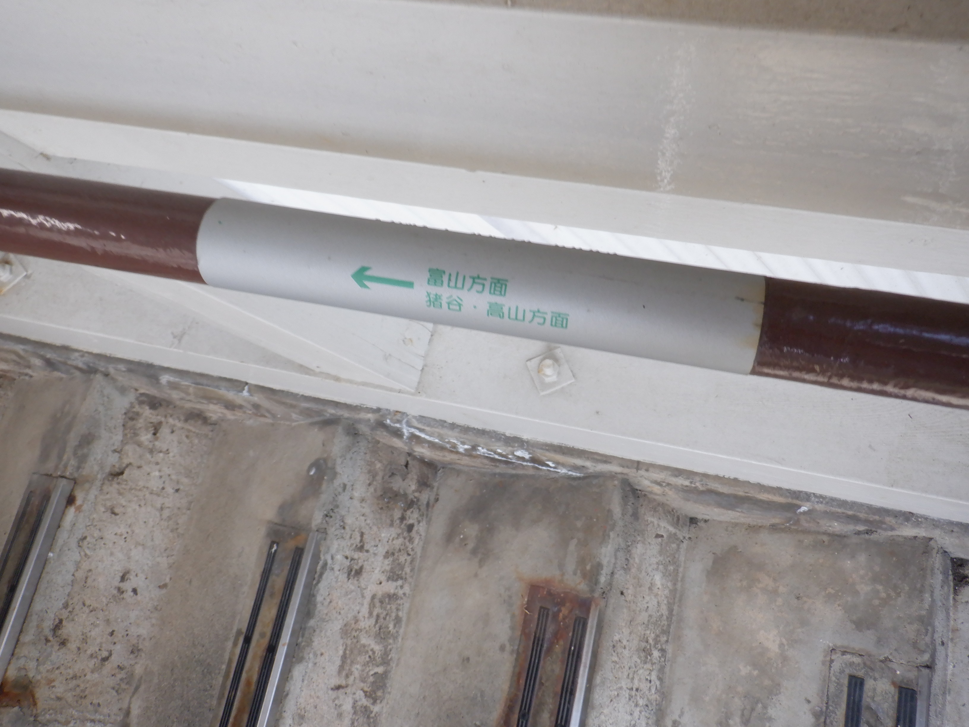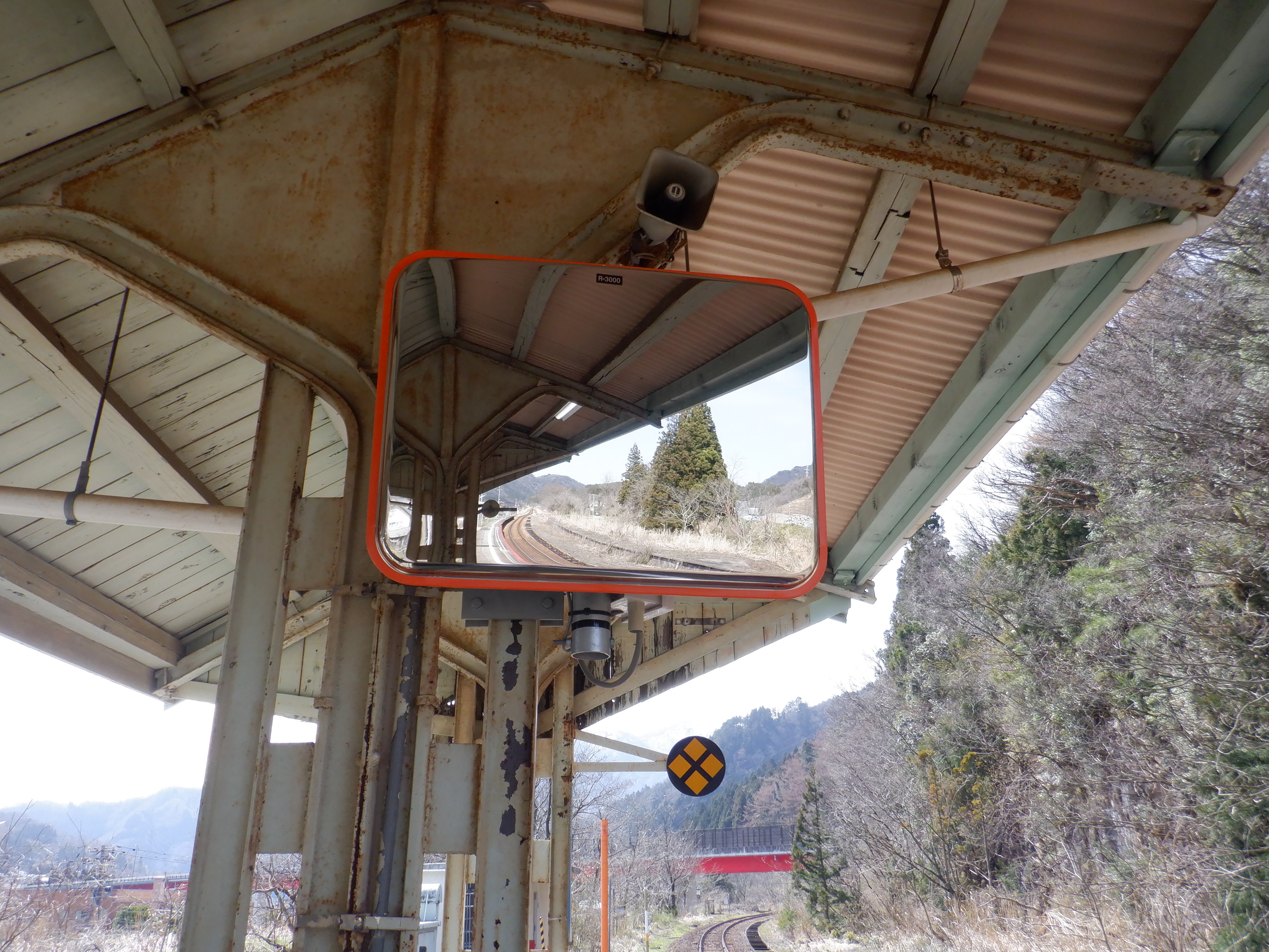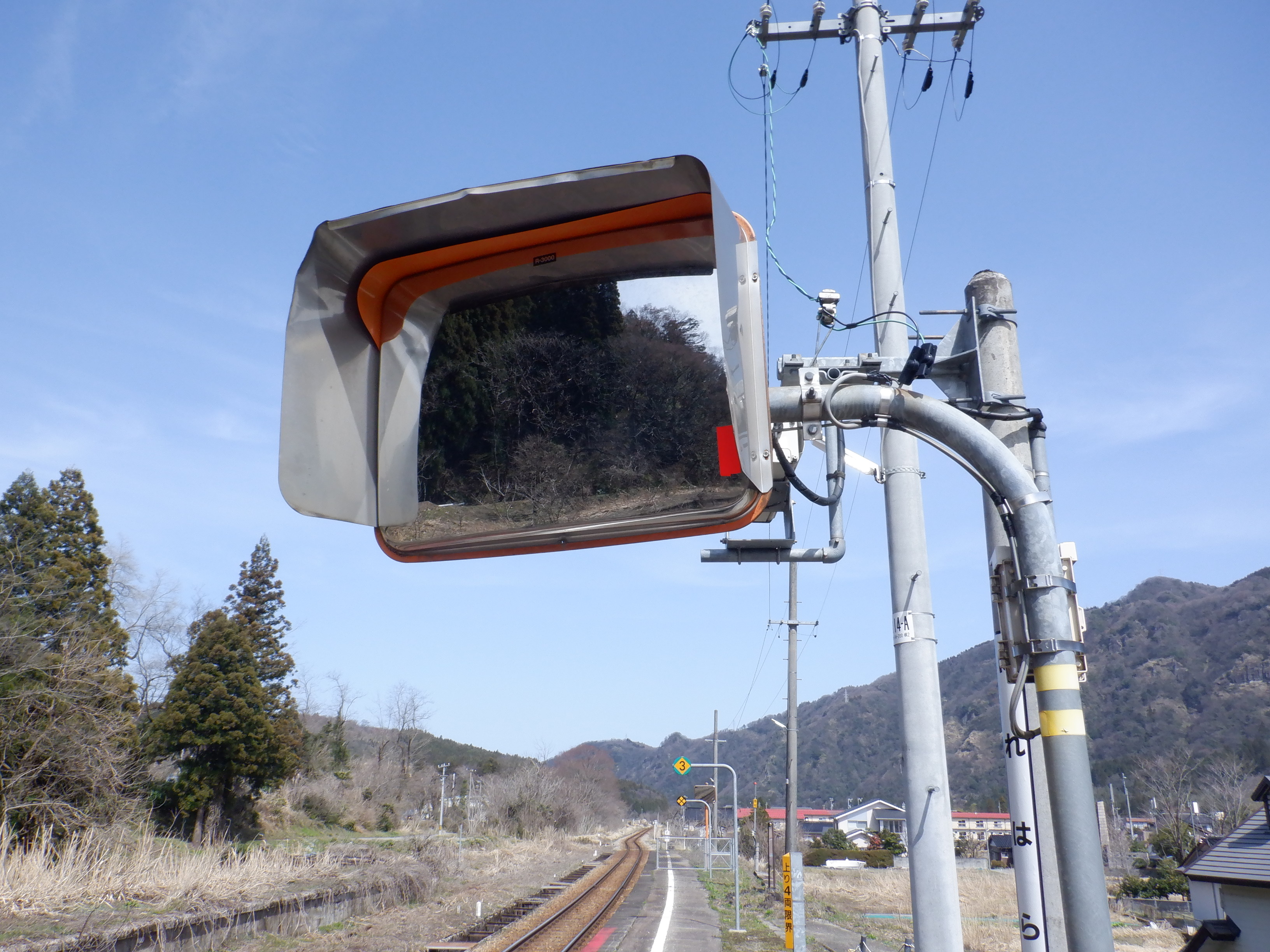 猪谷駅側の柵の向こうにかつてあったワンマンミラーは、支柱を残して撤去されていました。