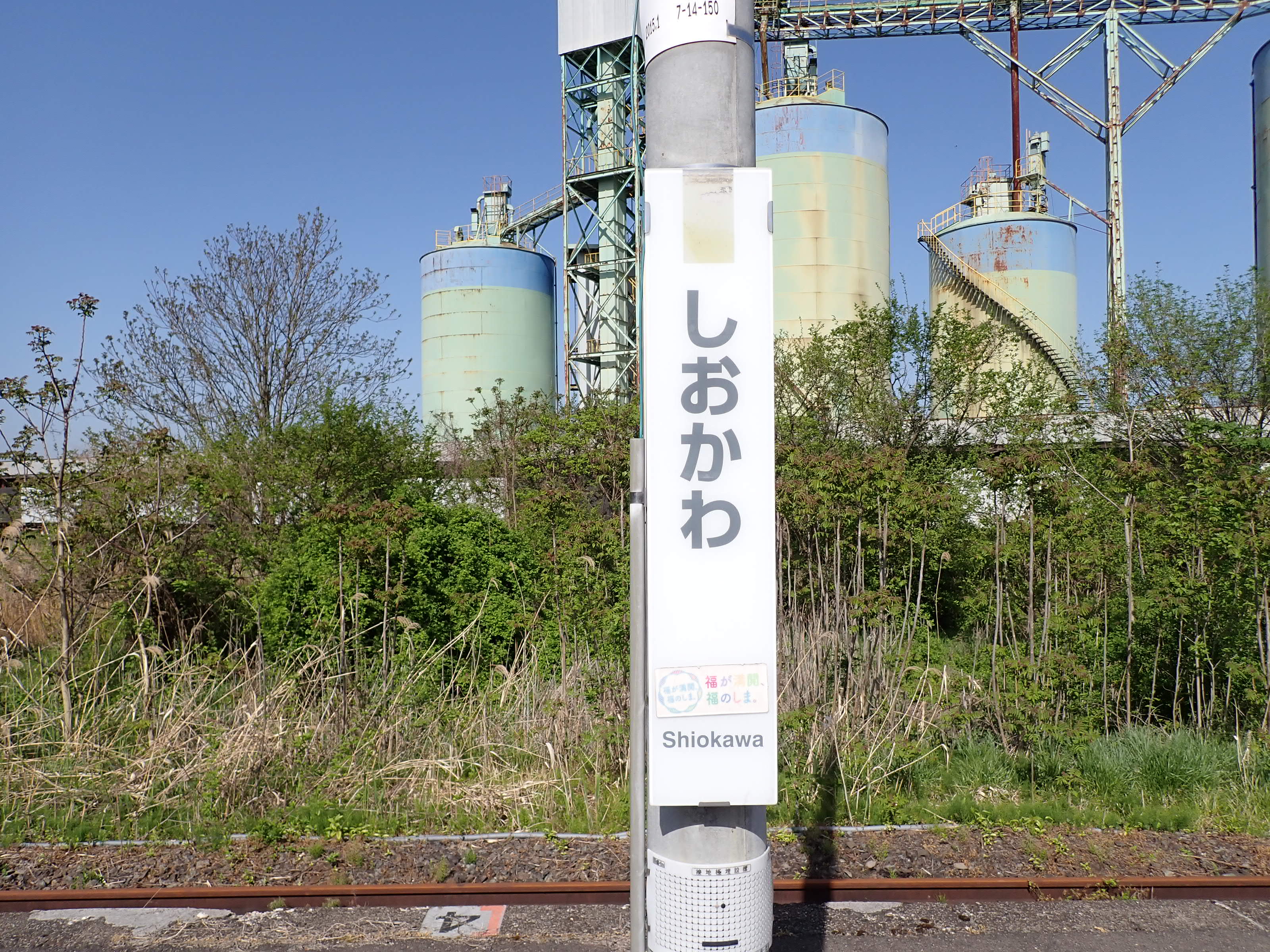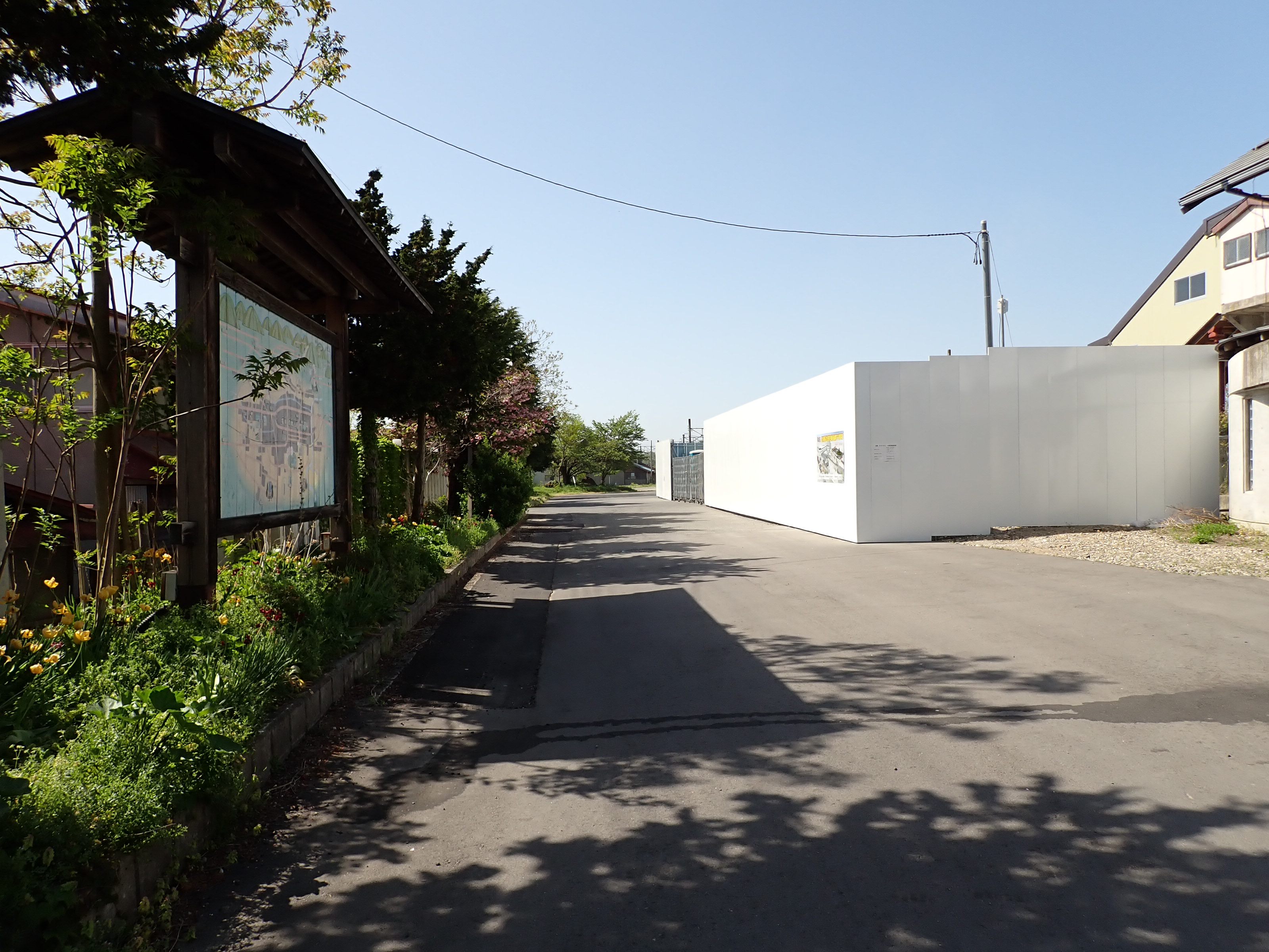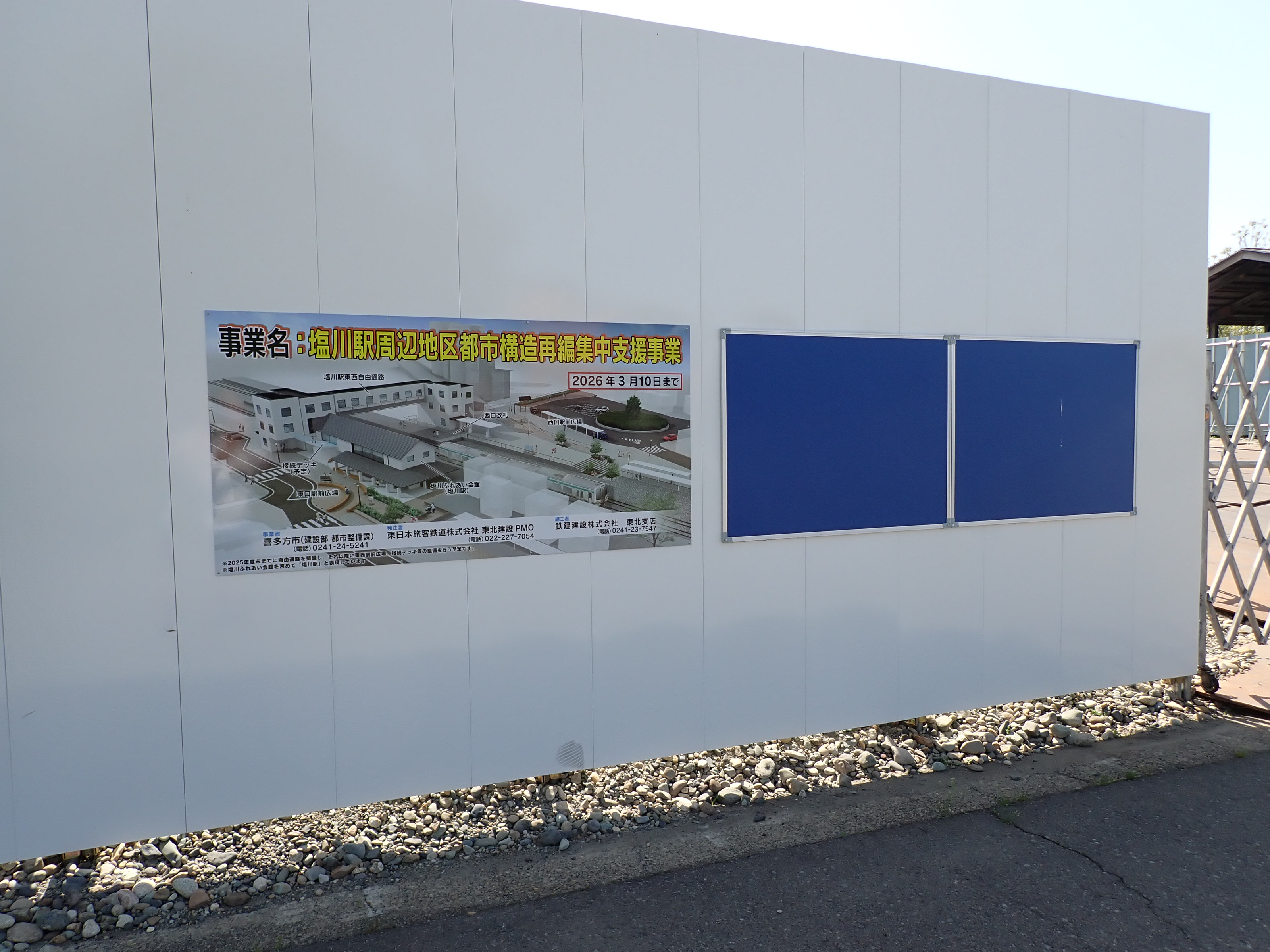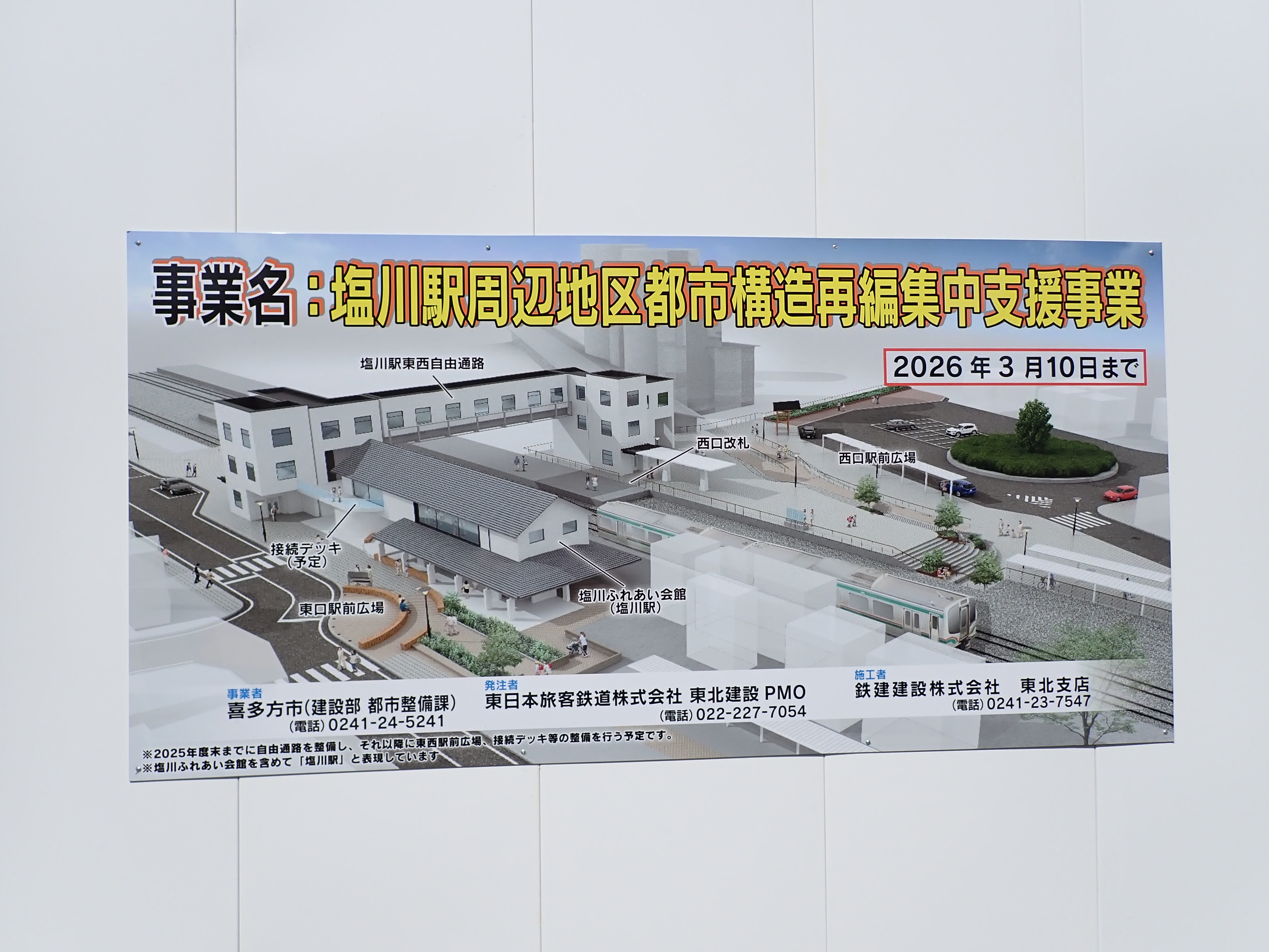 駐輪場には塩川町の表示があり、その下に喜多方市という字が見えます。