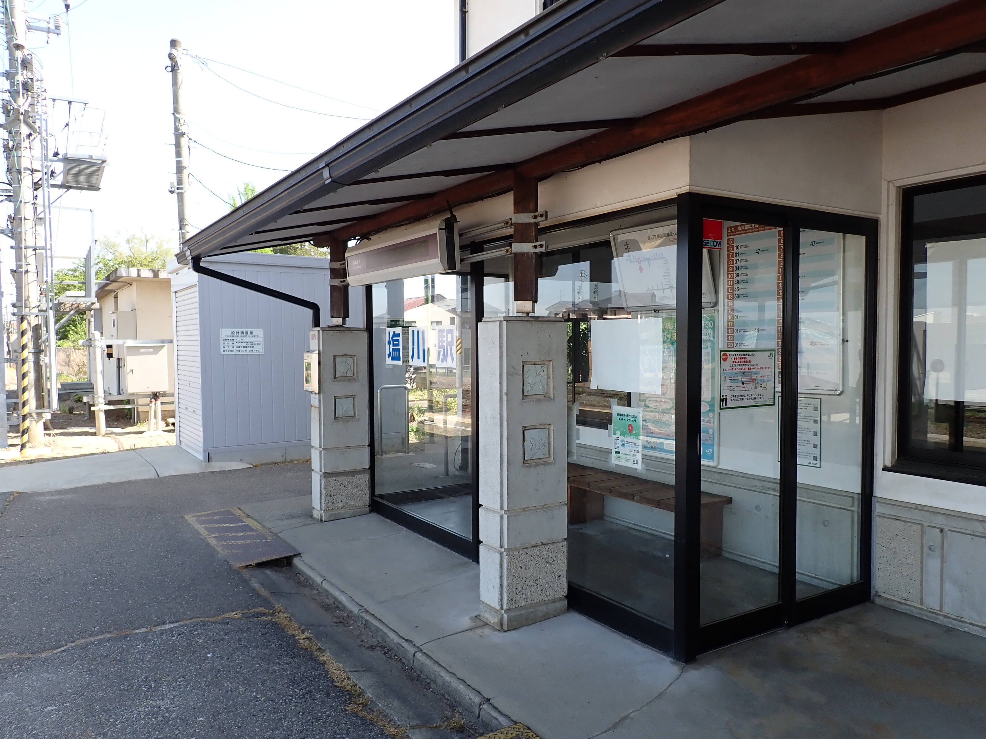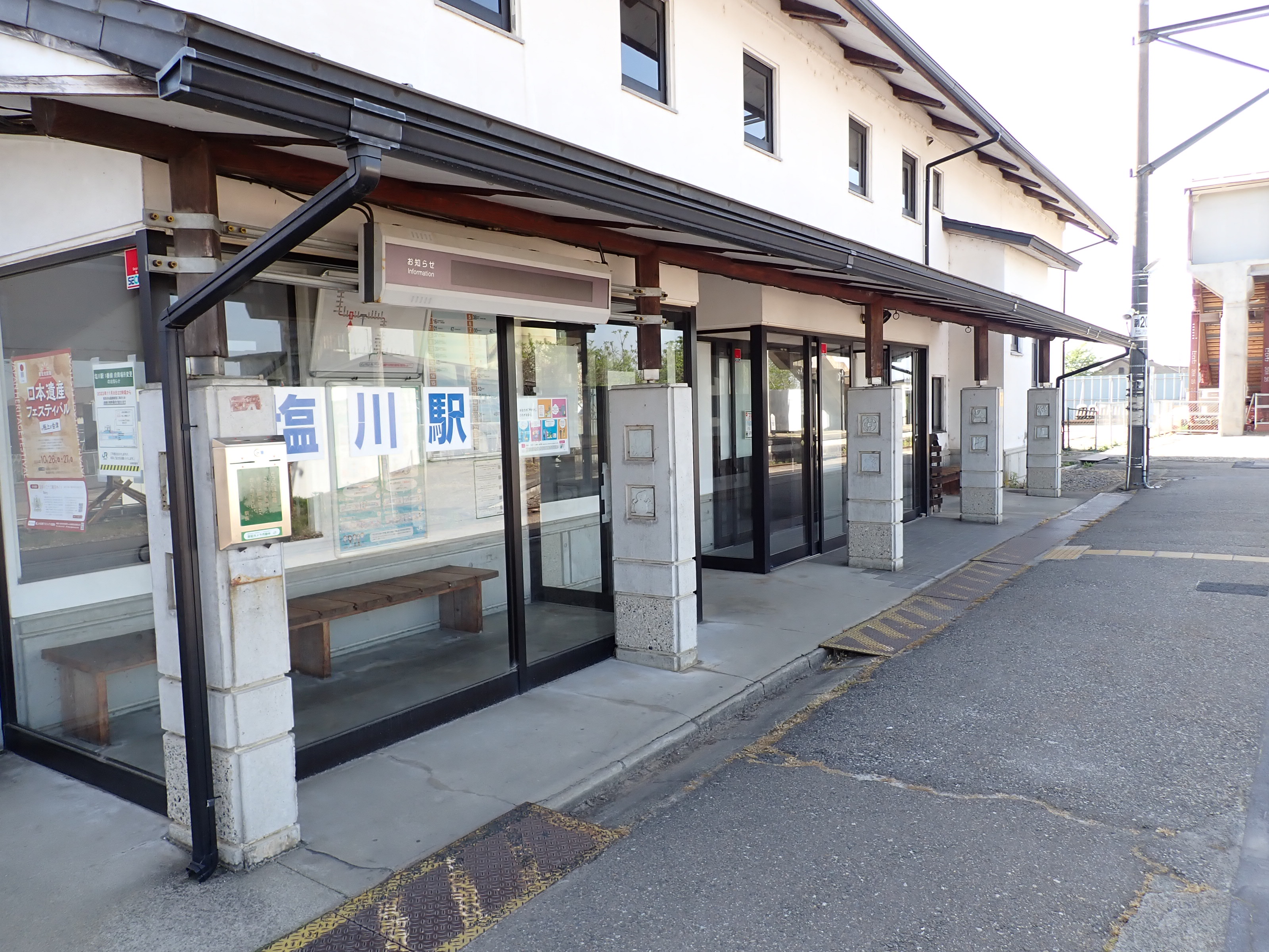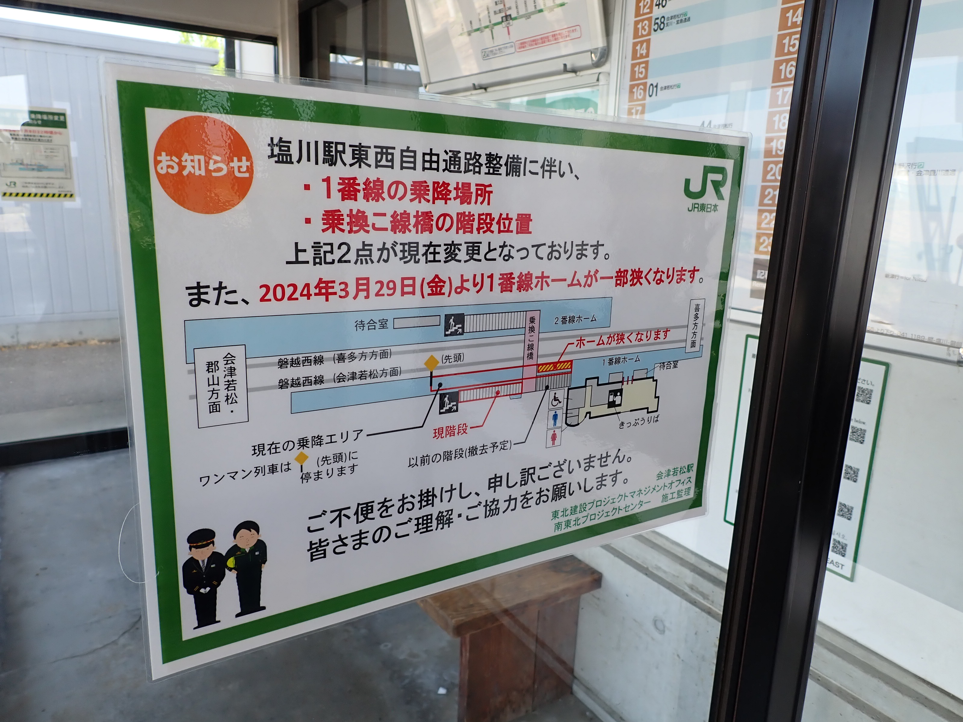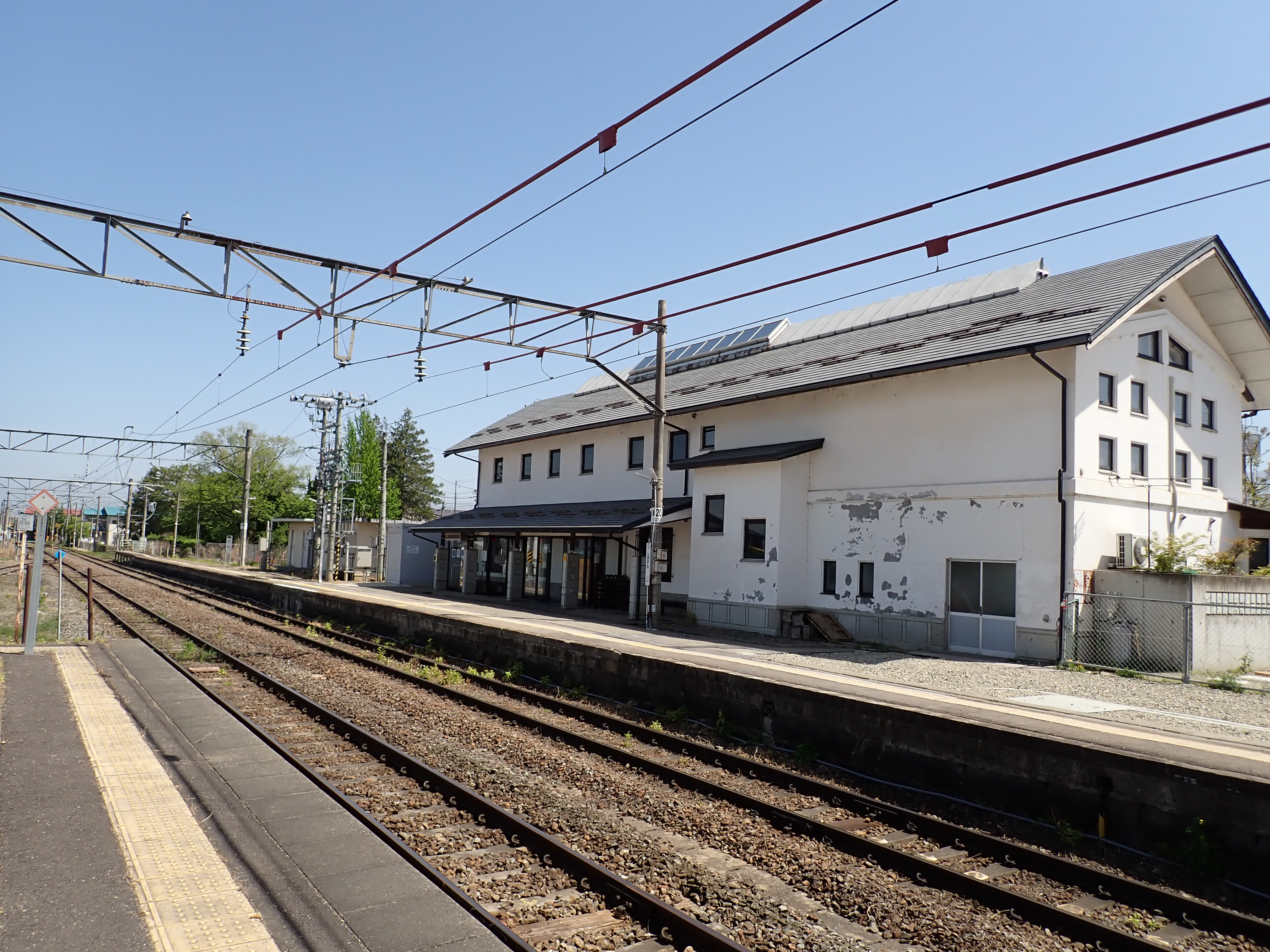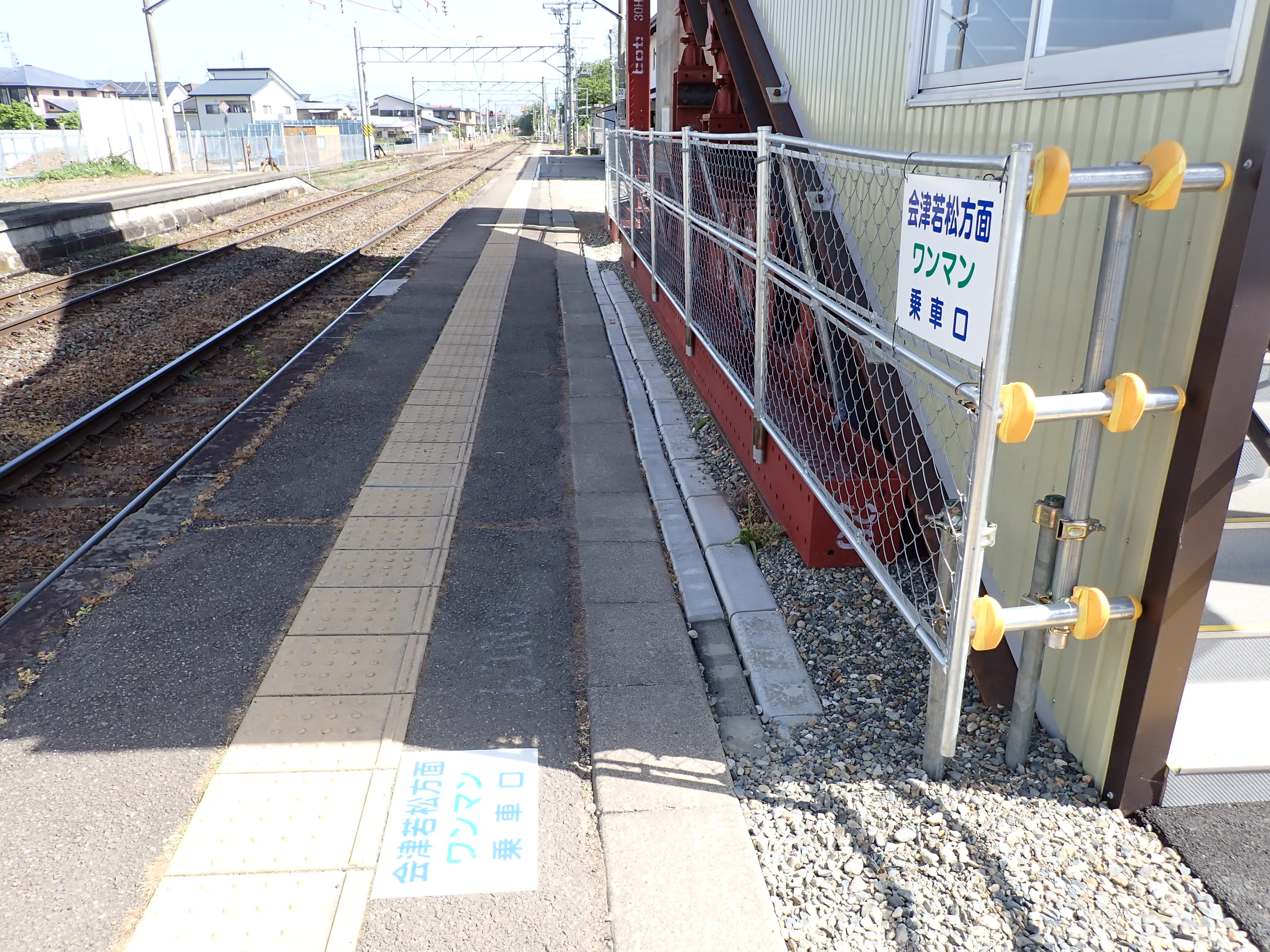 周辺の駅が極端に停車本数が少ない中にあって、喜多方と会津若松の間ではこの駅だけは全ての普通列車が停車します。駅から少し進むと古い町並みが続いています。2024年・2025年現在、駅舎と反対側との間の自由通路を建設中です。