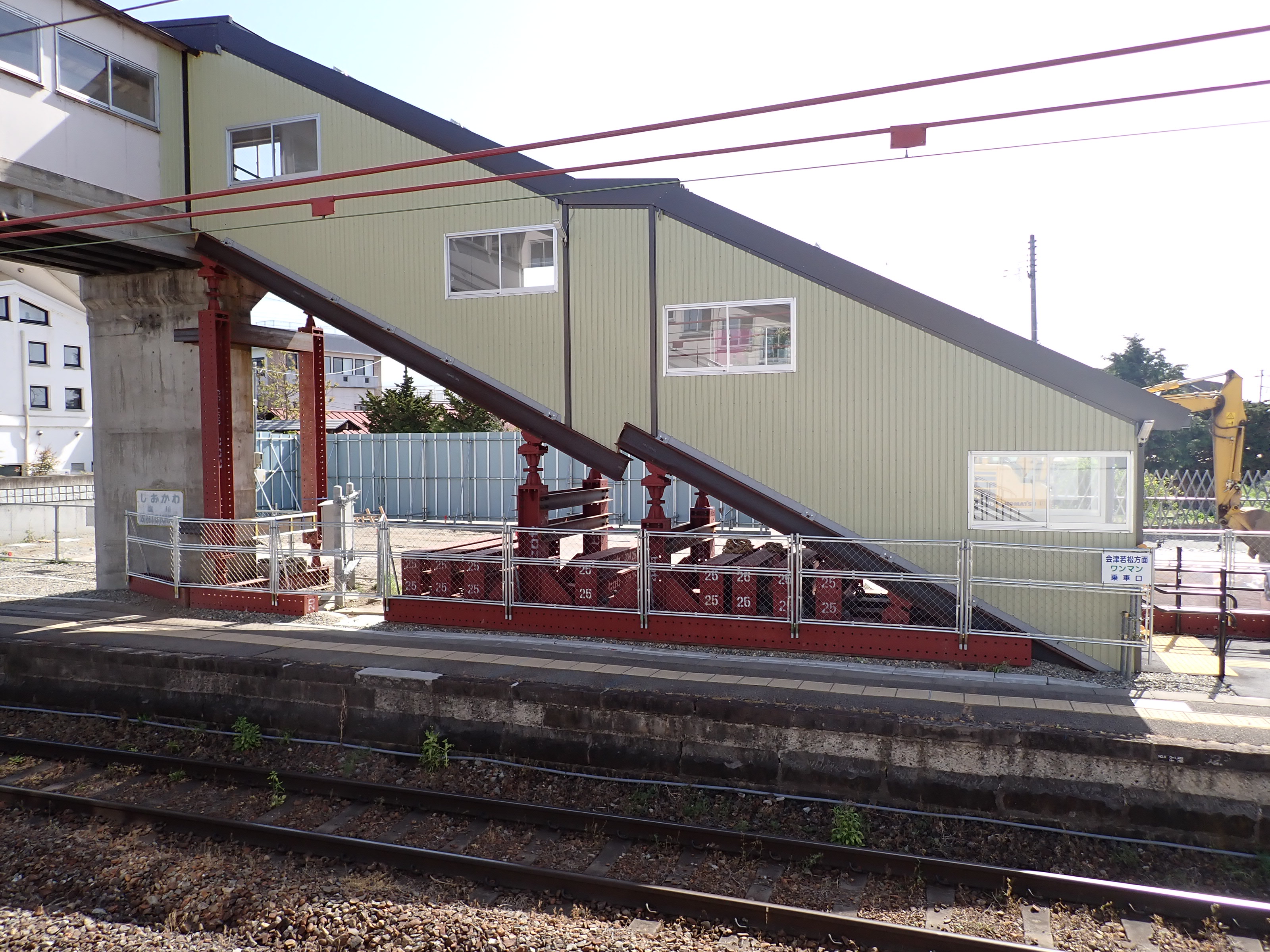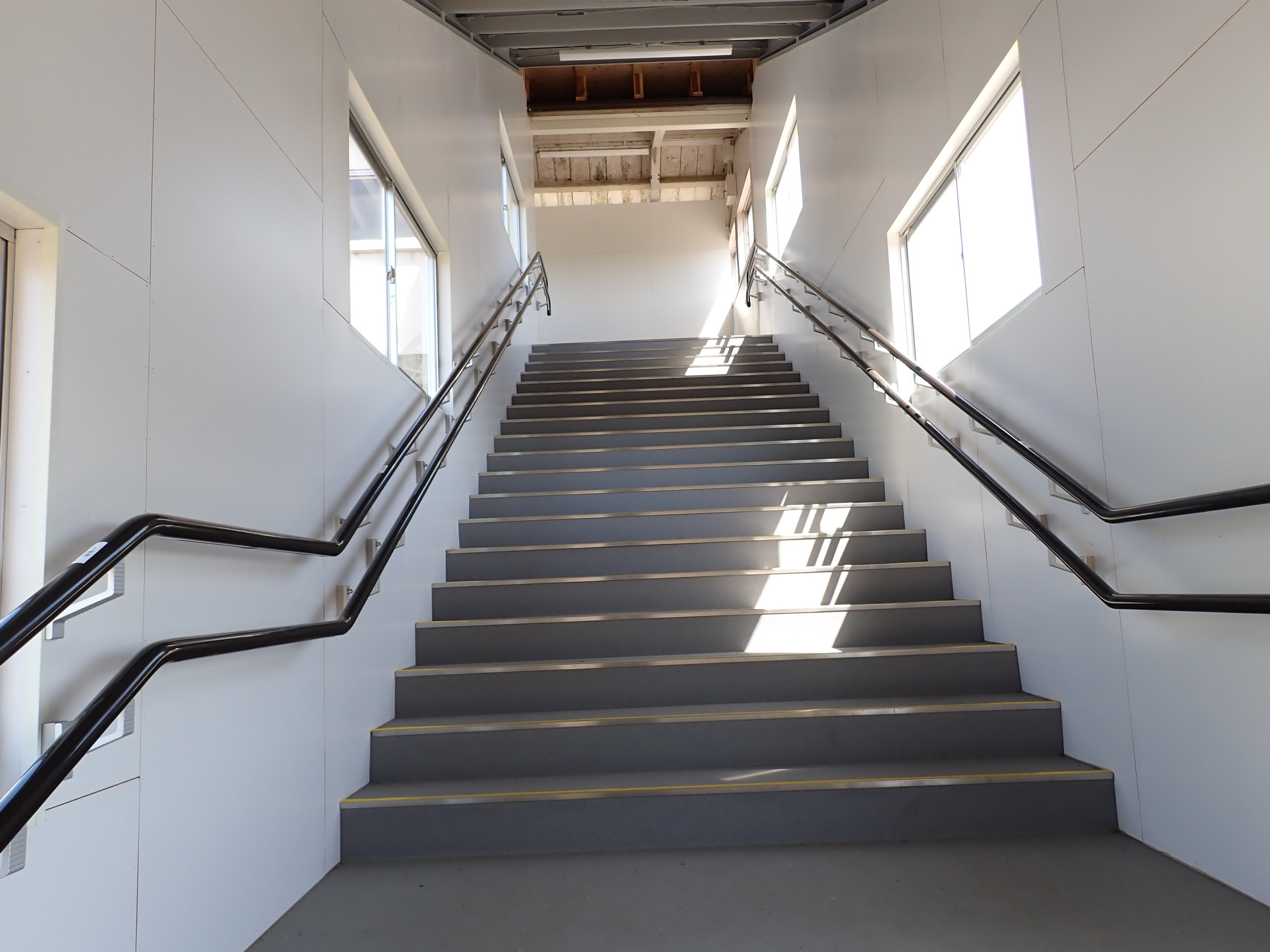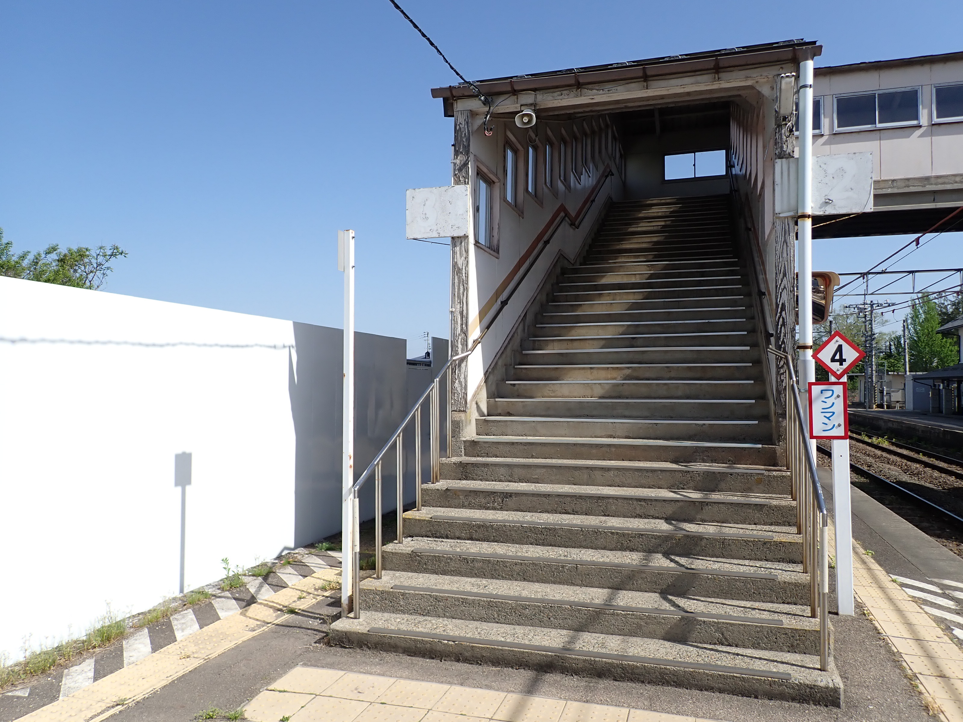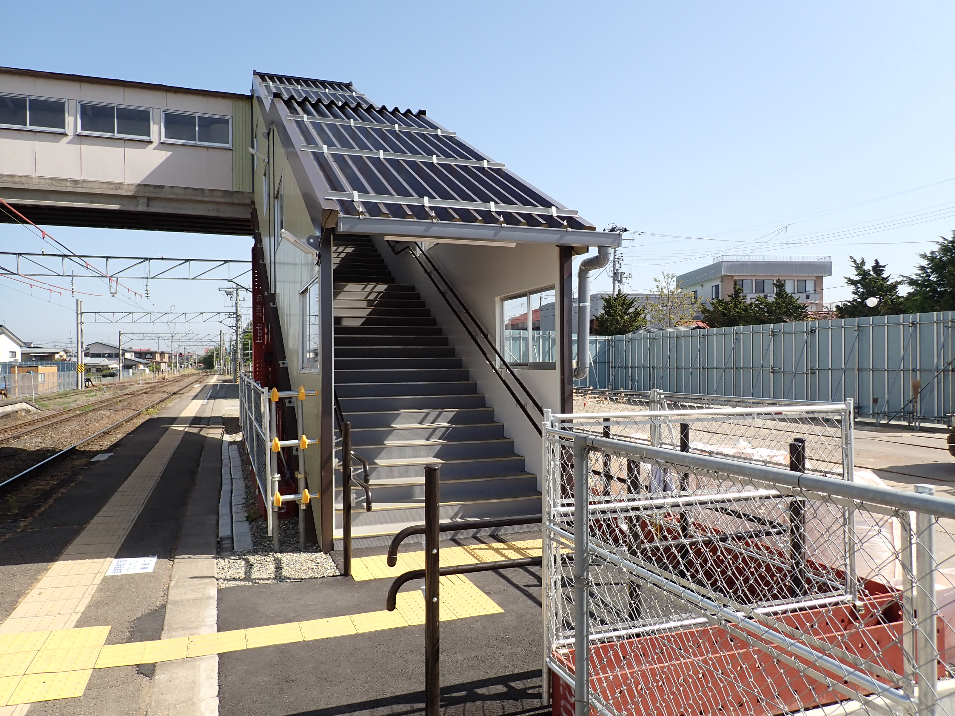 跨線橋階段の1番線側。おそらく従来の階段と反対側に作ったようで、仮設の新しいものになっています。