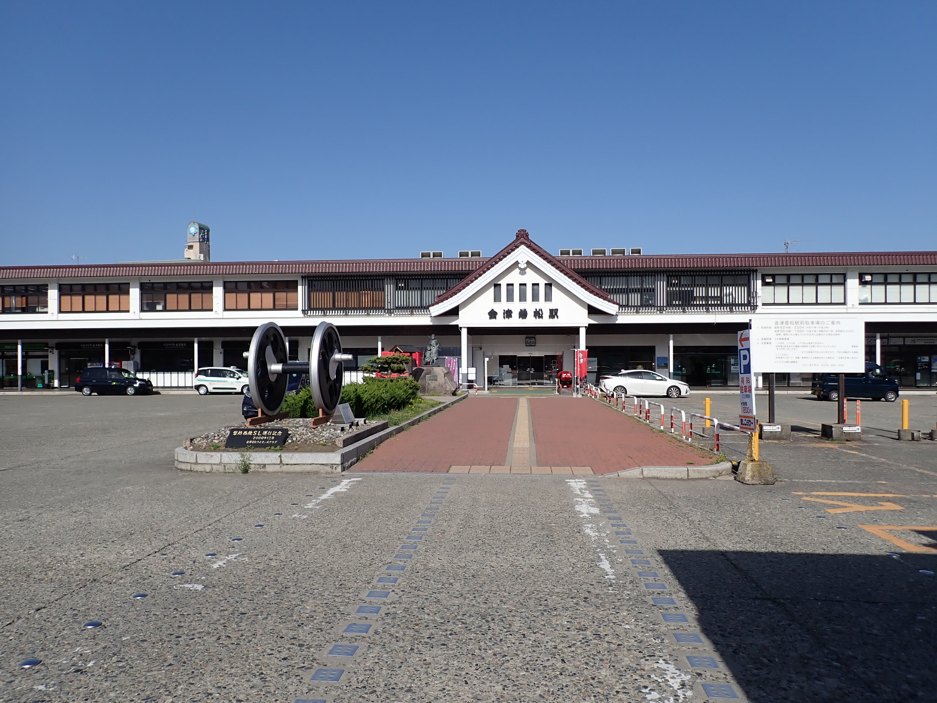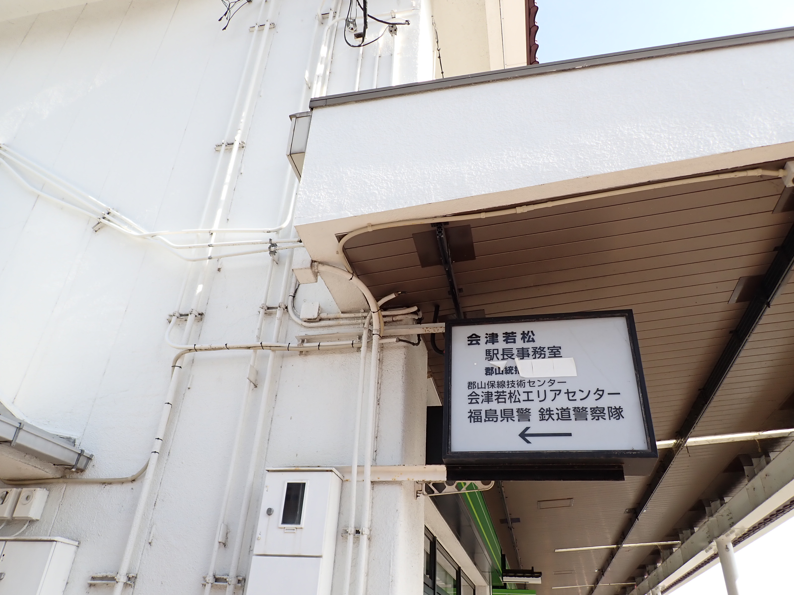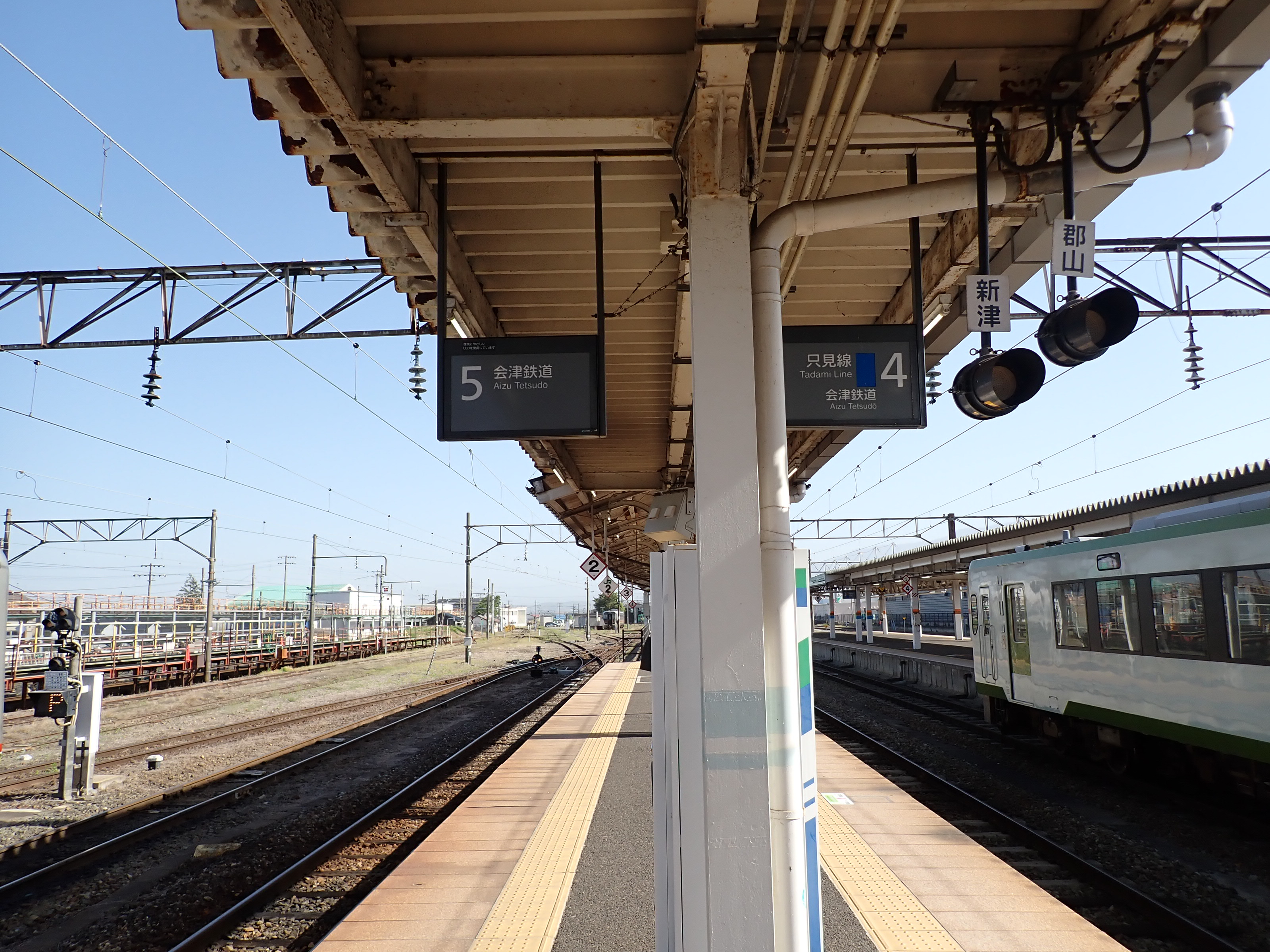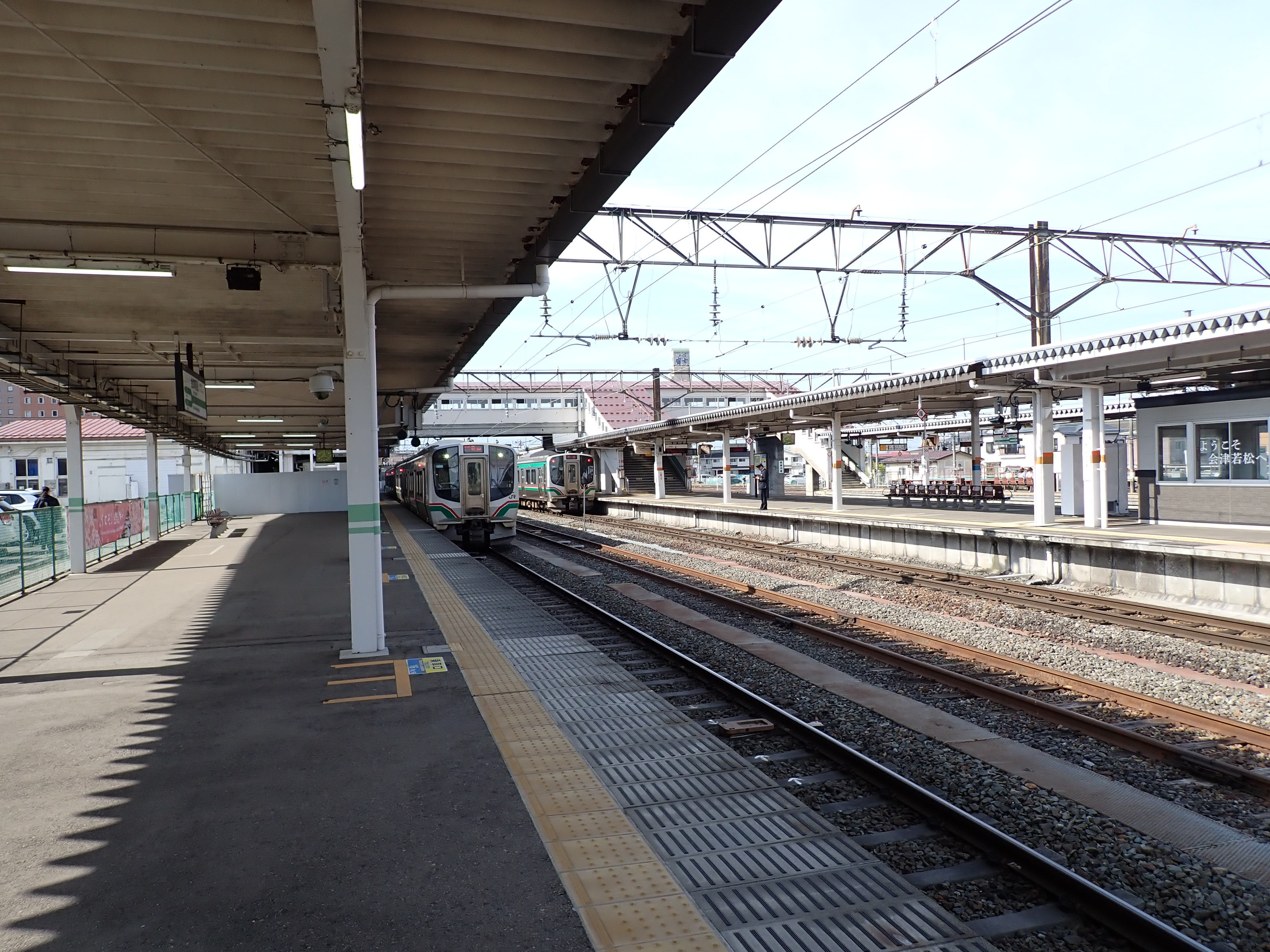 磐越西線はこの駅で進む方向が変わり、1・2番線は頭端式になっています。その逆側に只見線が進んで行きます。駅前にある貨物のオフレールステーション・駐車場の上屋が印象的です。