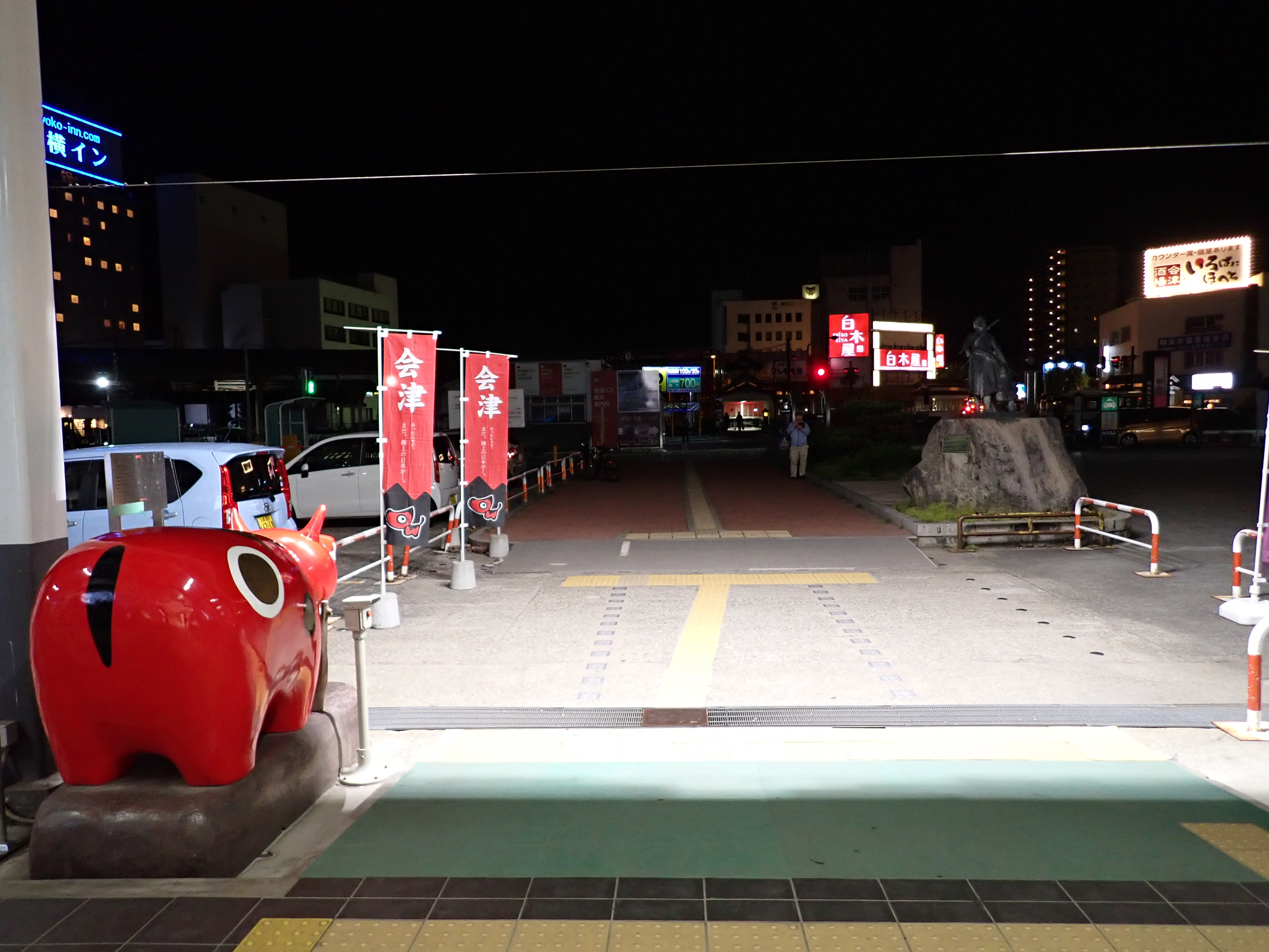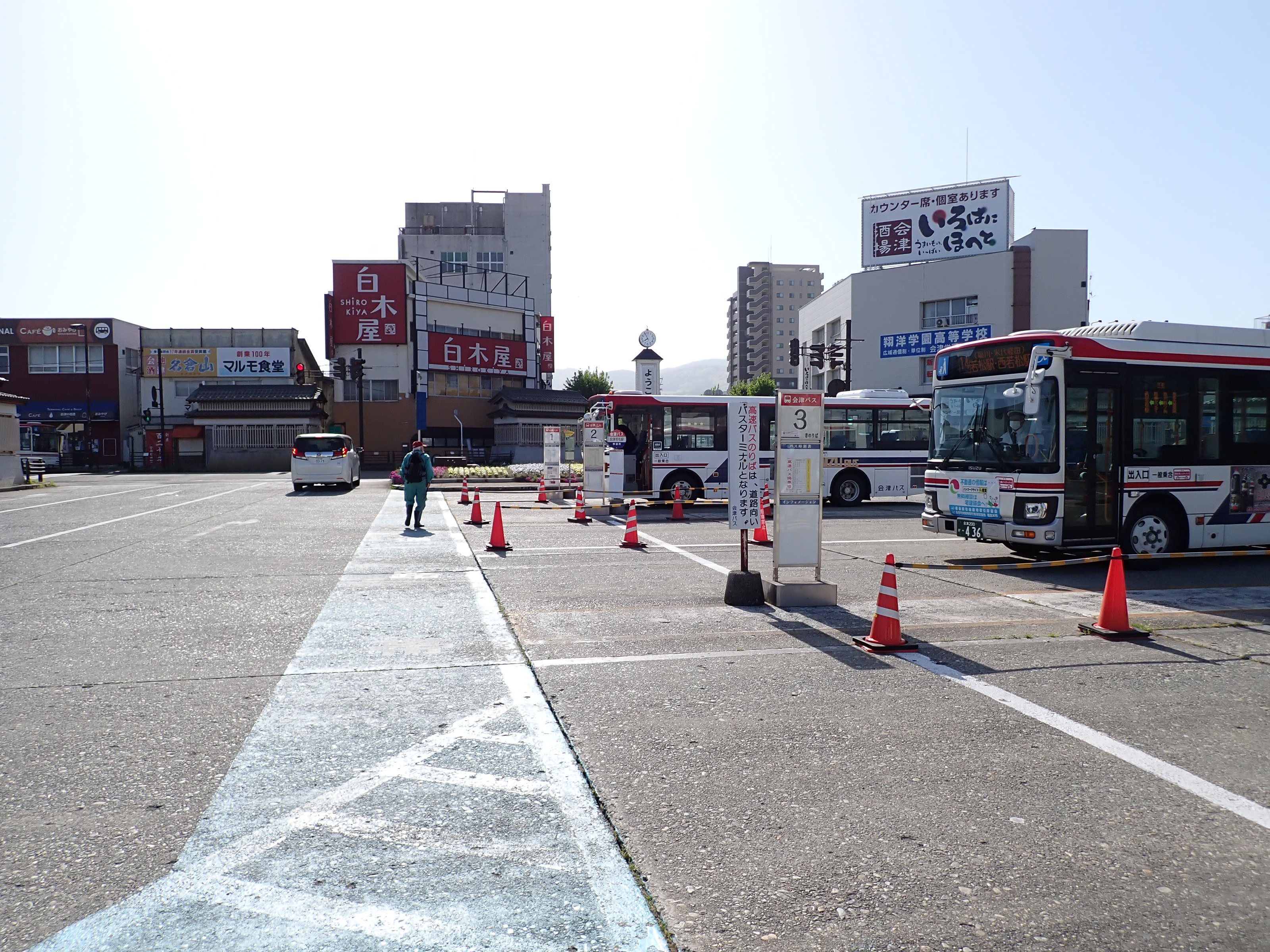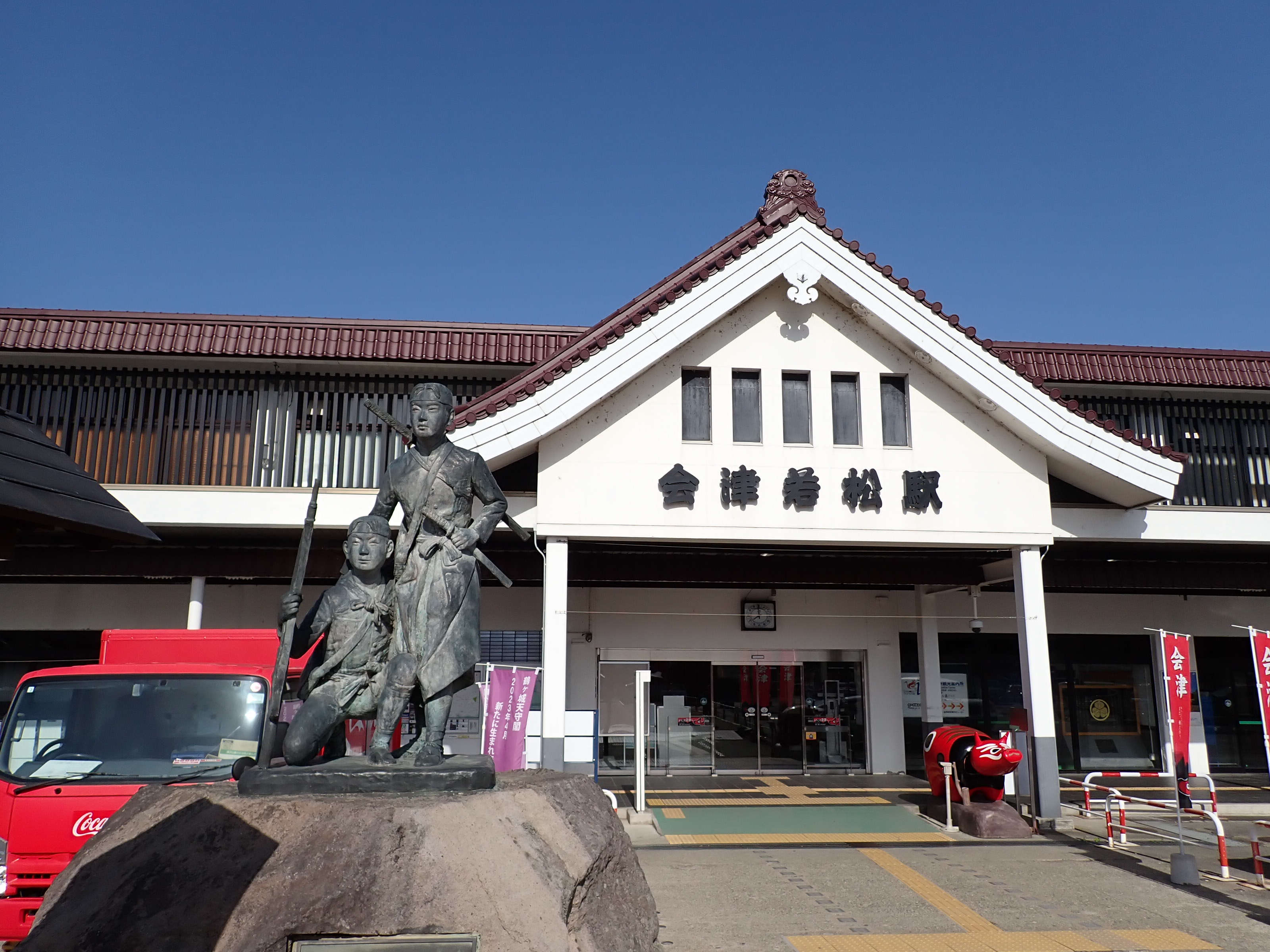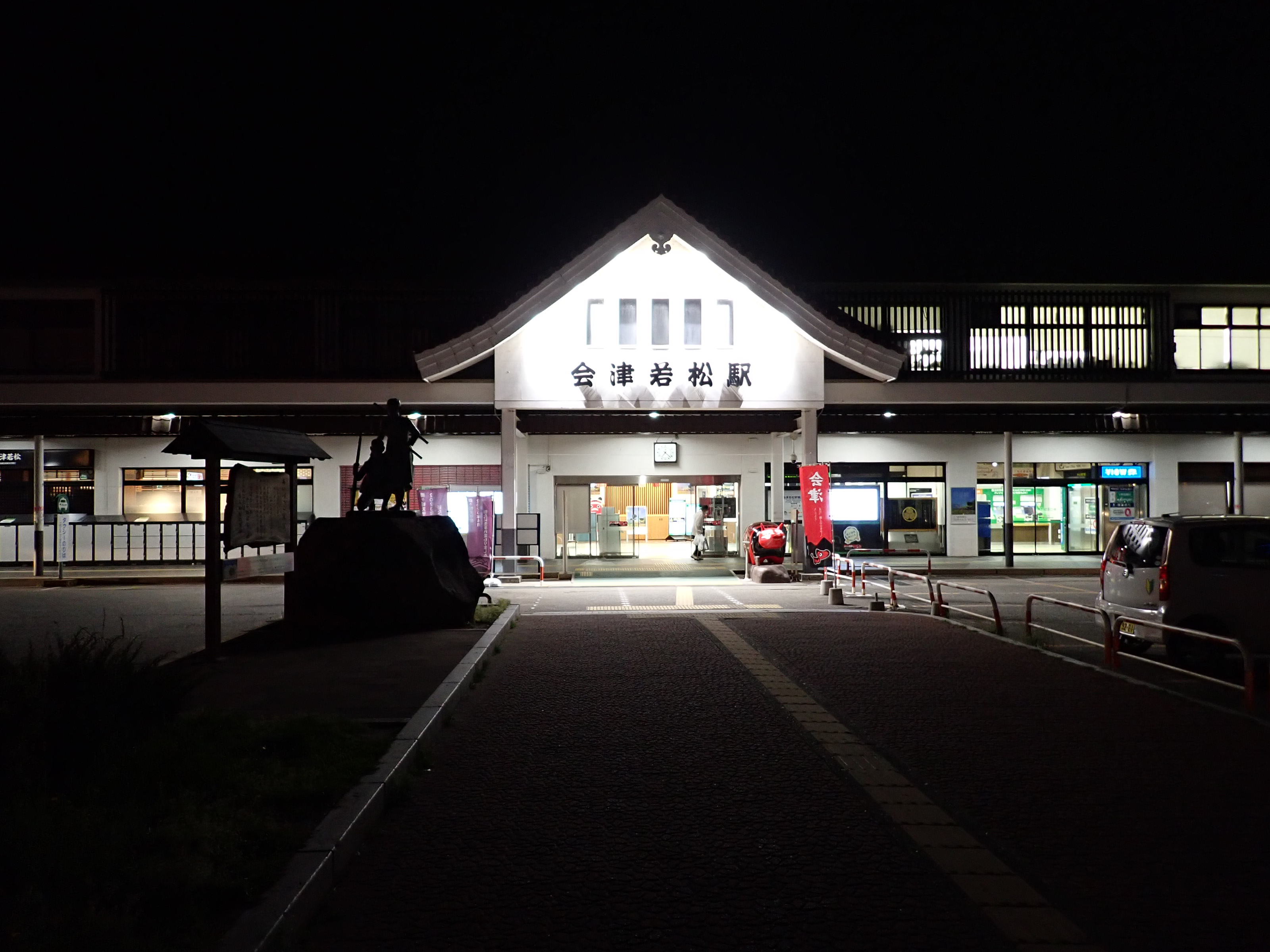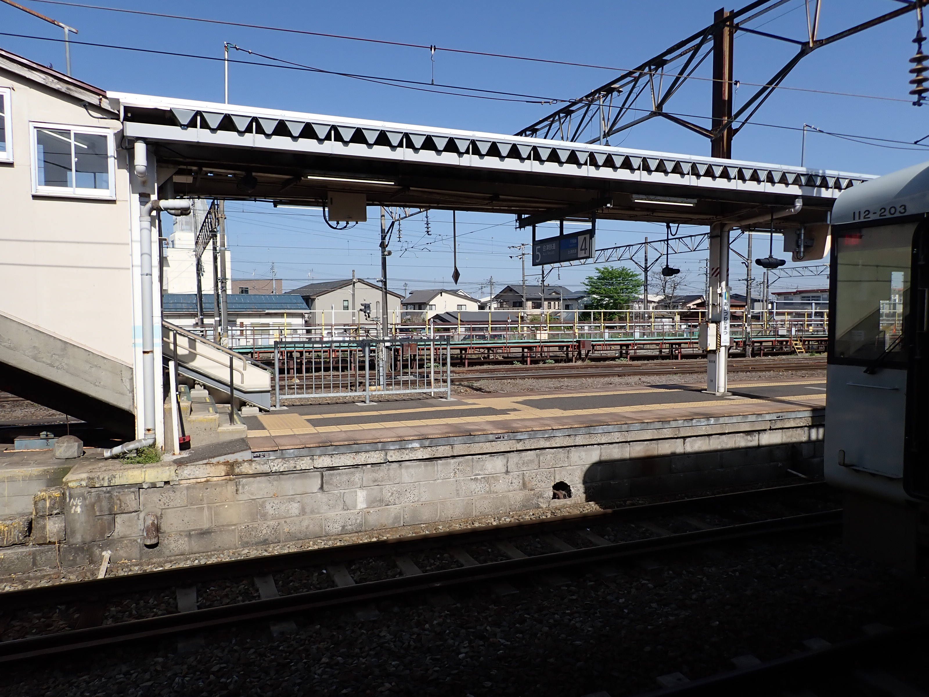 磐越西線はこの駅で進む方向が変わり、1・2番線は頭端式になっています。その逆側に只見線が進んで行きます。駅前にある貨物のオフレールステーション・駐車場の上屋が印象的です。