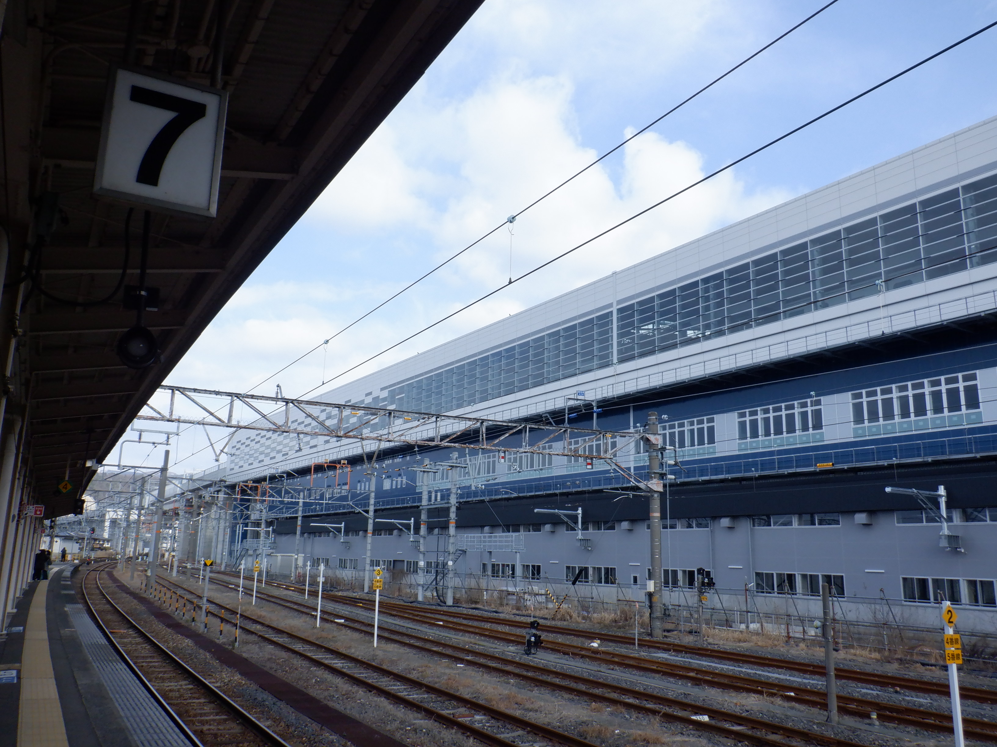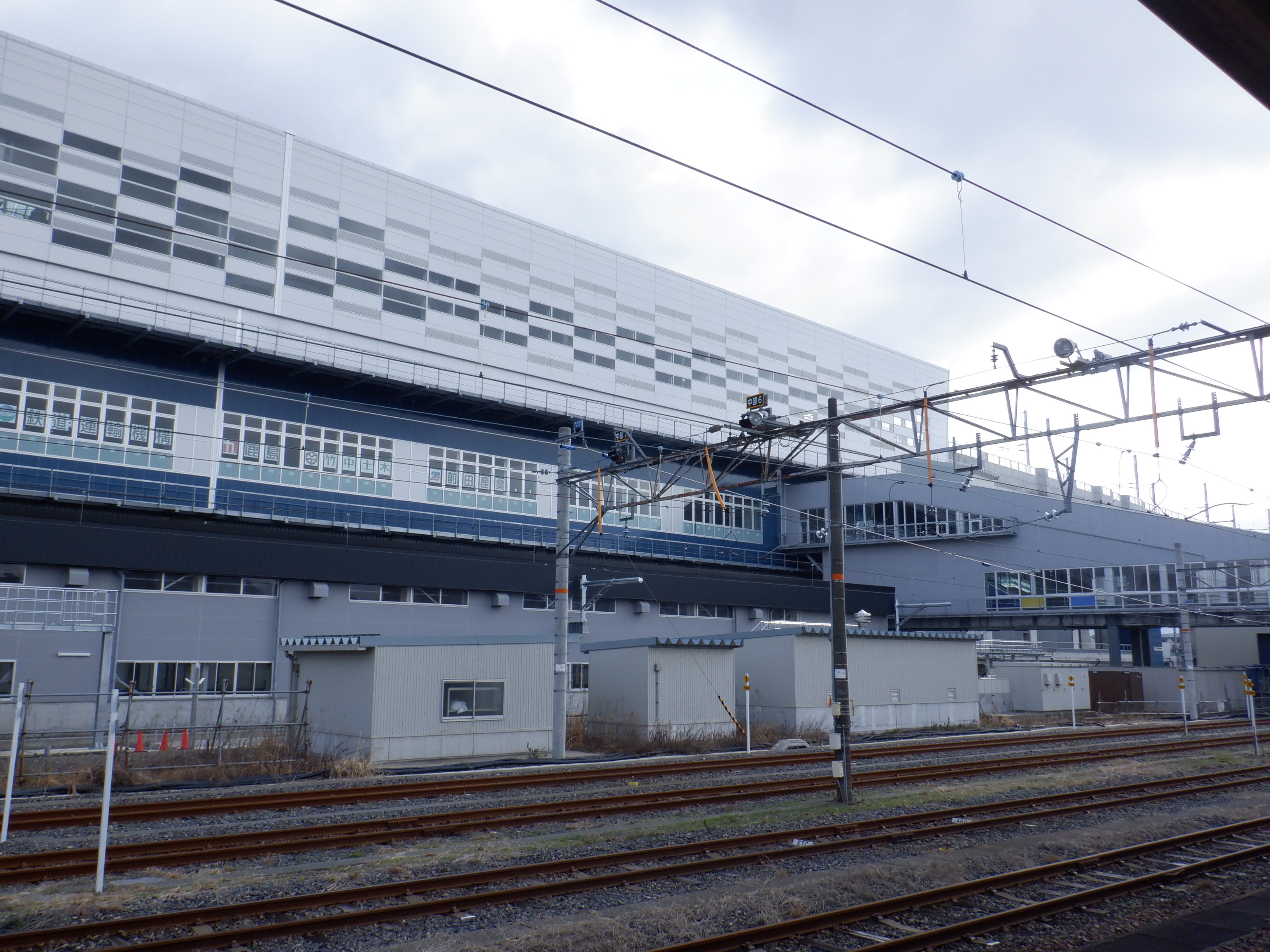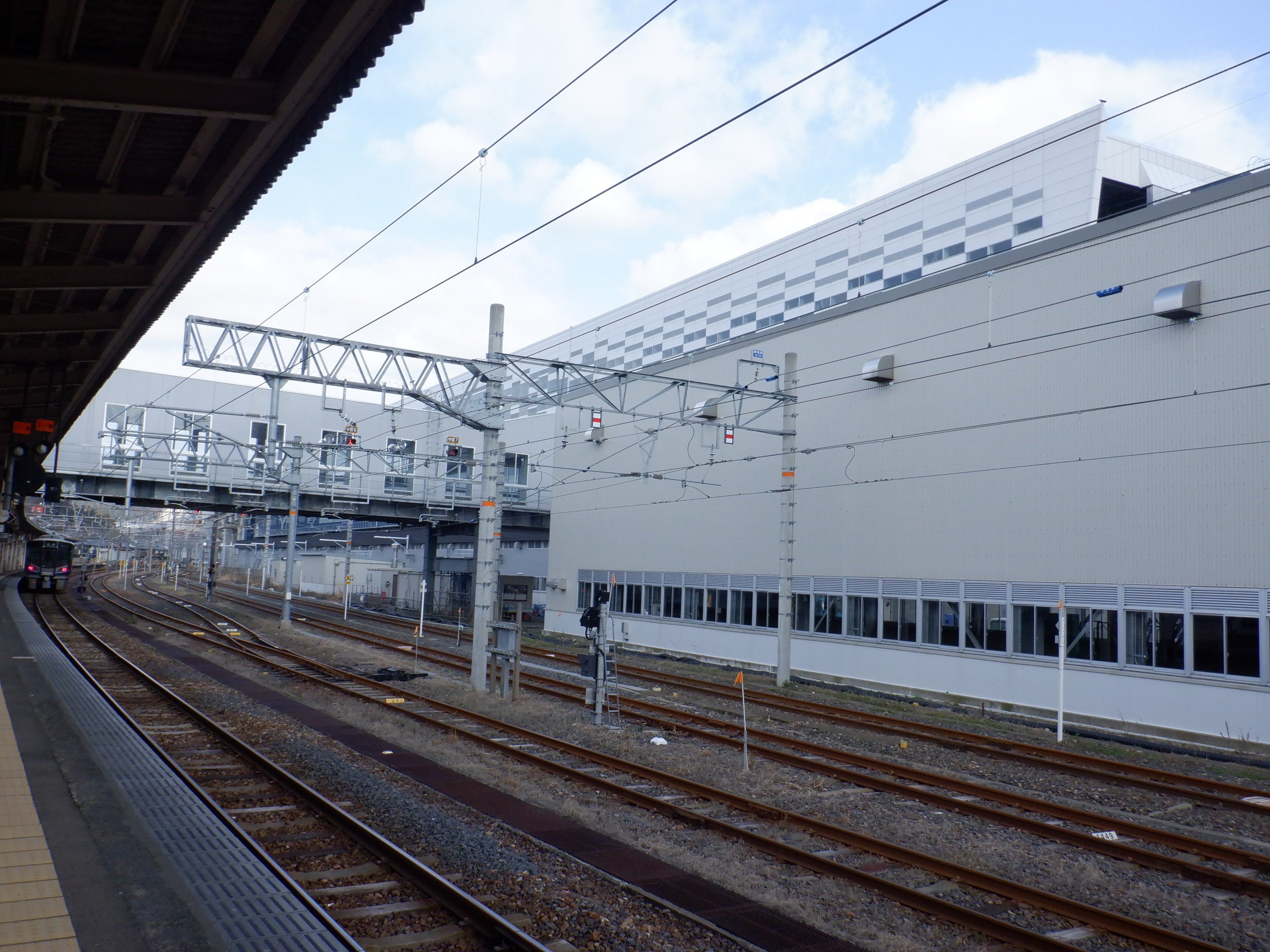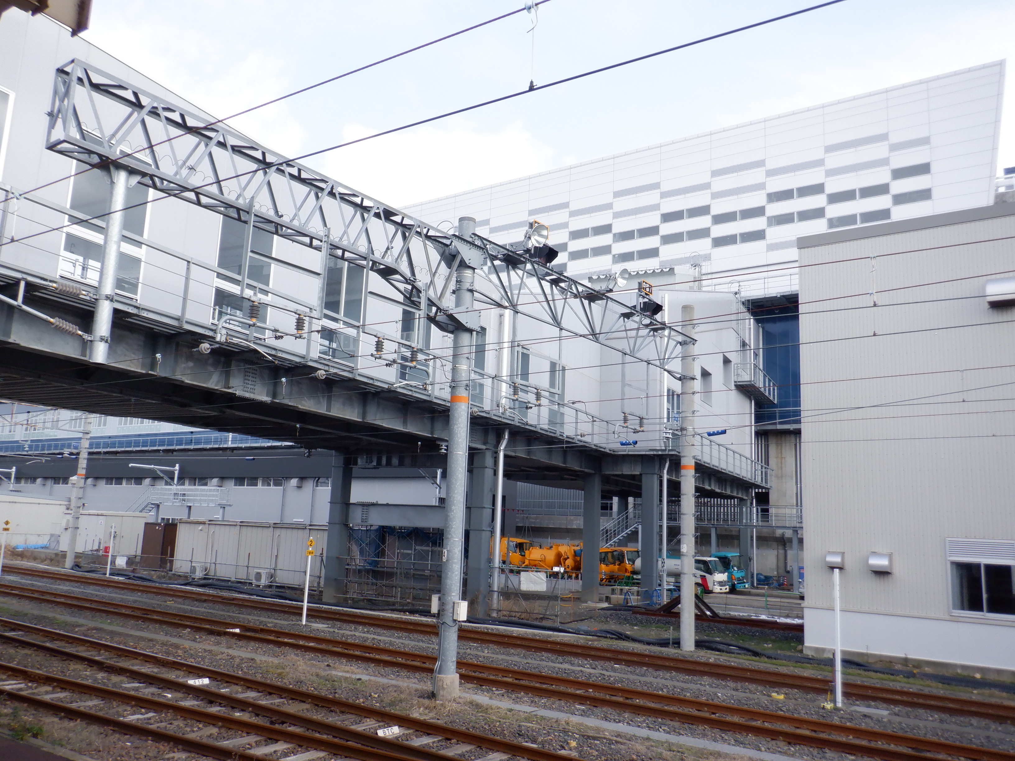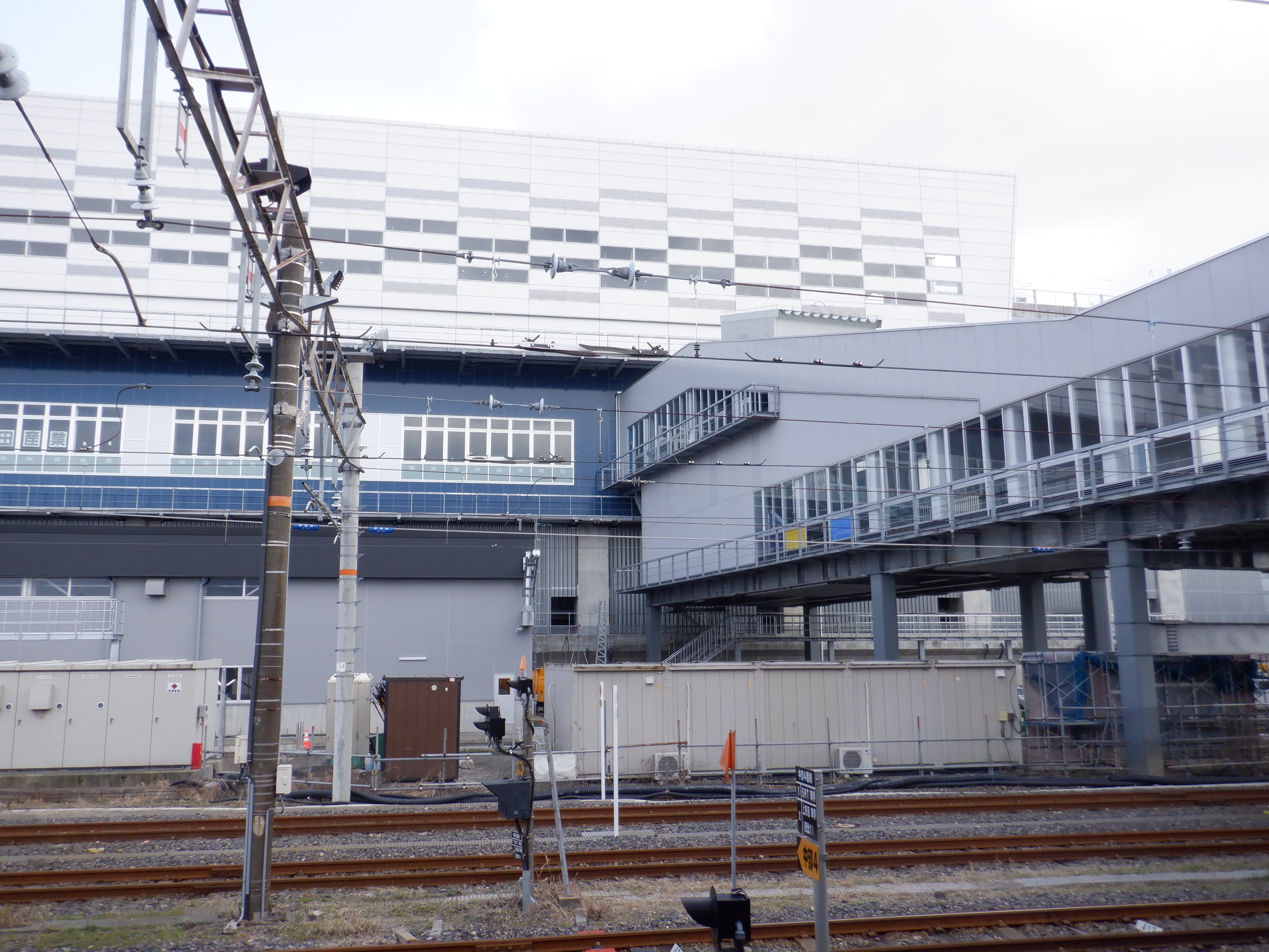 やまなみ口側も少し残っていた足場がほとんど無くなり、ごく一部を除いて足場がなくなった様子を見ることができるようになりました。また、在来線と新幹線高架の間に特急列車の検修線ができつつあります。