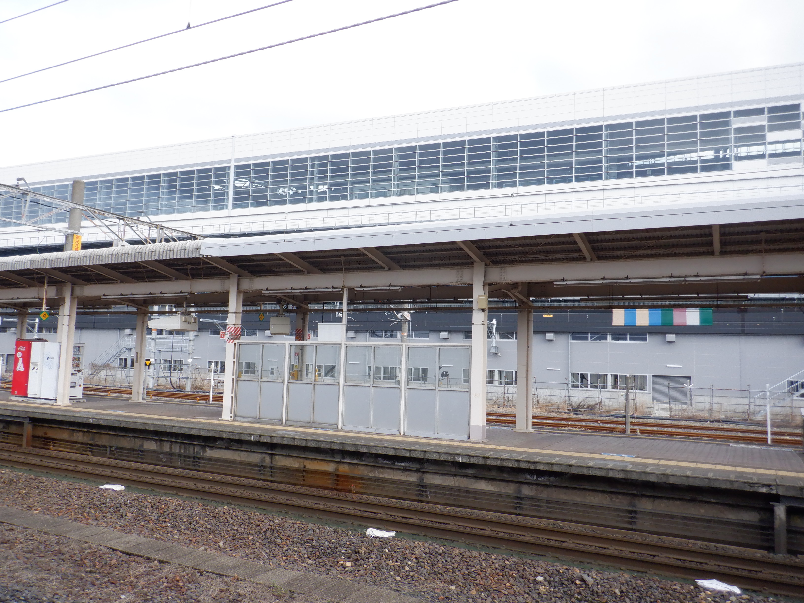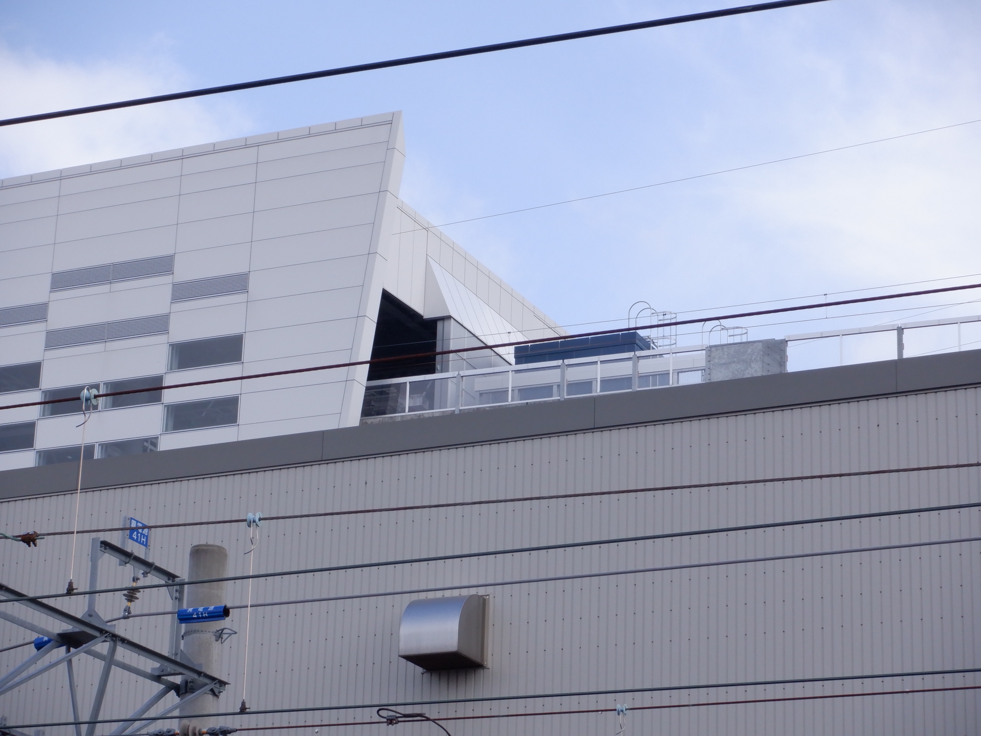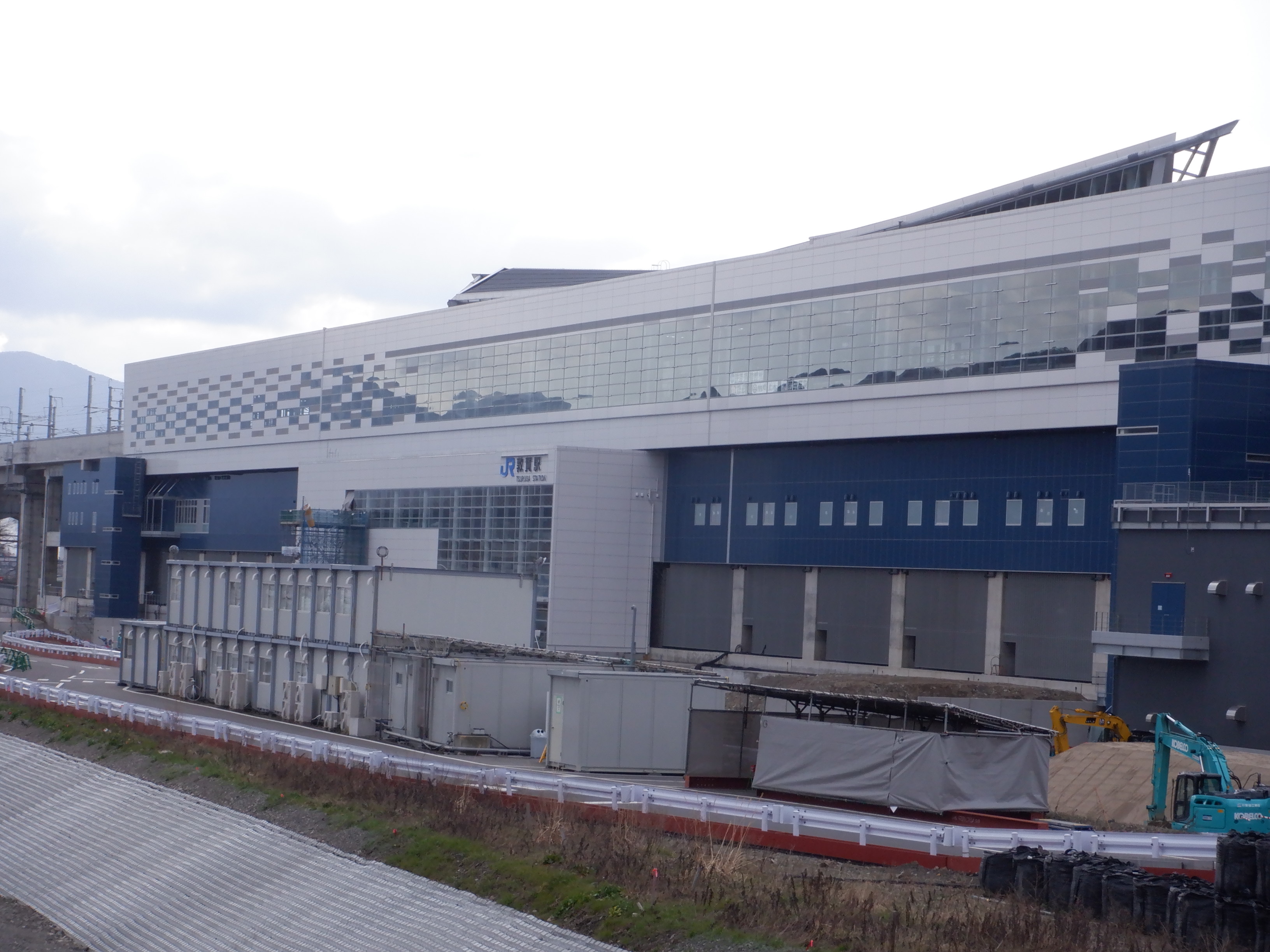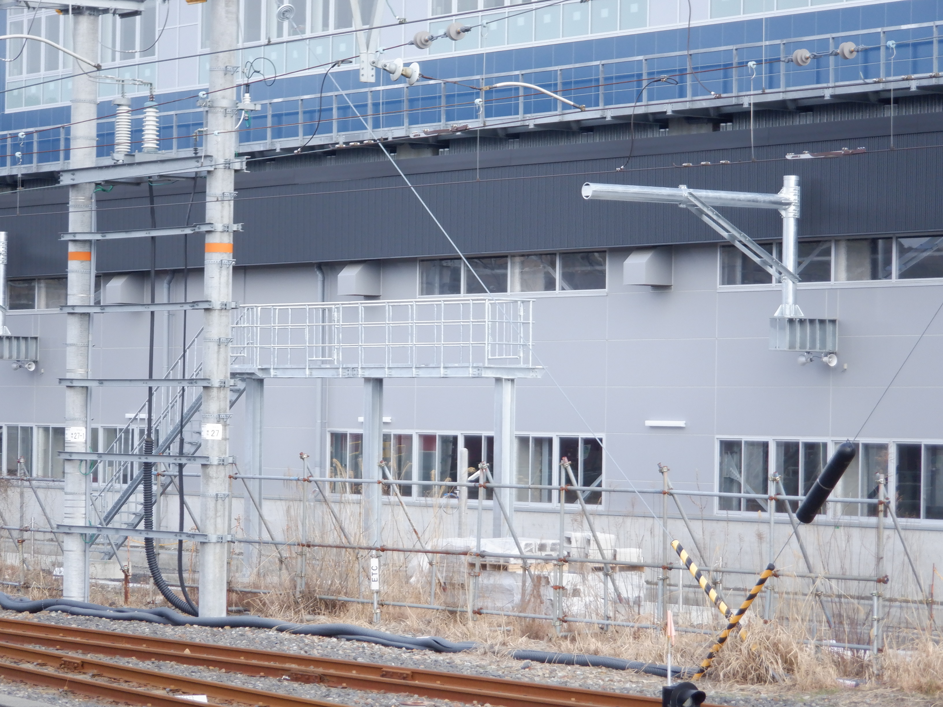 やまなみ口側も少し残っていた足場がほとんど無くなり、ごく一部を除いて足場がなくなった様子を見ることができるようになりました。また、在来線と新幹線高架の間に特急列車の検修線ができつつあります。