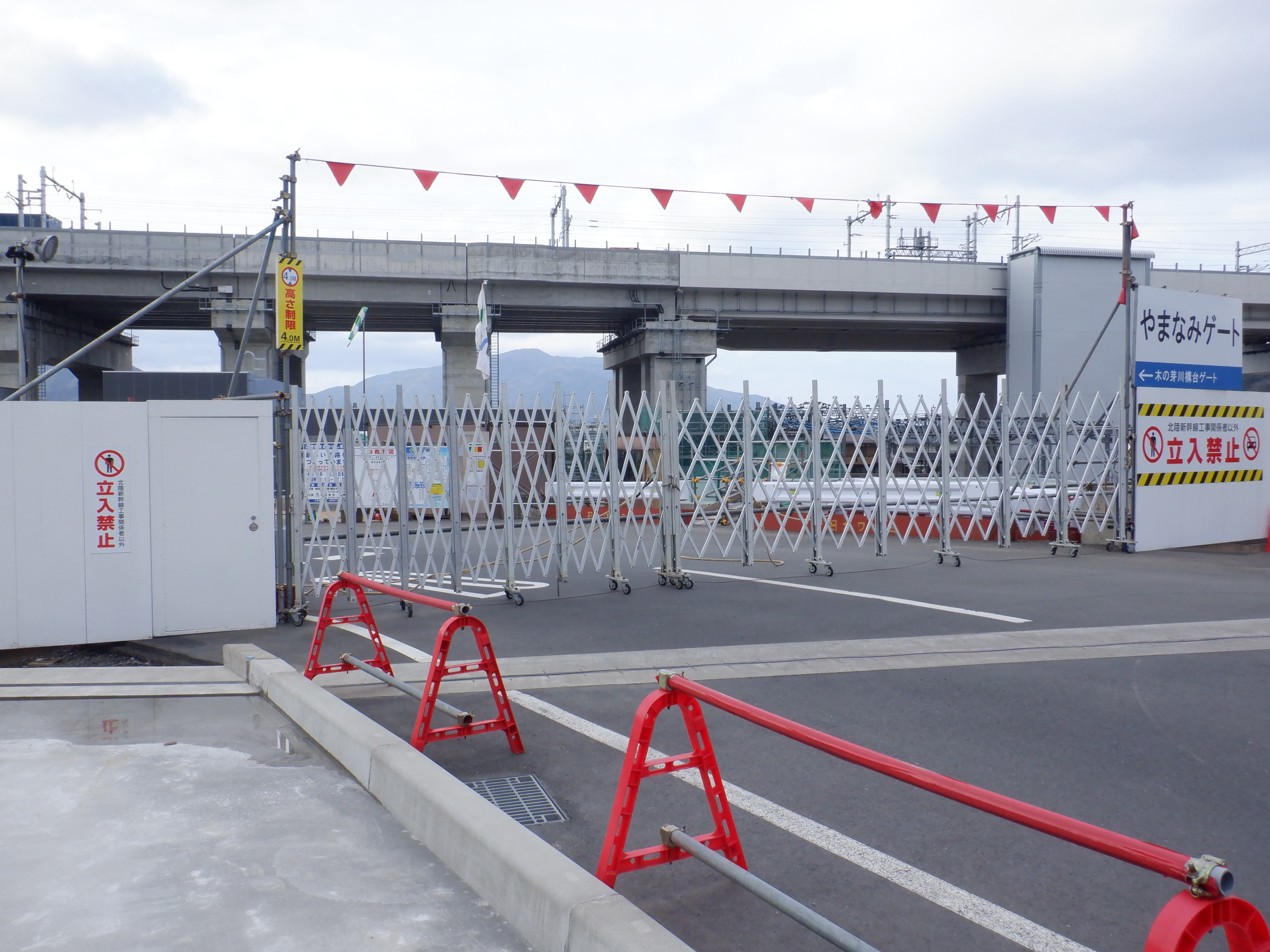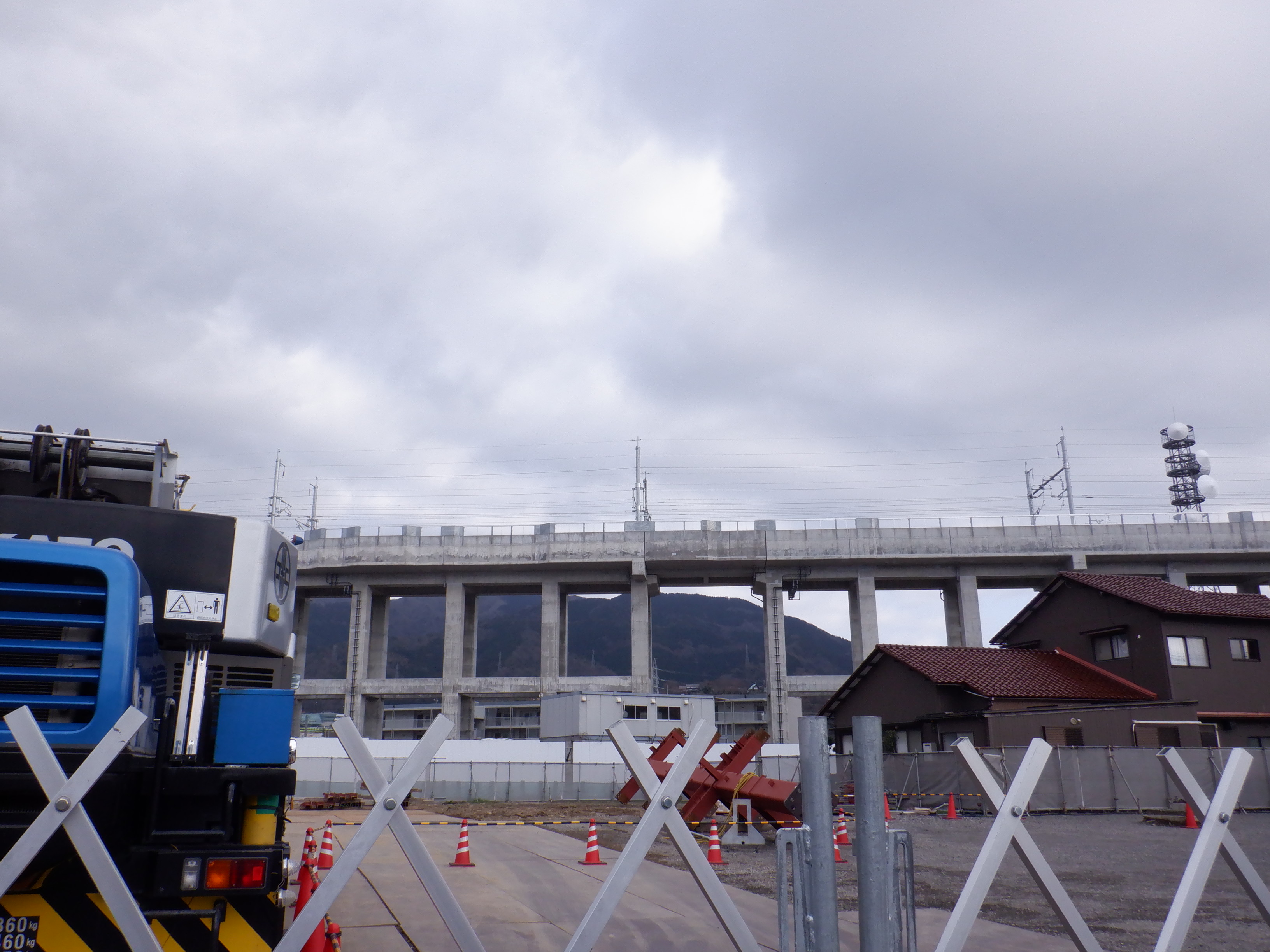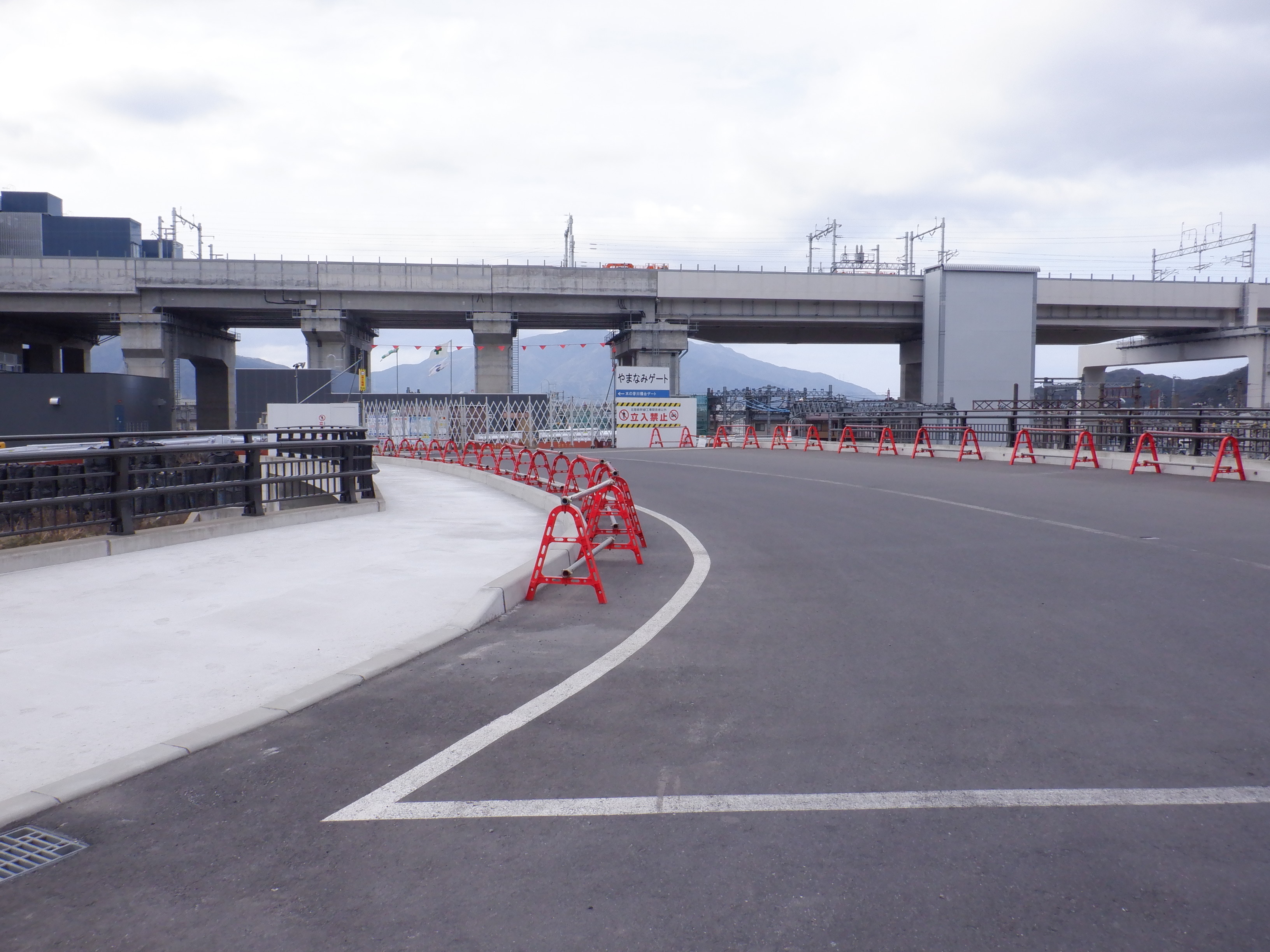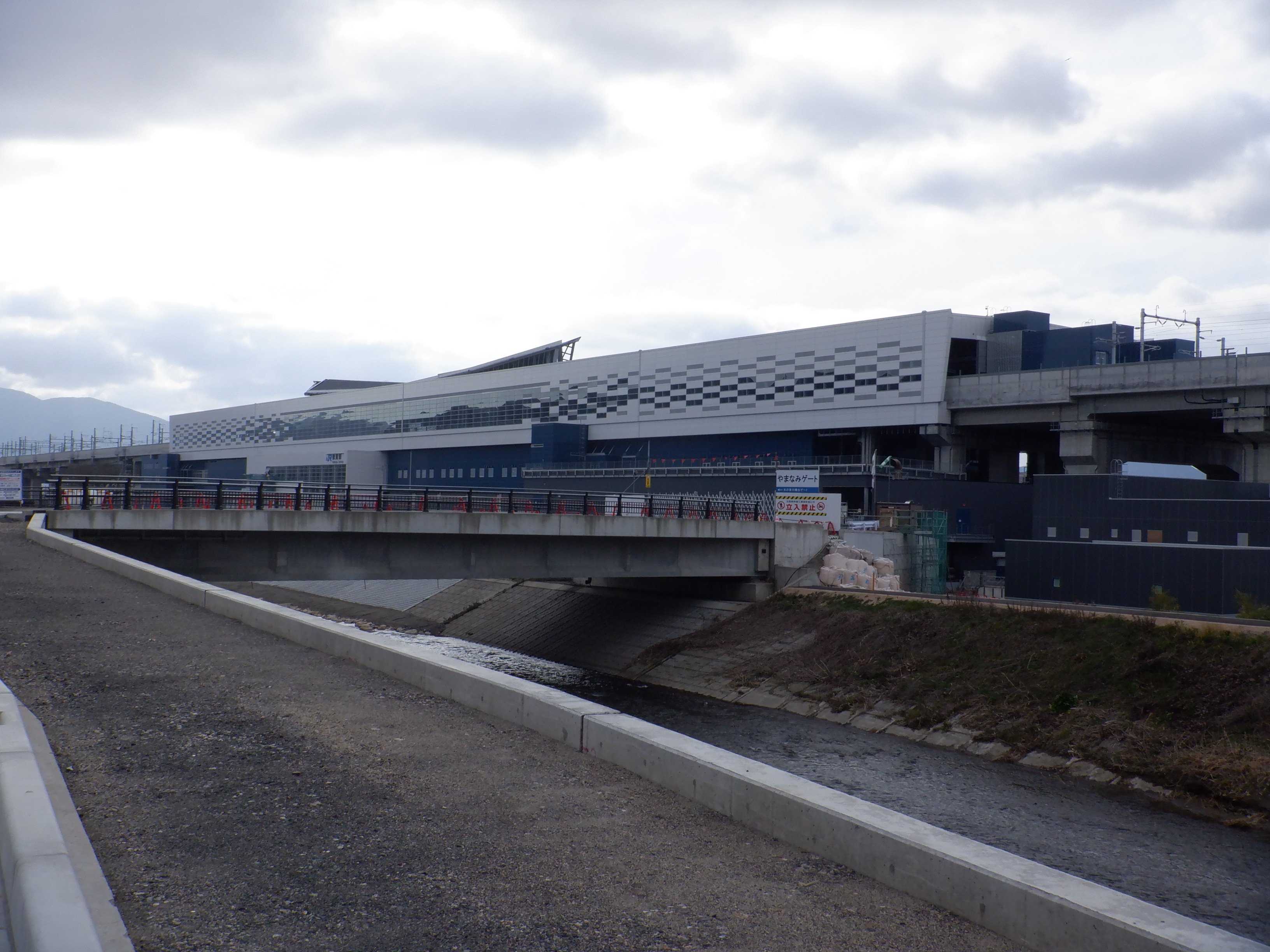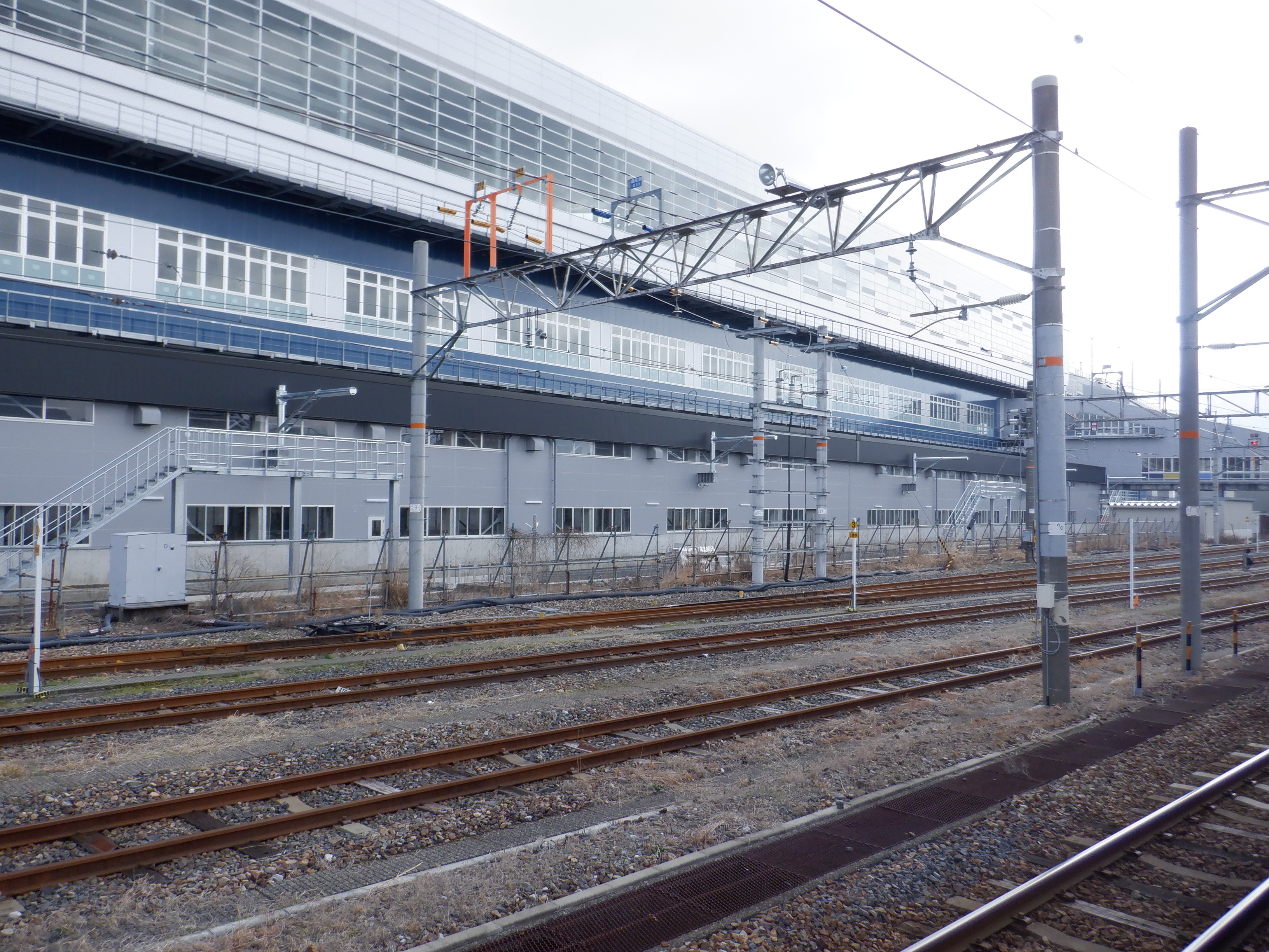 やまなみ口側も少し残っていた足場がほとんど無くなり、ごく一部を除いて足場がなくなった様子を見ることができるようになりました。また、在来線と新幹線高架の間に特急列車の検修線ができつつあります。