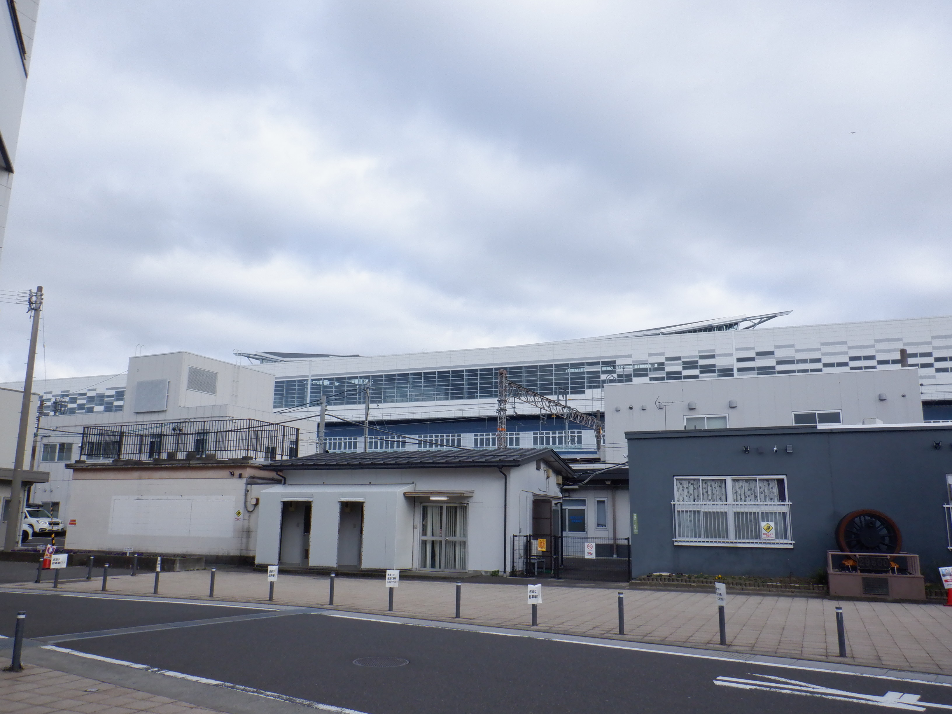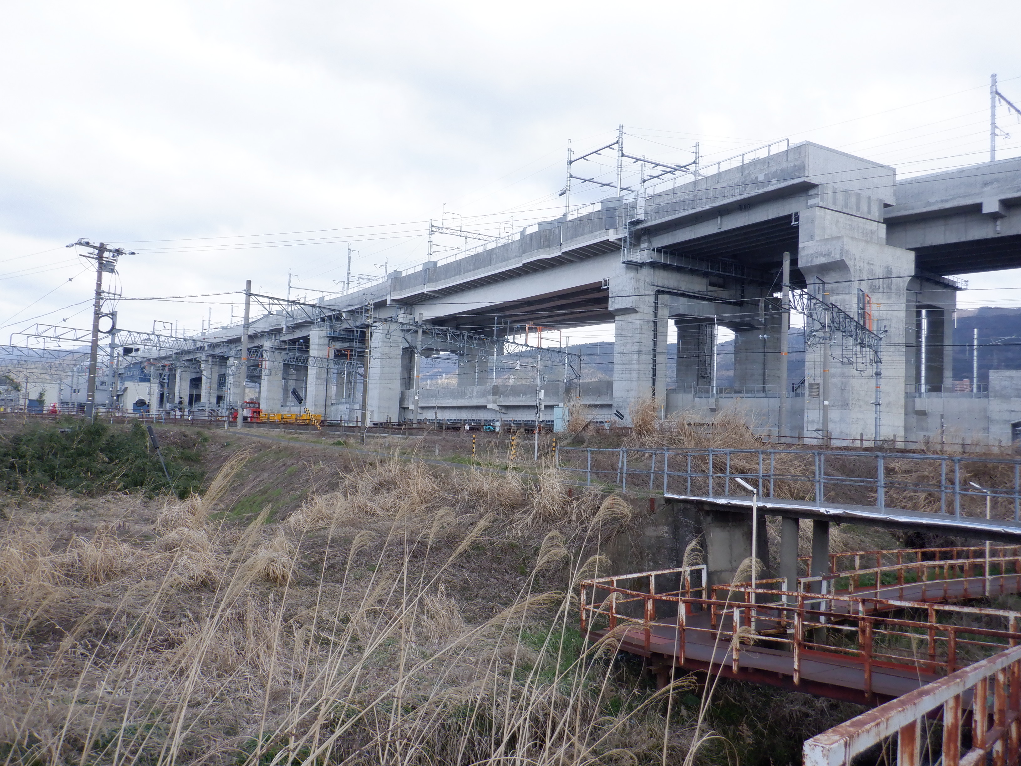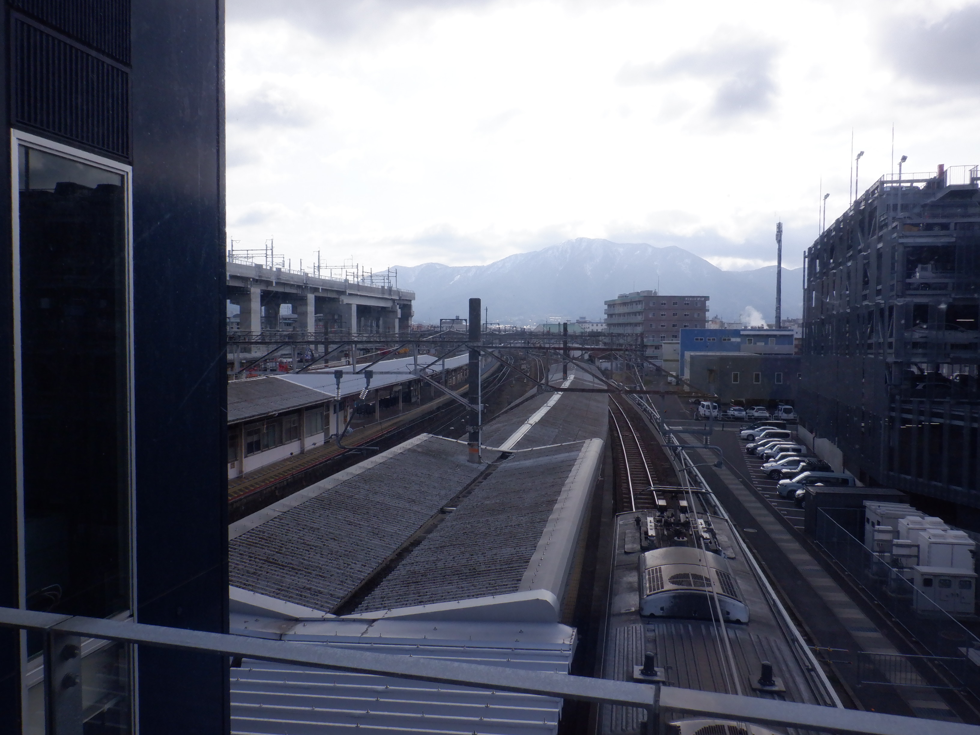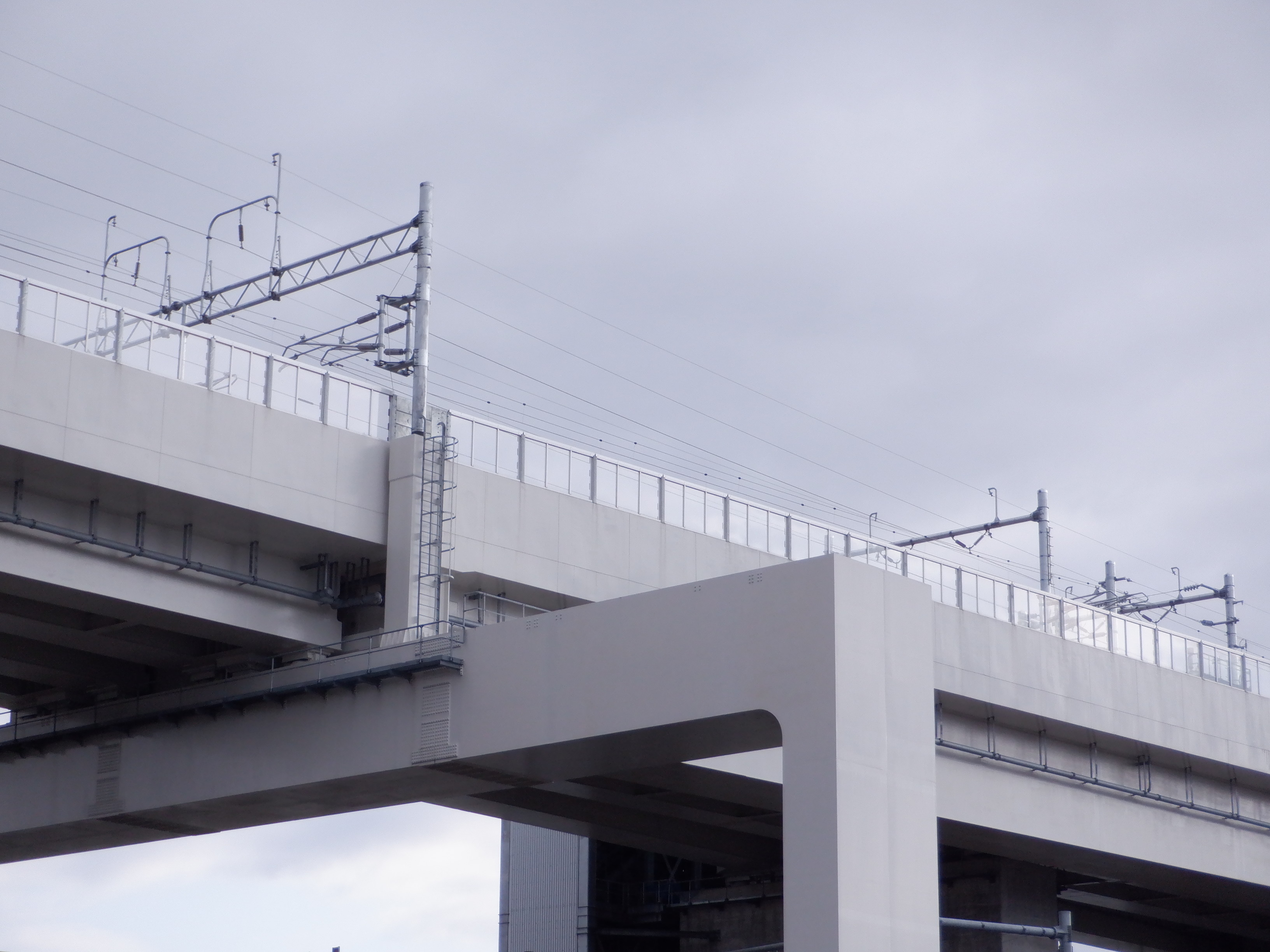 やまなみ口側も少し残っていた足場がほとんど無くなり、ごく一部を除いて足場がなくなった様子を見ることができるようになりました。また、在来線と新幹線高架の間に特急列車の検修線ができつつあります。