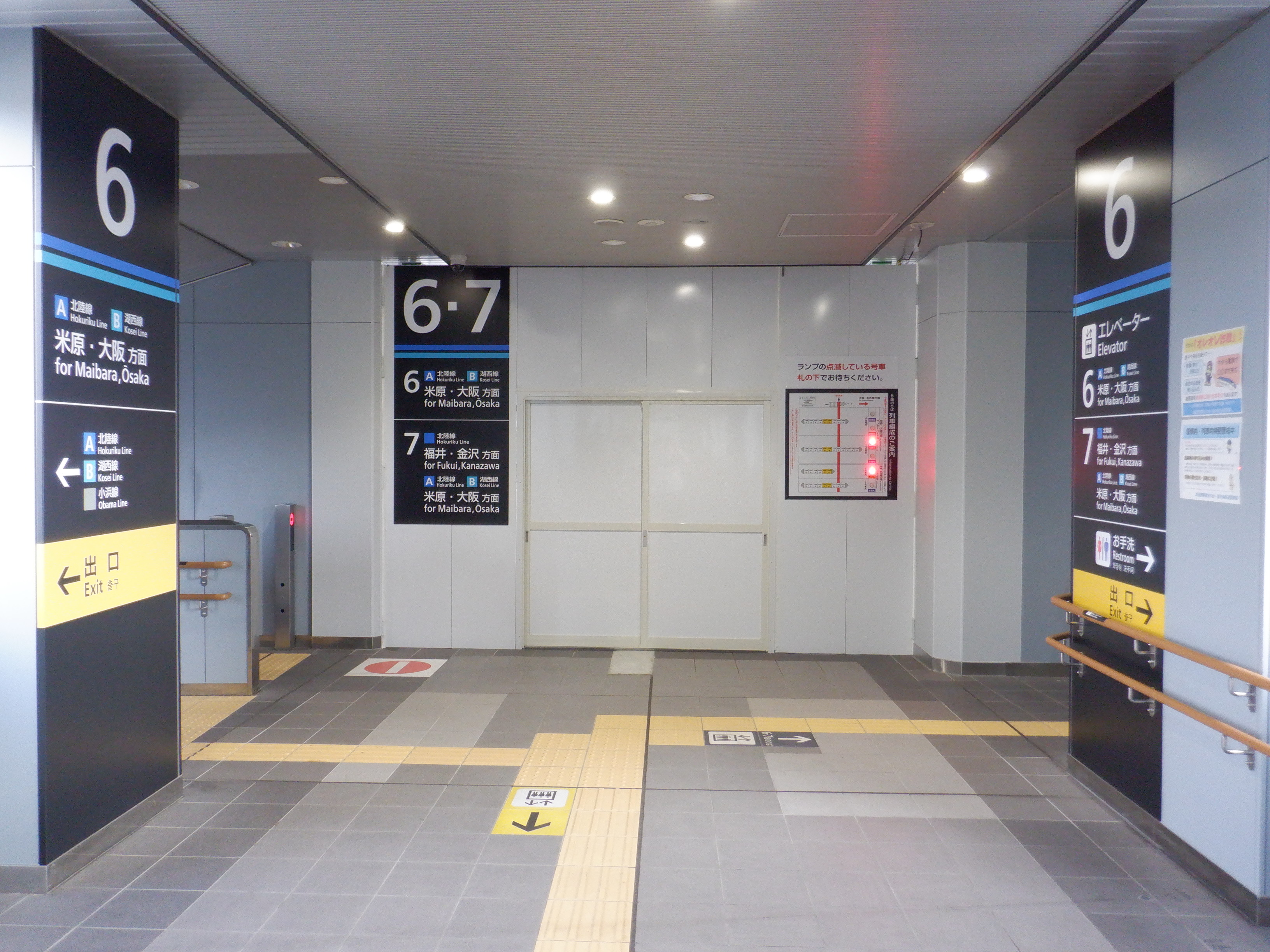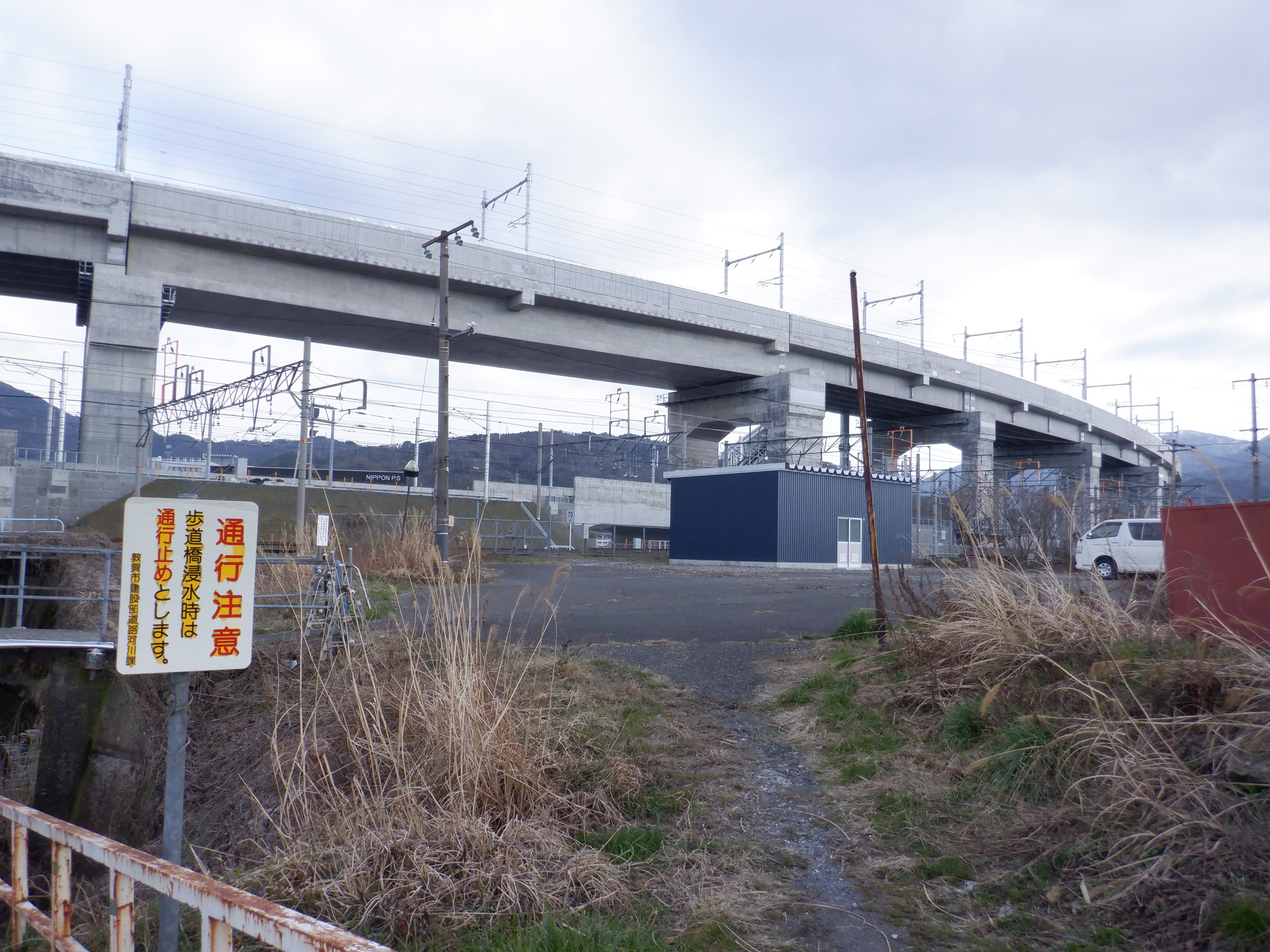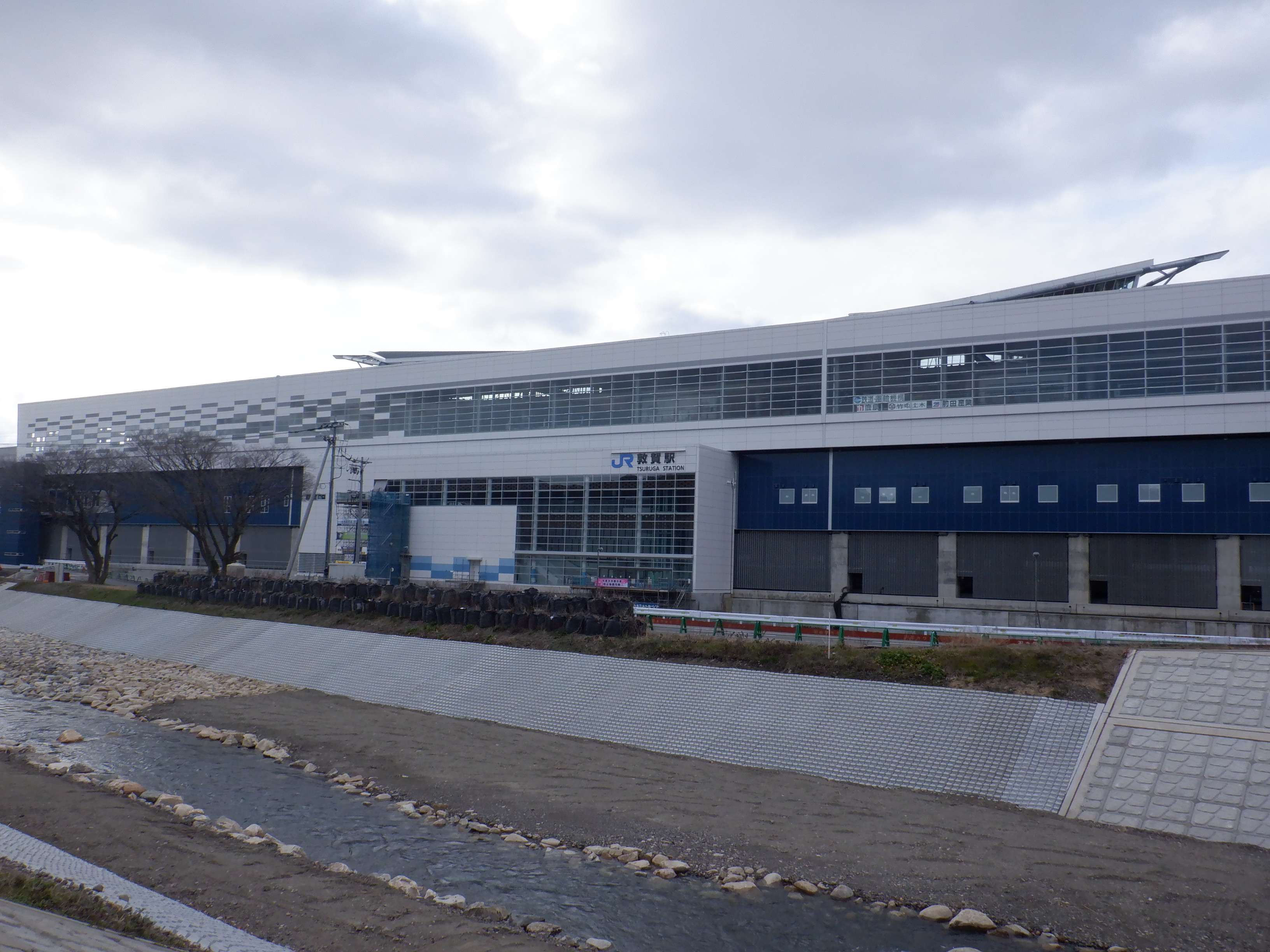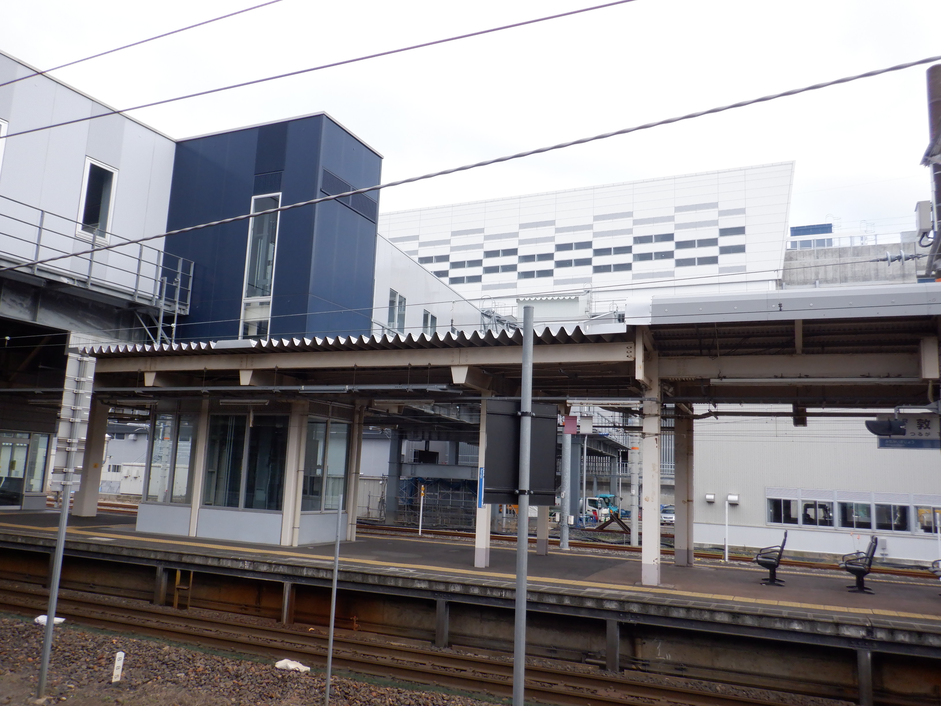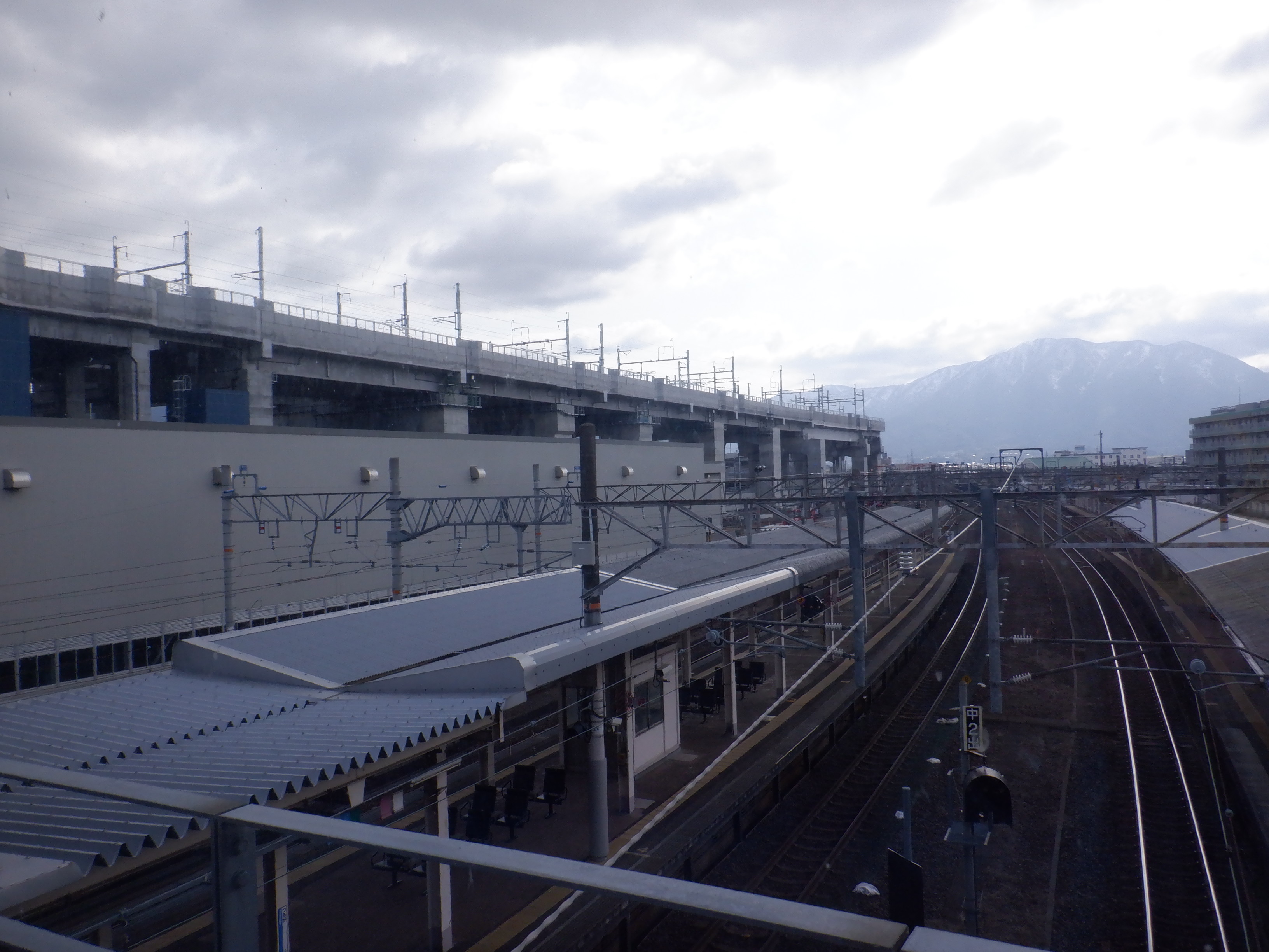 6・7番のりば跨線橋と新疋田駅側から見た新幹線駅舎。