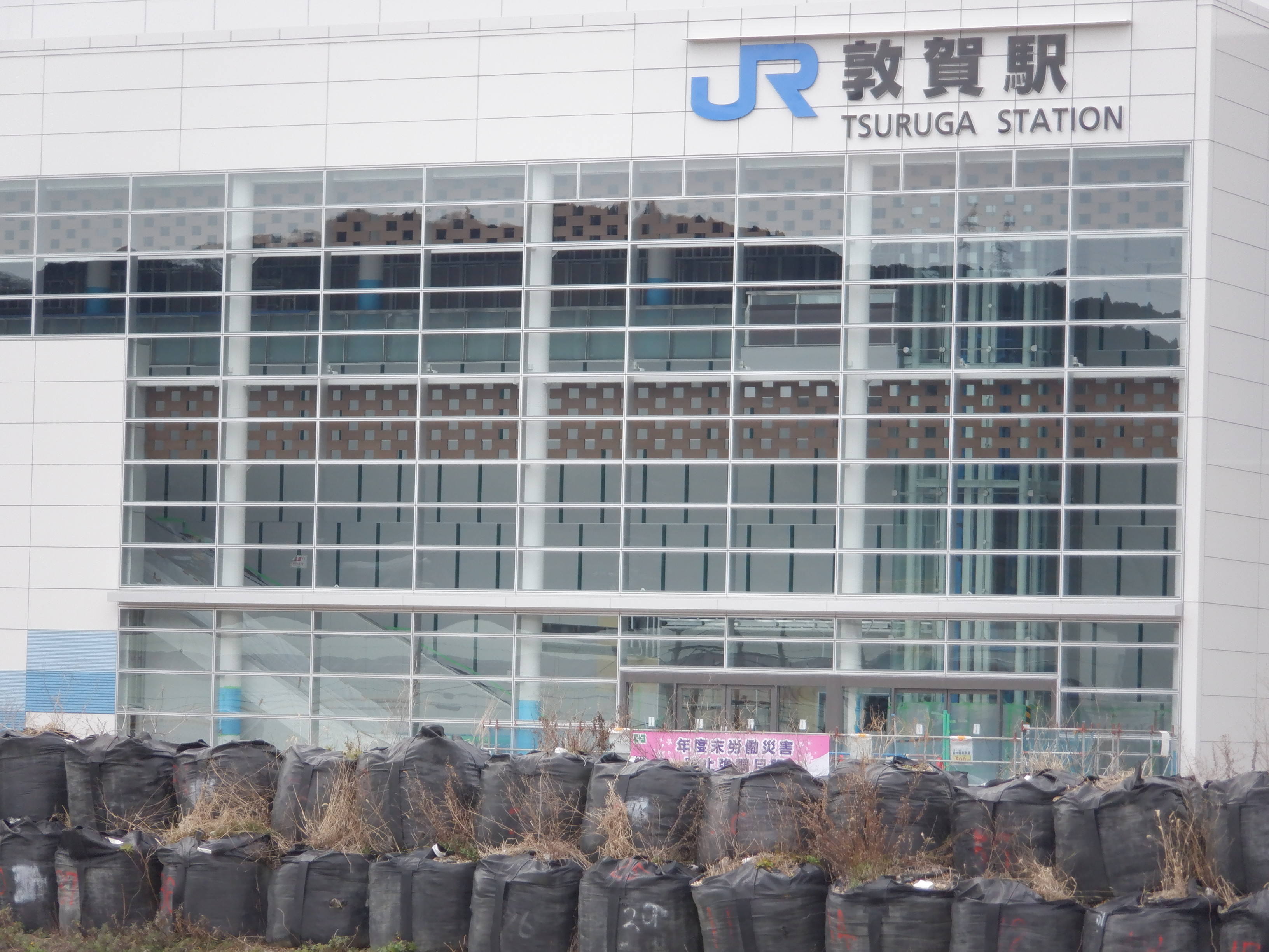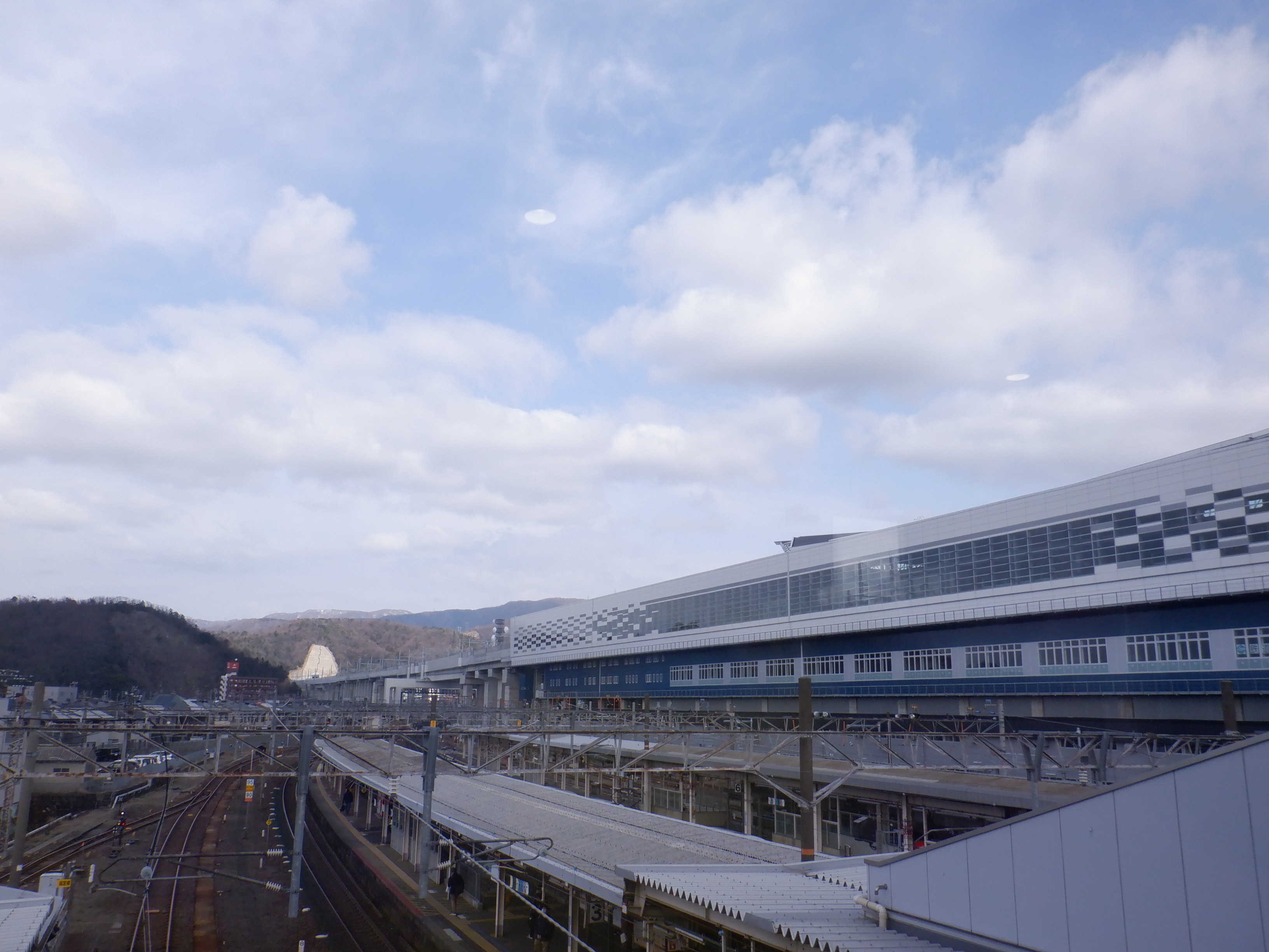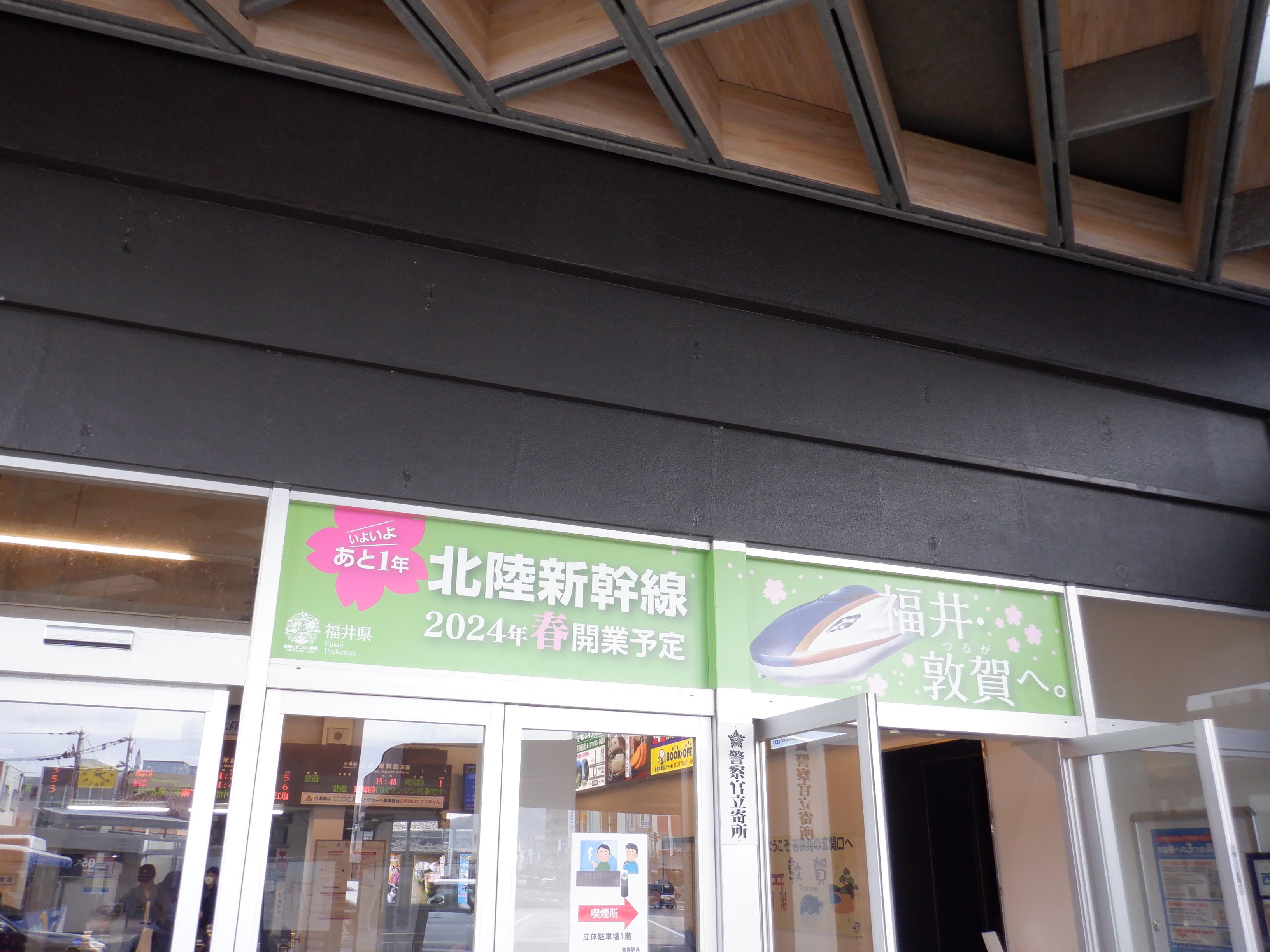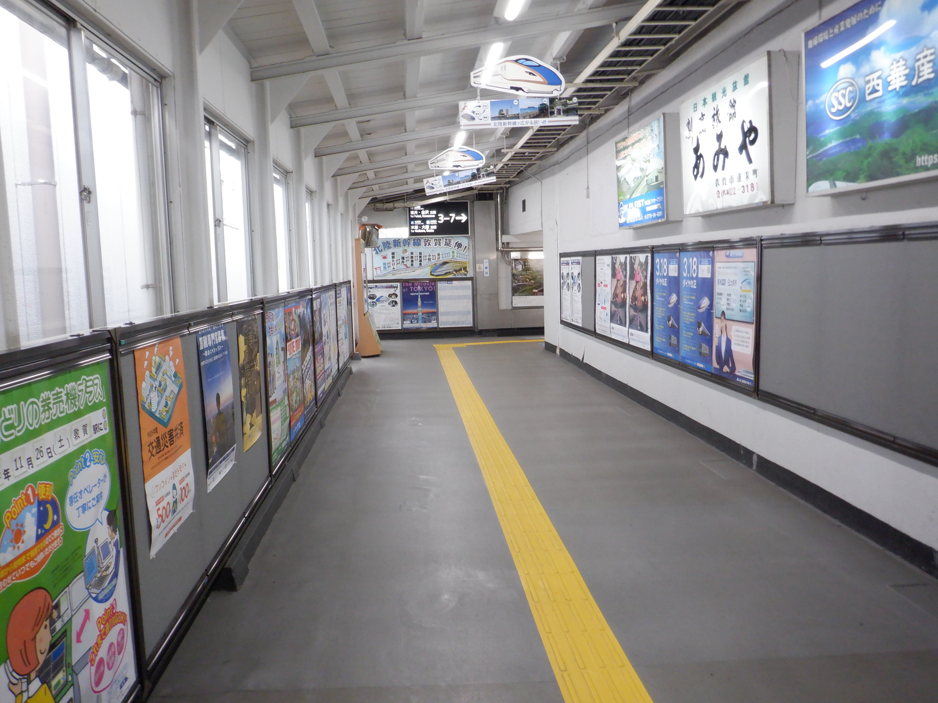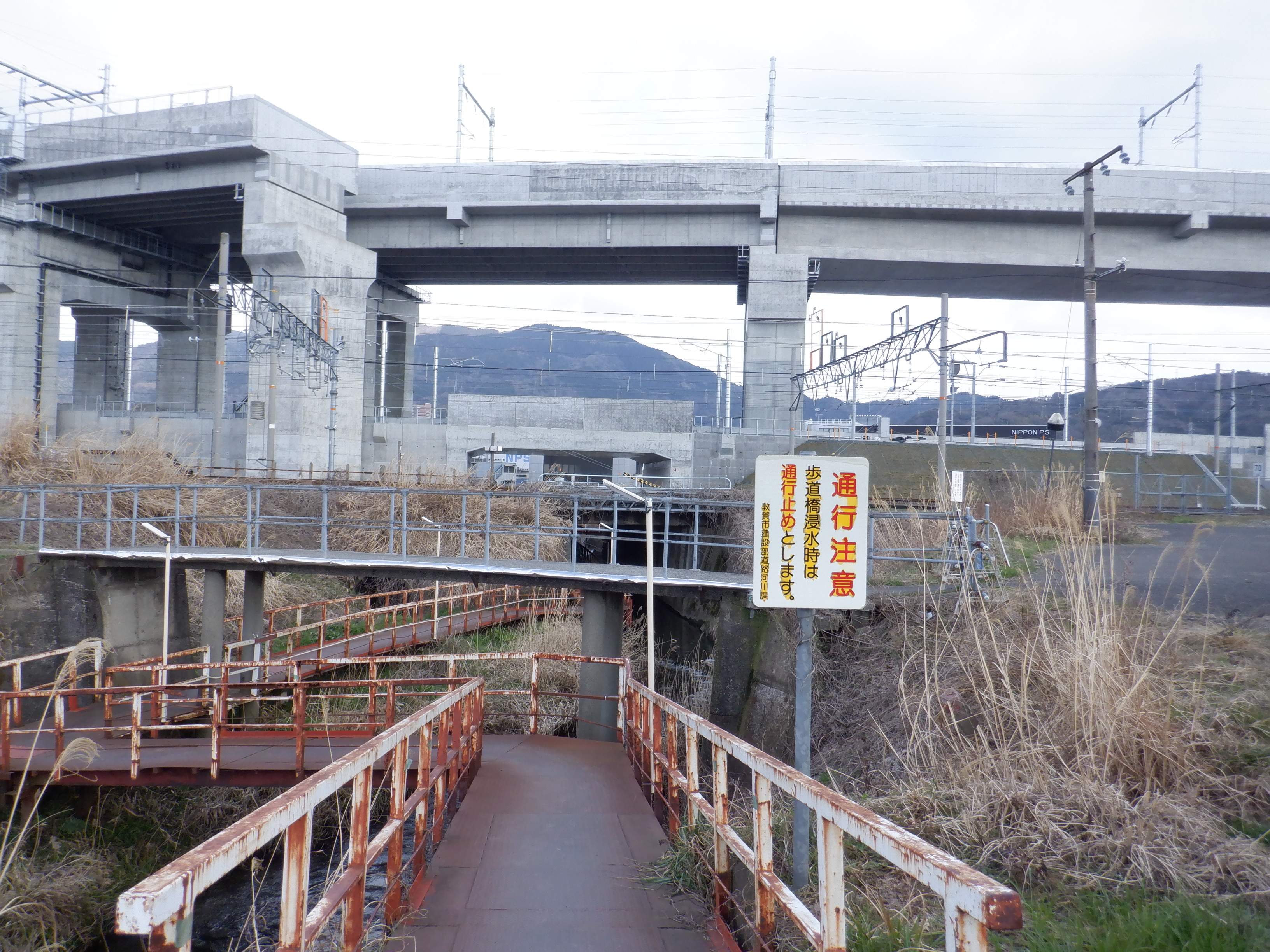 6・7番のりば跨線橋と新疋田駅側から見た新幹線駅舎。