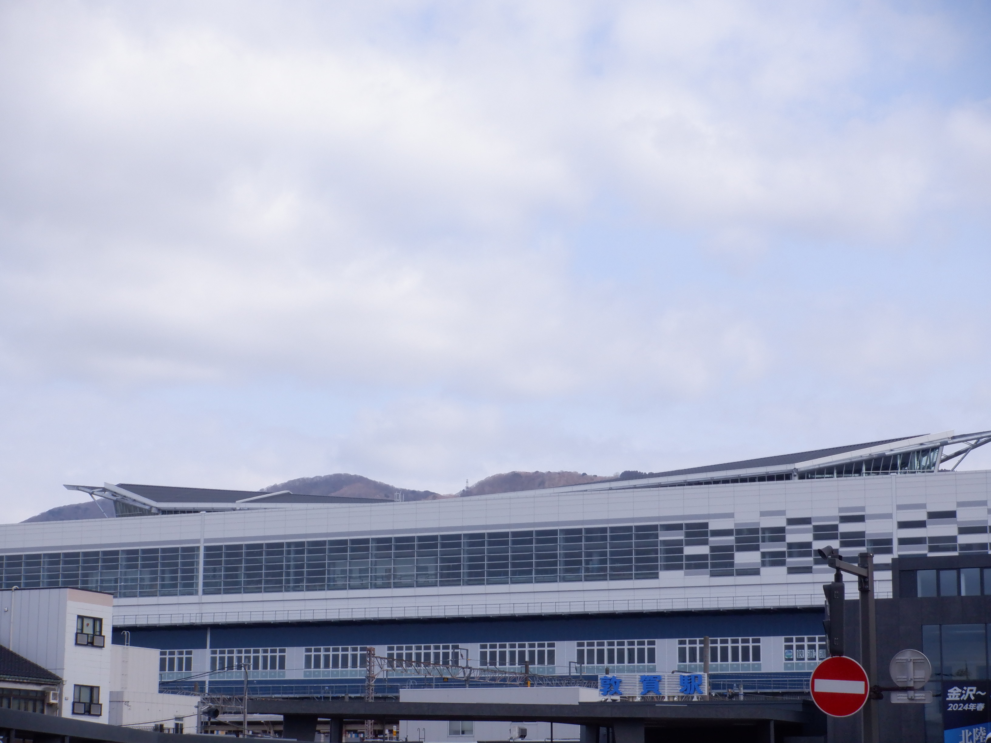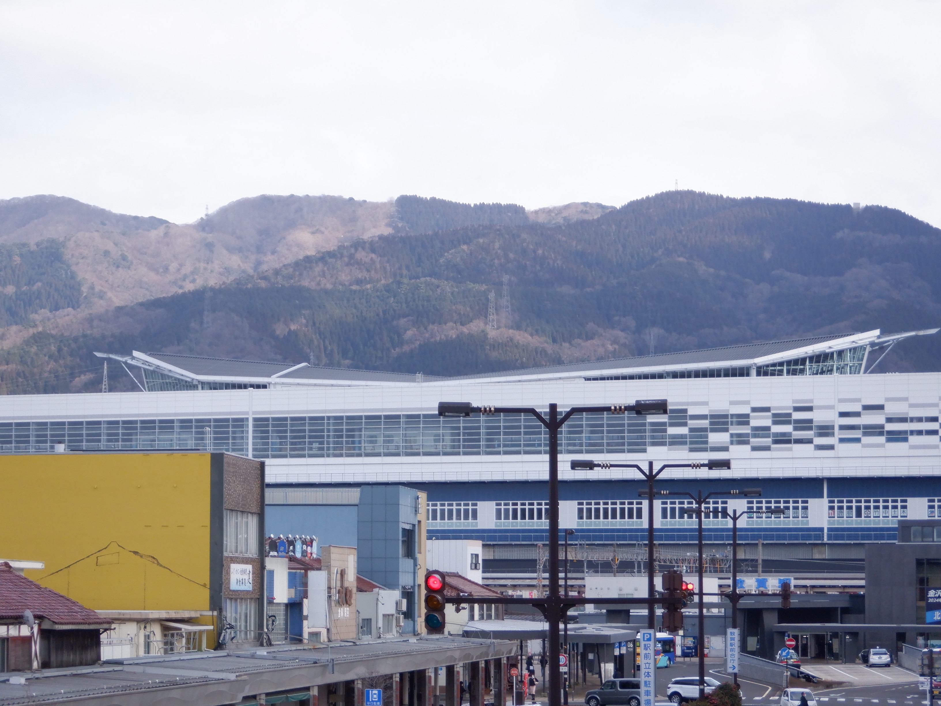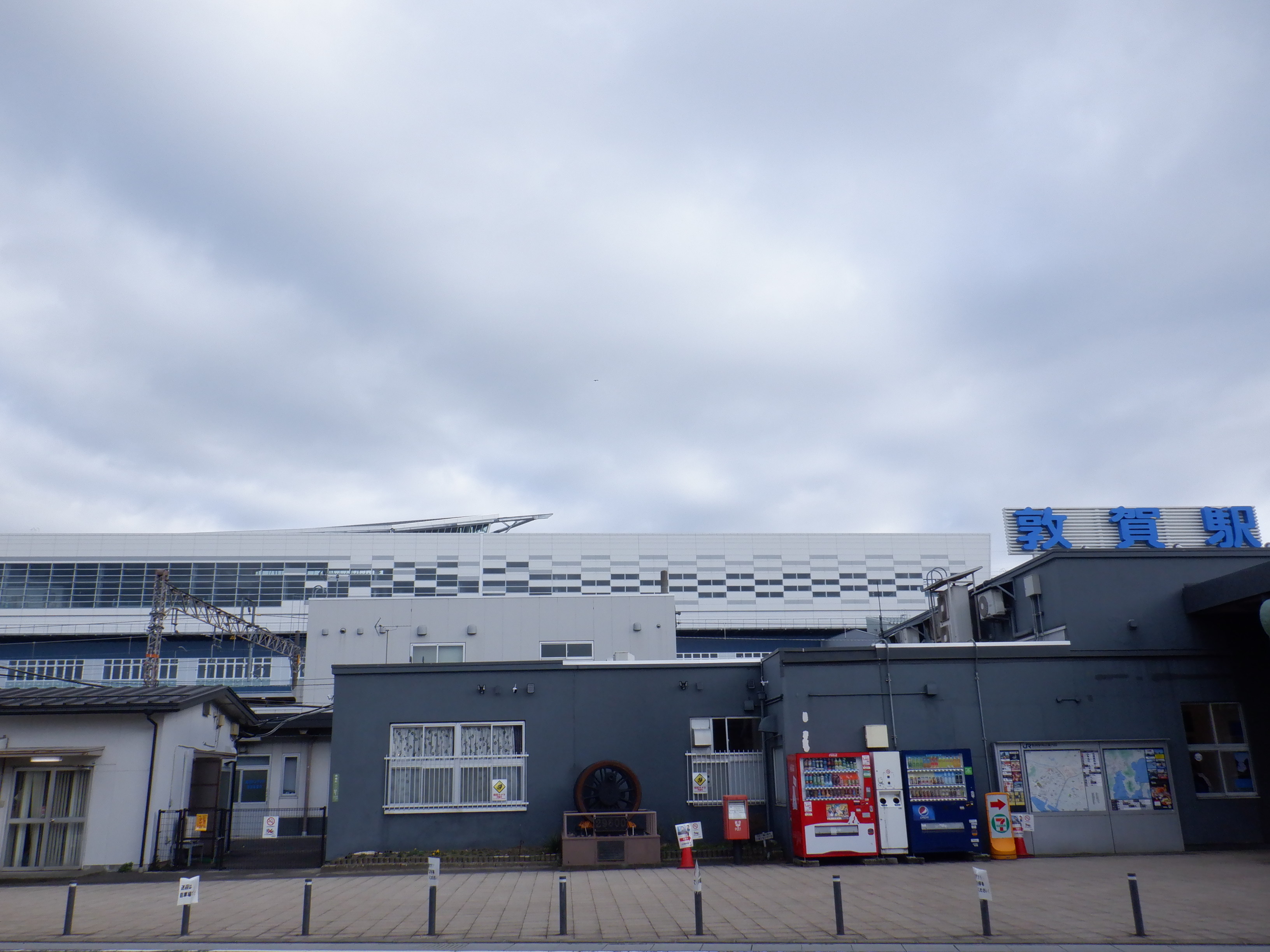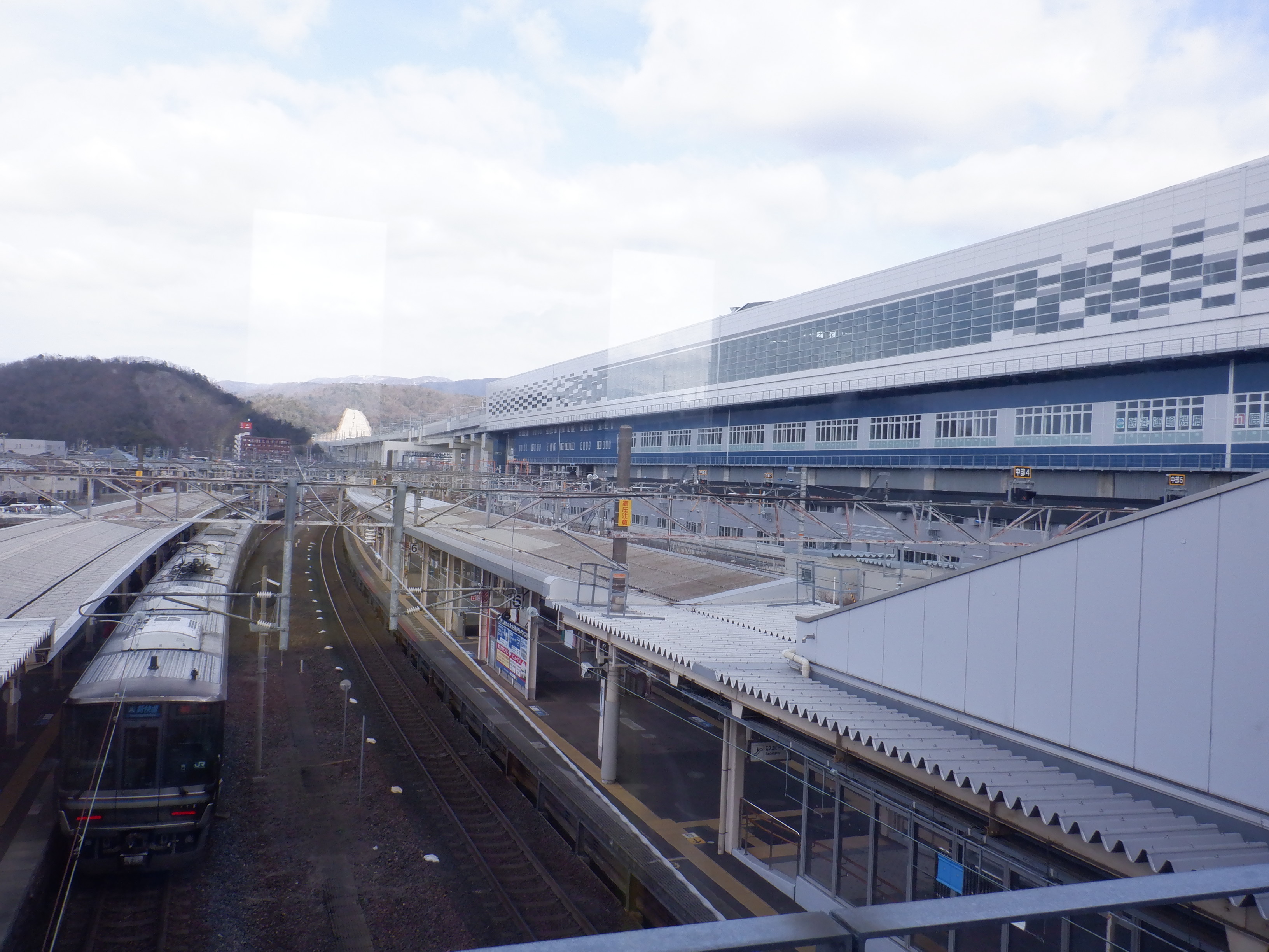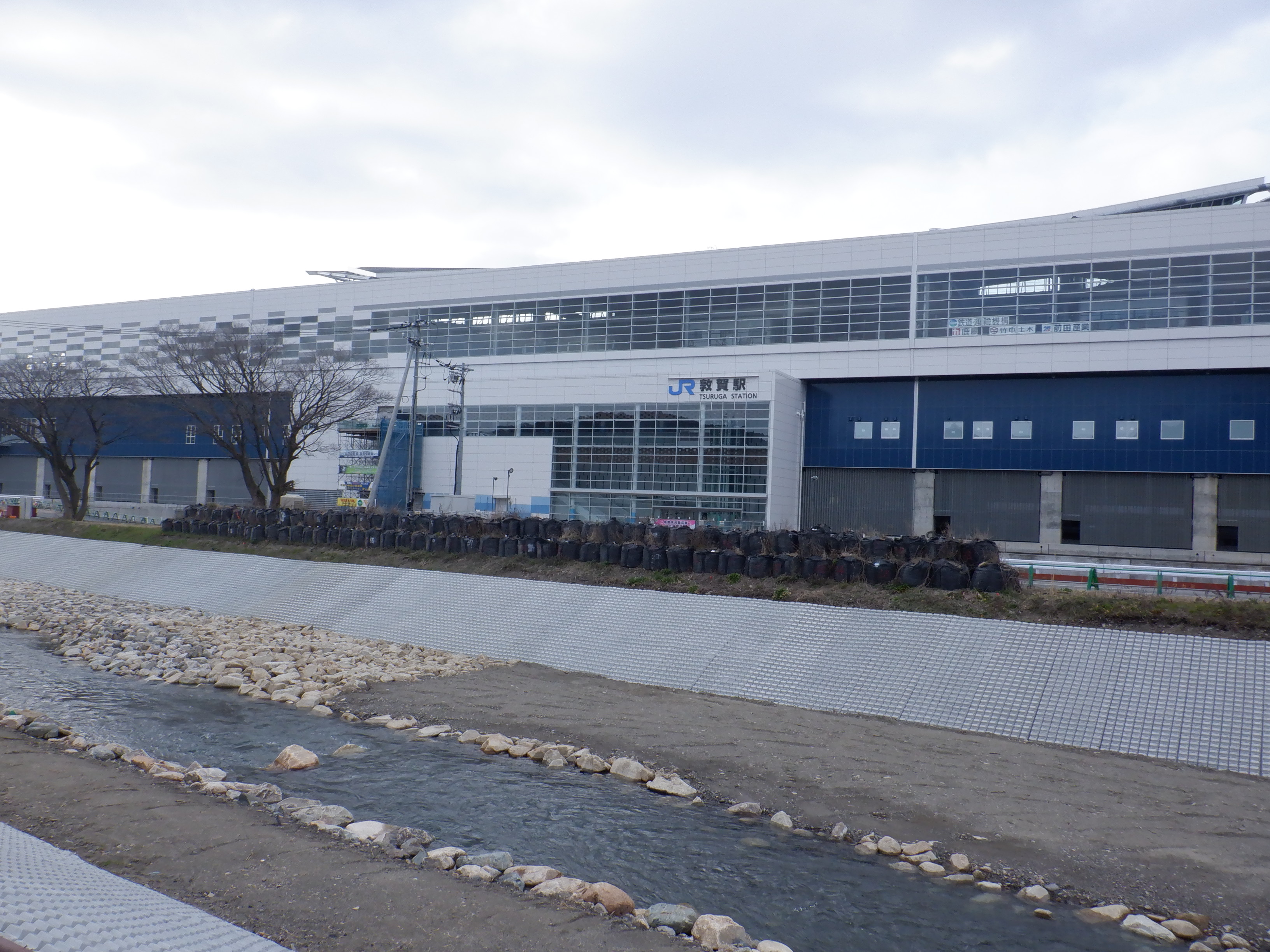 6・7番のりば跨線橋と新疋田駅側から見た新幹線駅舎。