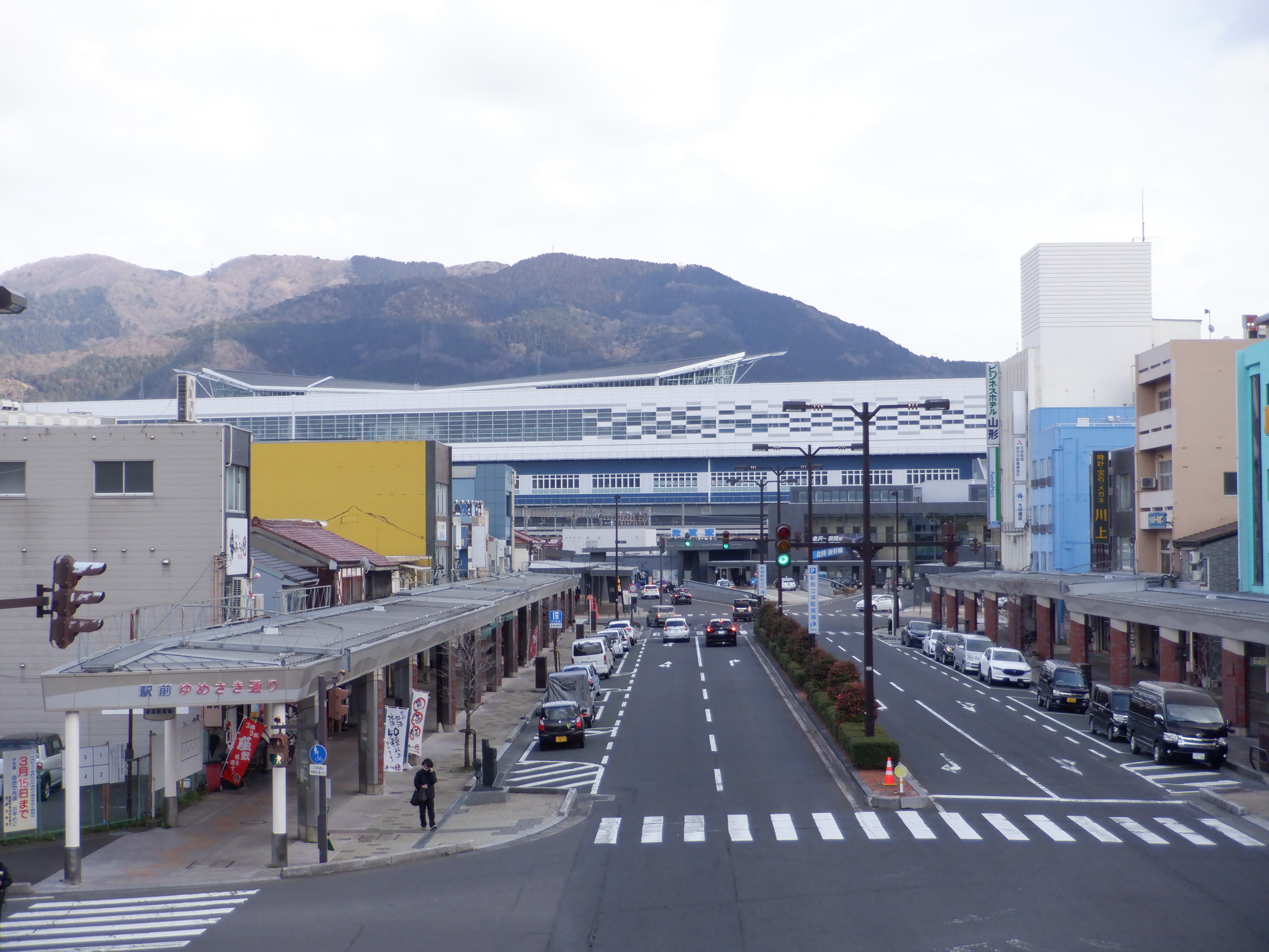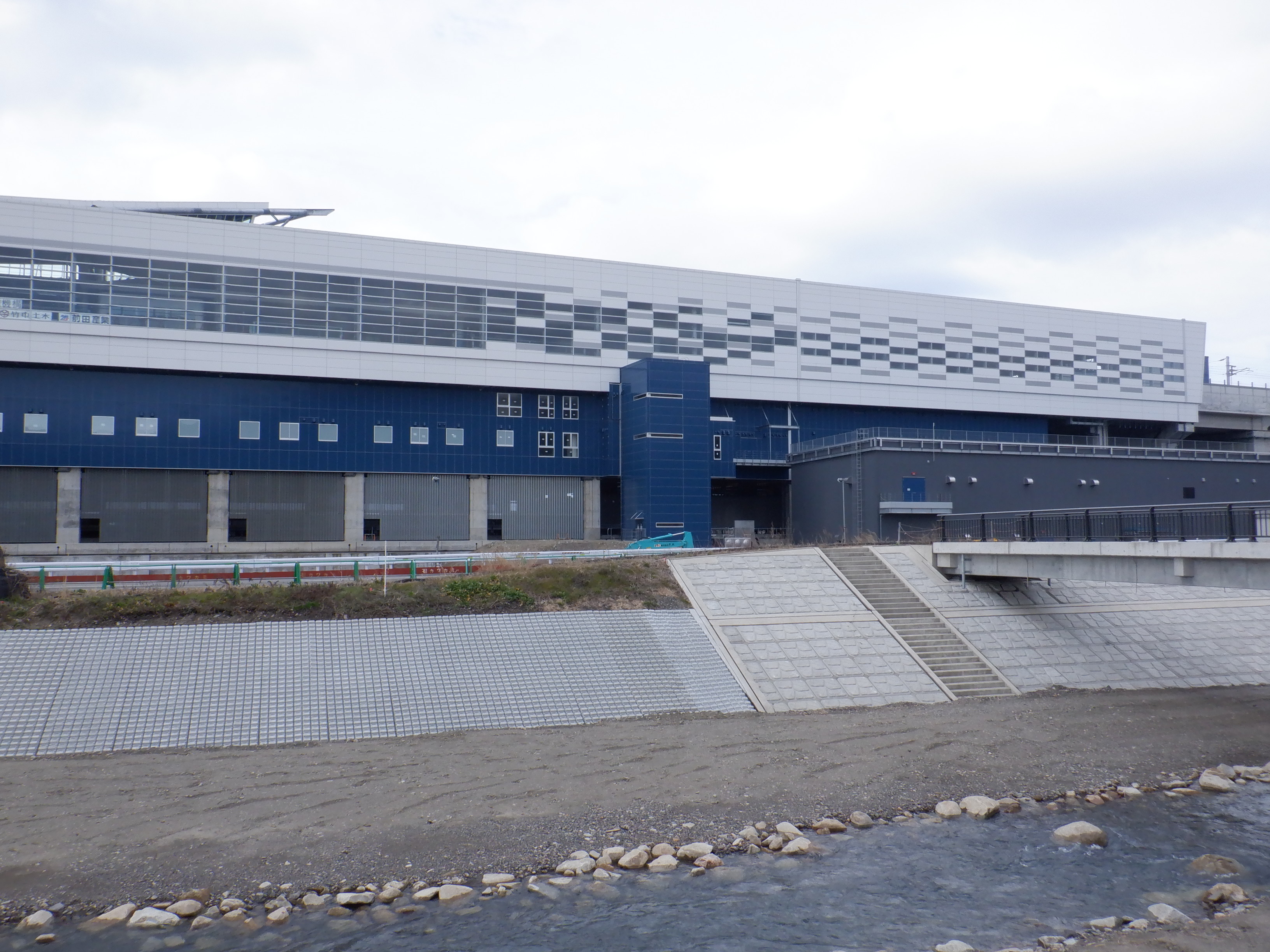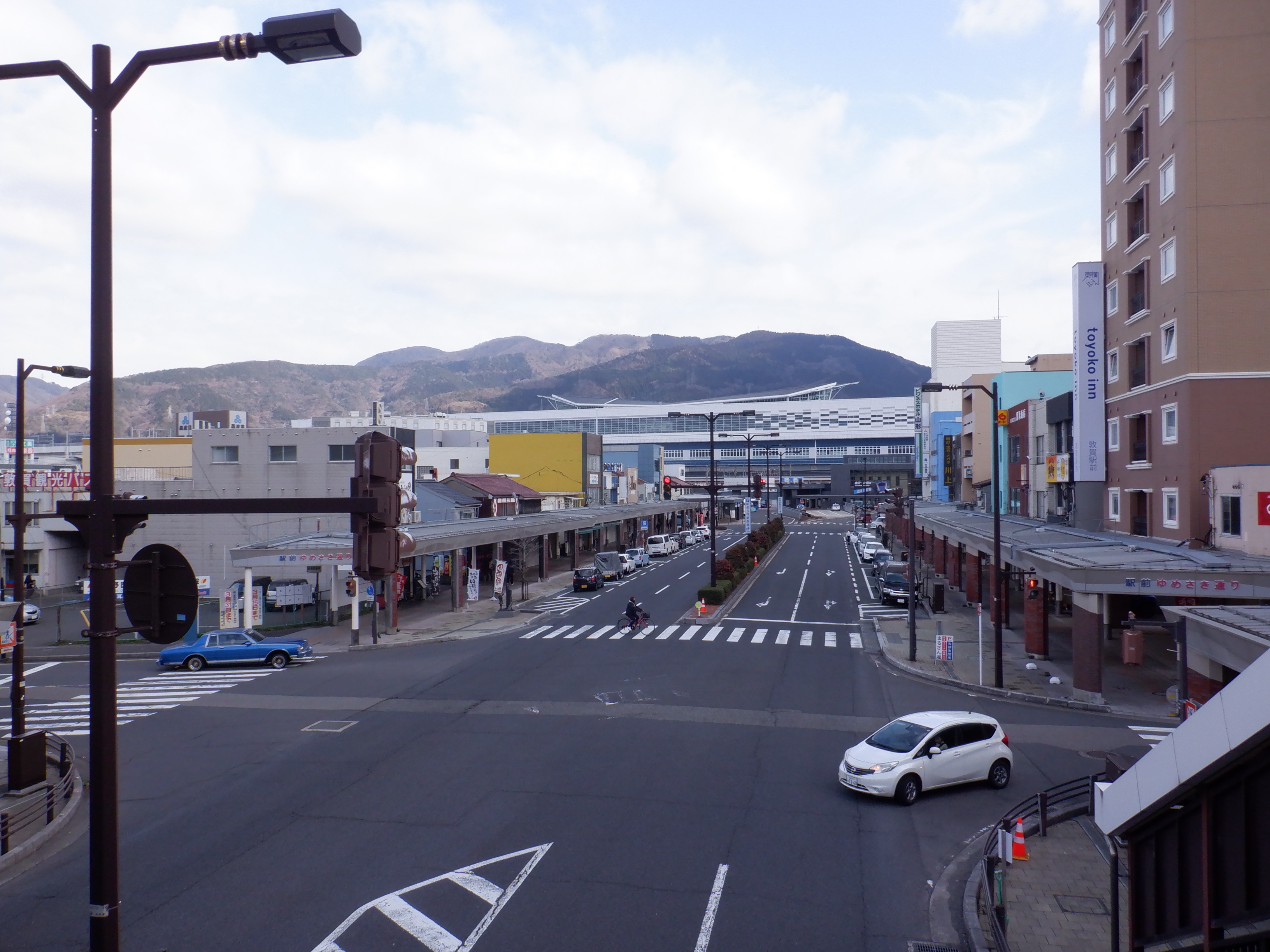 やまなみ口の中央付近の対岸から見た駅舎の様子。