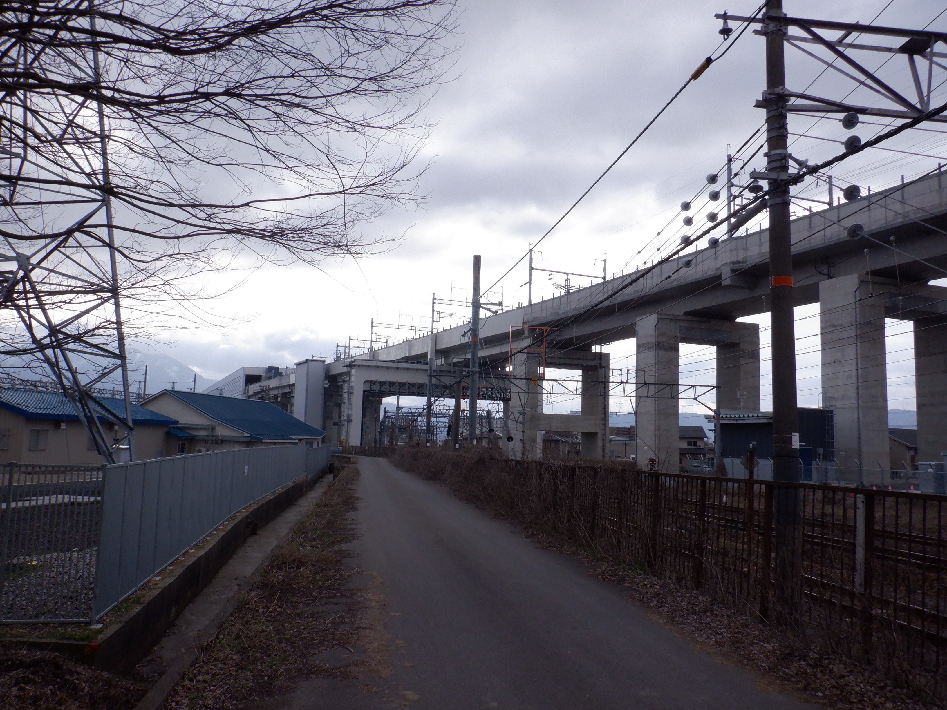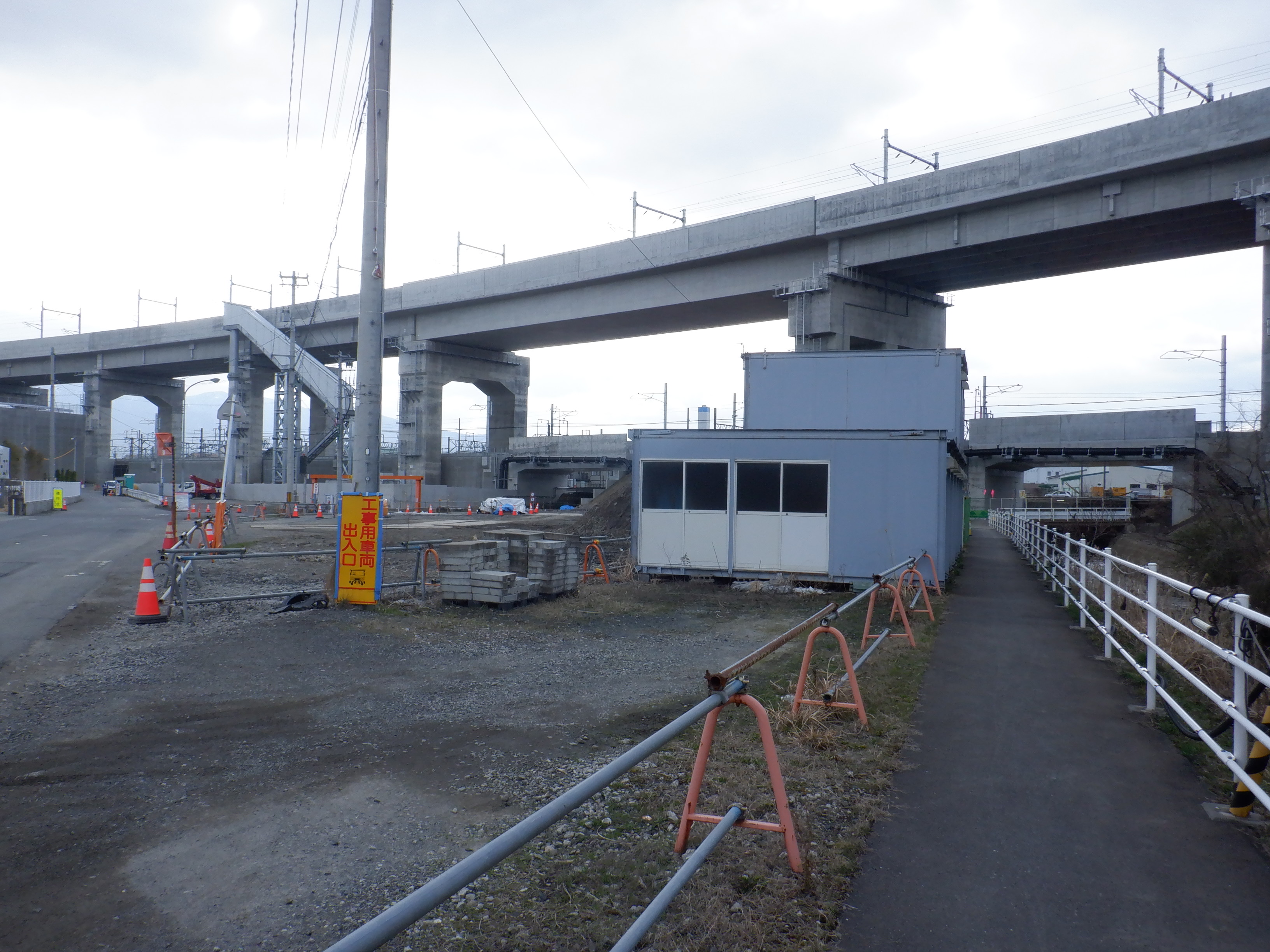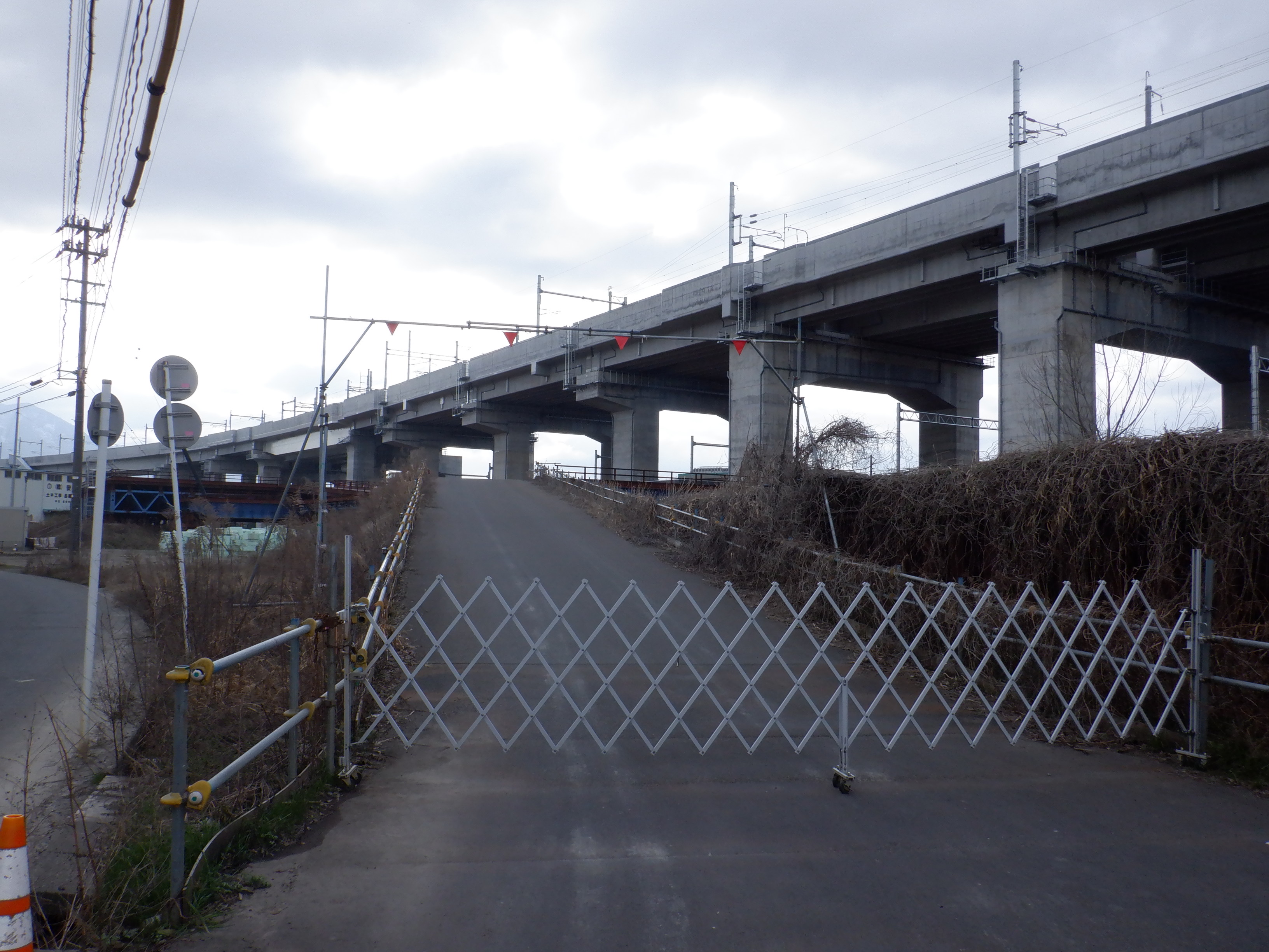 踏切を渡ったところとそのあたりから見た高架の様子。
