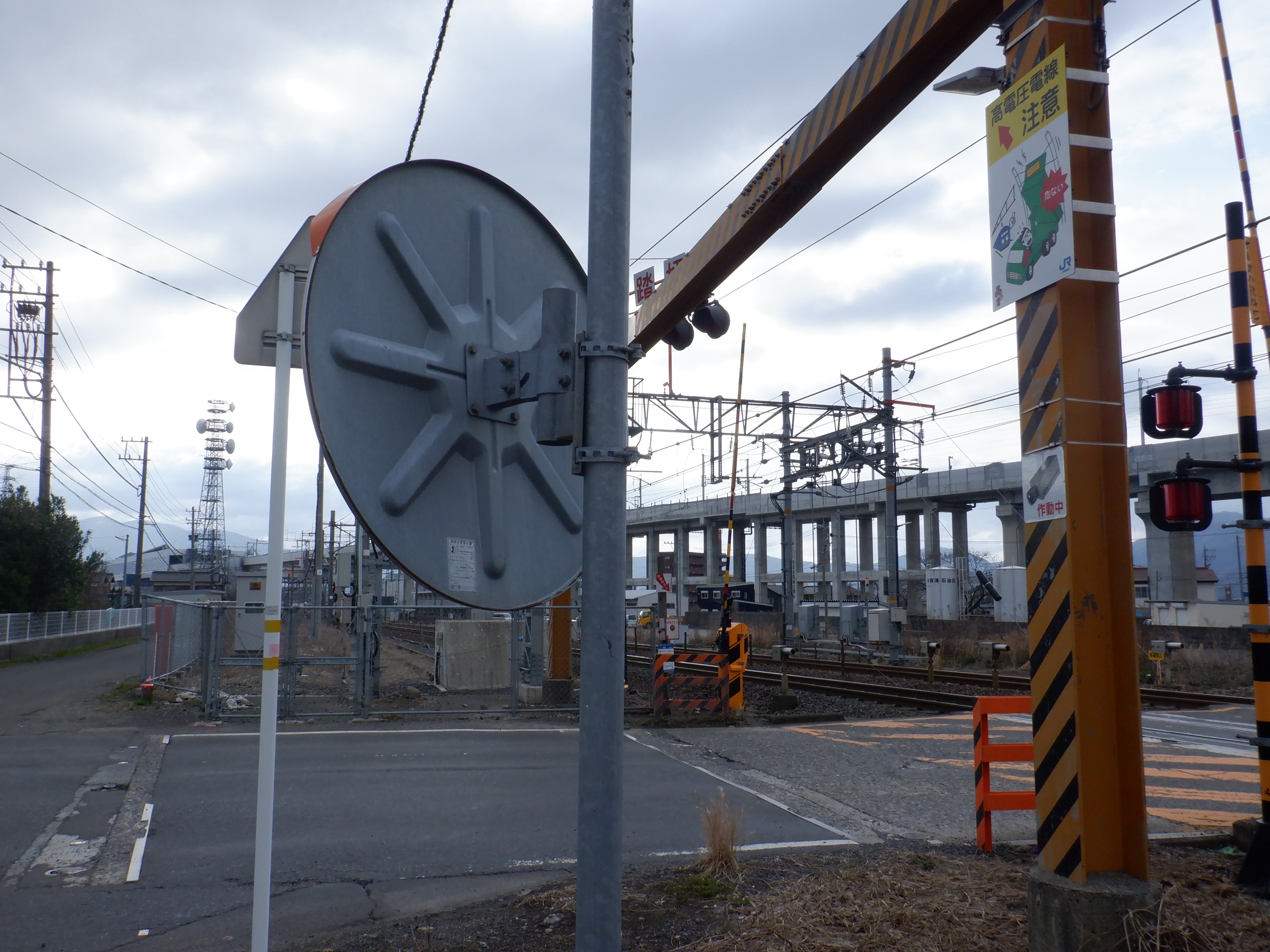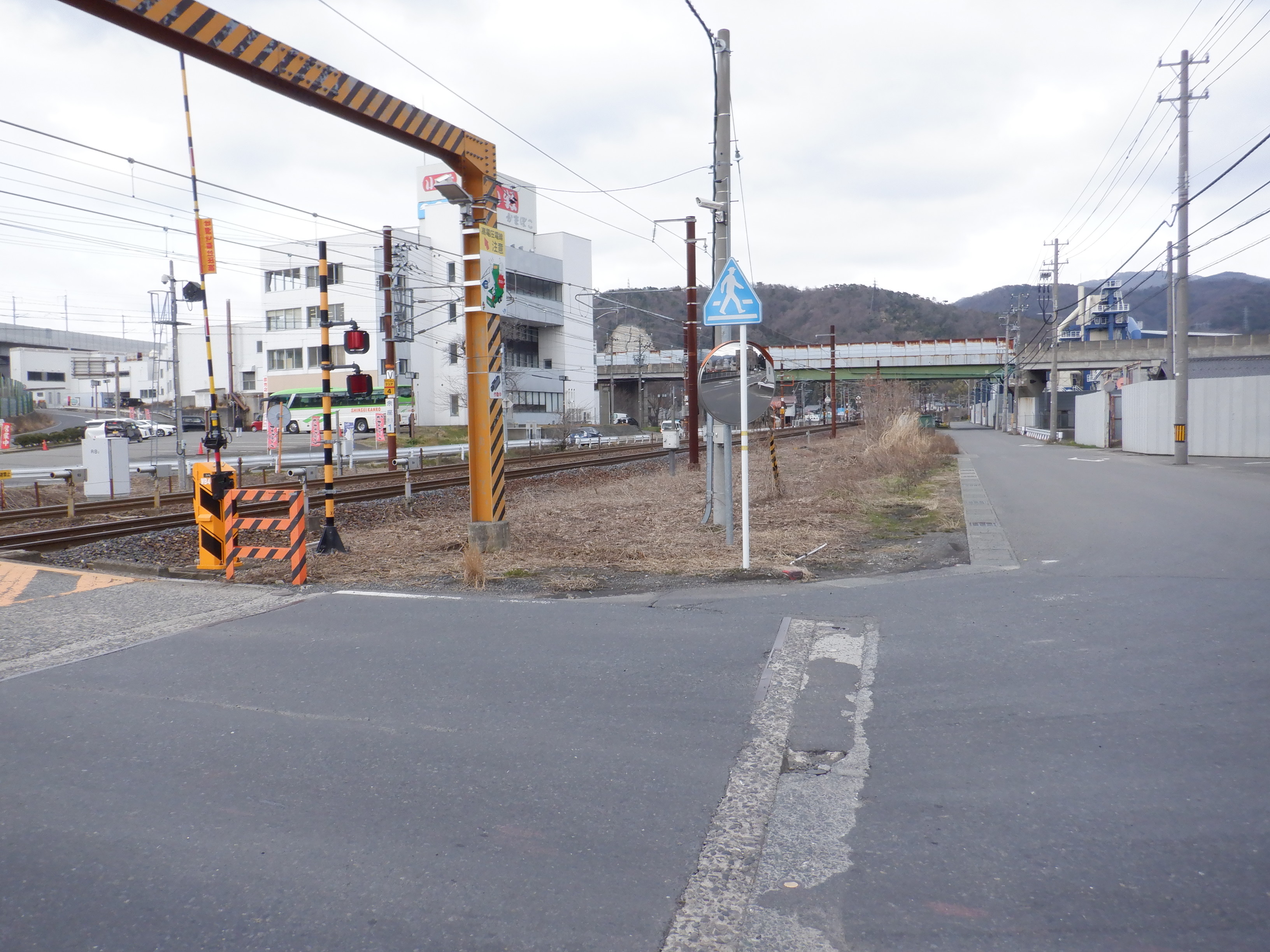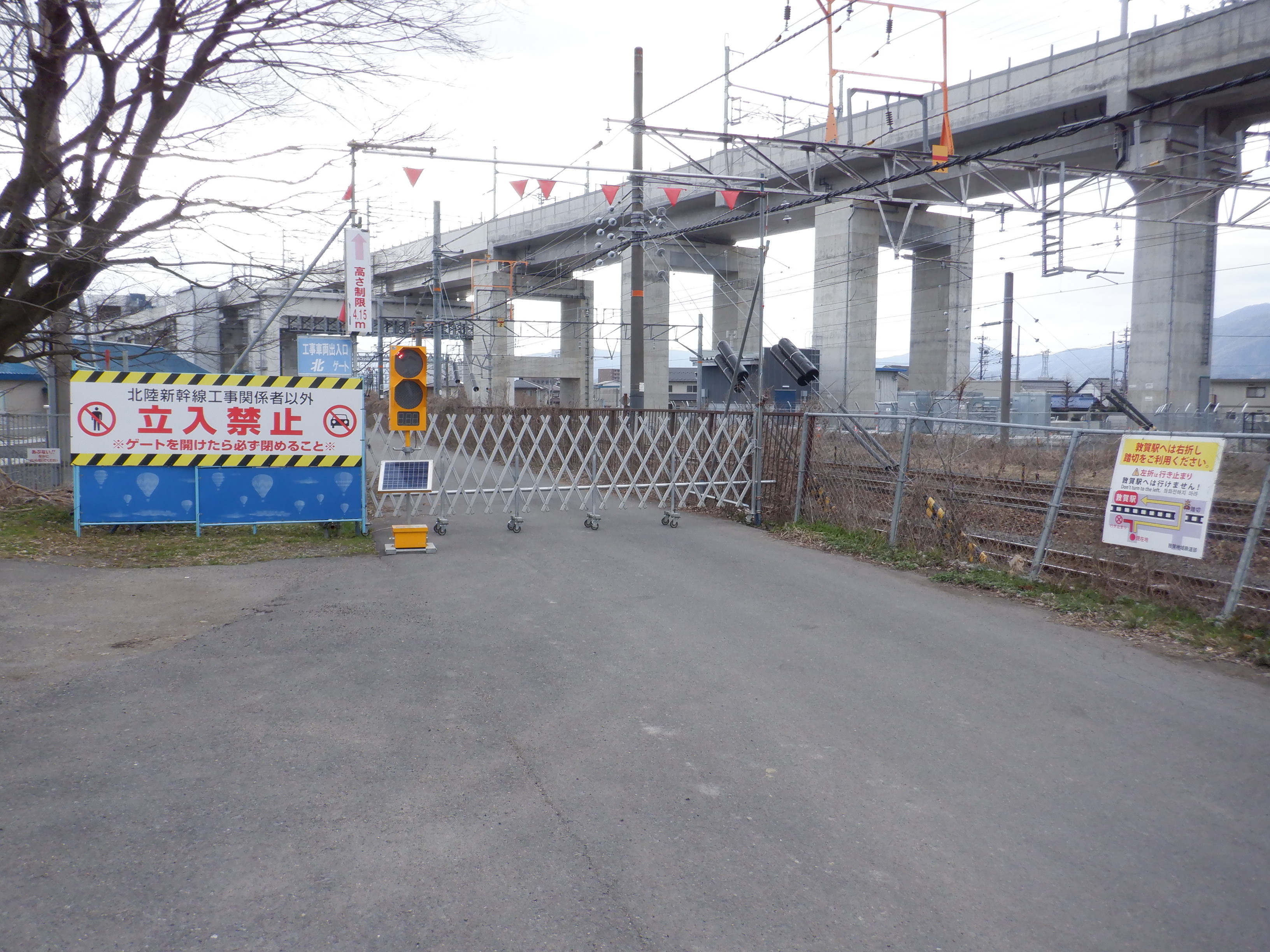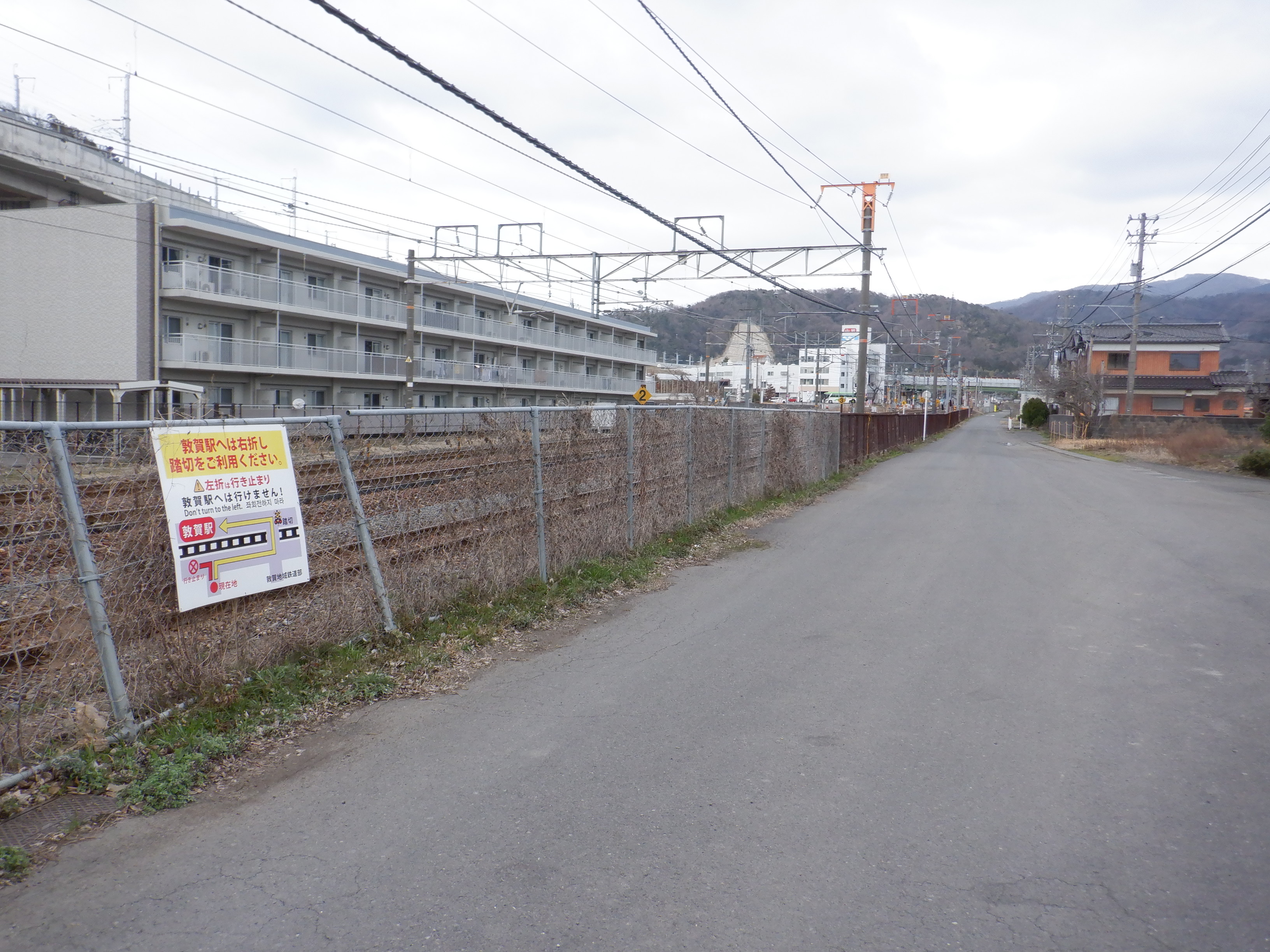 線路沿いのところで、敦賀駅側(元々通り抜け不可)はすぐに通行止めになっていて、いつもどおり踏切に向かいます。