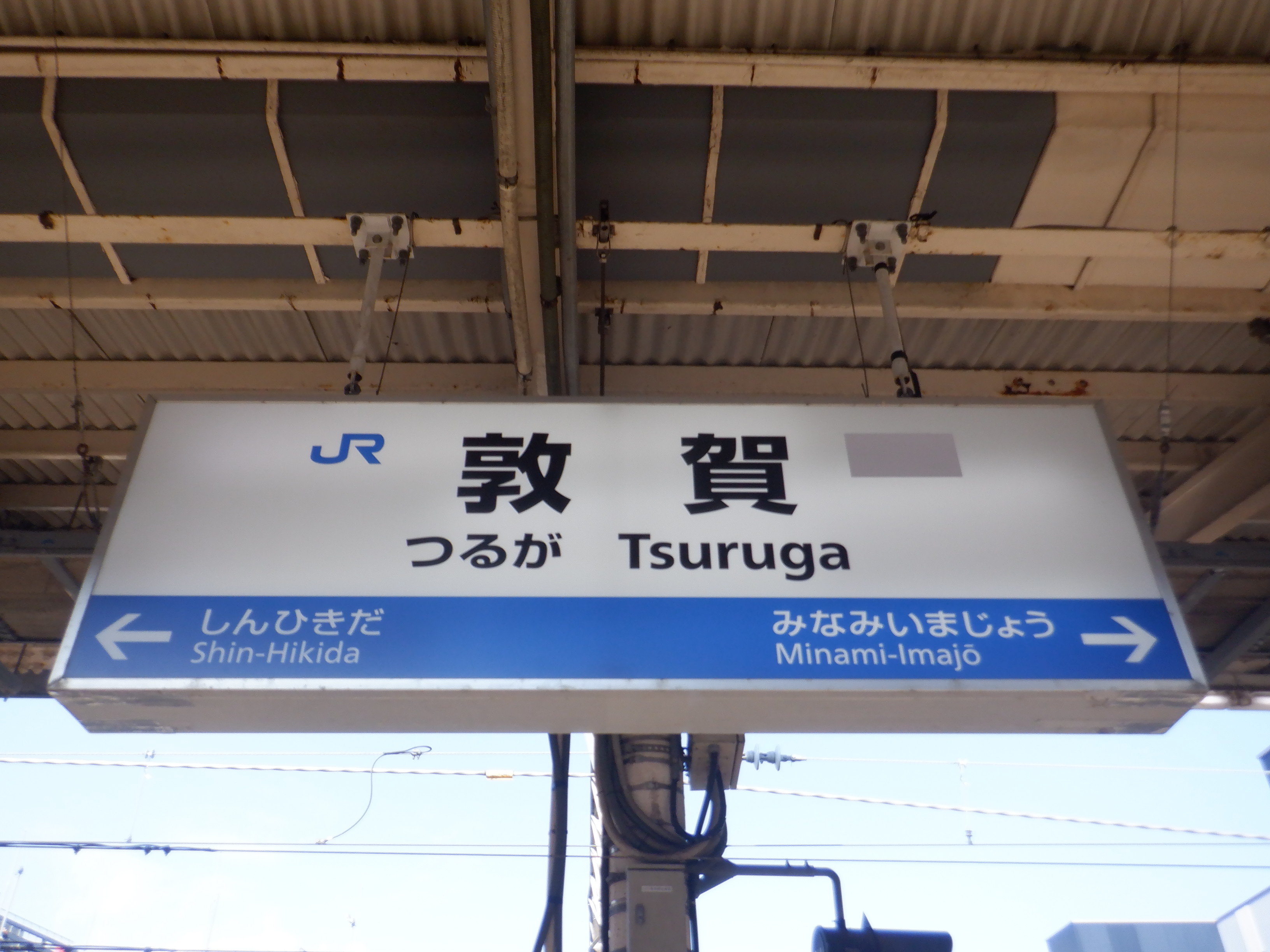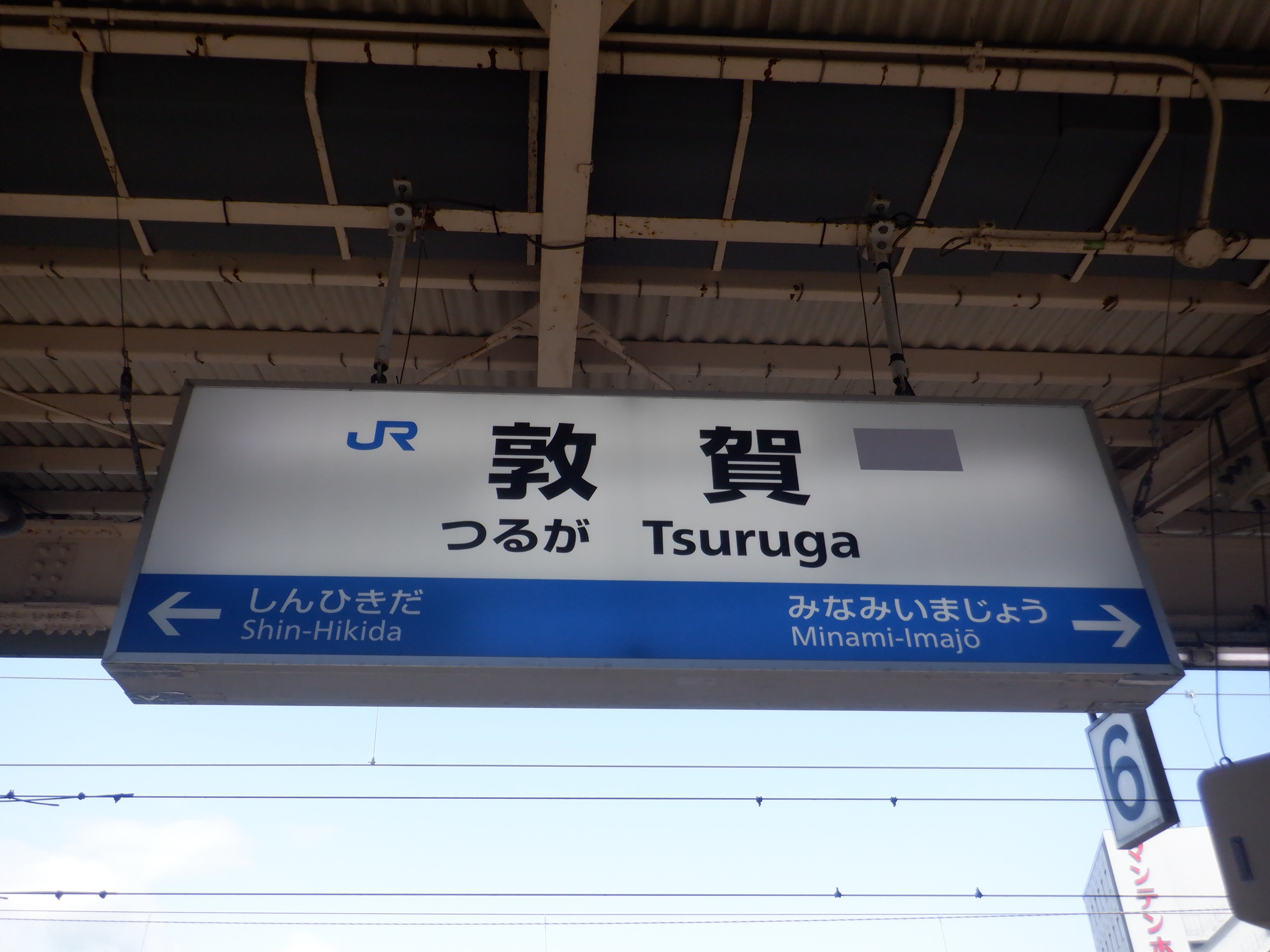 6・7番の駅名標の一つ。JRロゴが新疋田側に配置され、ハピラインのロゴがシールで隠されています。