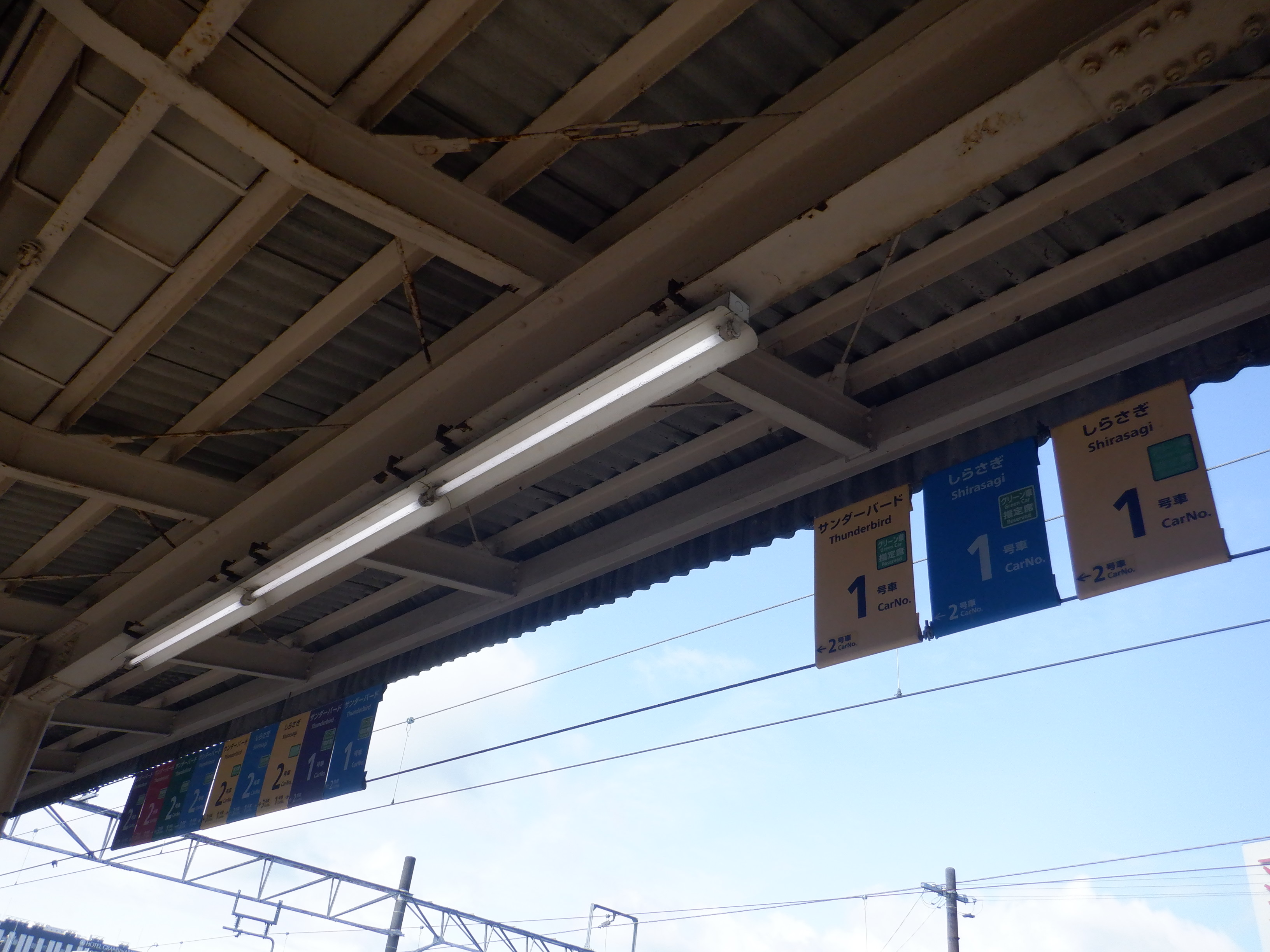 4番のりばから見た1・2番のりばの上屋と駅名標。