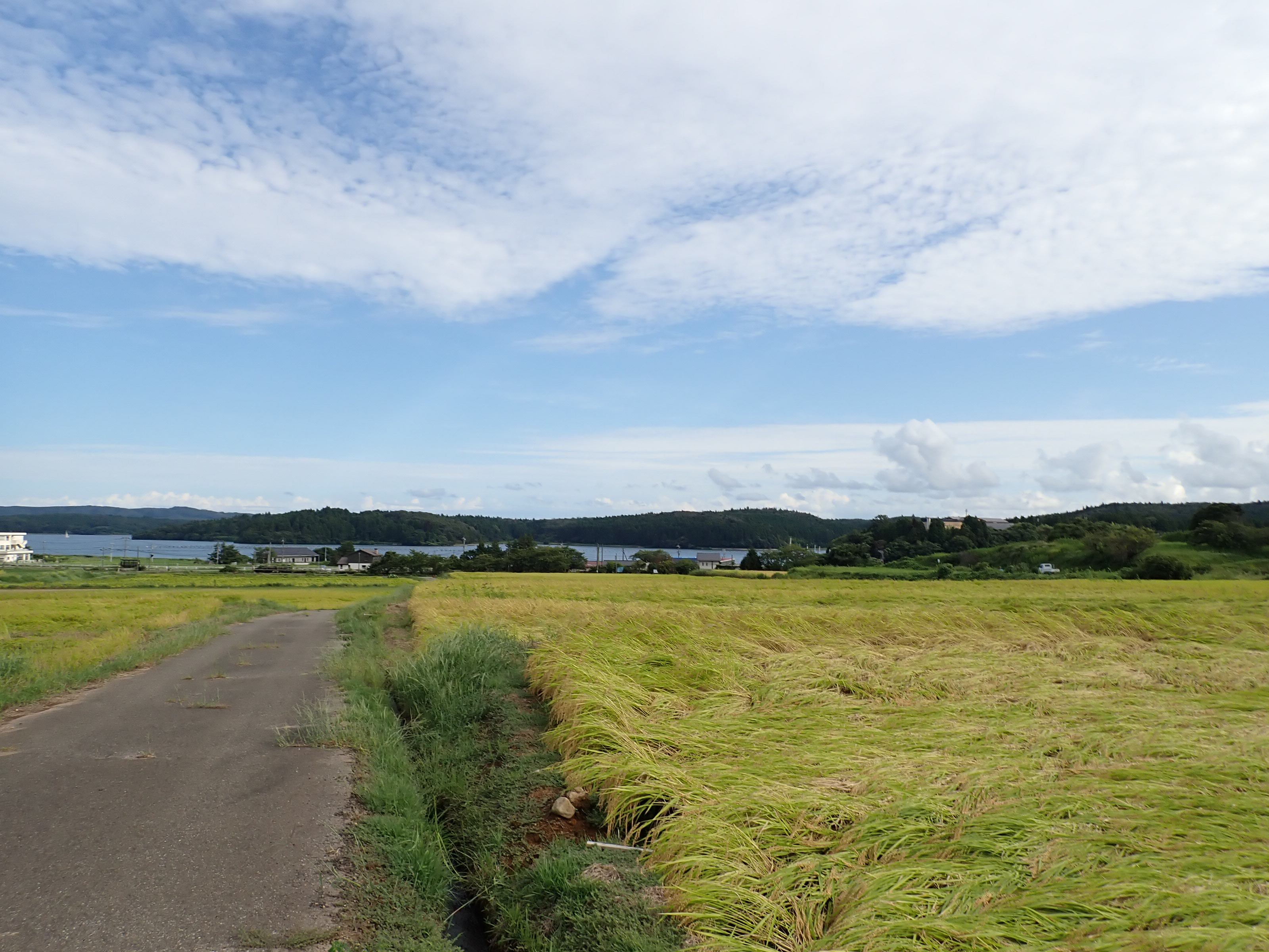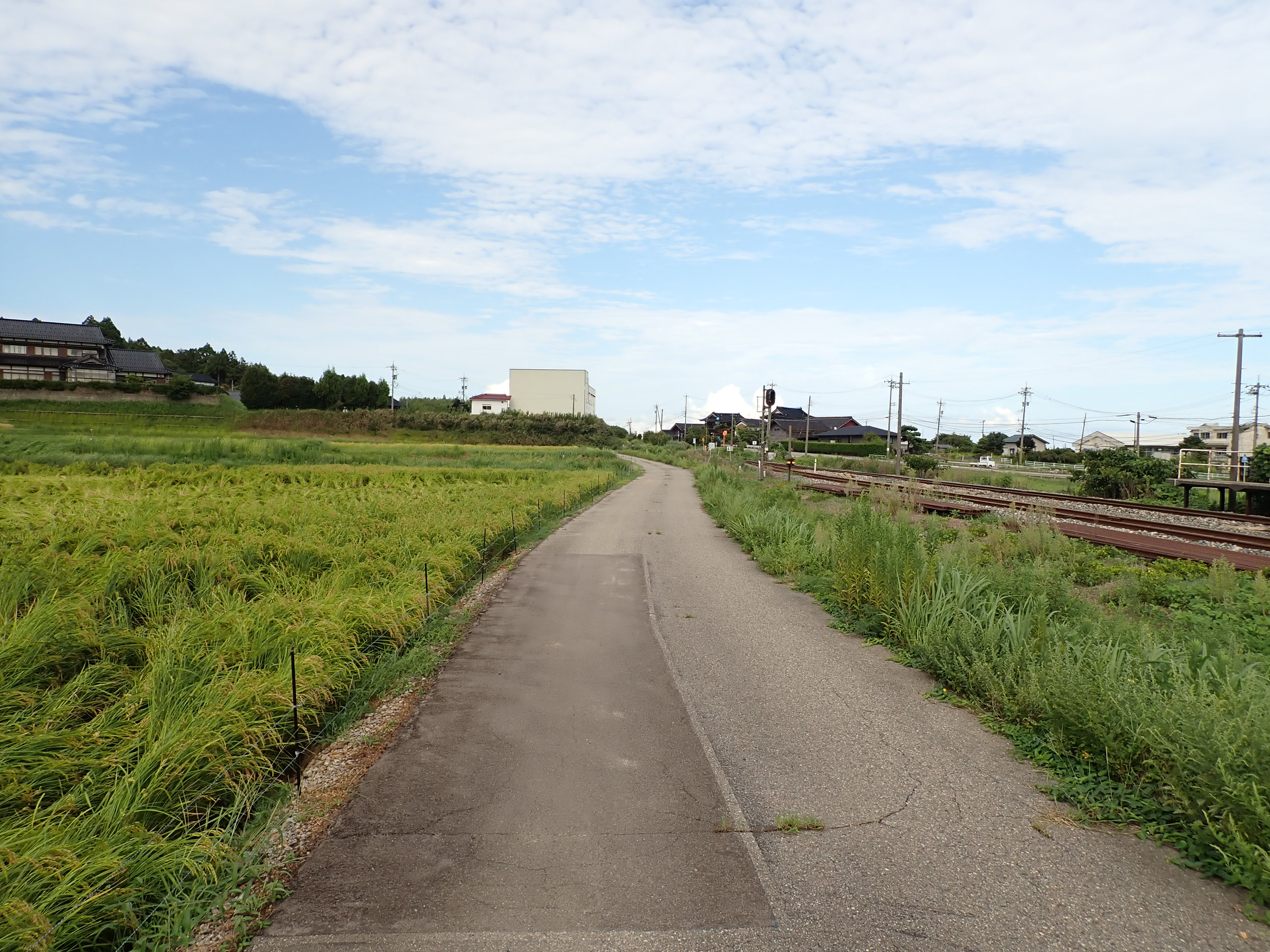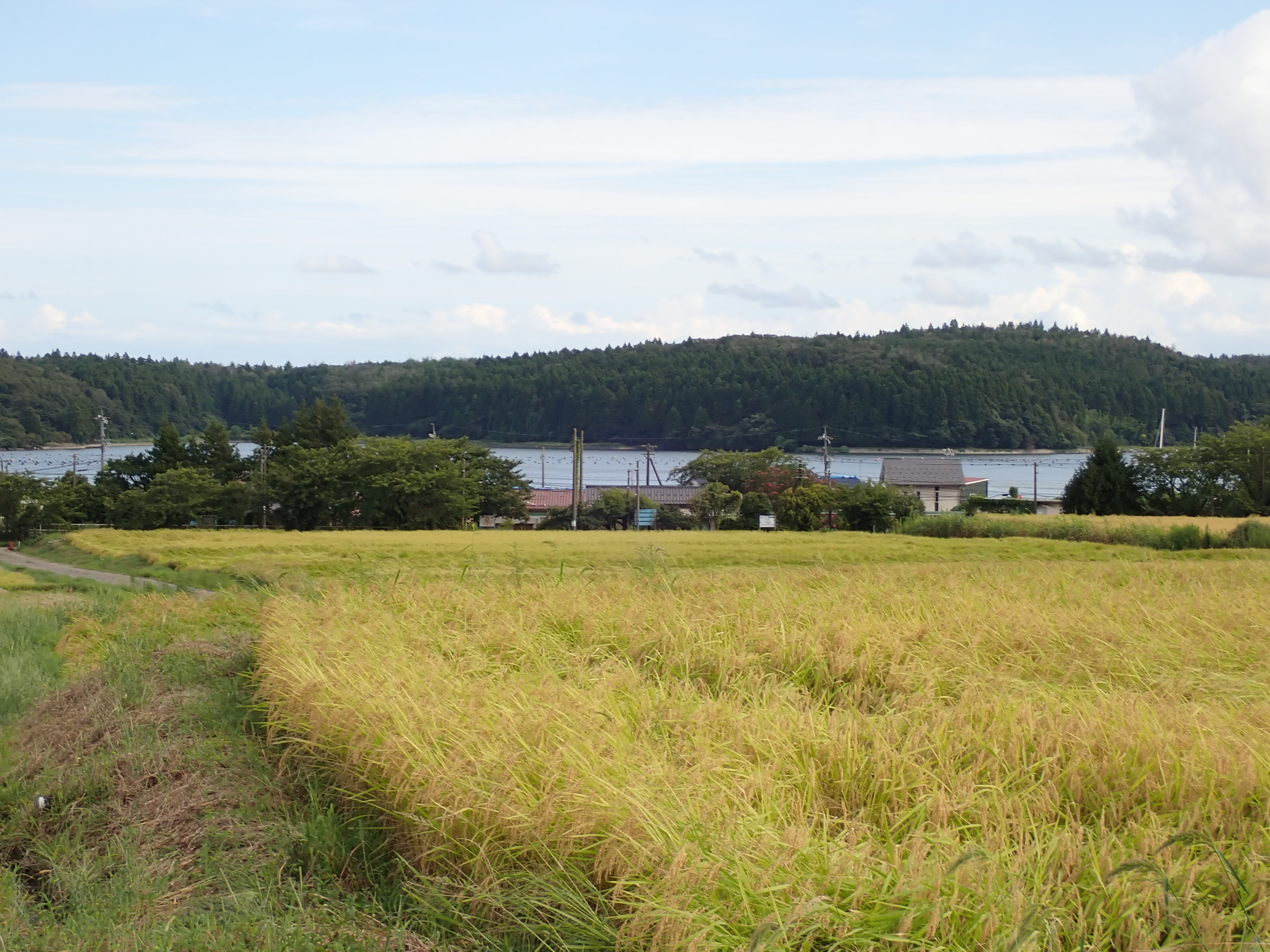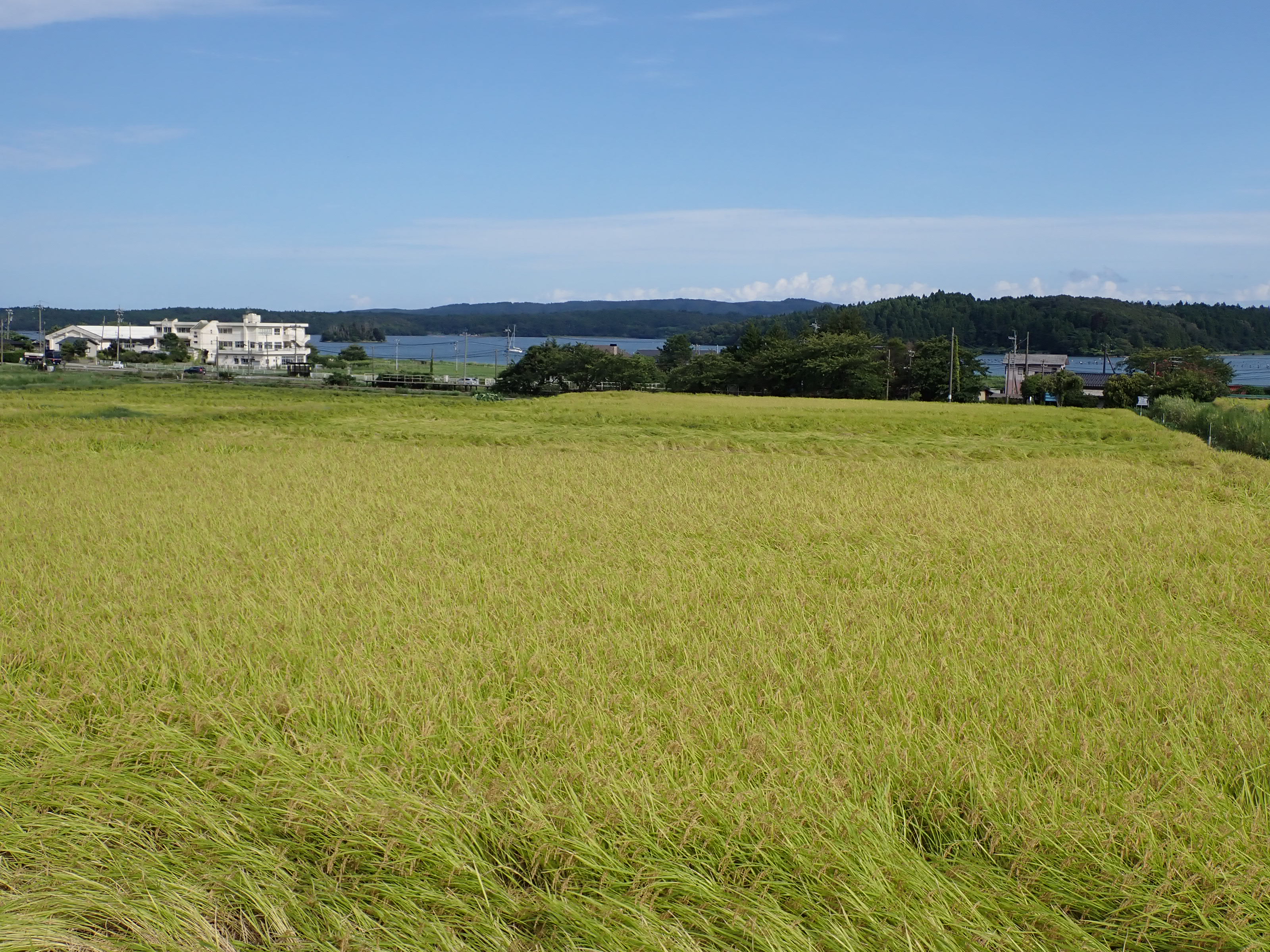 駅の反対側から、稲刈り間近の水田と西岸駅。その向こうに海が見えます。