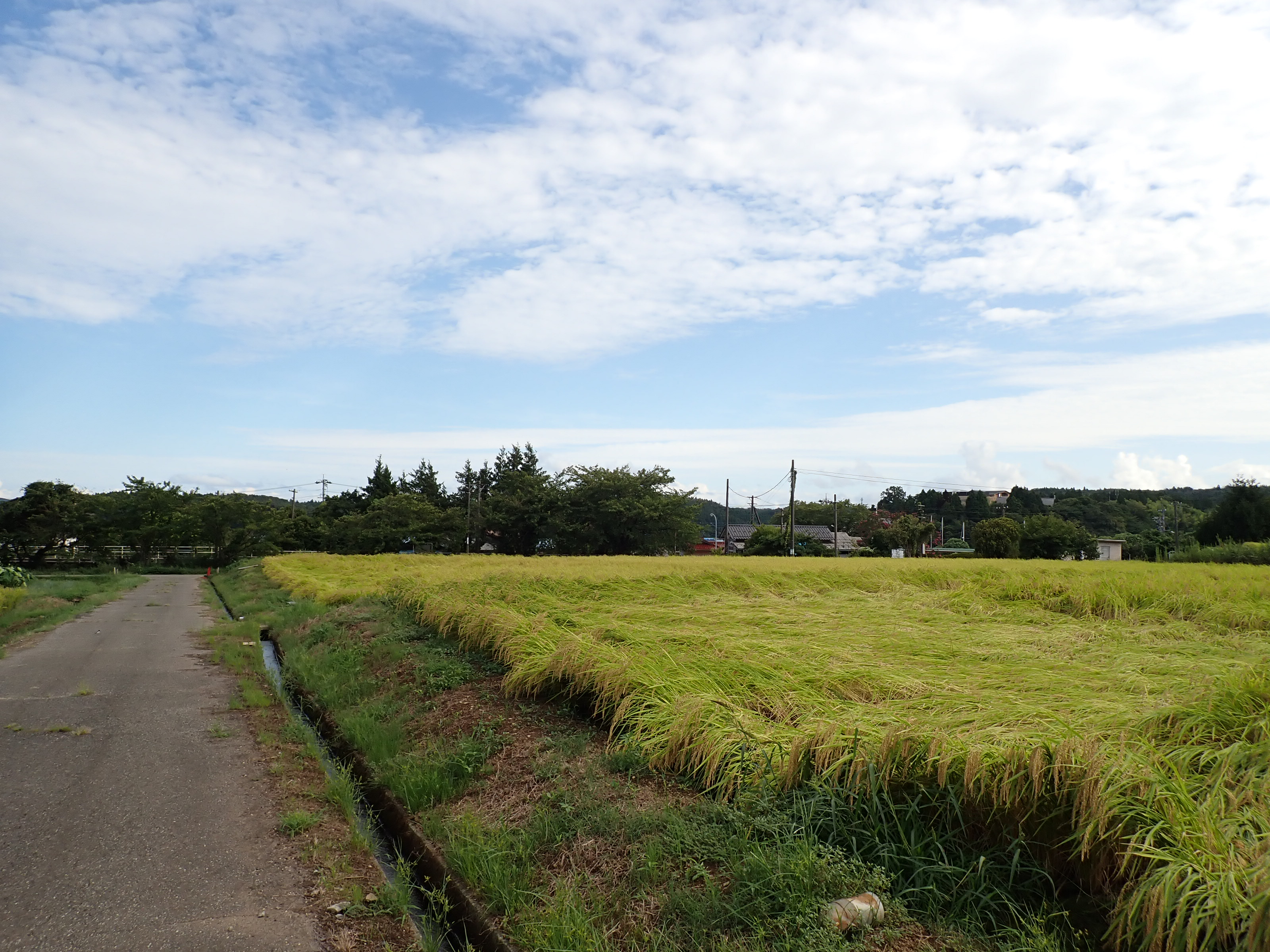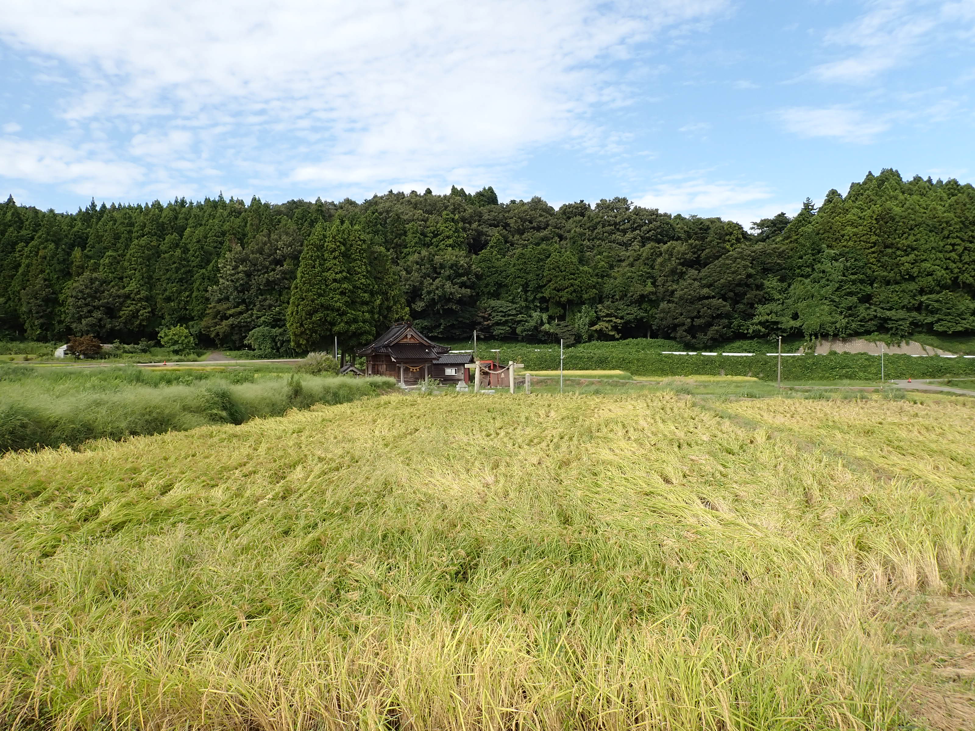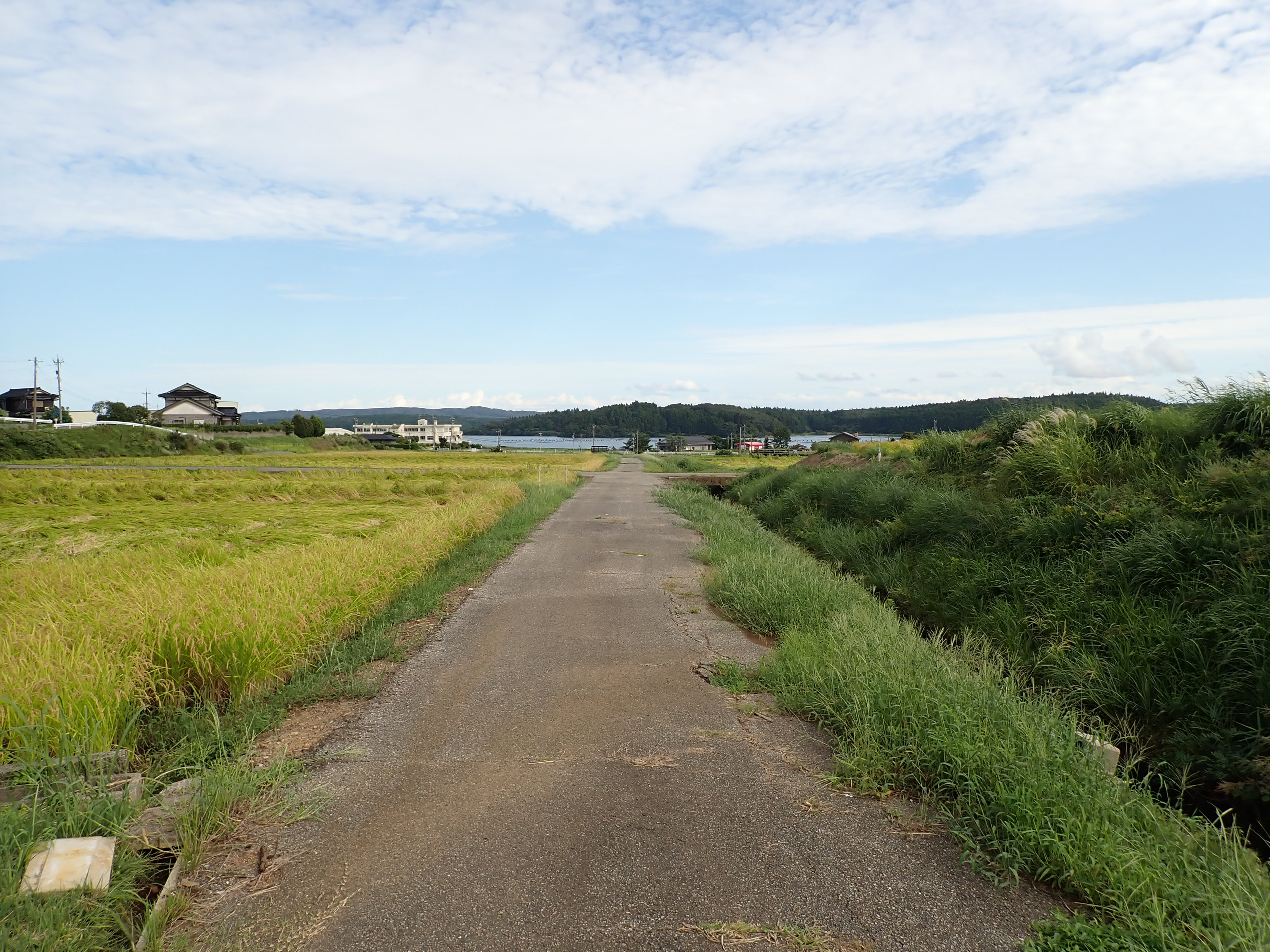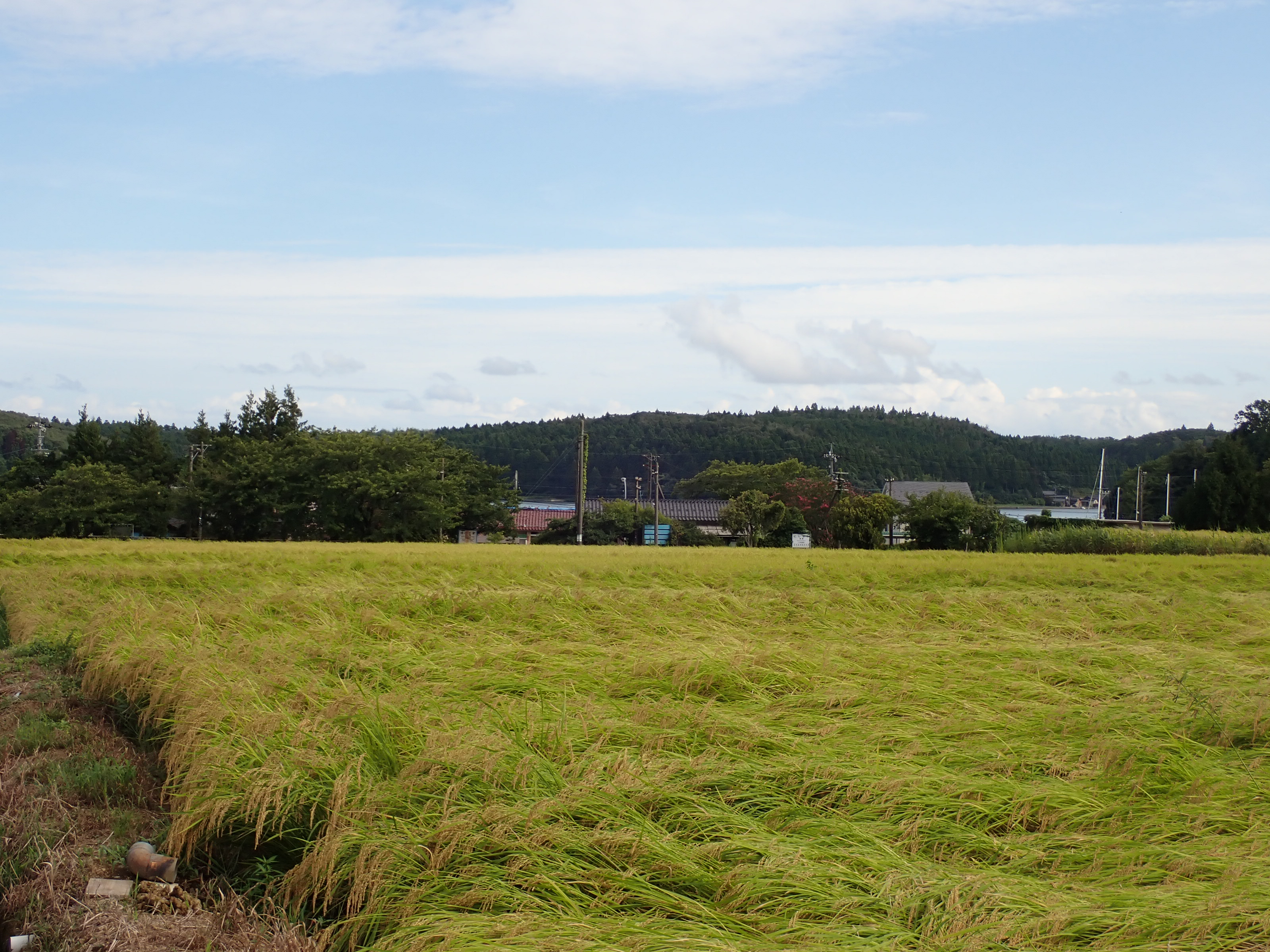 駅の反対側から、稲刈り間近の水田と西岸駅。その向こうに海が見えます。