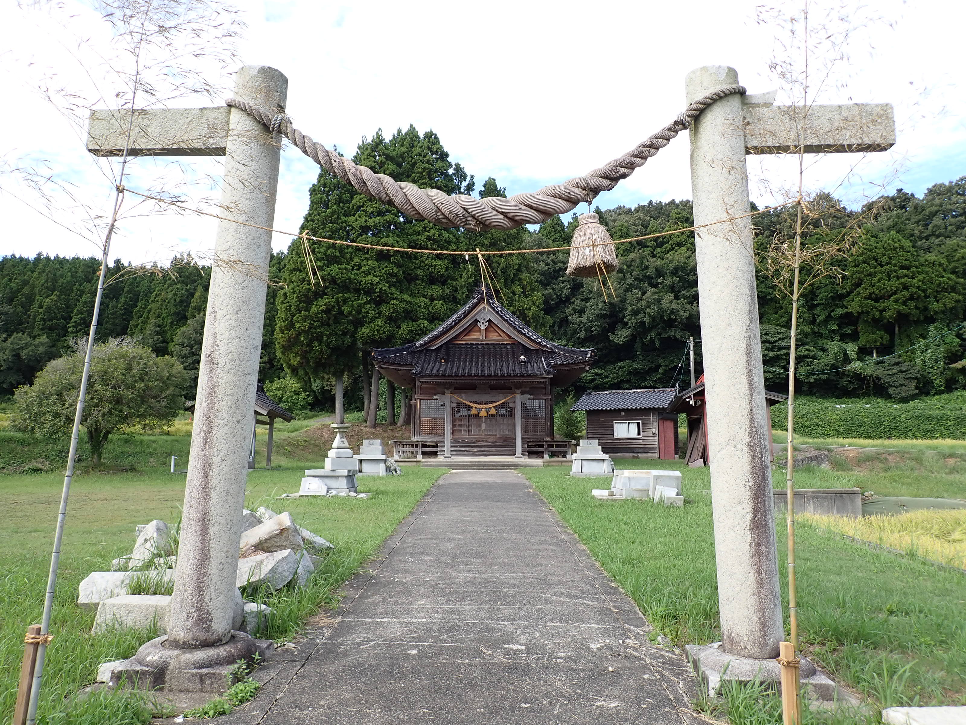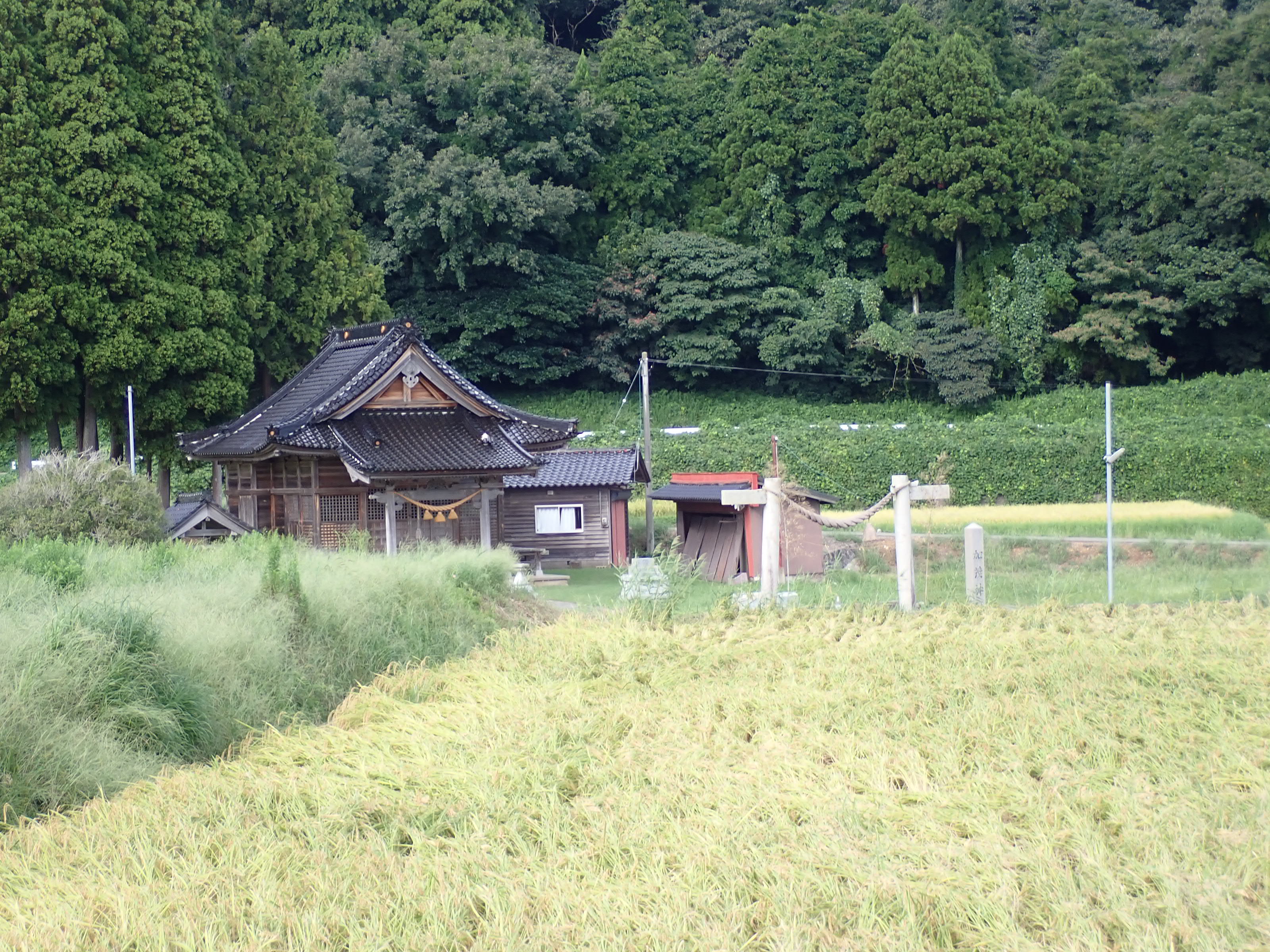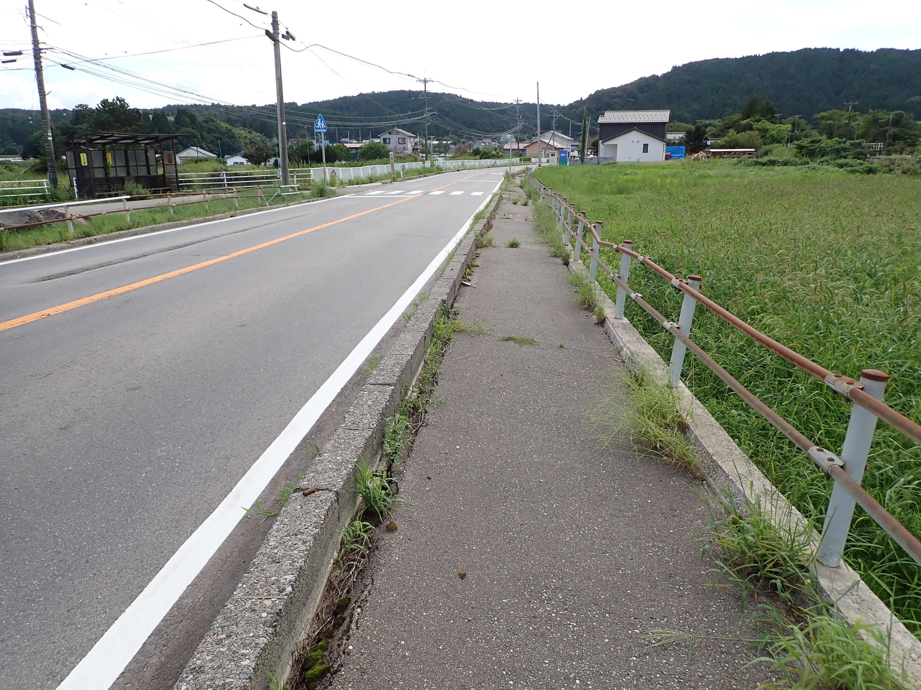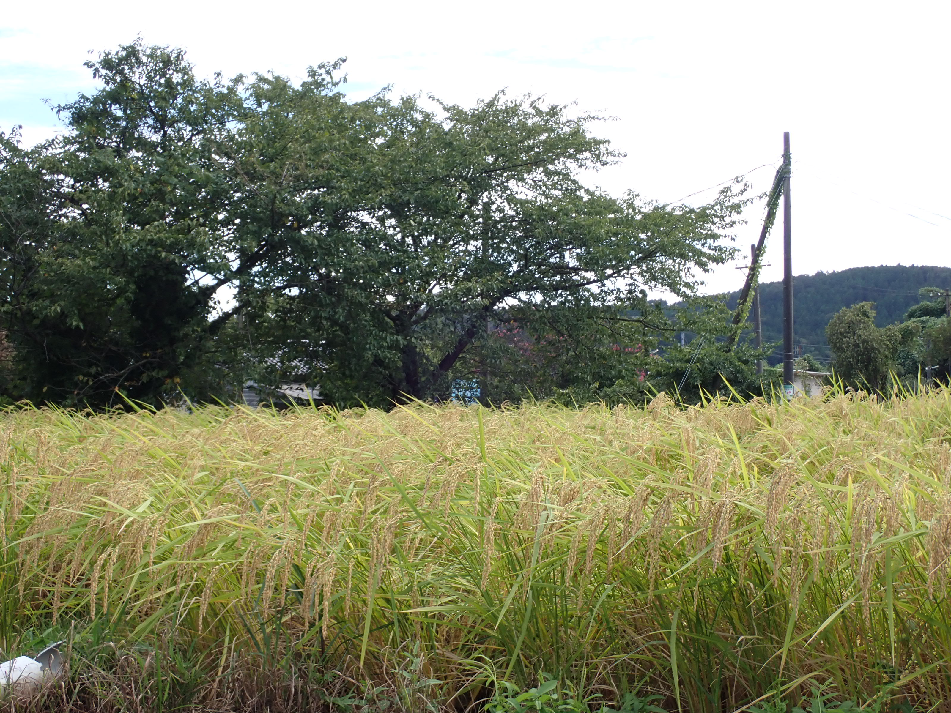 駅の反対側から、稲刈り間近の水田と西岸駅。その向こうに海が見えます。
