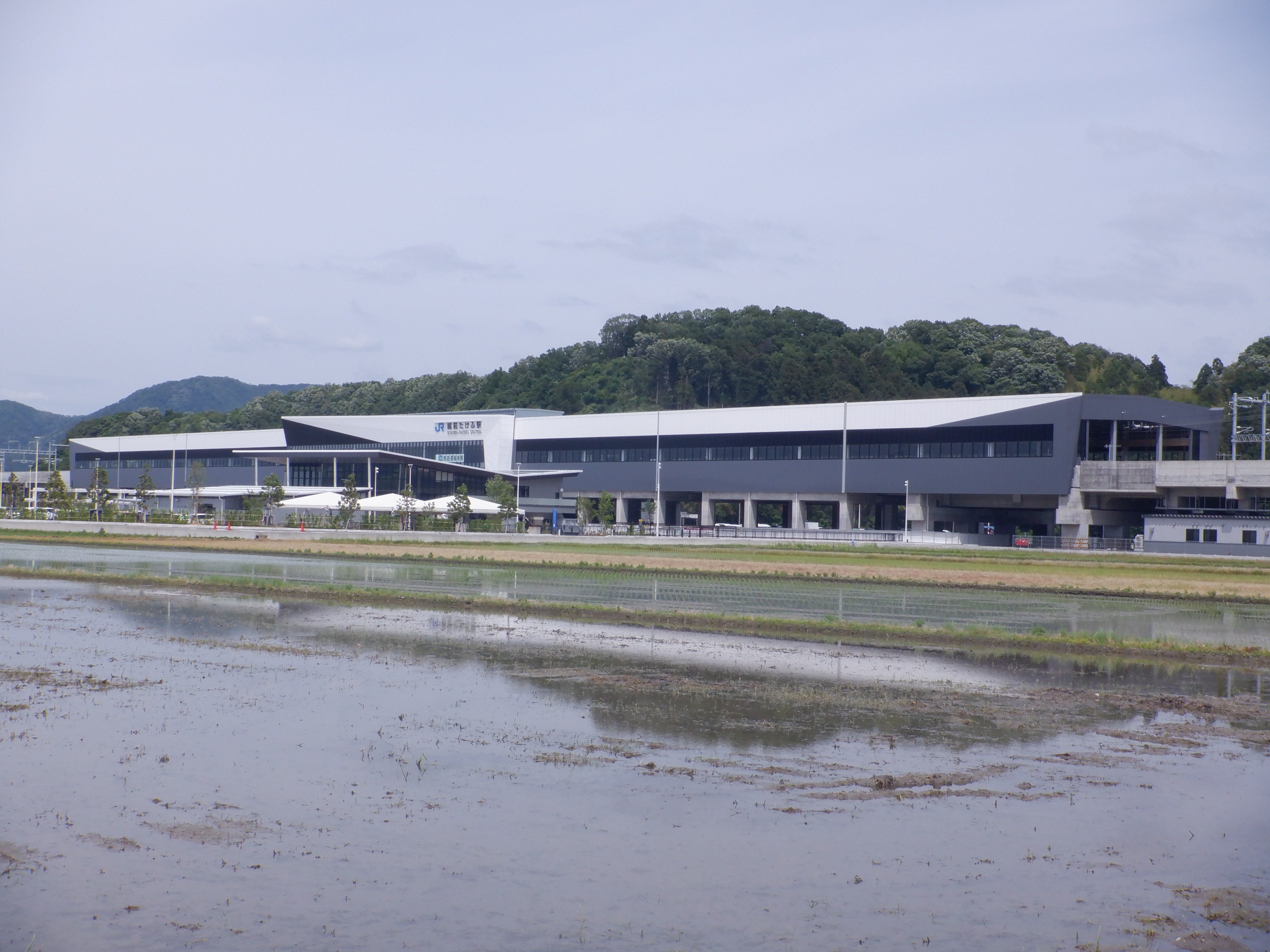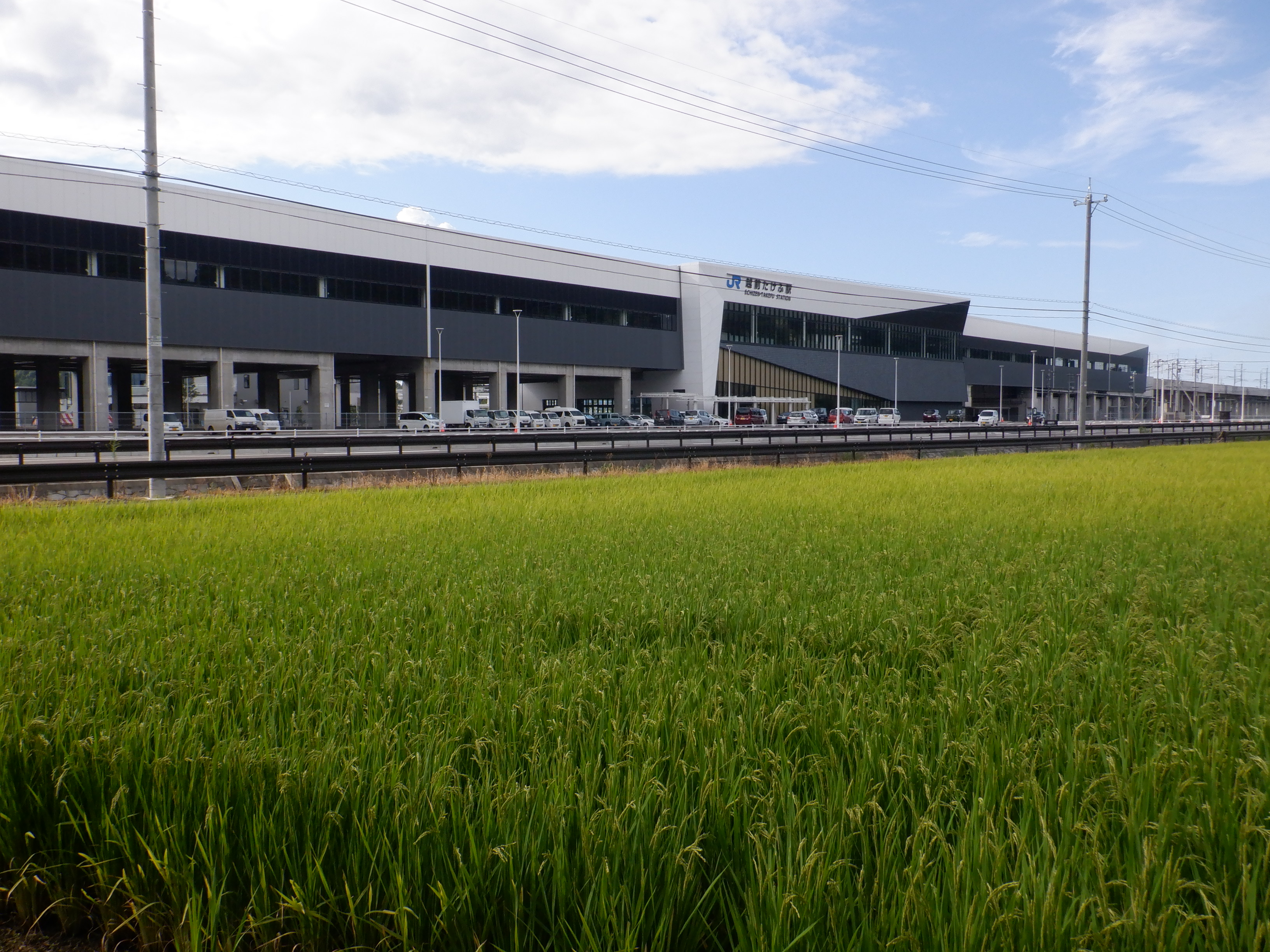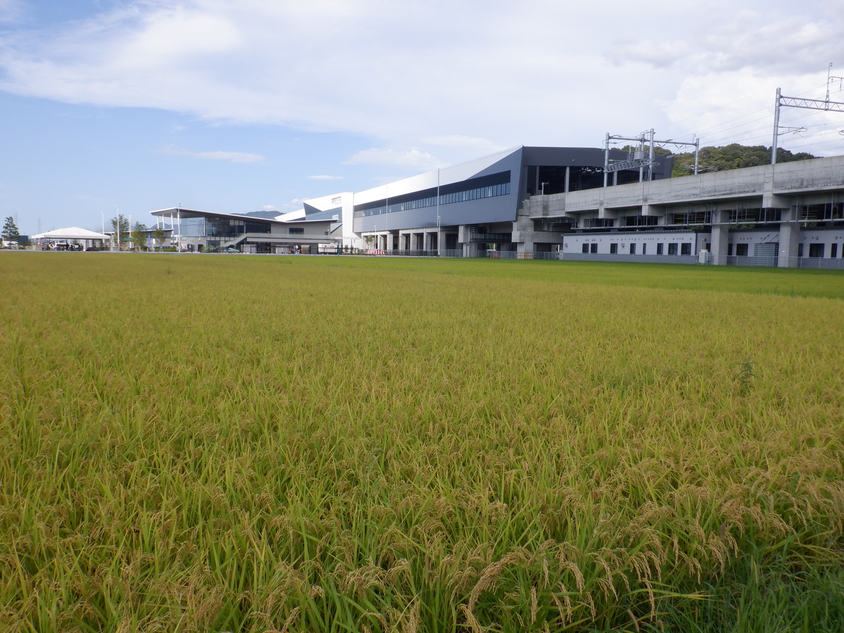 国道8号付近から見た越前たけふ駅と稲が実った水田。