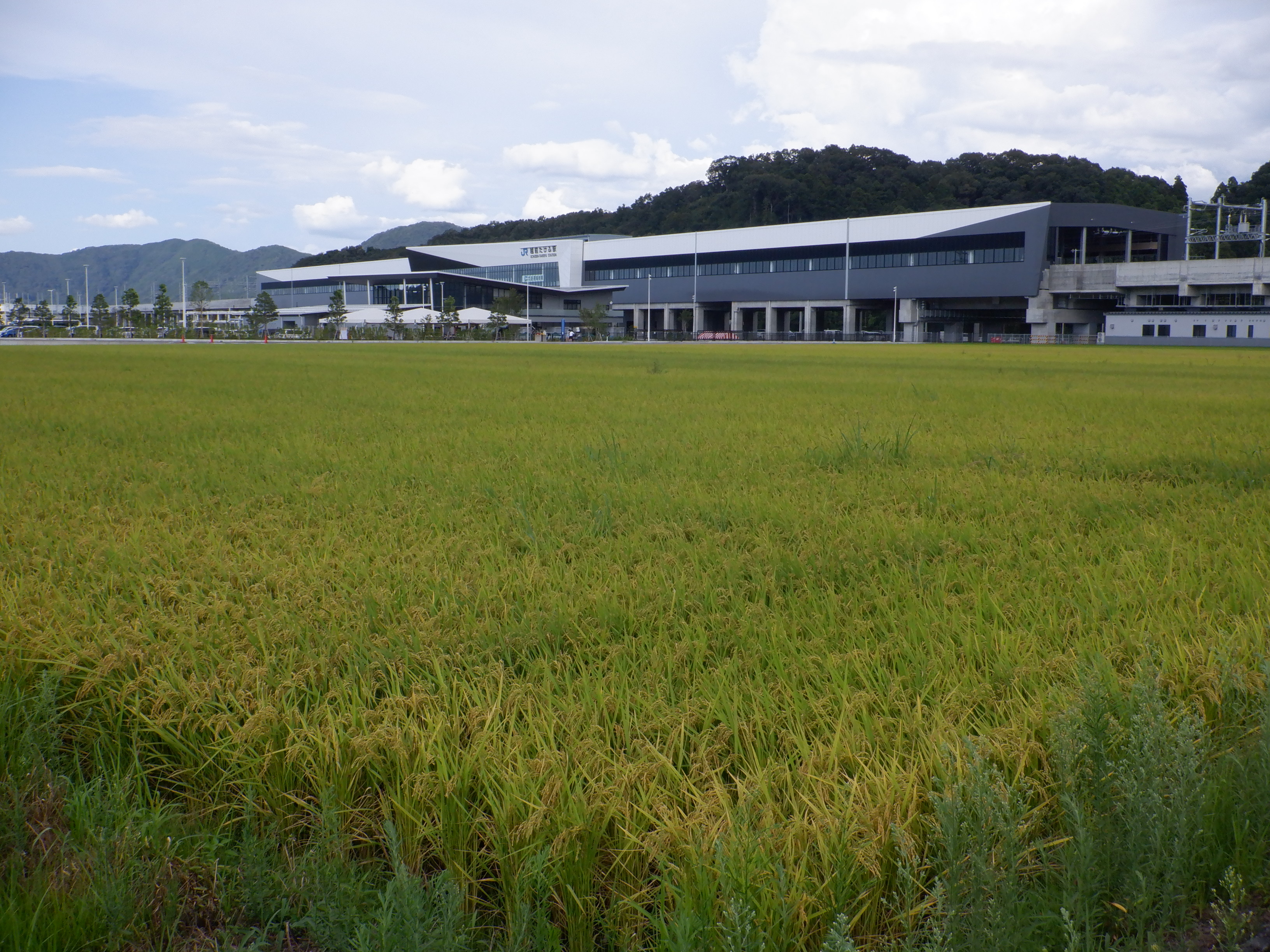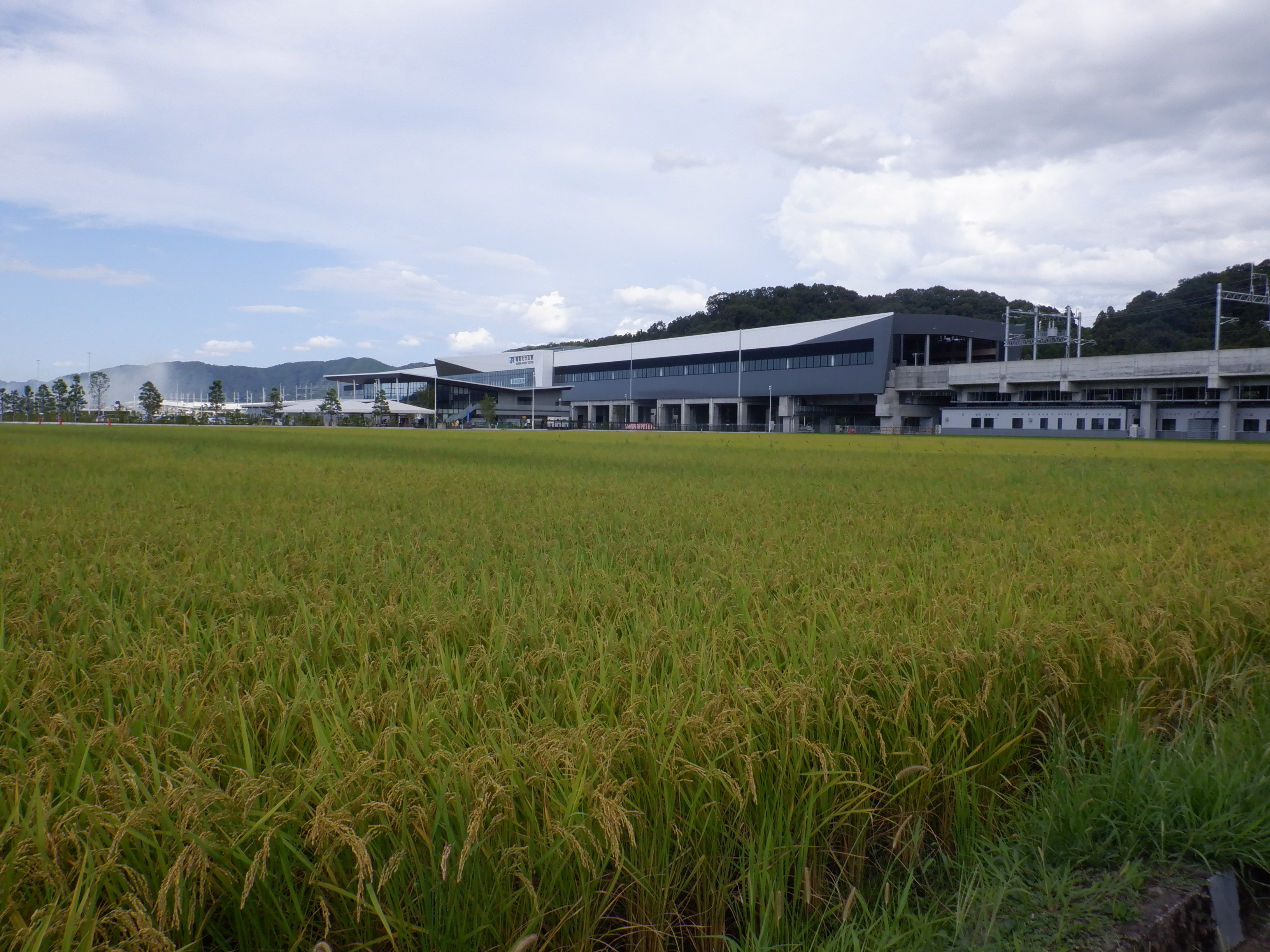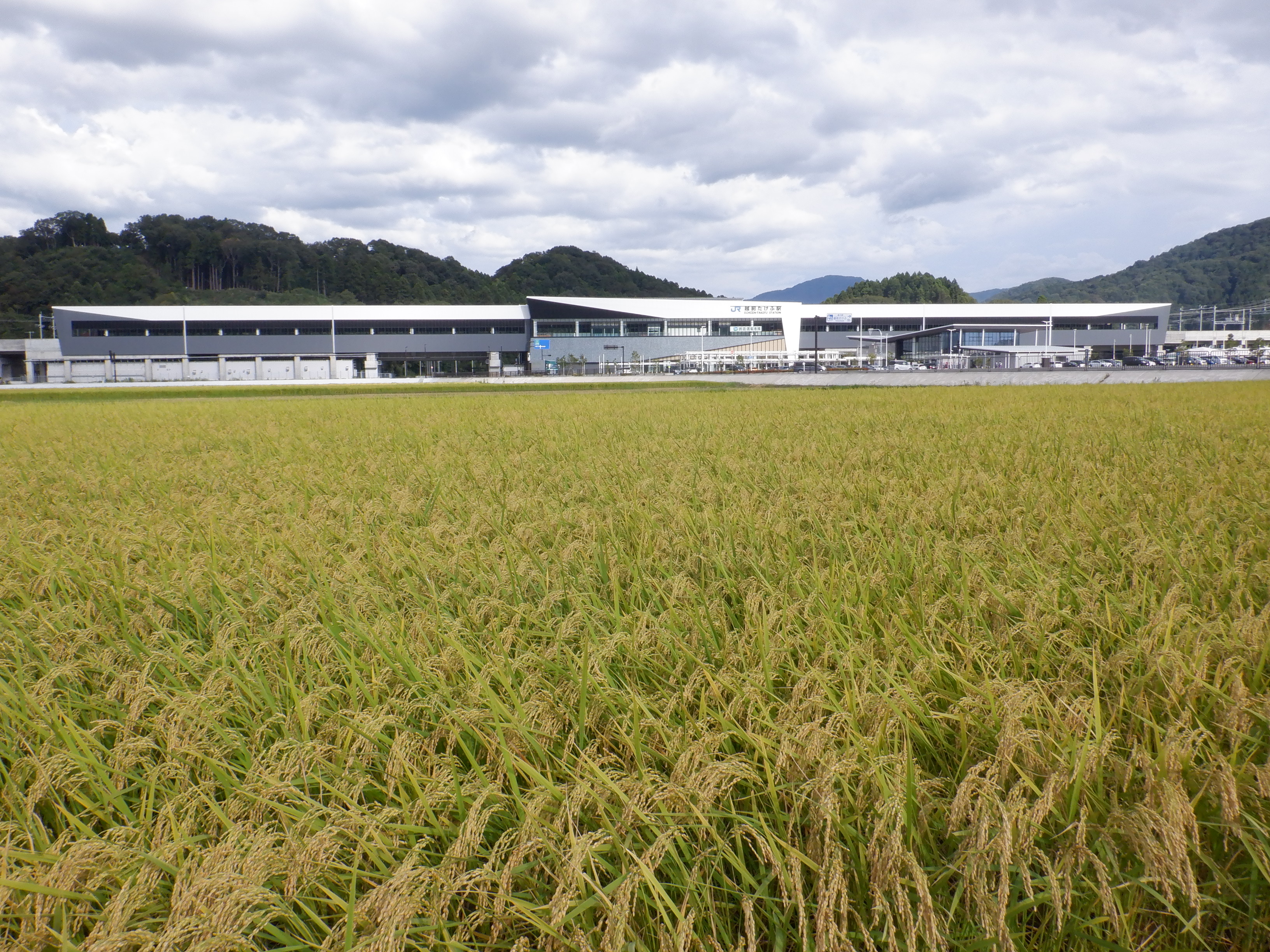 国道8号から見た越前たけふ駅。こちら側からが一面実った水田というのはこれで最後になりました。