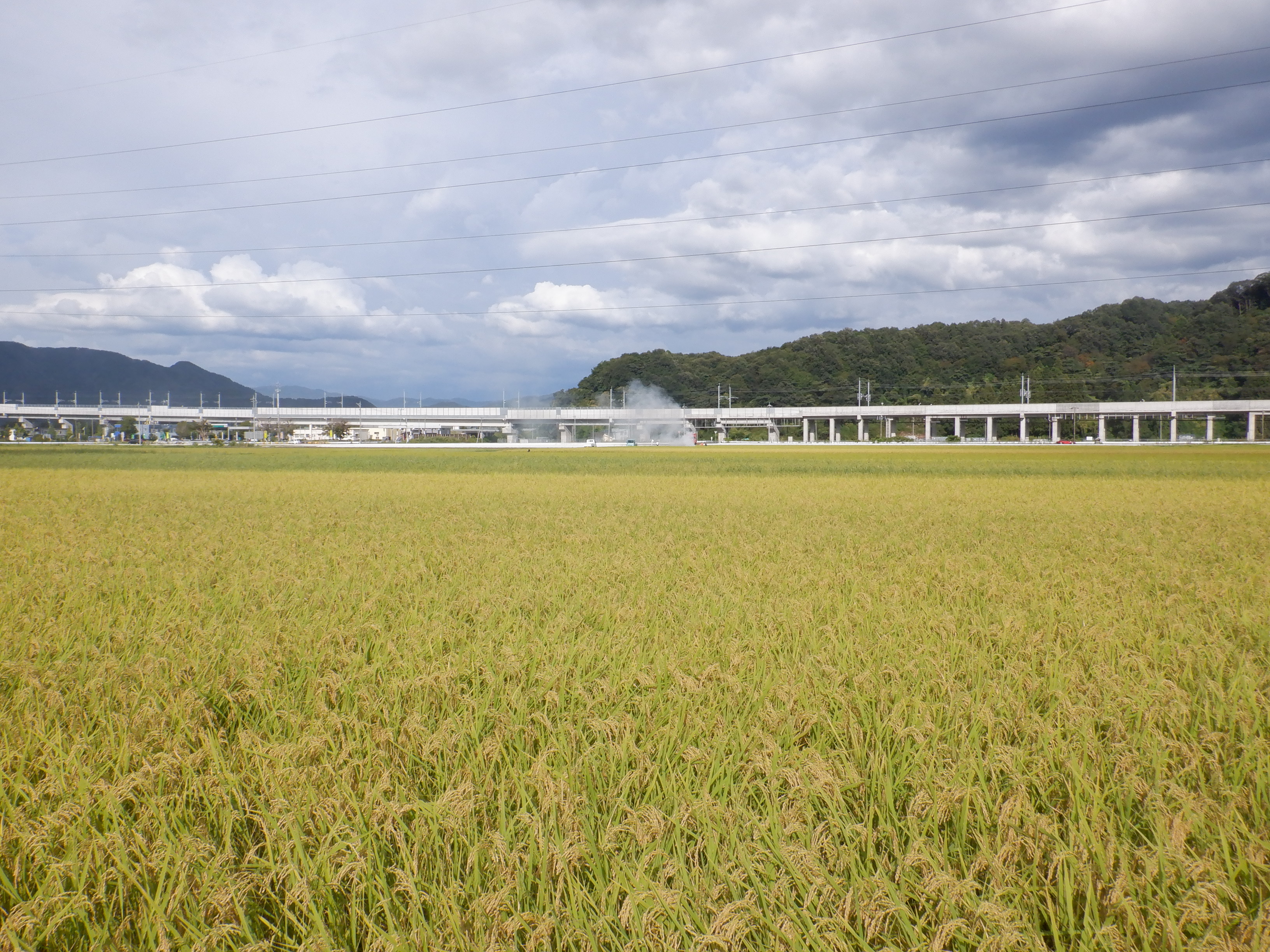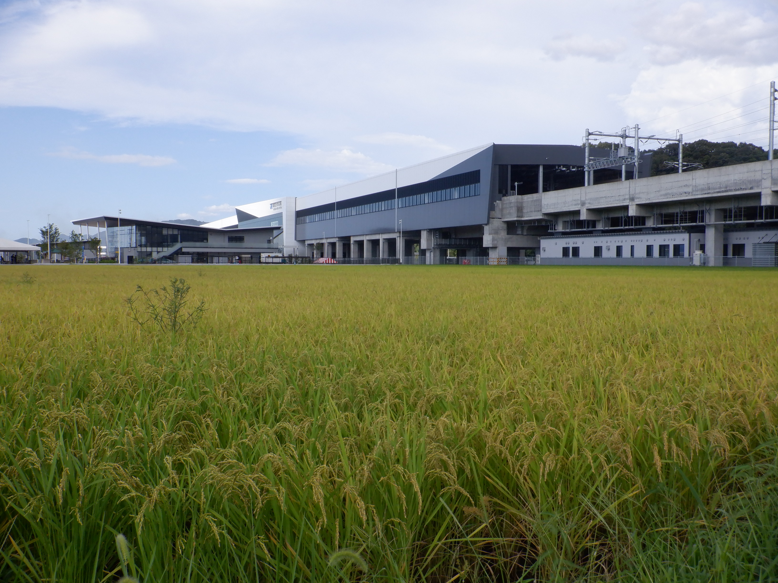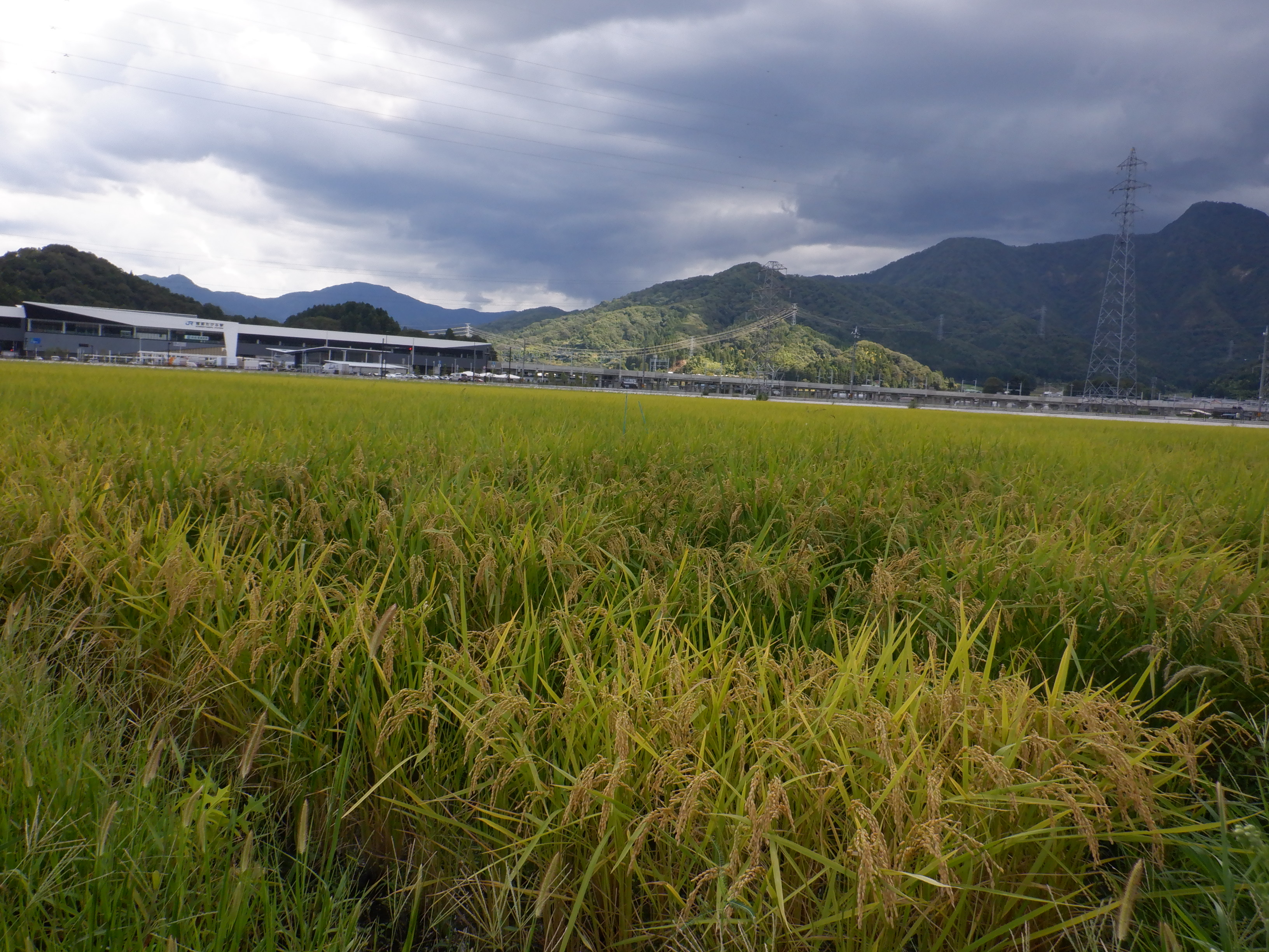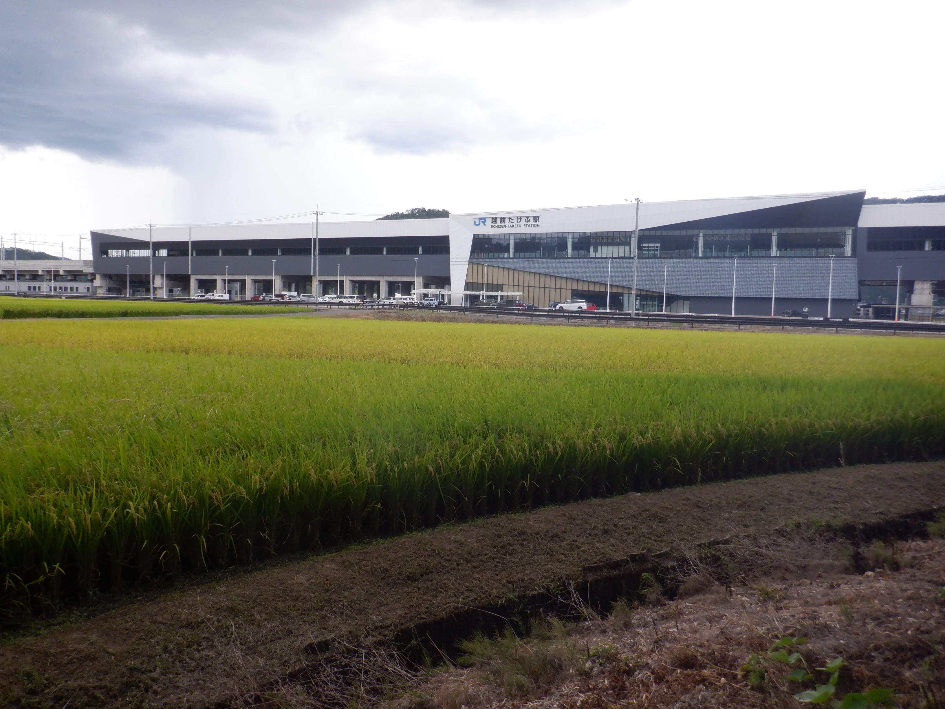 国道8号から見た越前たけふ駅。こちら側からが一面実った水田というのはこれで最後になりました。