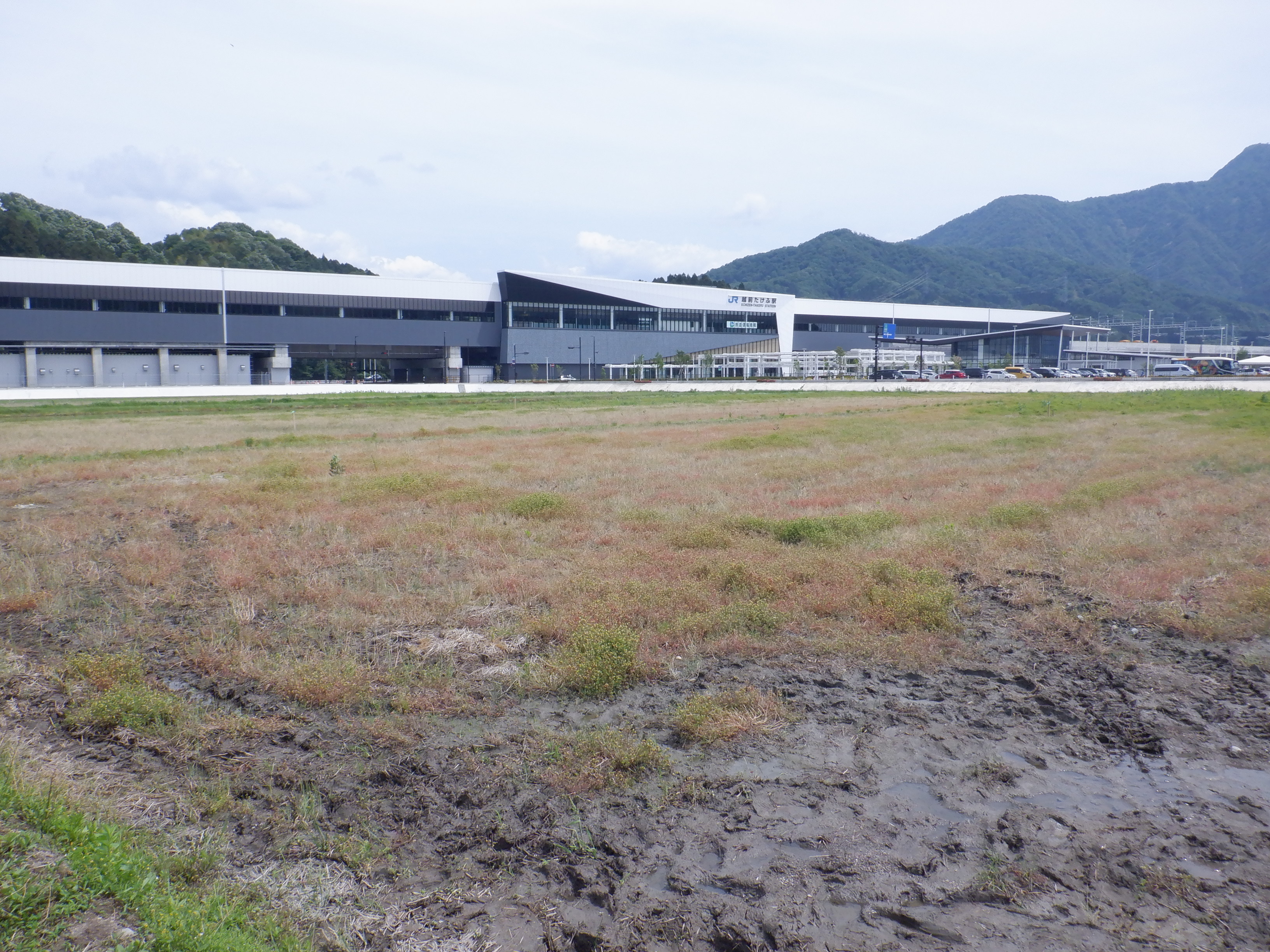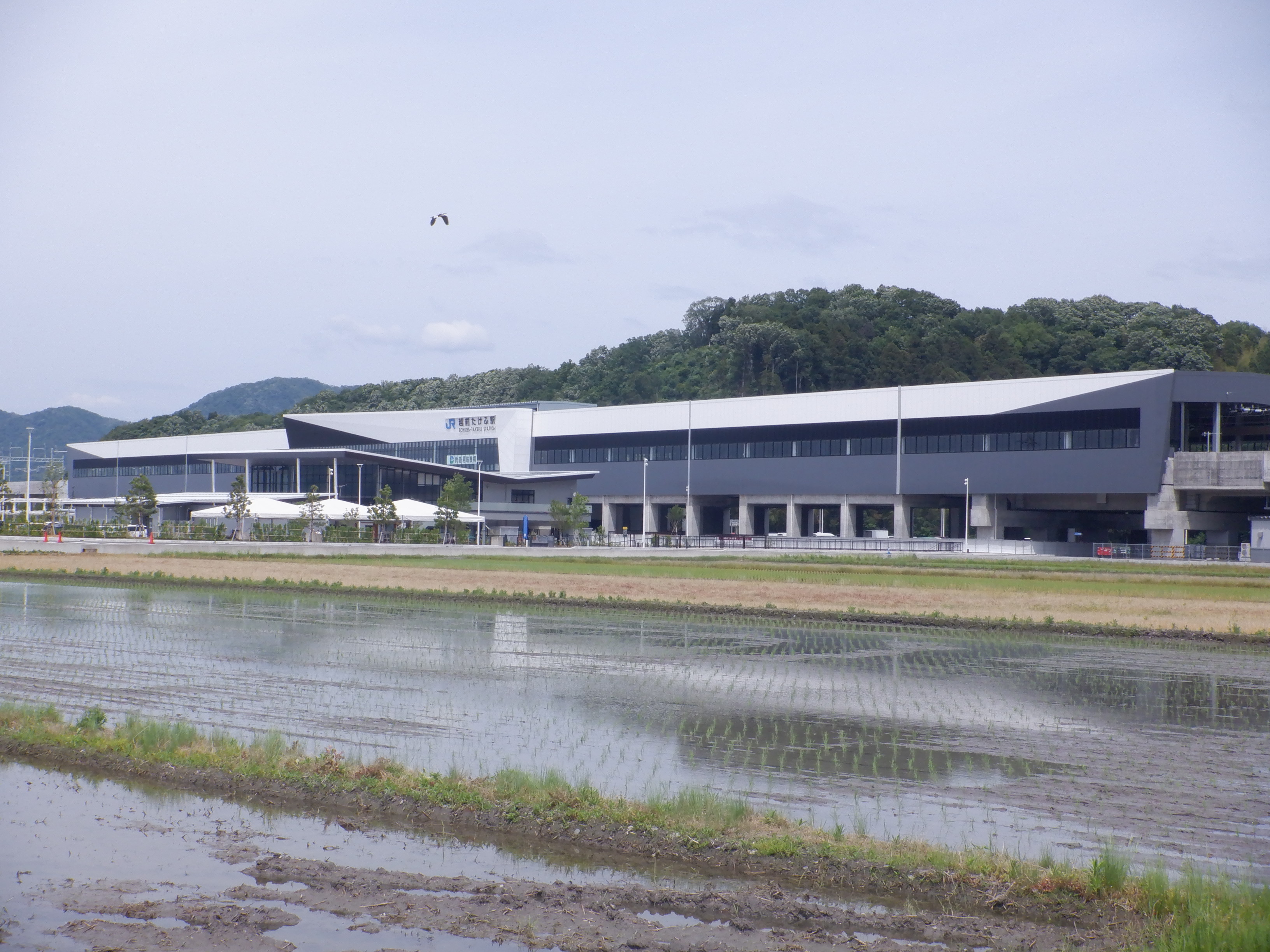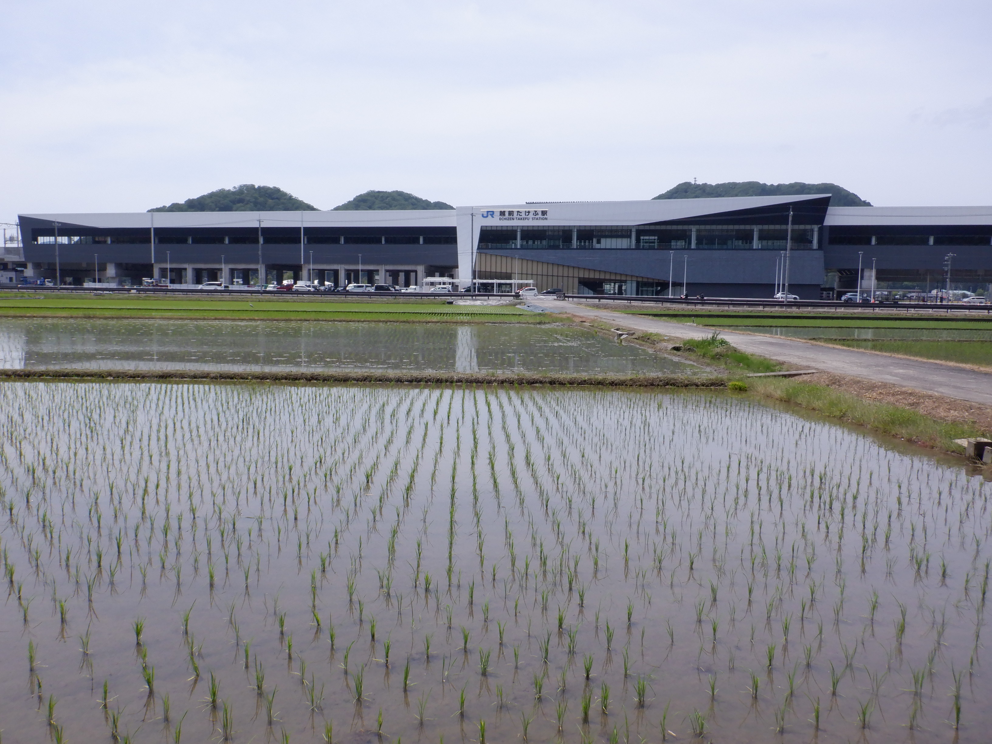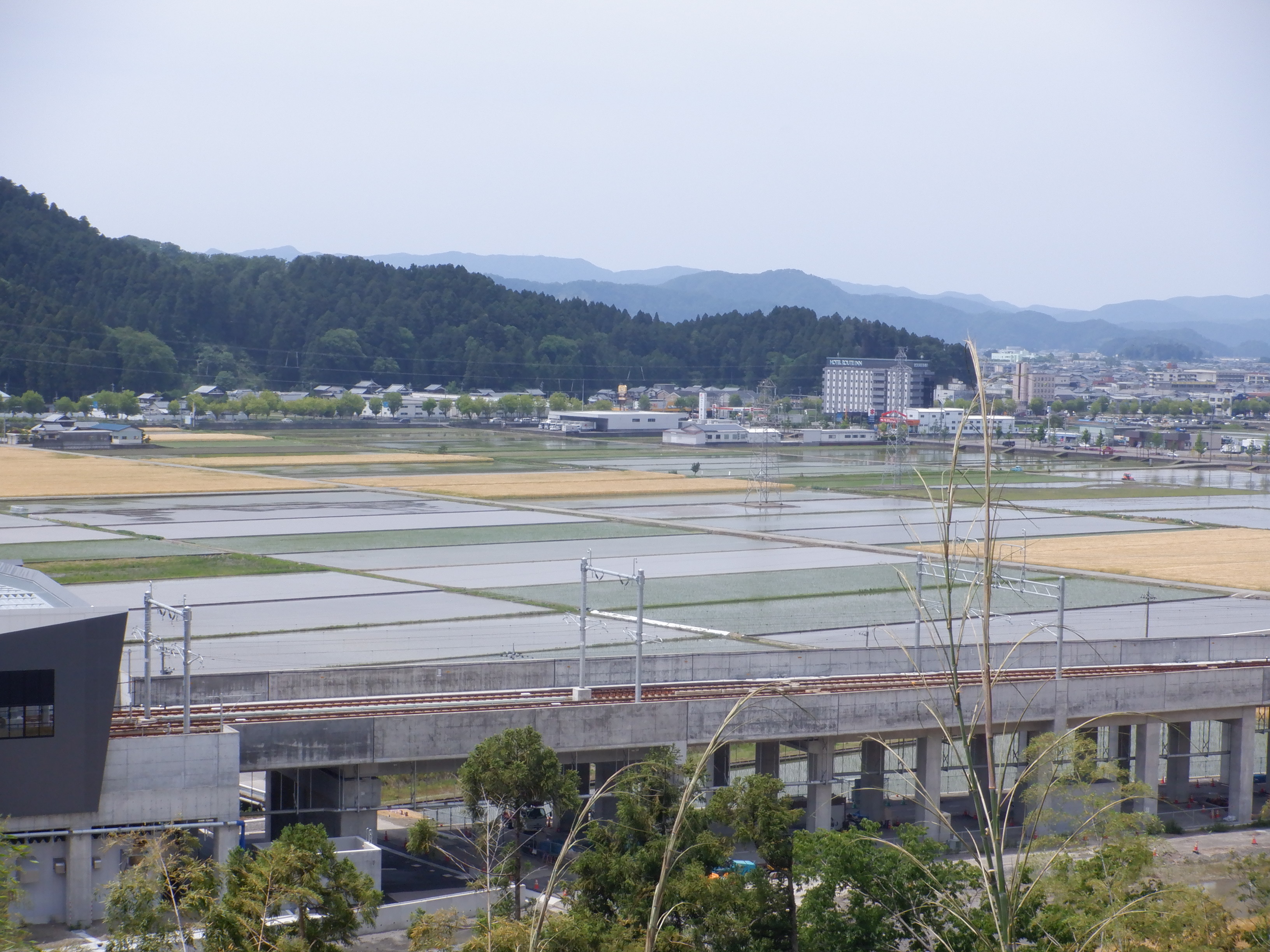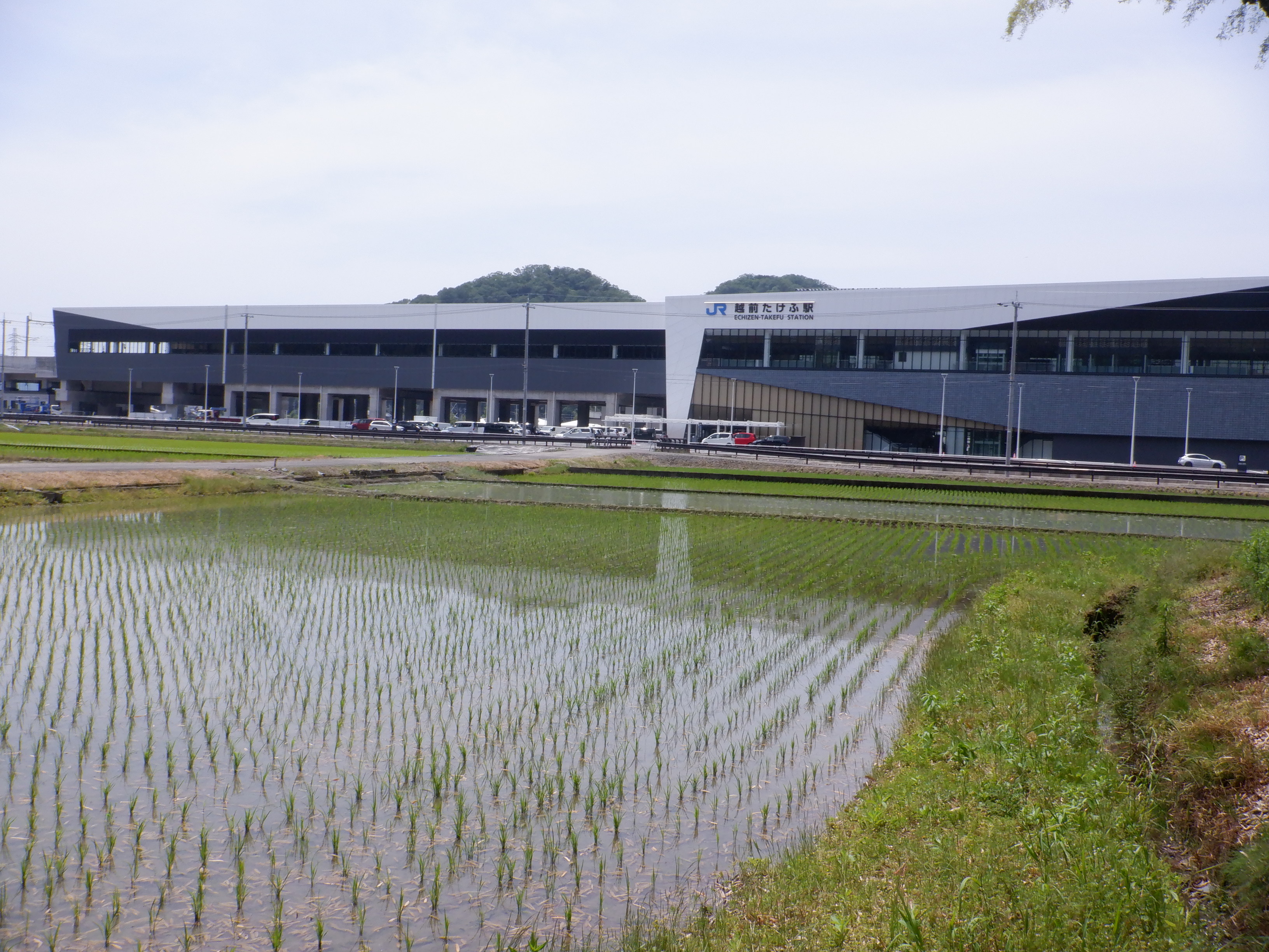 田植え直後や田植え直前の水田と越前たけふ駅。