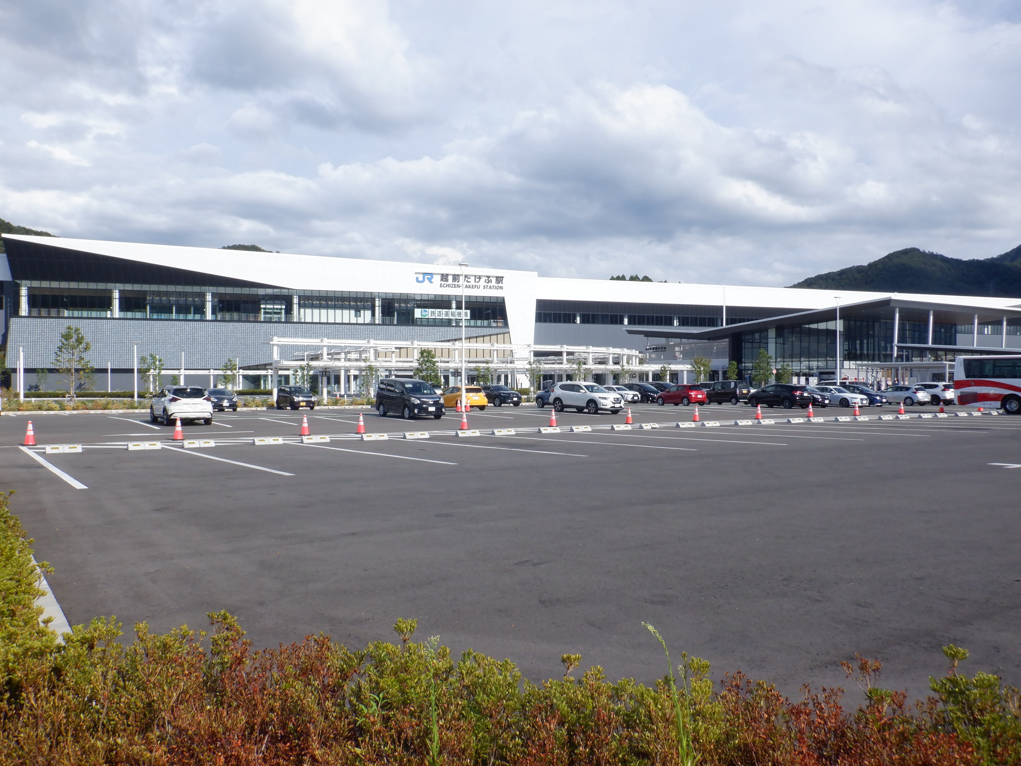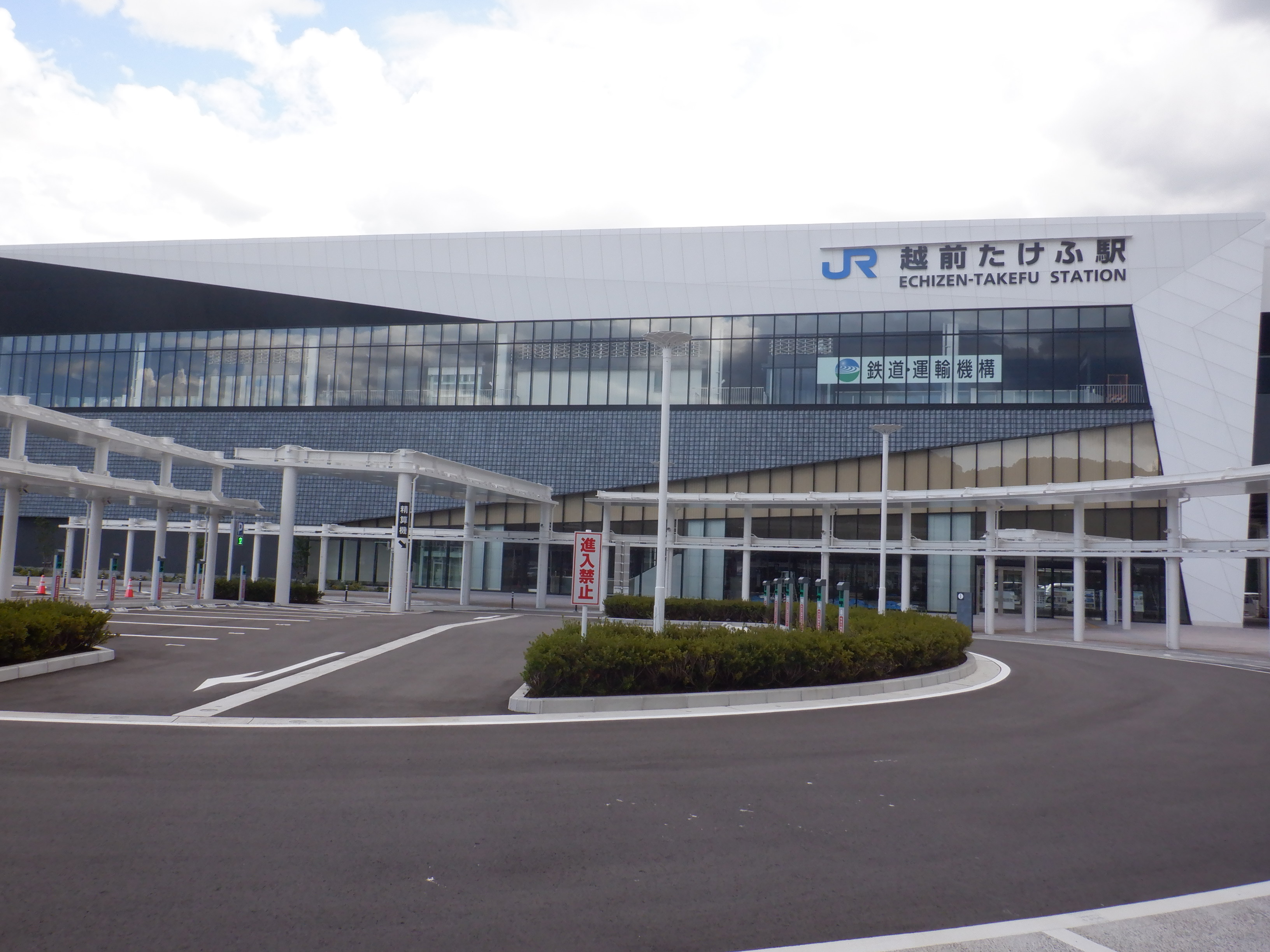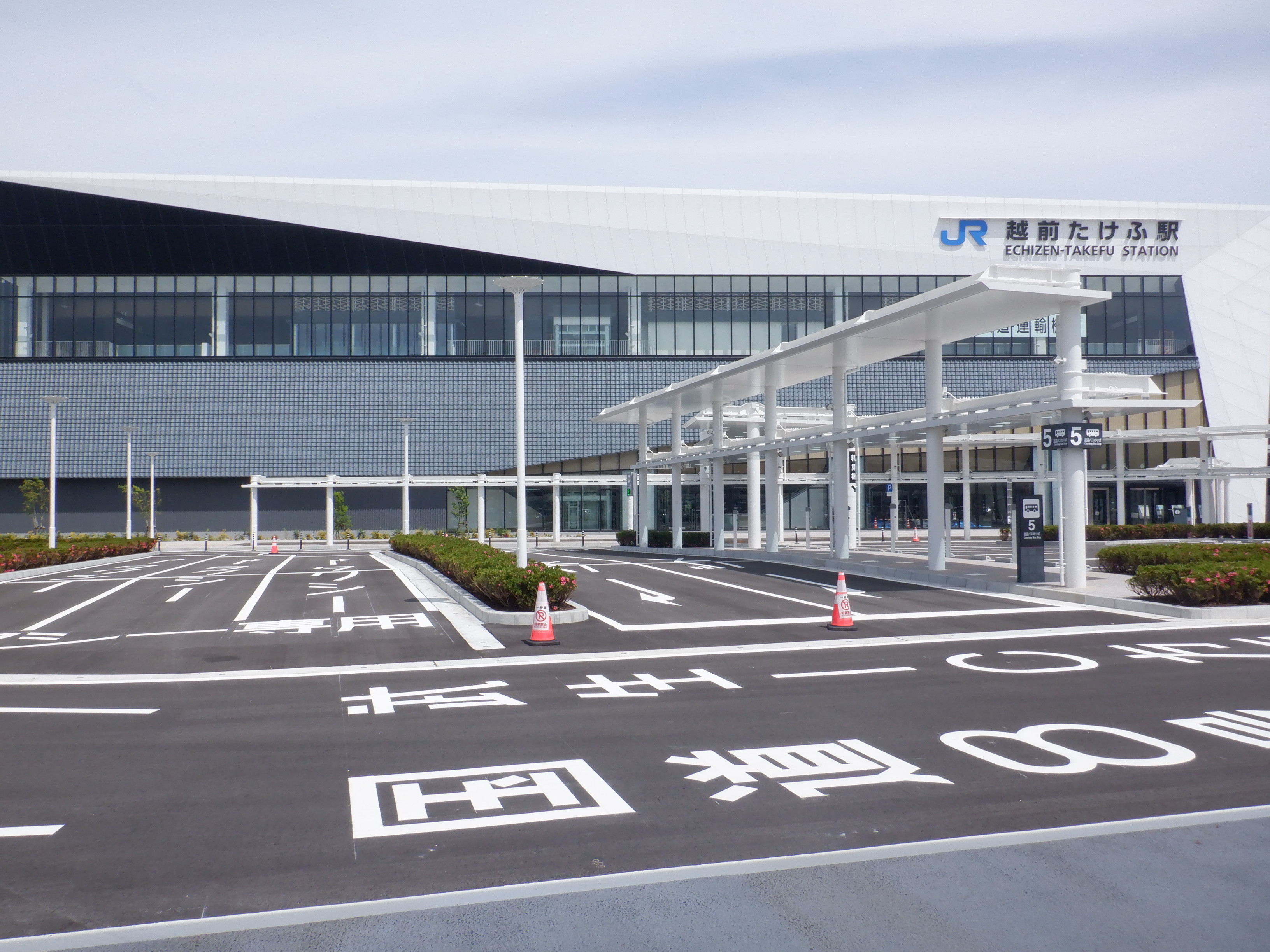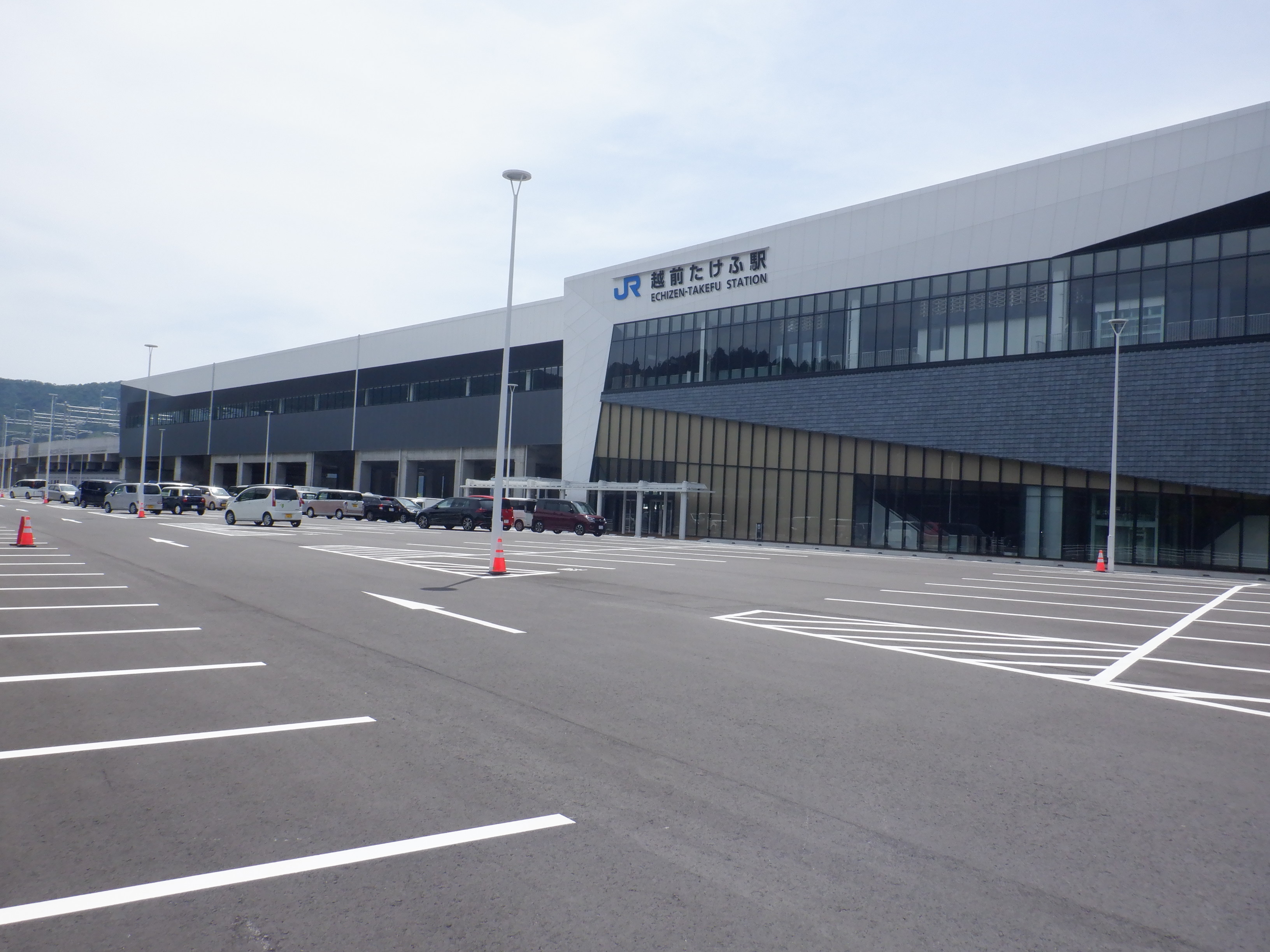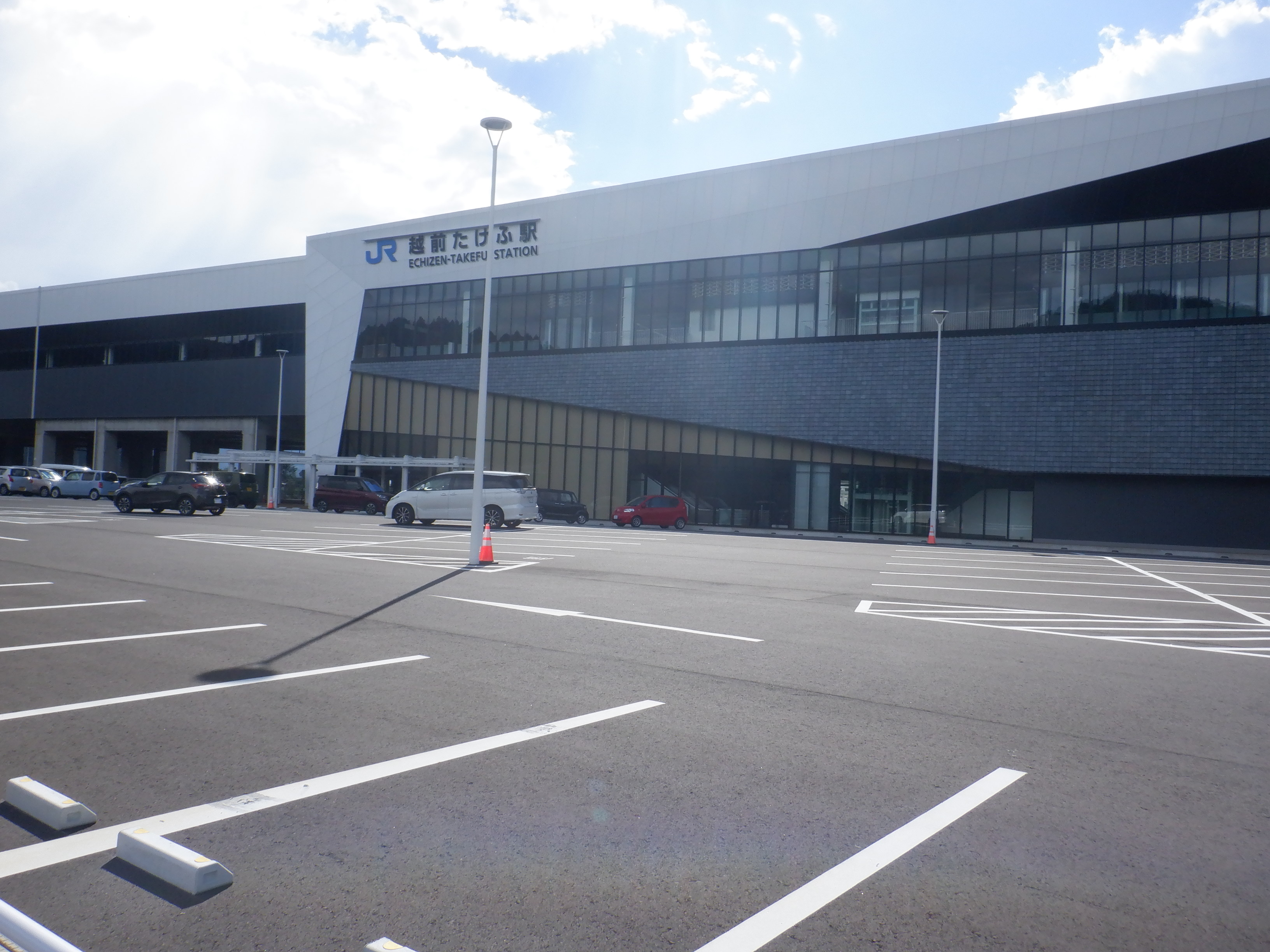 田植え直後や田植え直前の水田と越前たけふ駅。