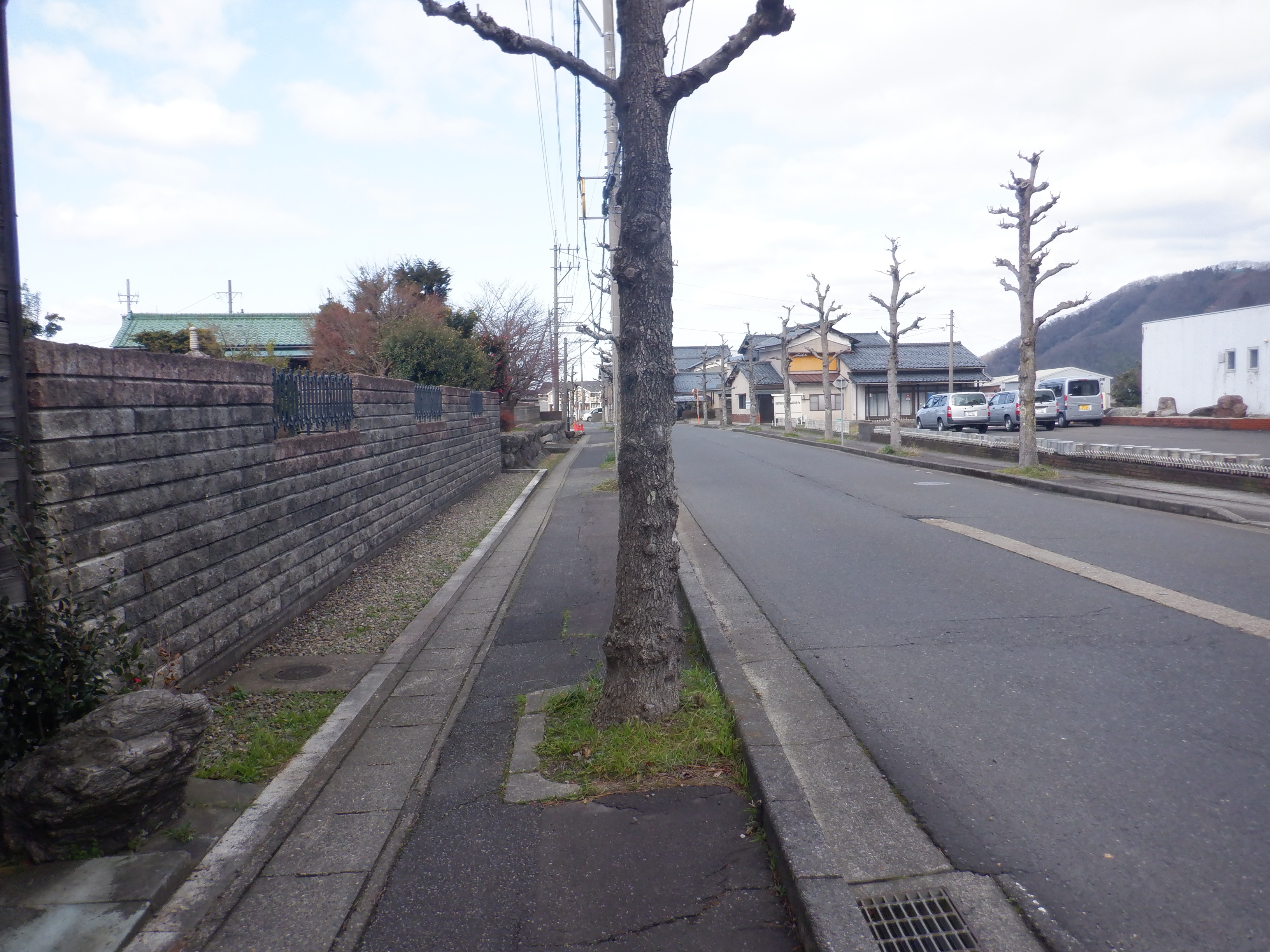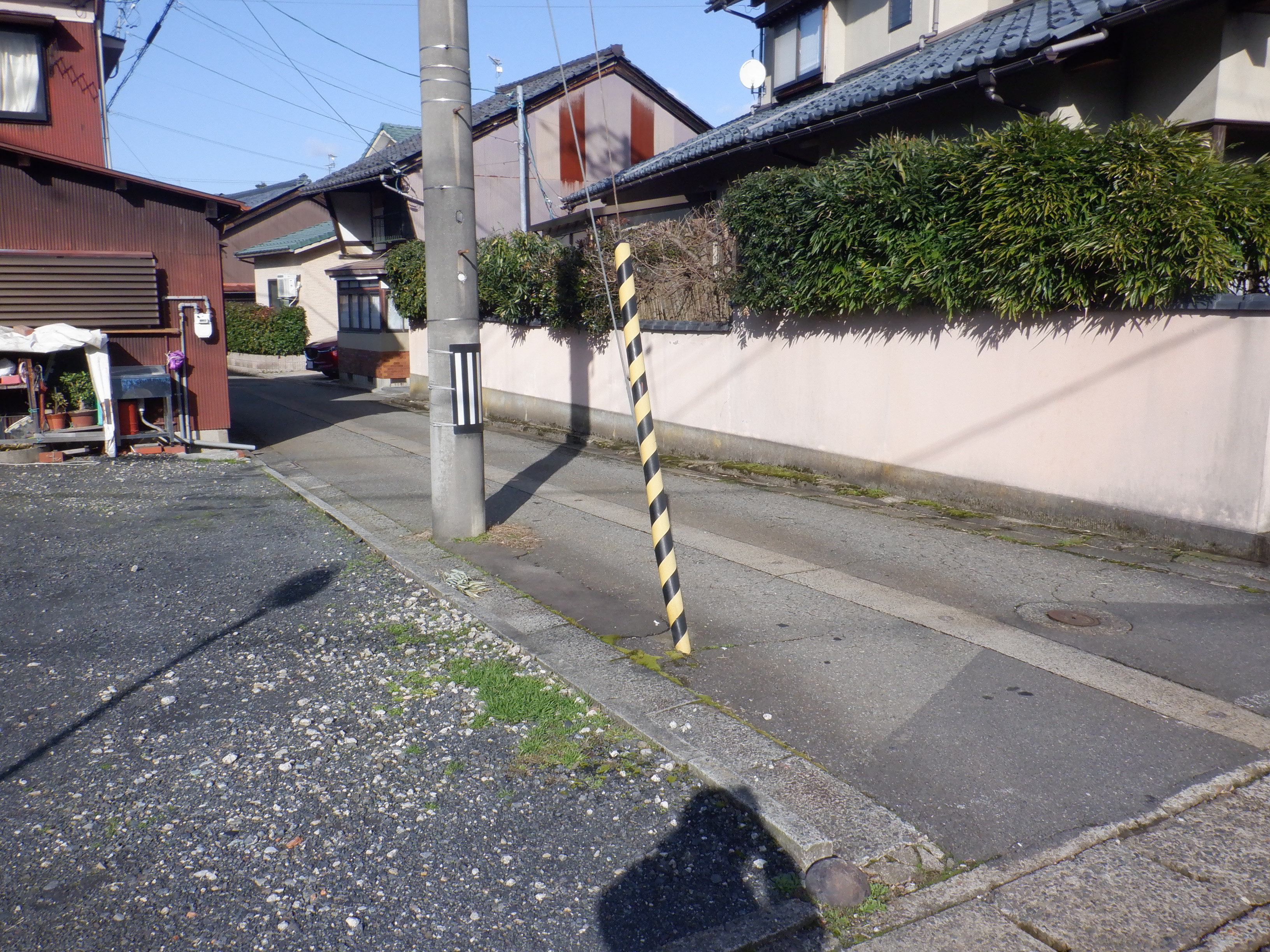 右に曲がり、踏切の手前で線路沿いに方向を変えます。住宅地の中を通ります。
