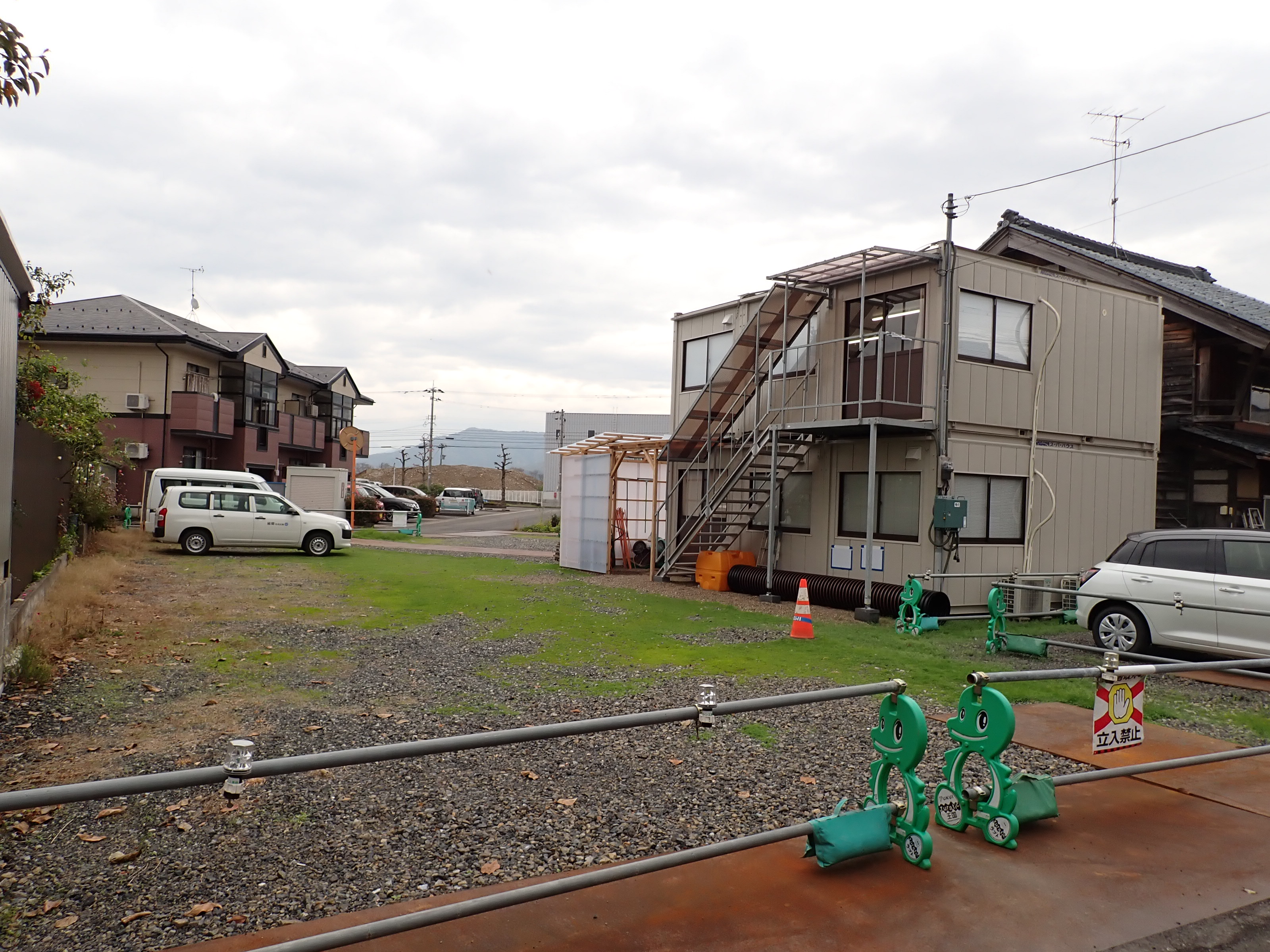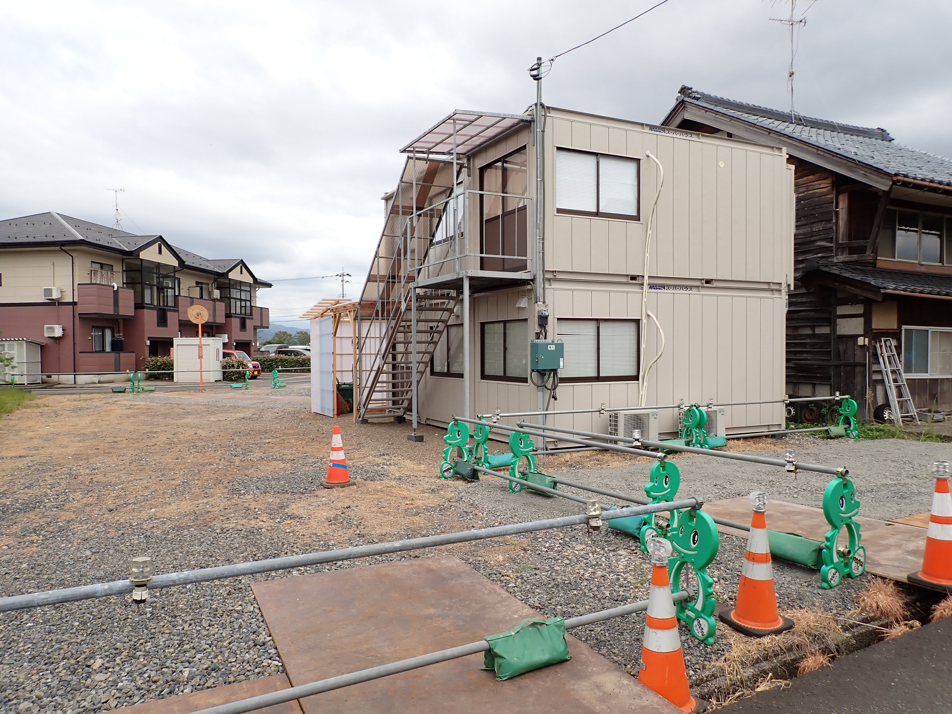 歩道橋の出口の向かい側に作られた現場事務所。