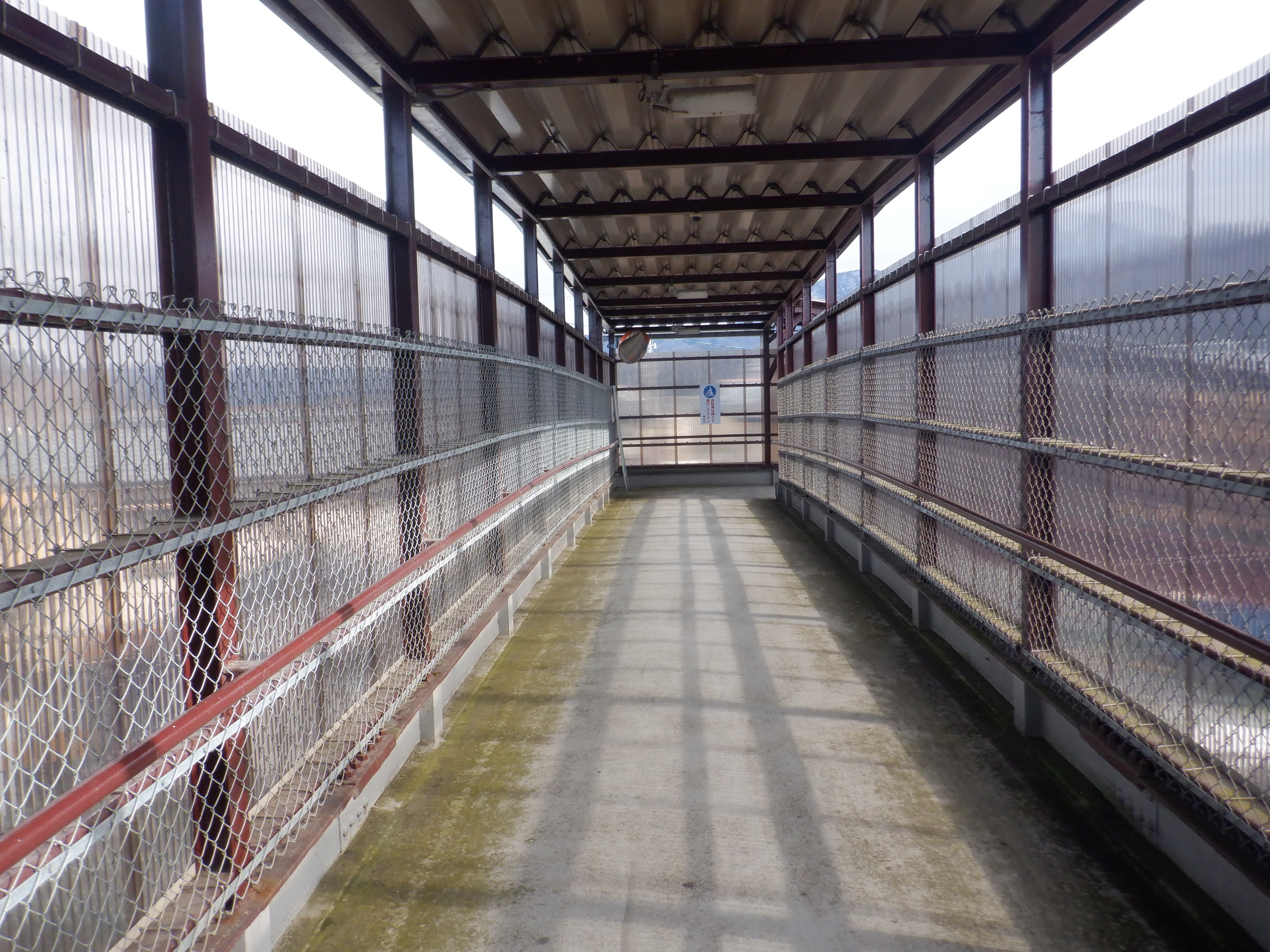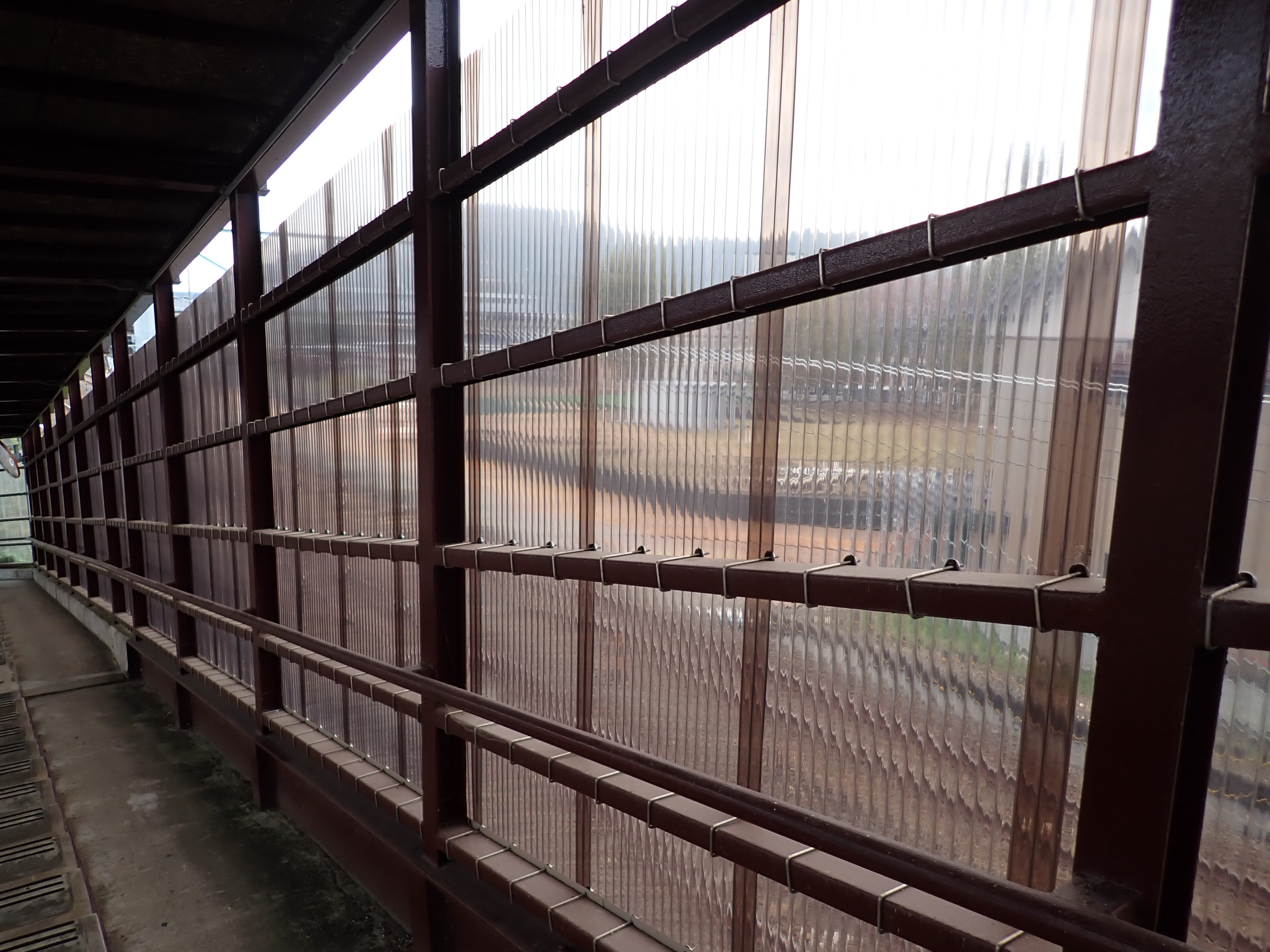 歩道橋内の様子とプラスチックトタン越しに見た駅が作られるところ。