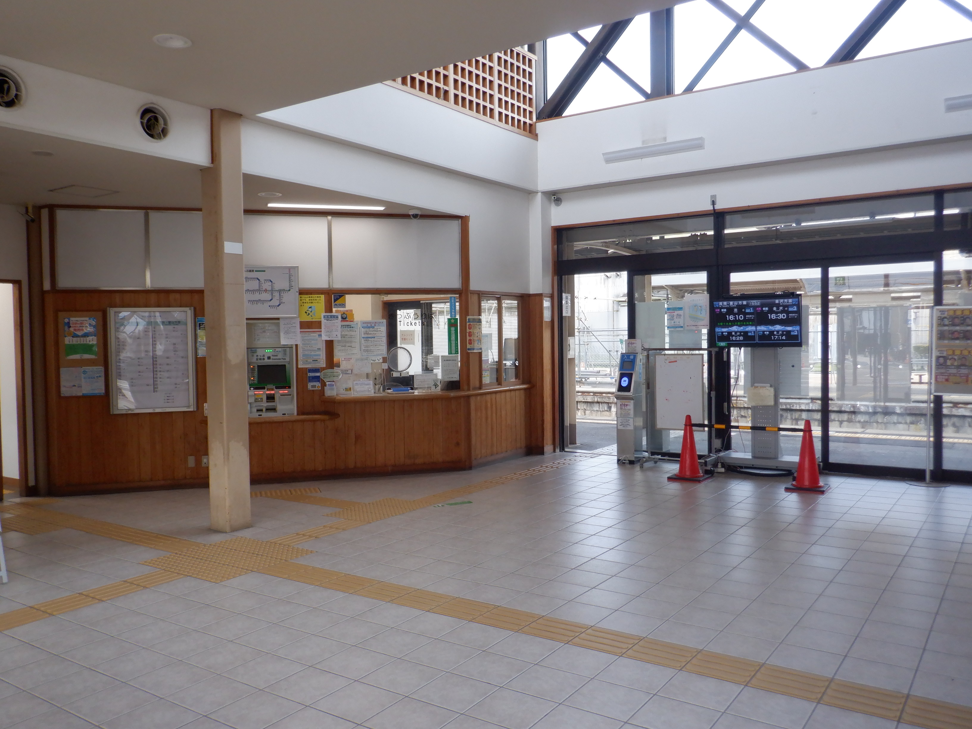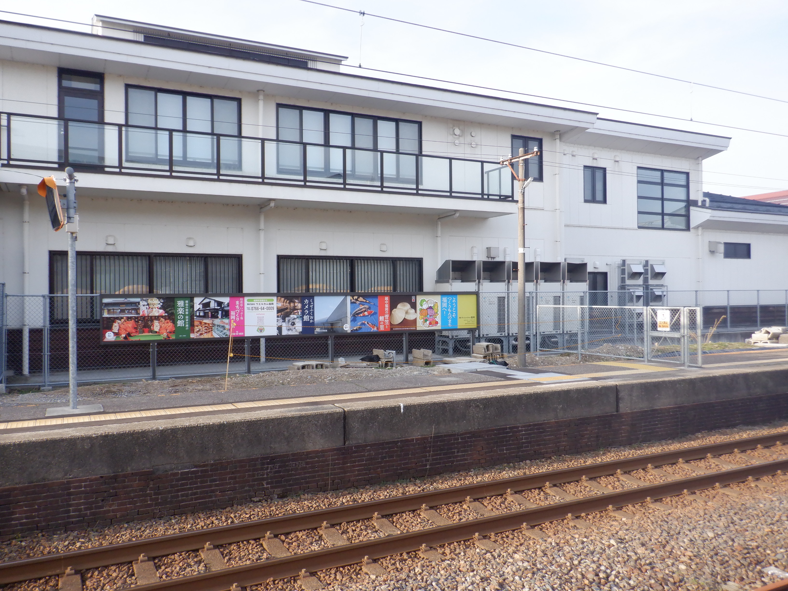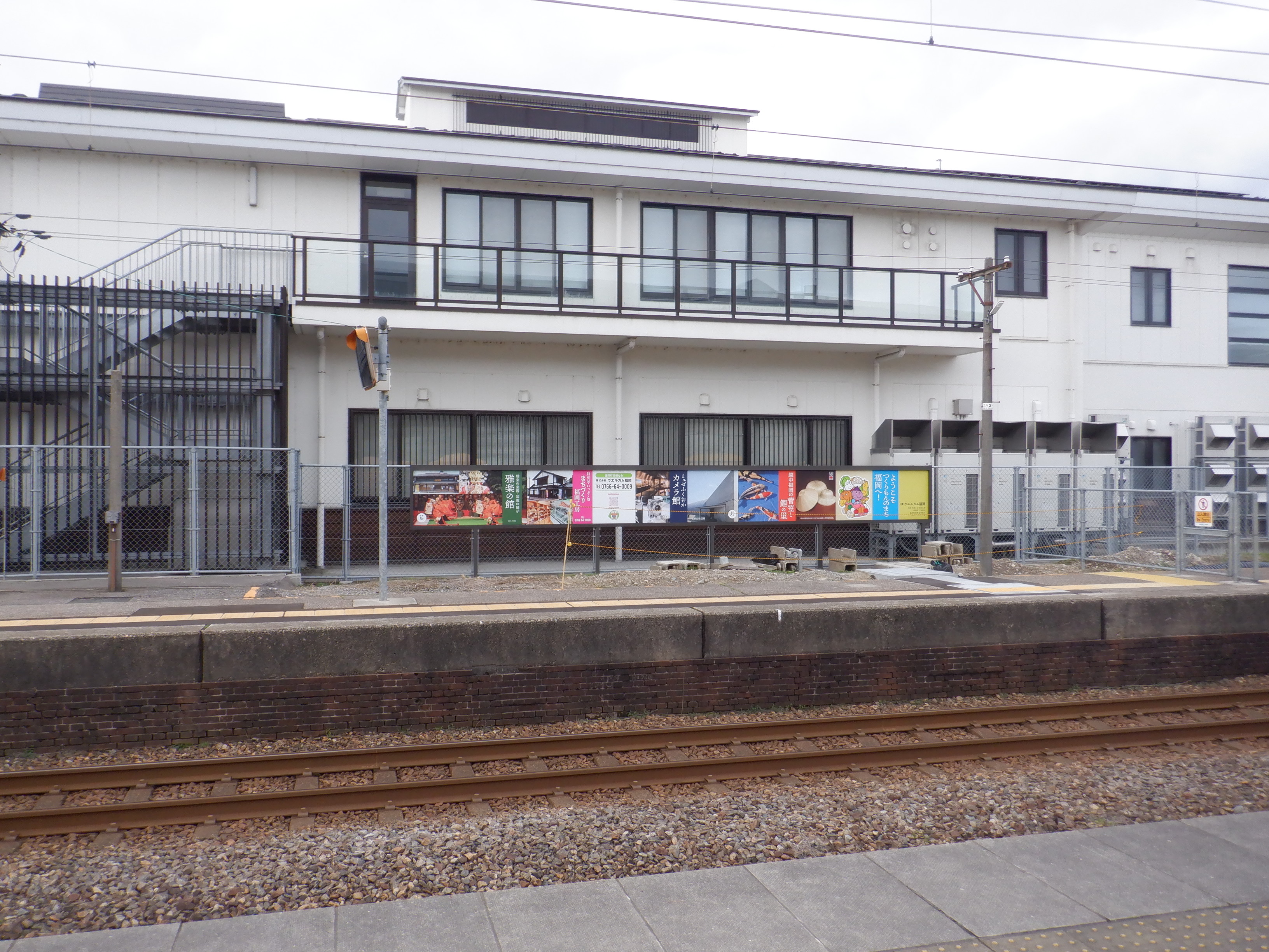 駅名標・名所案内とエレベーター跨線橋ができるところの囲い。