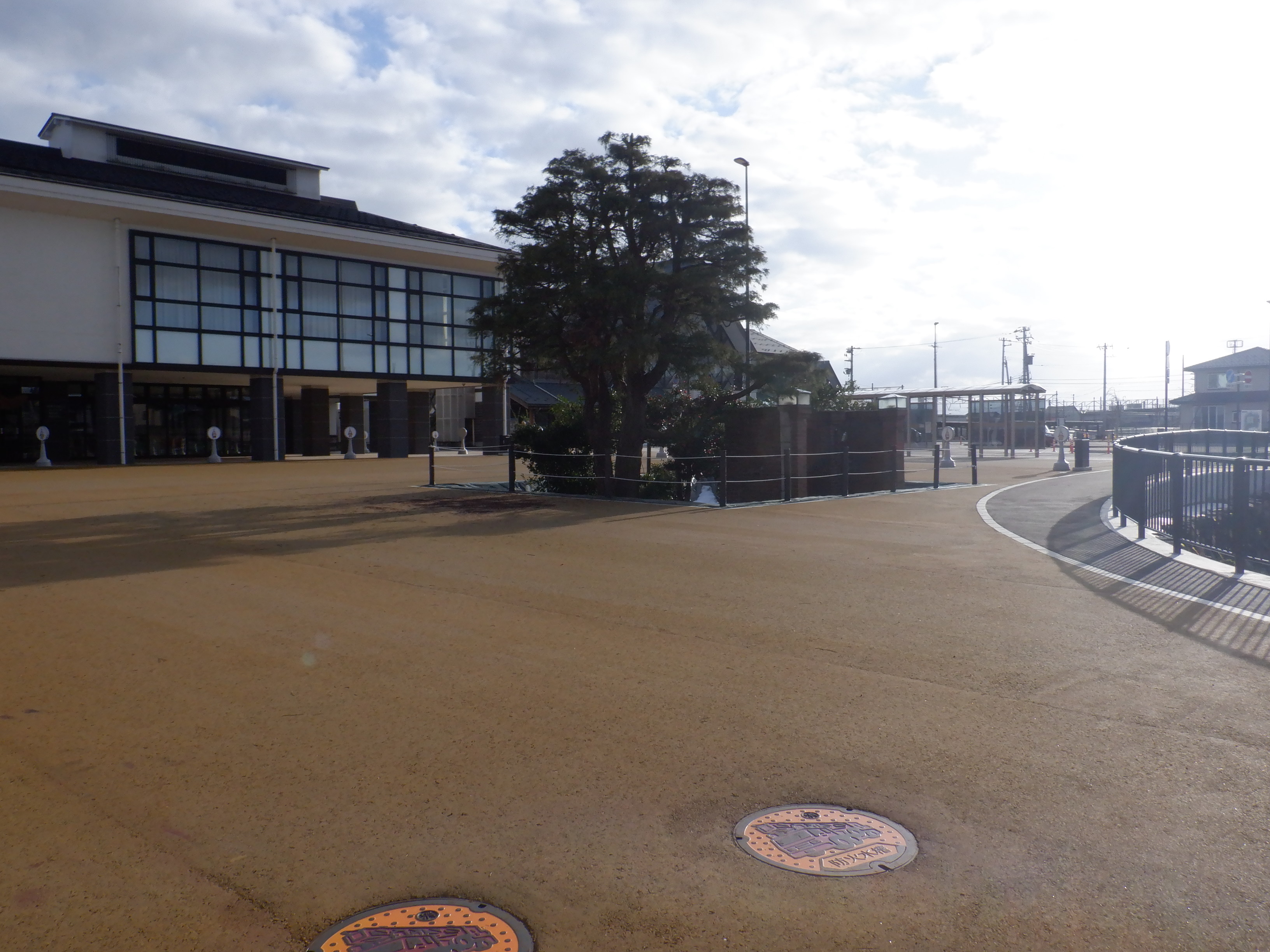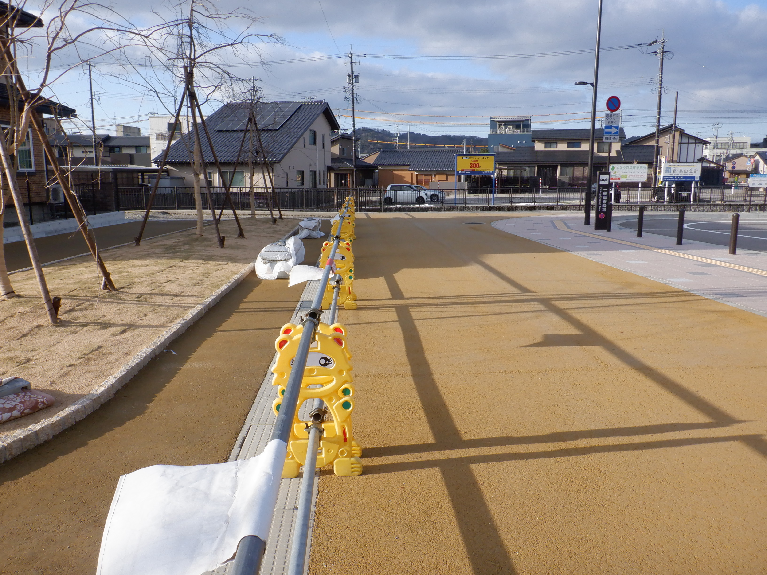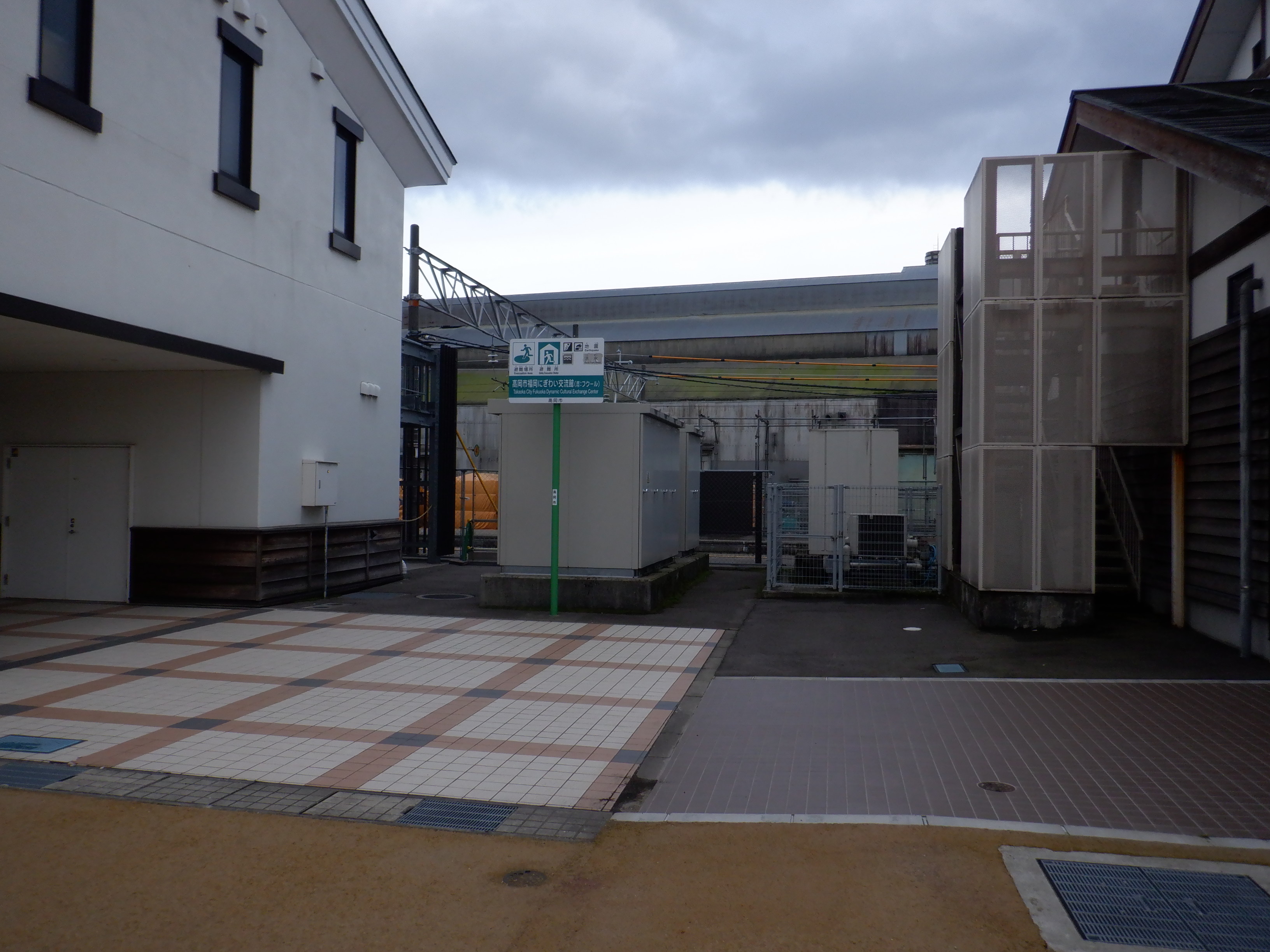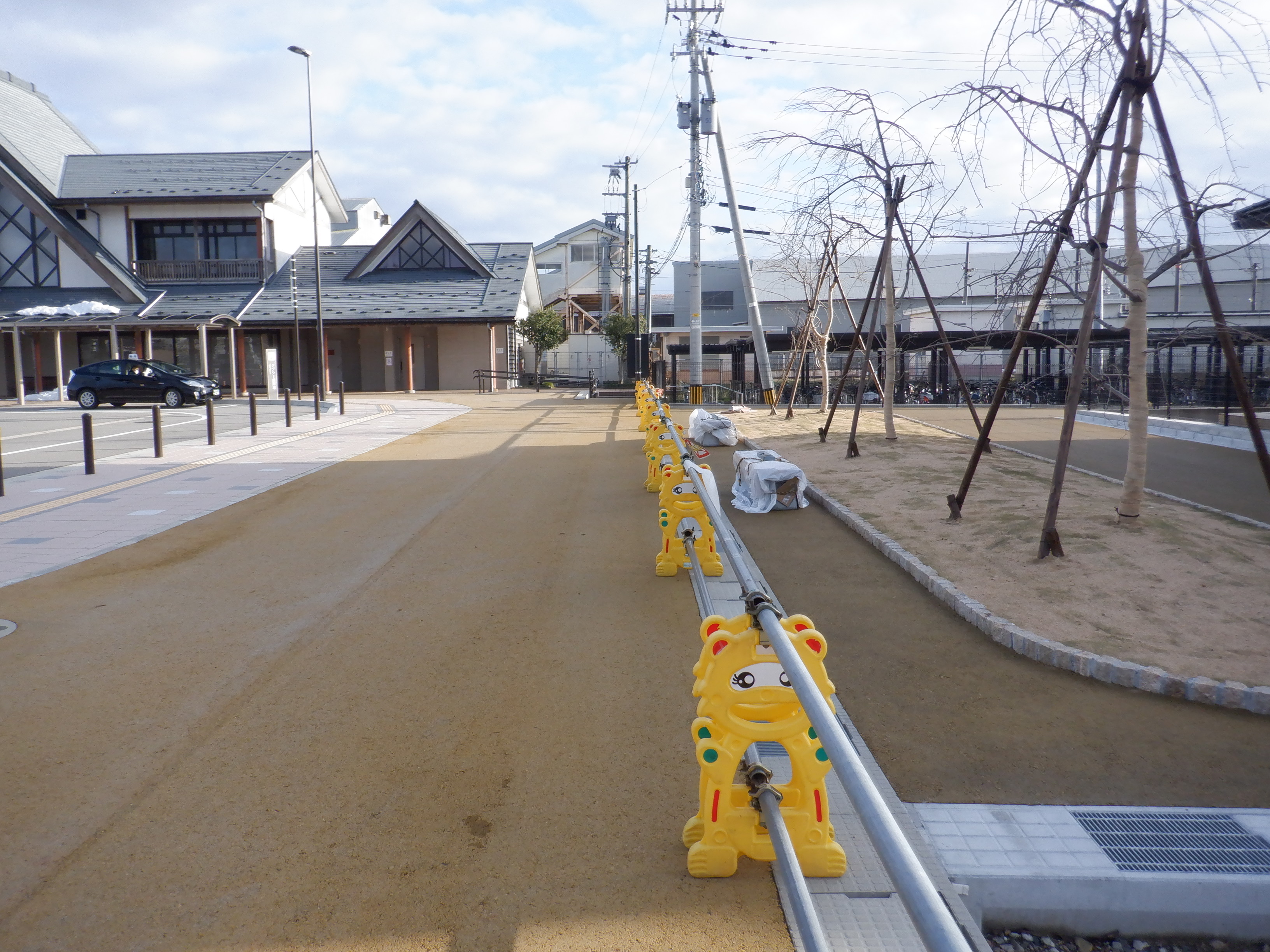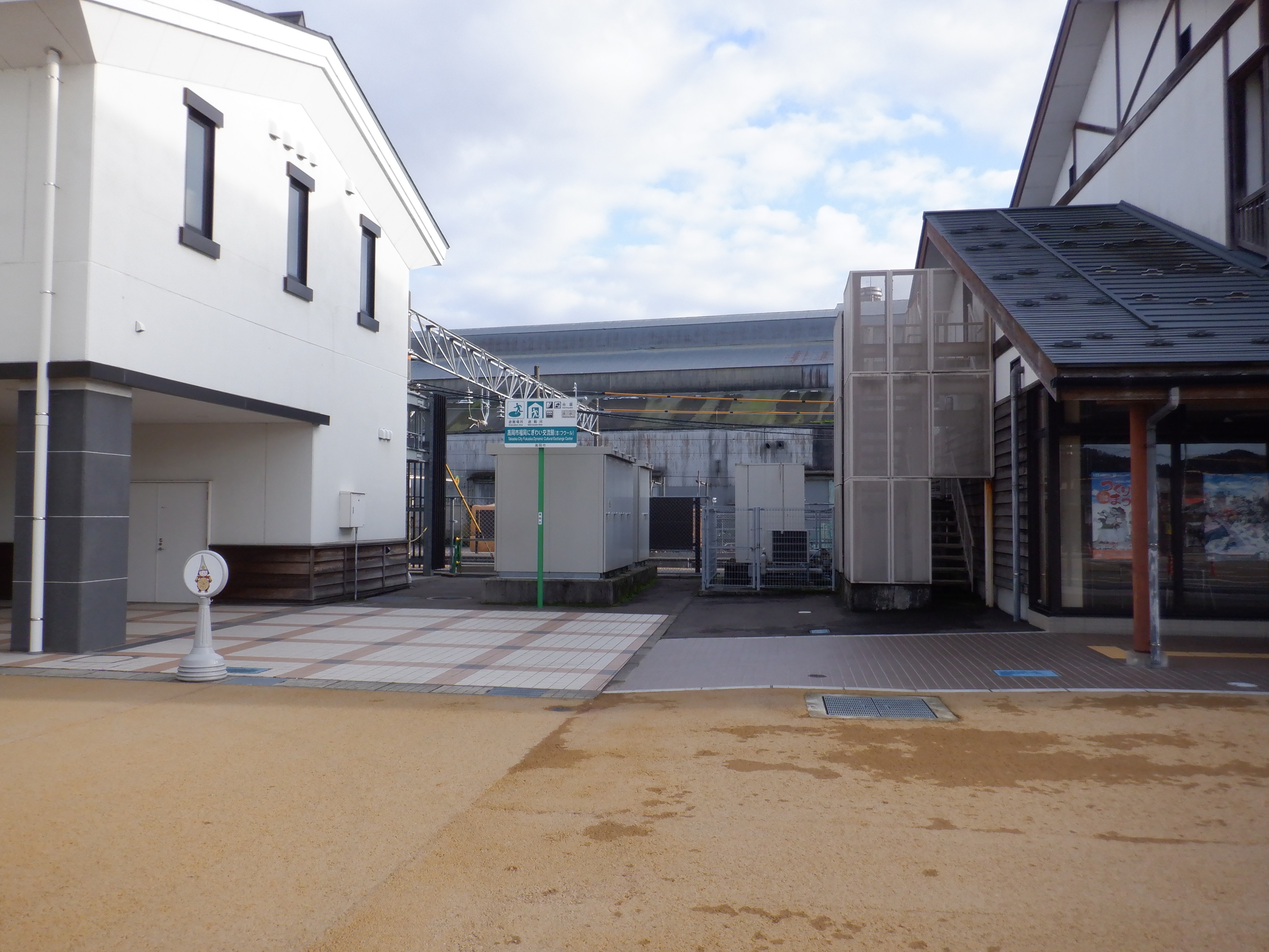 駅舎とにぎわい交流館の前の間で、エレベーター跨線橋ができるあたり。