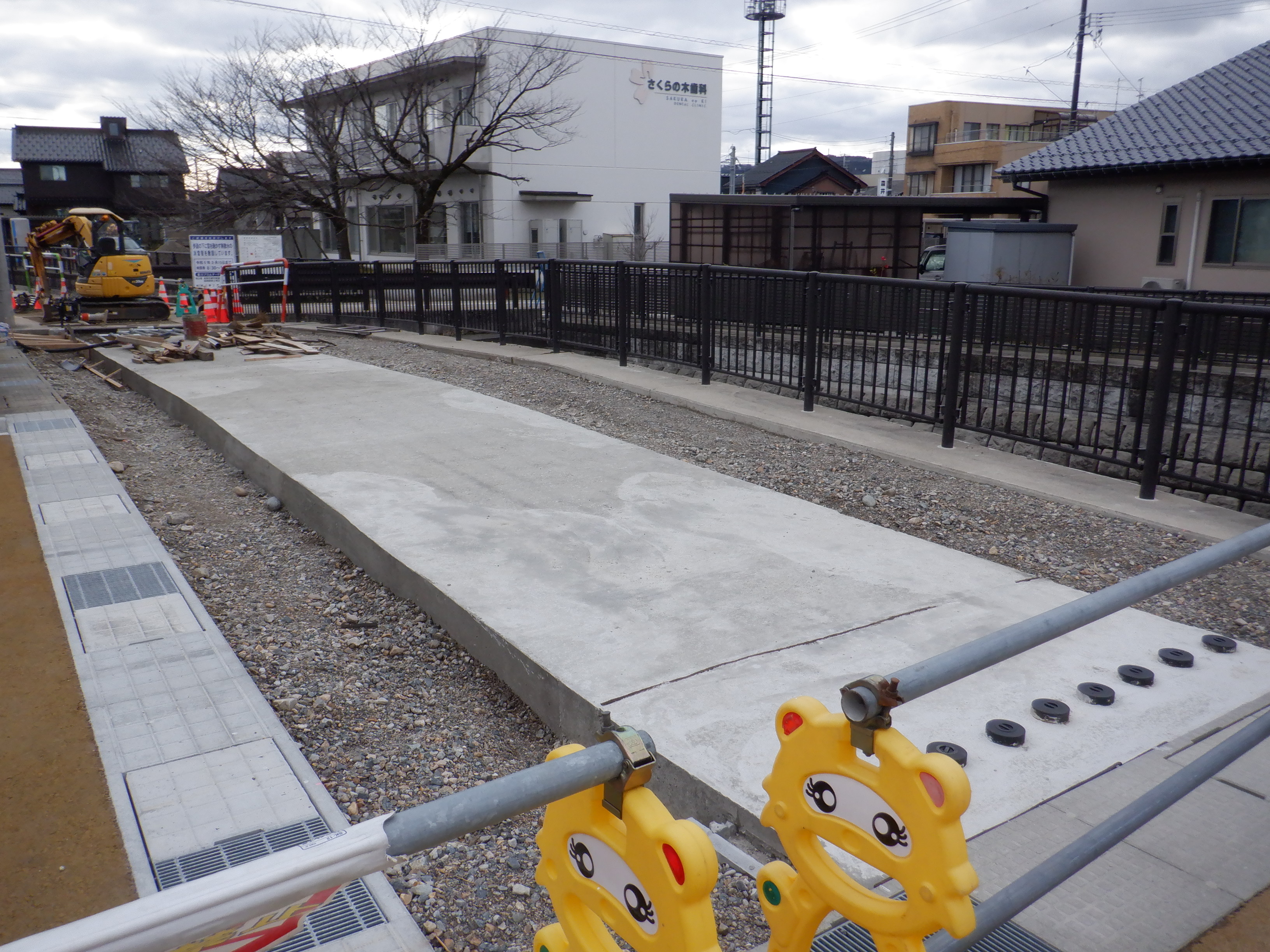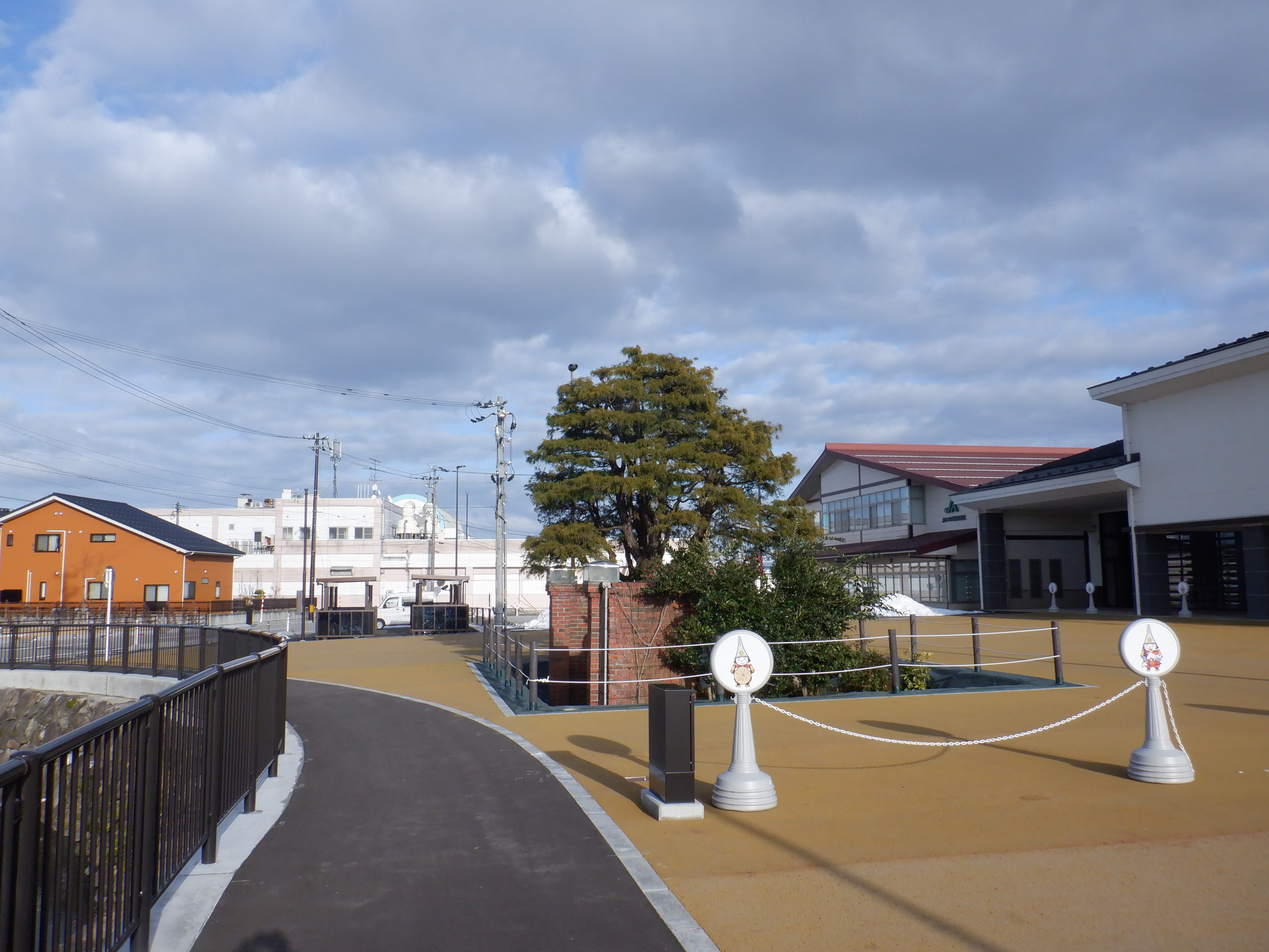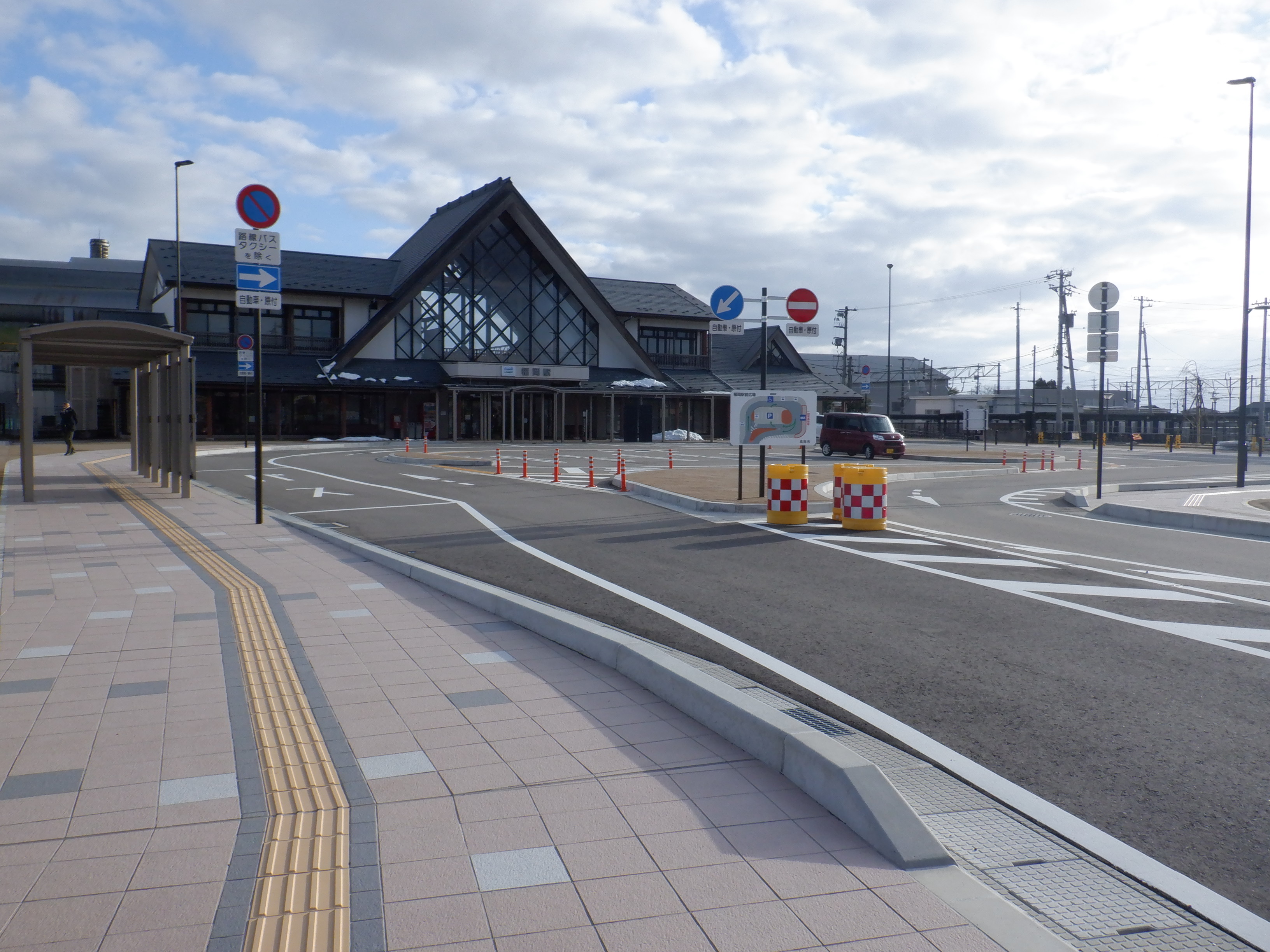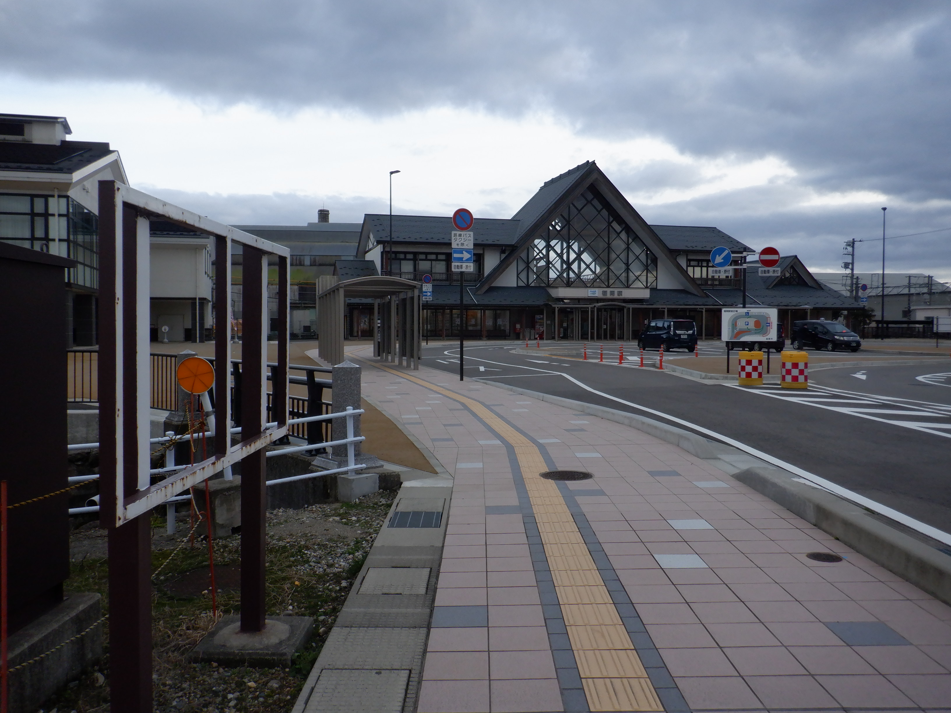 駅舎とにぎわい交流館の前の間で、エレベーター跨線橋ができるあたり。
