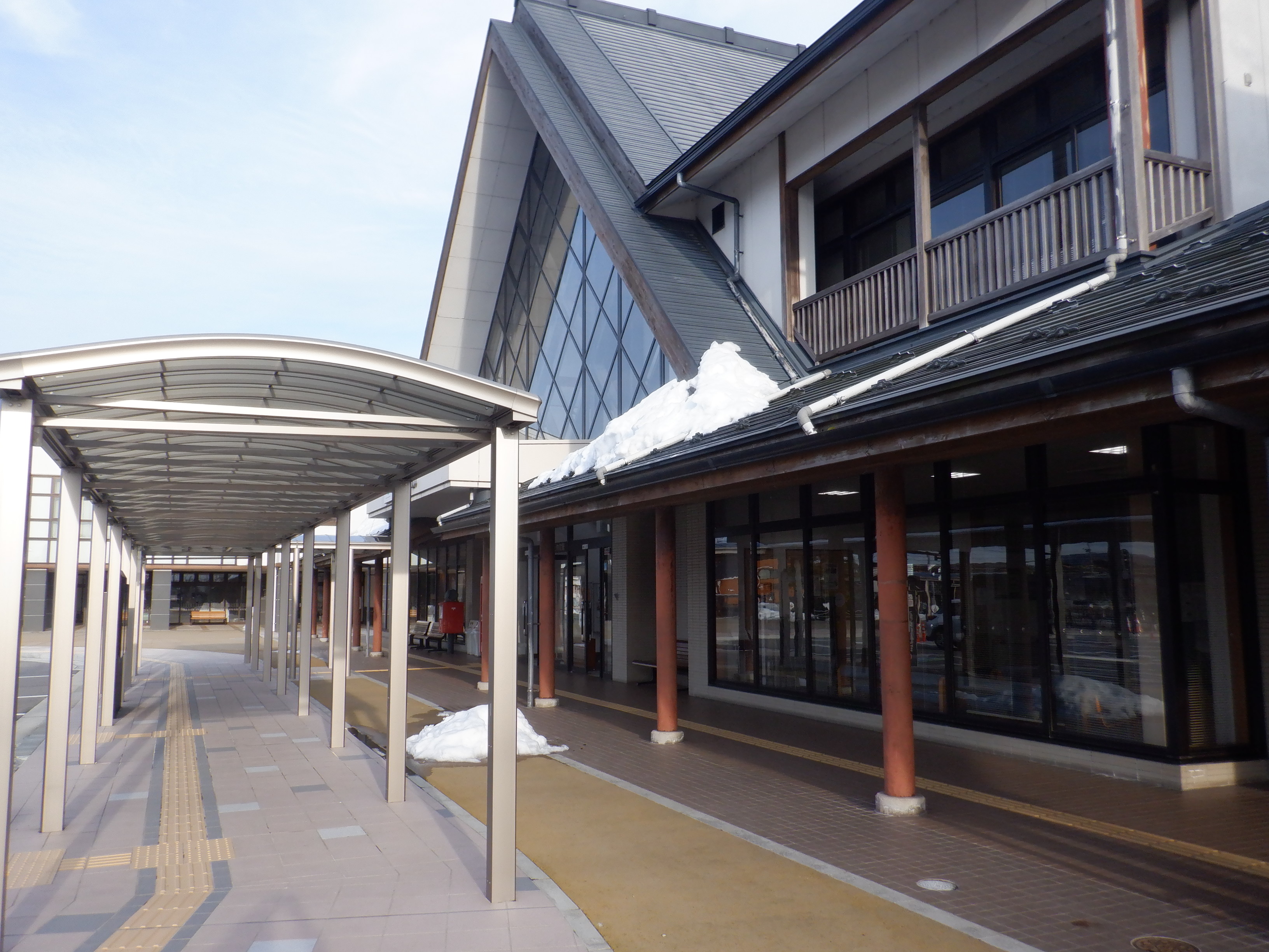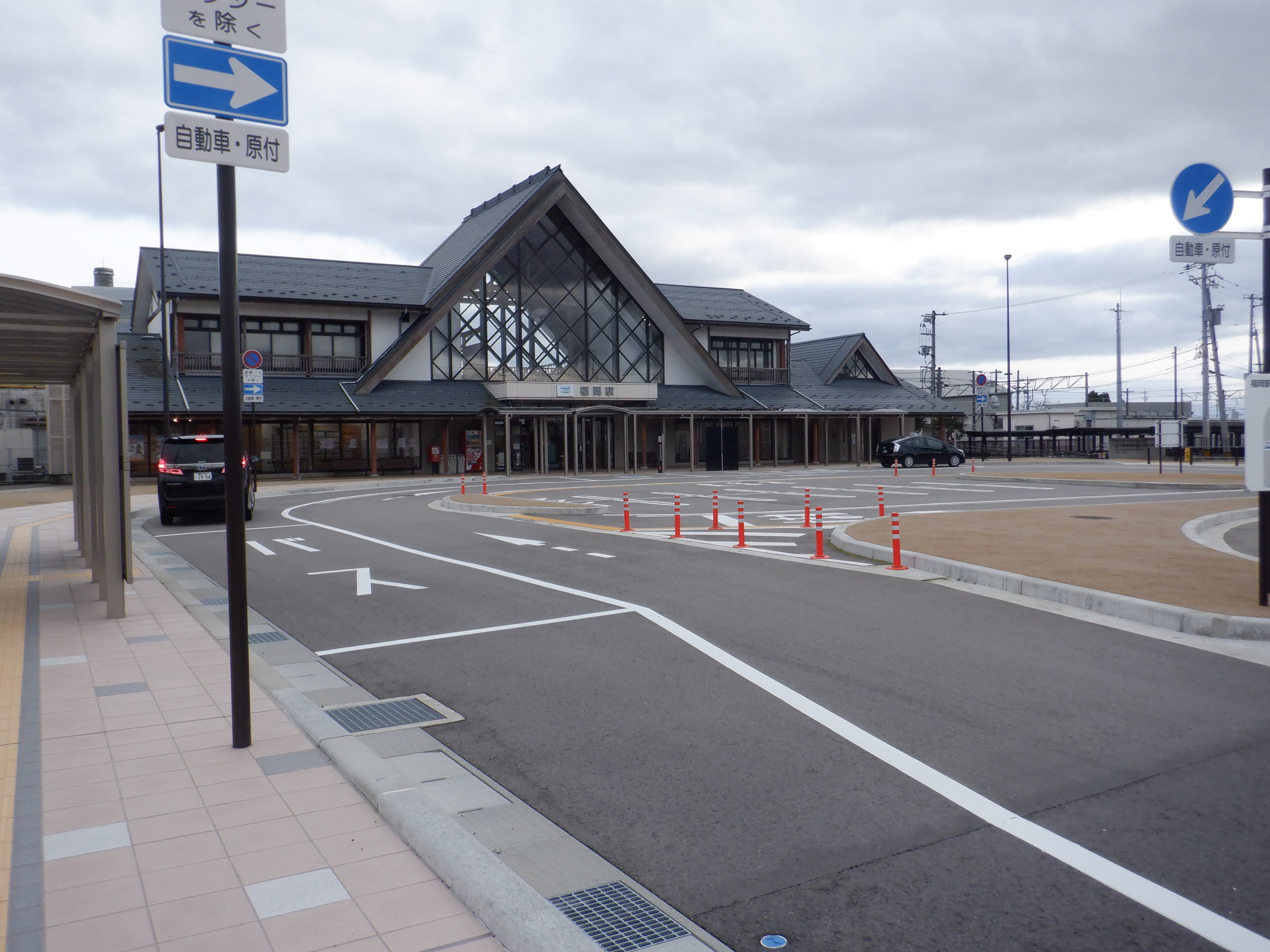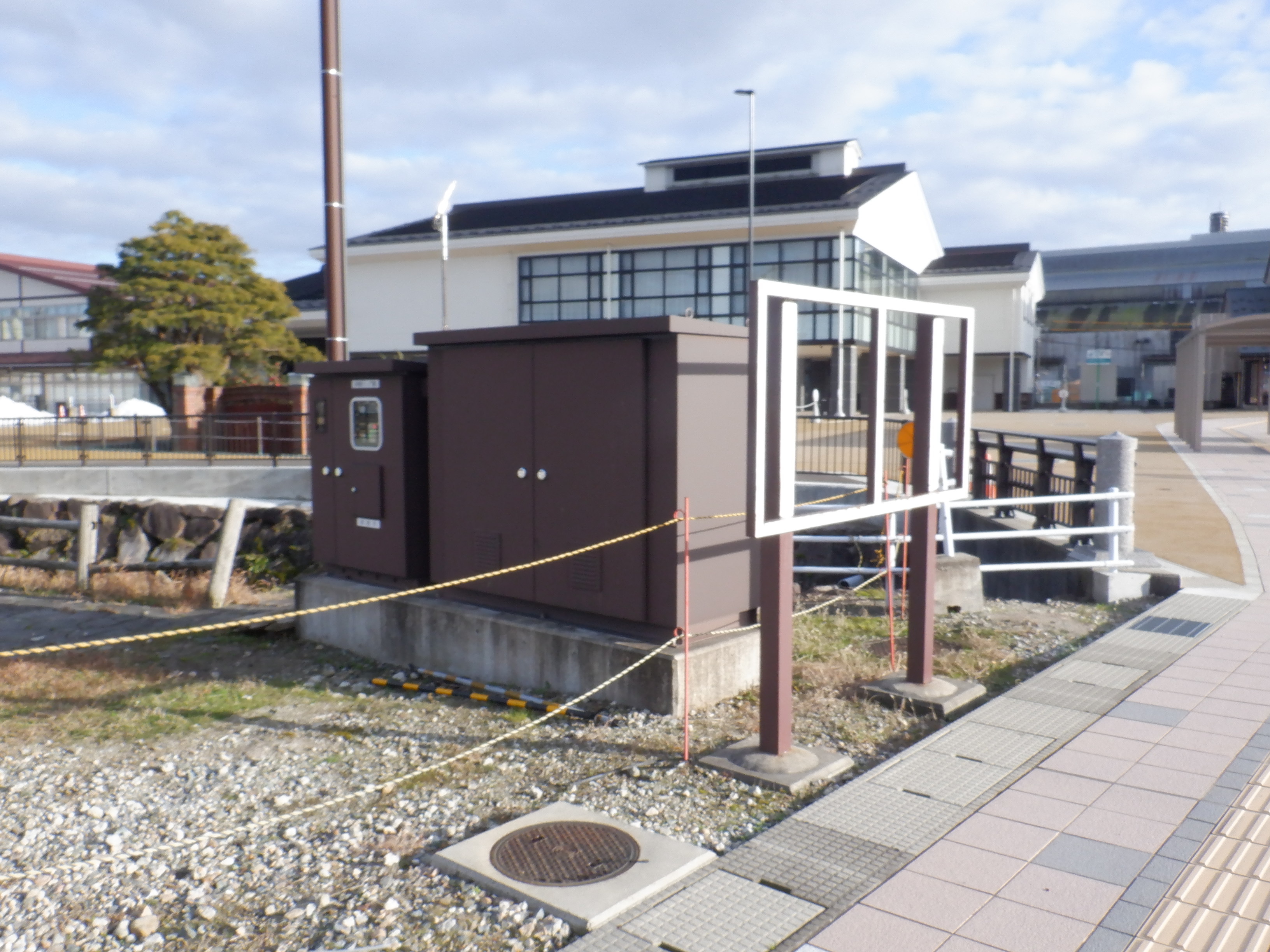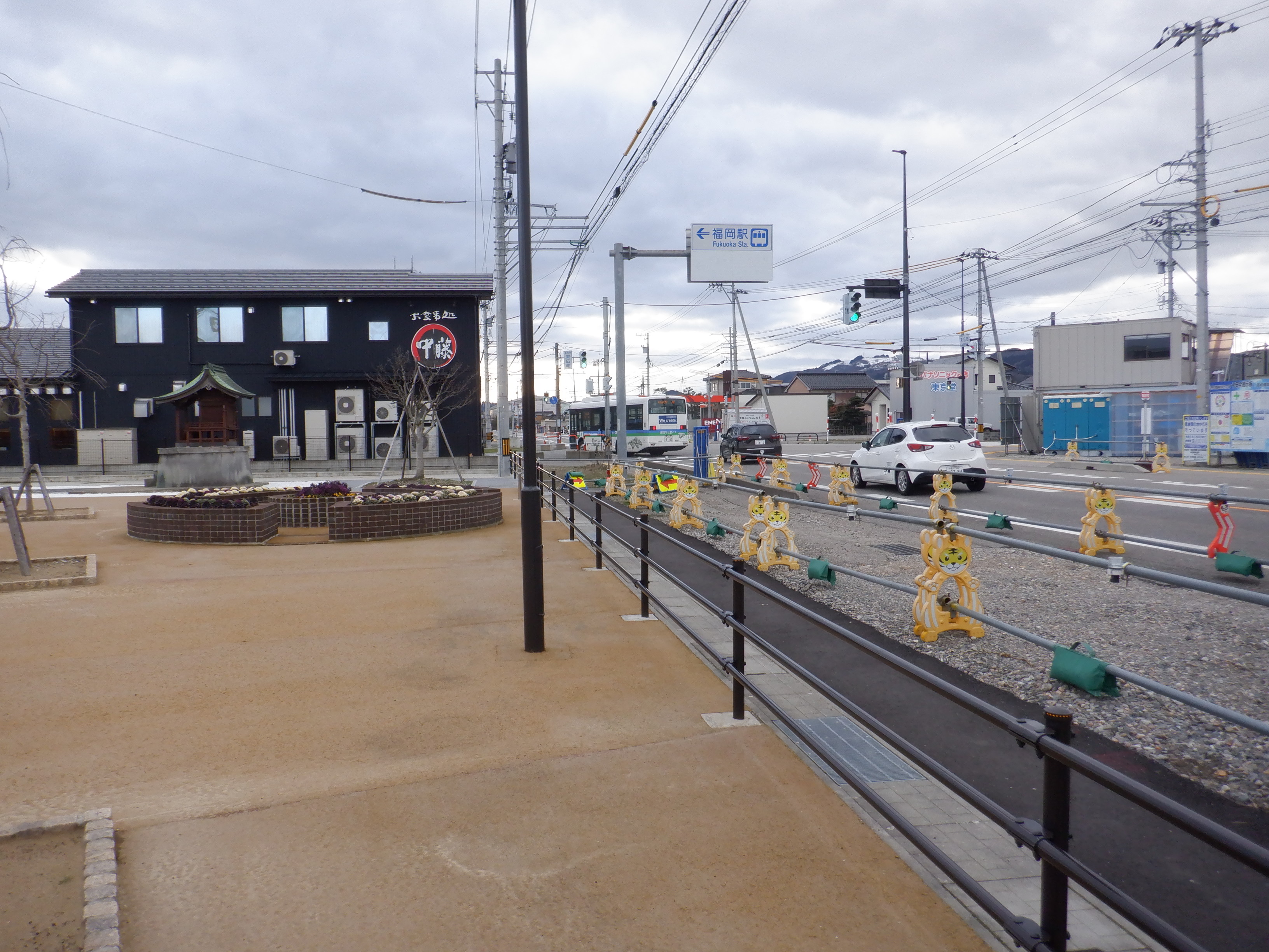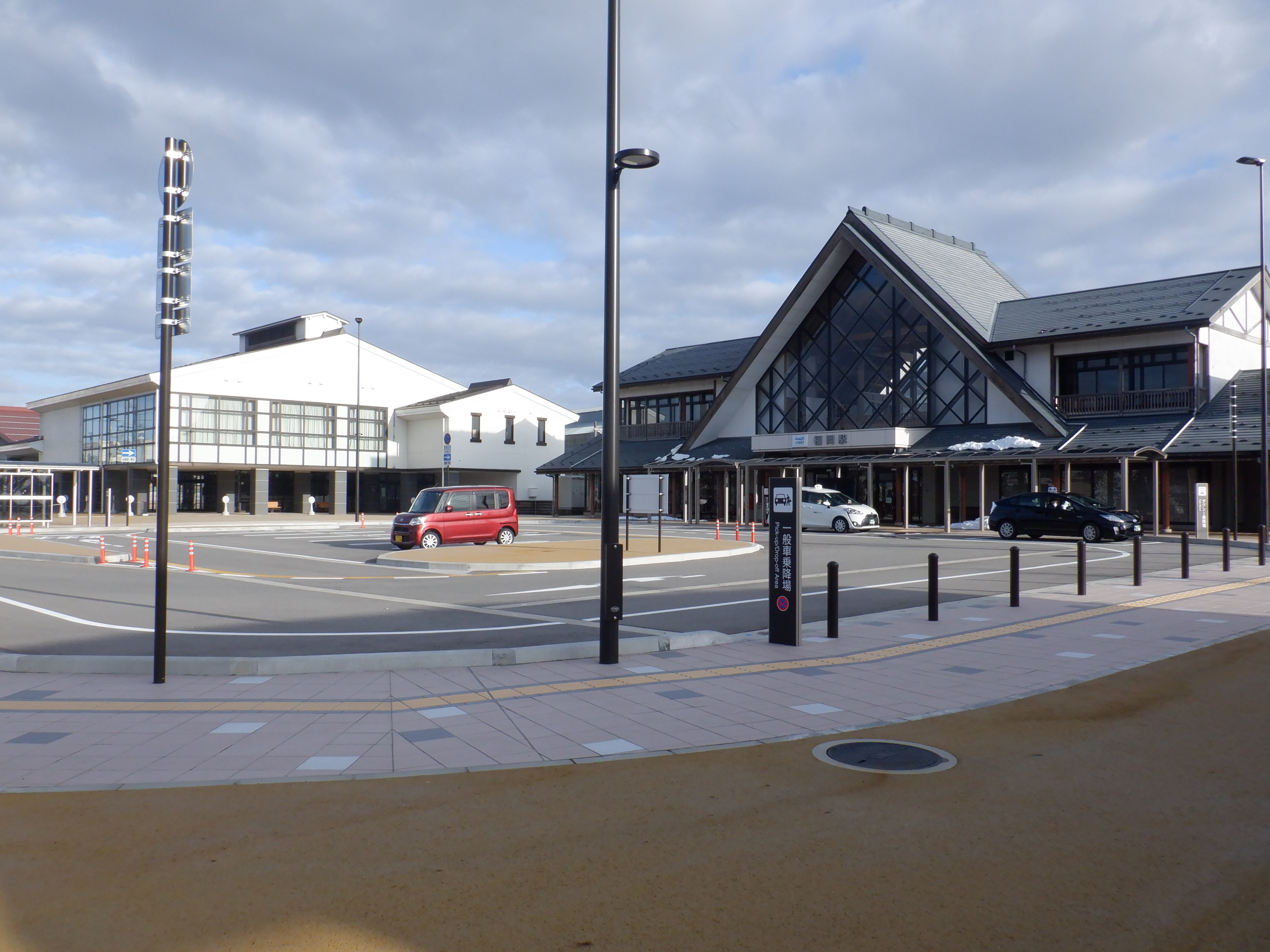 駅舎とにぎわい交流館の前の間で、エレベーター跨線橋ができるあたり。