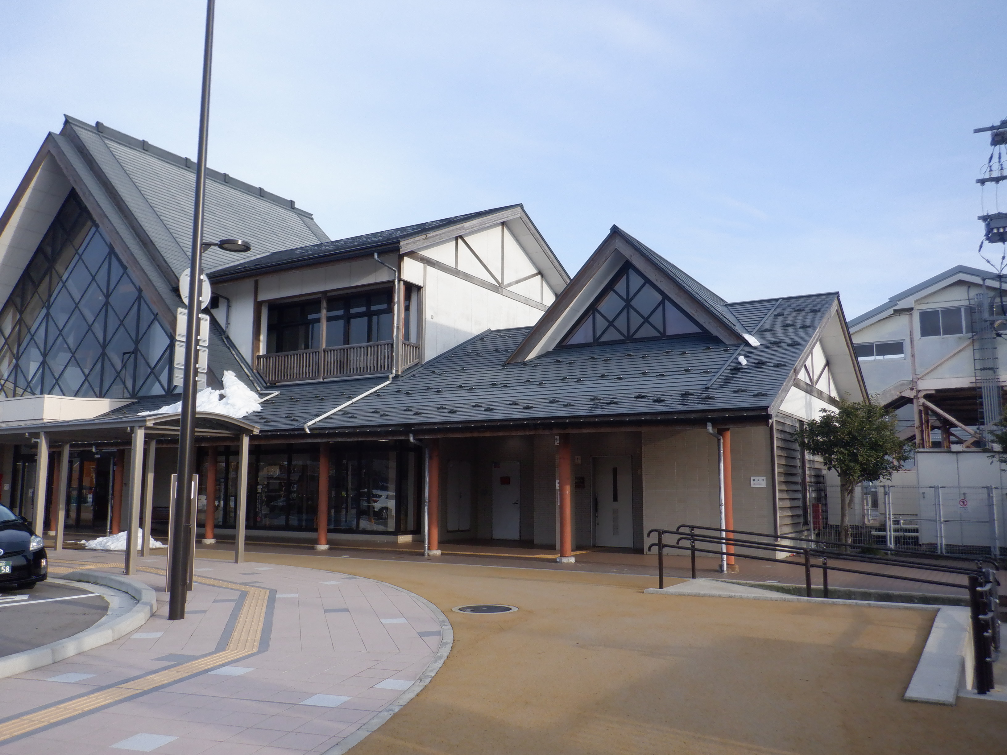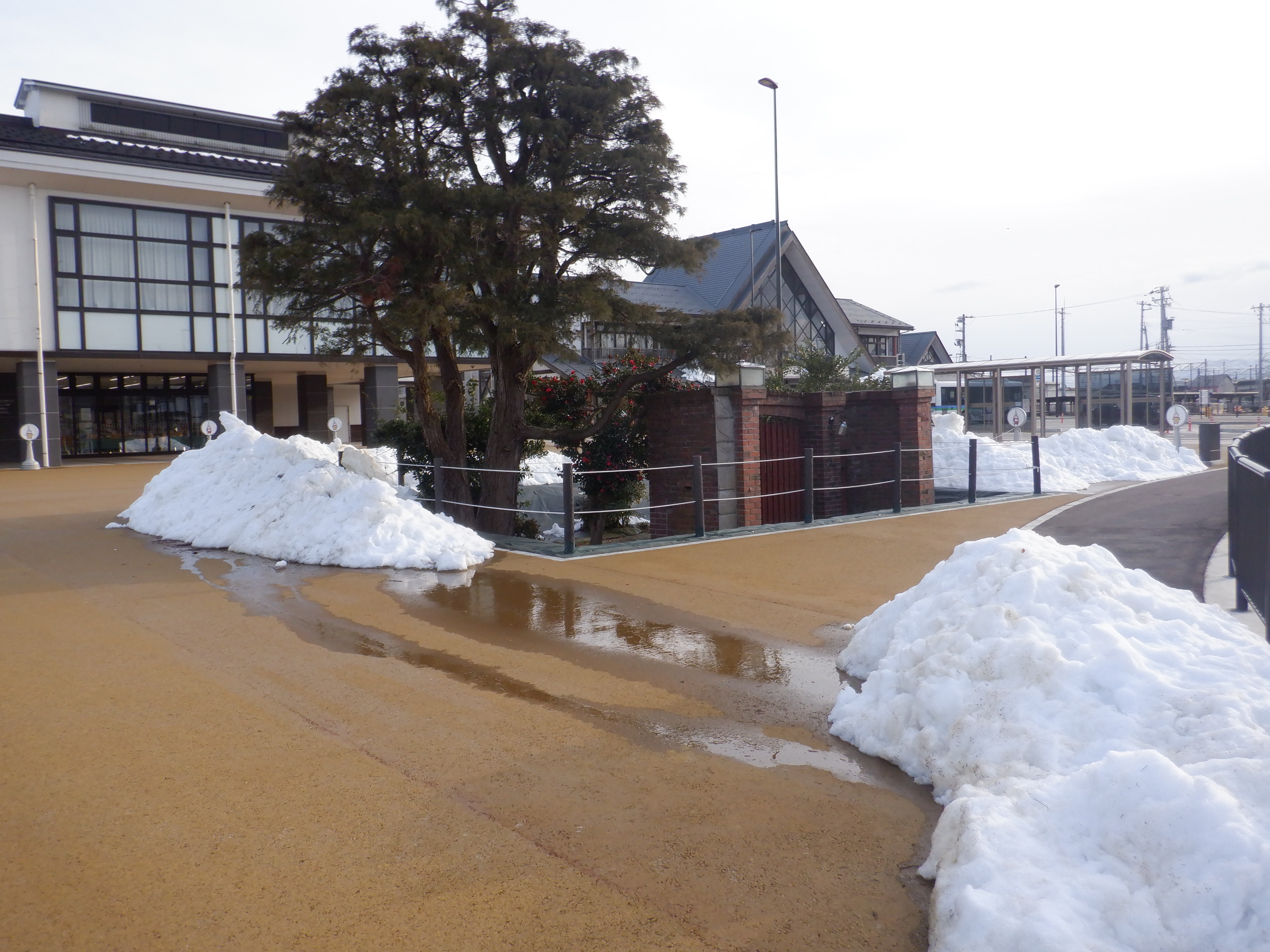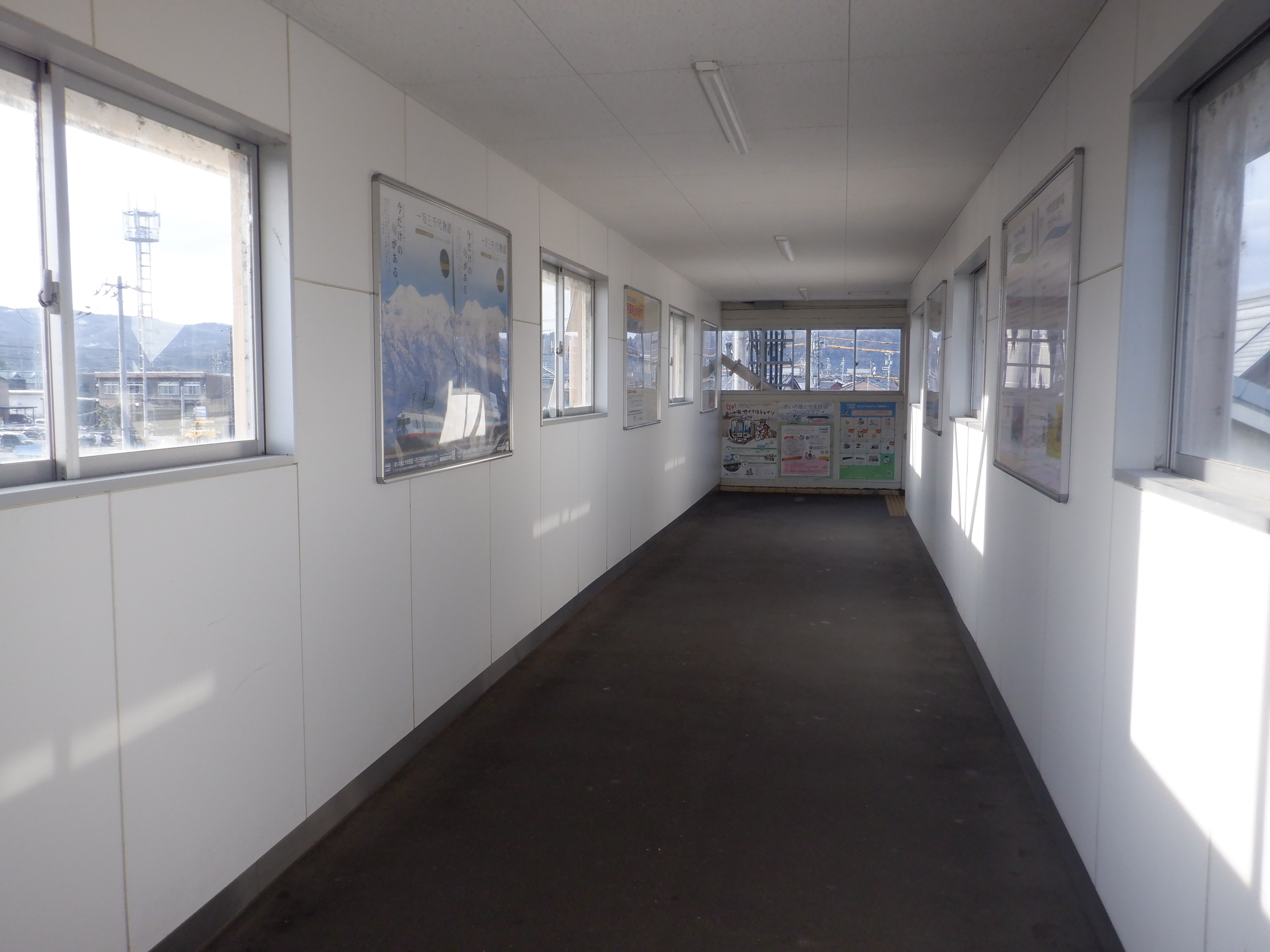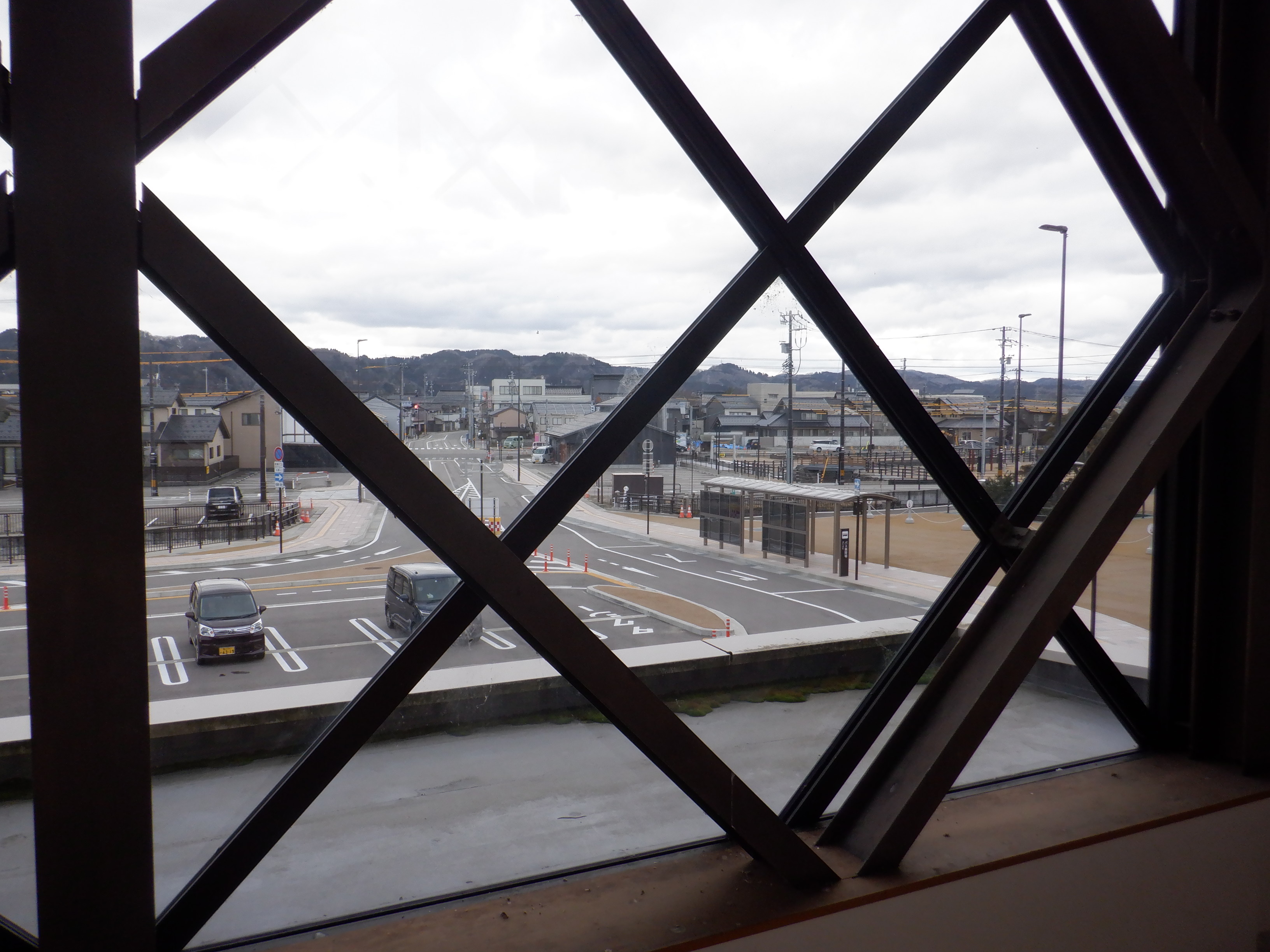 駅舎とにぎわい交流館の前の間で、エレベーター跨線橋ができるあたり。