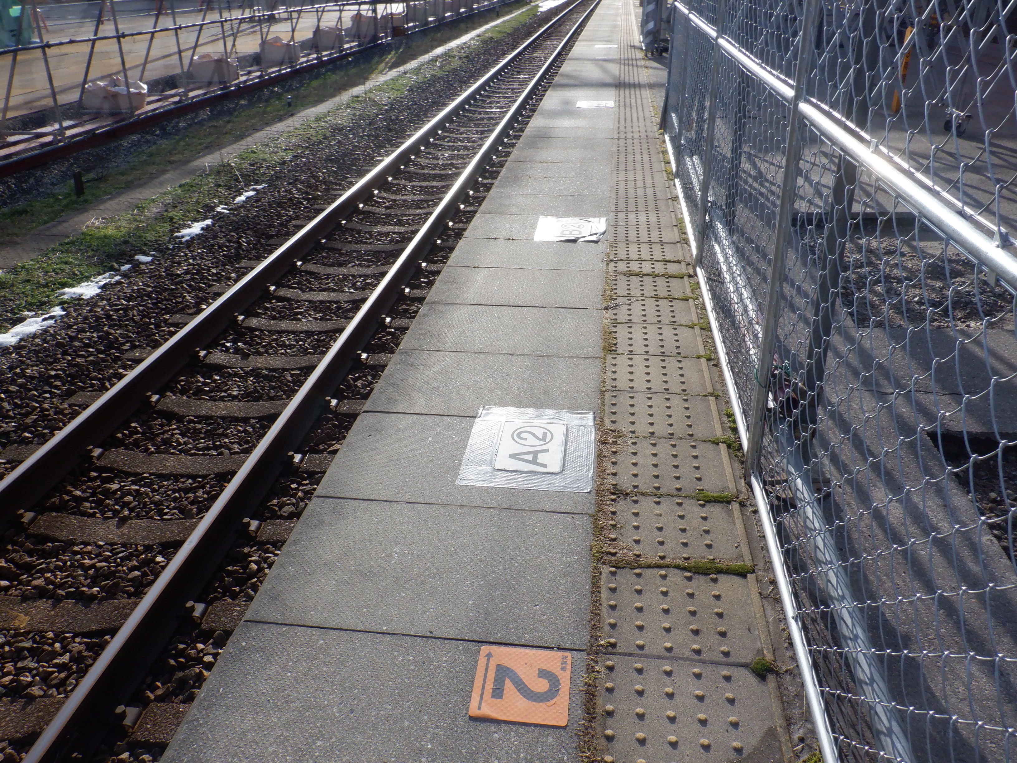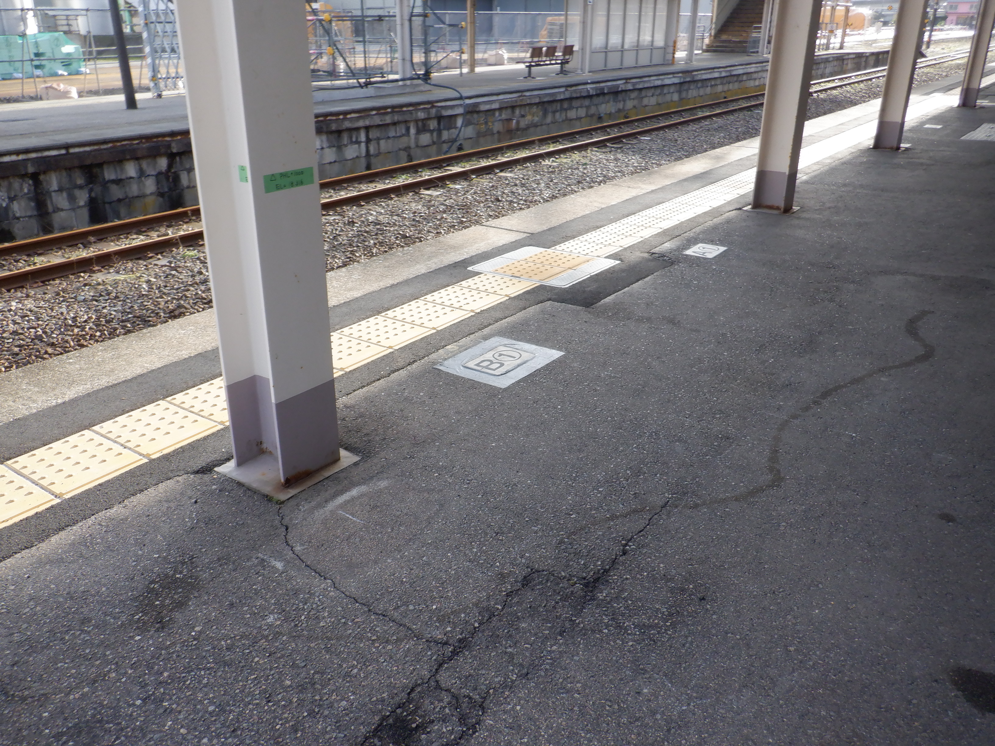 乗車位置案内が一部点字ブロックの外側に貼られていました。