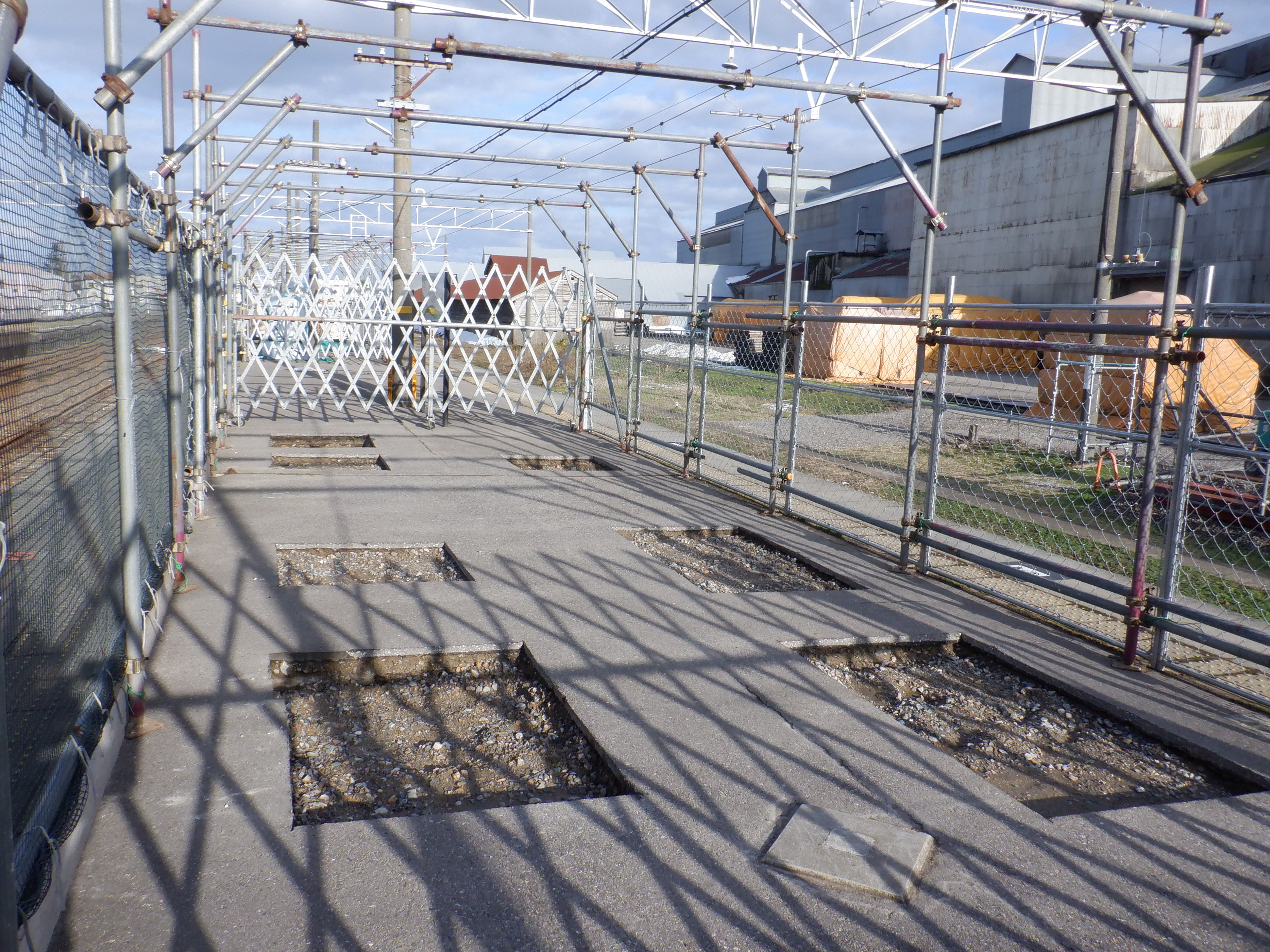 1番のりば駅舎付近から見た2・3番のりばエレベーター跨線橋建設の様子。