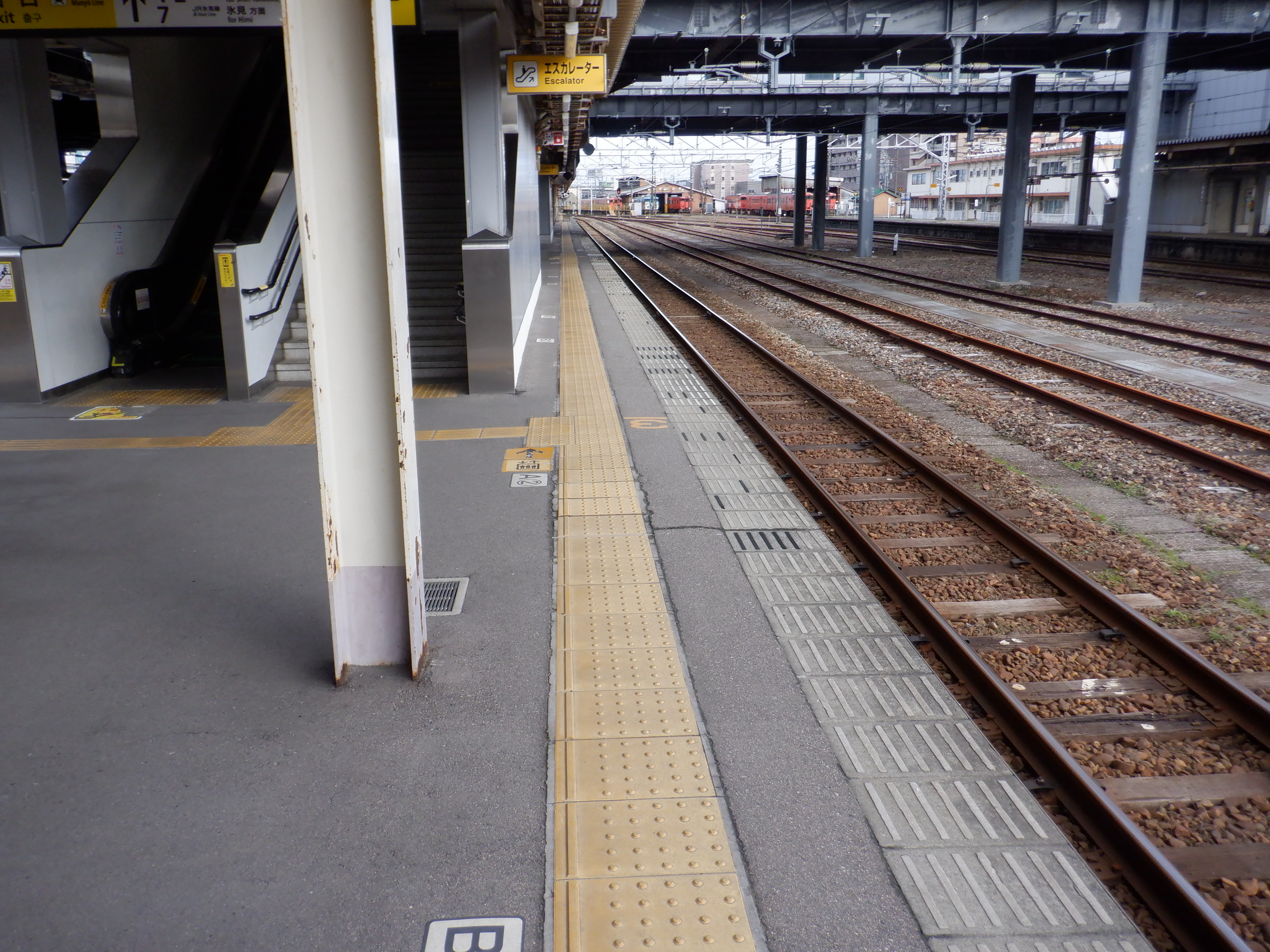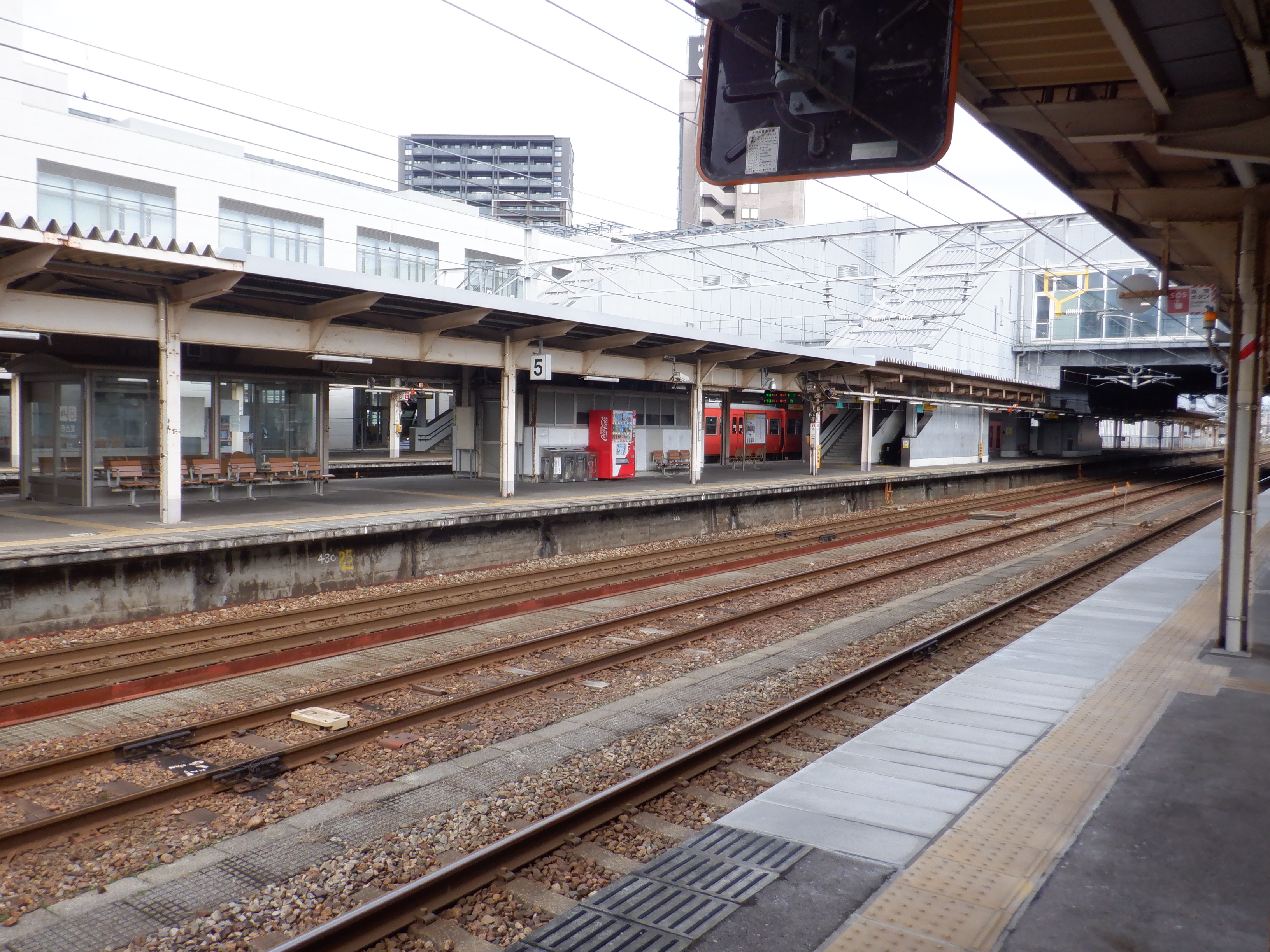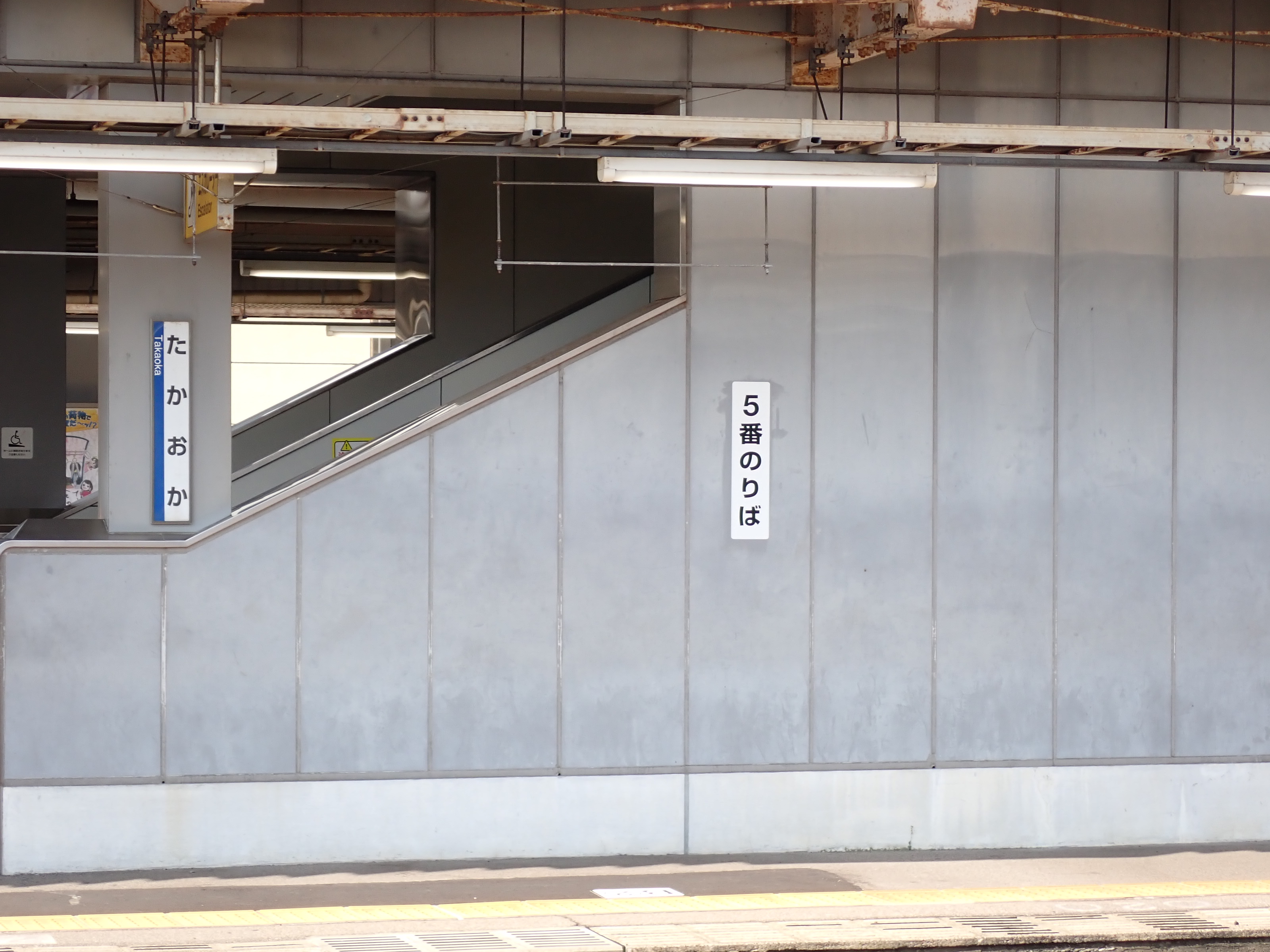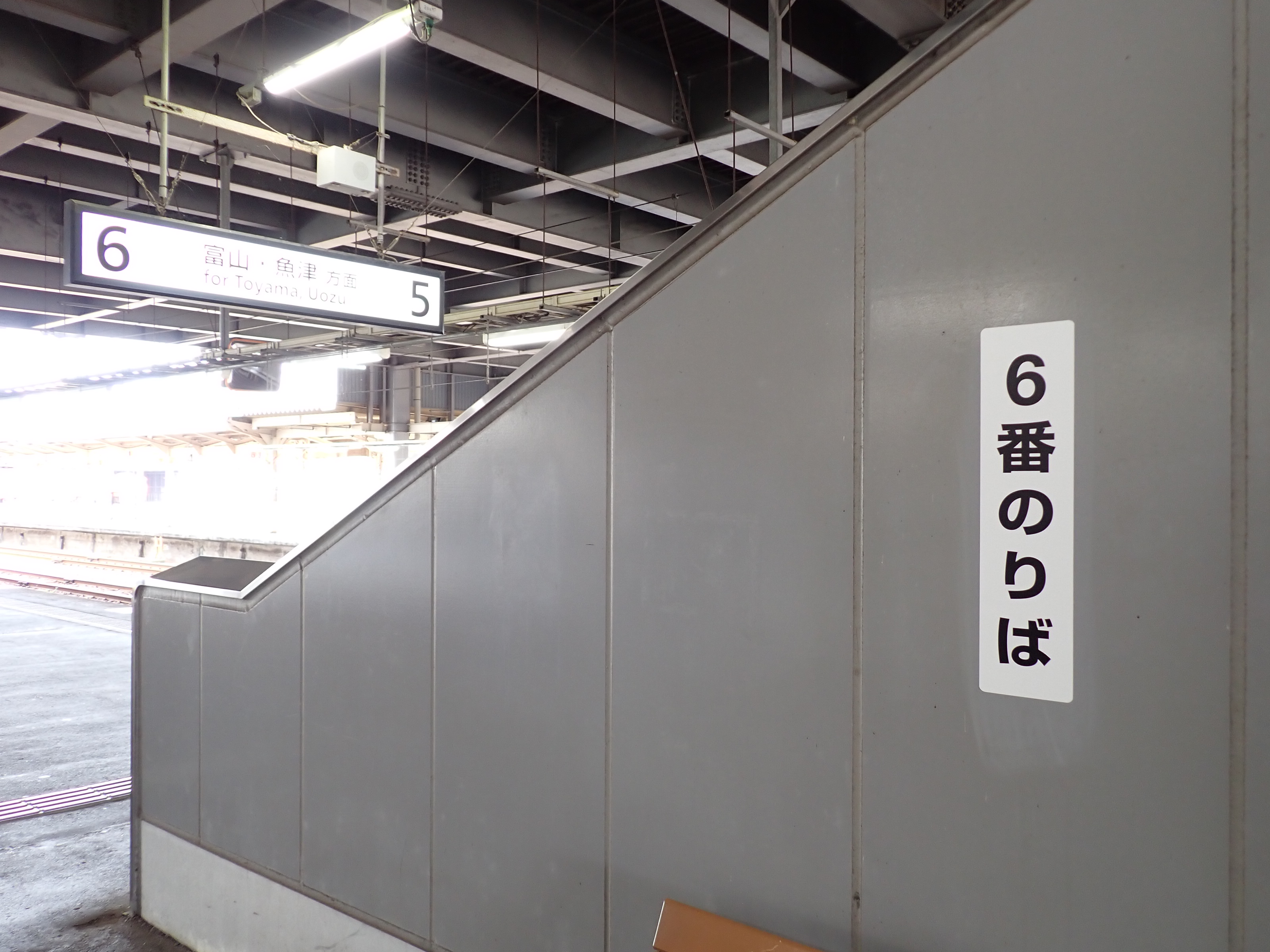 3・4番のりばから見た5番のりばの高岡やぶなみ駅側階段付近に貼られた番線標。