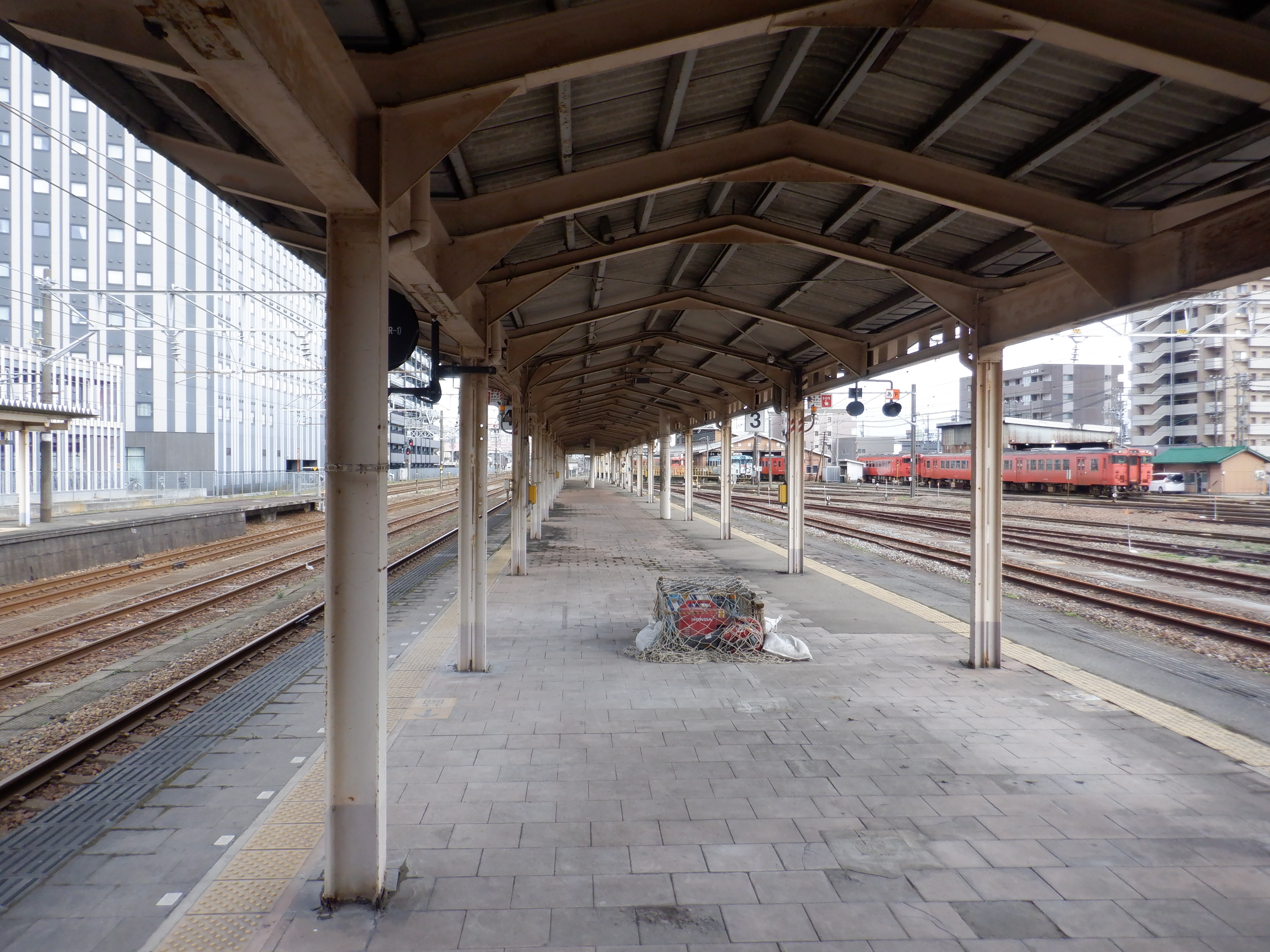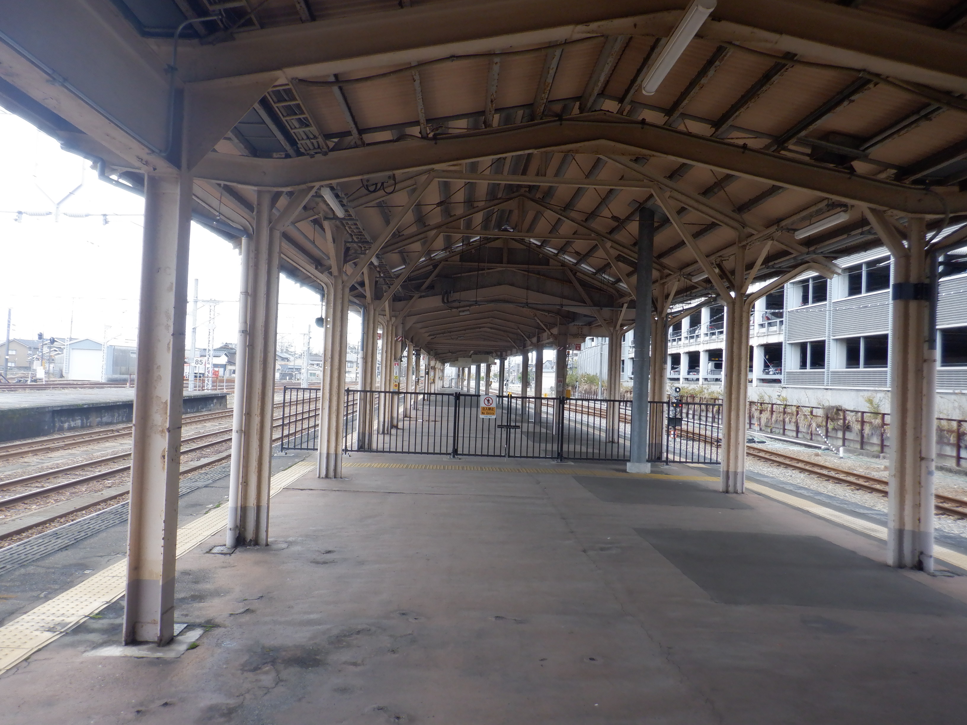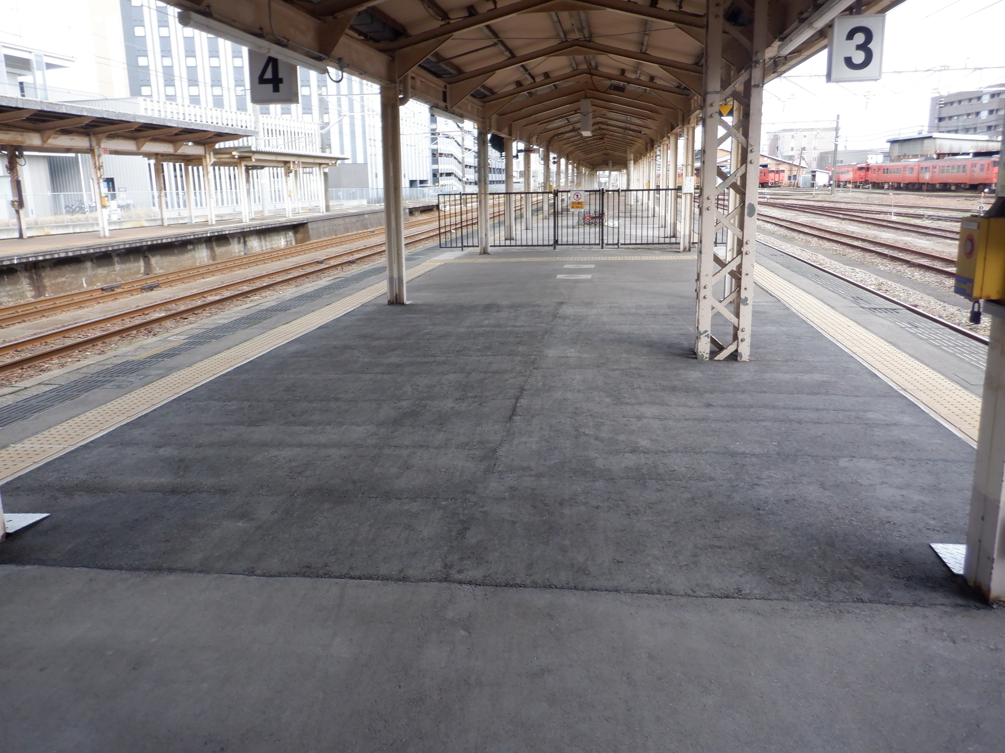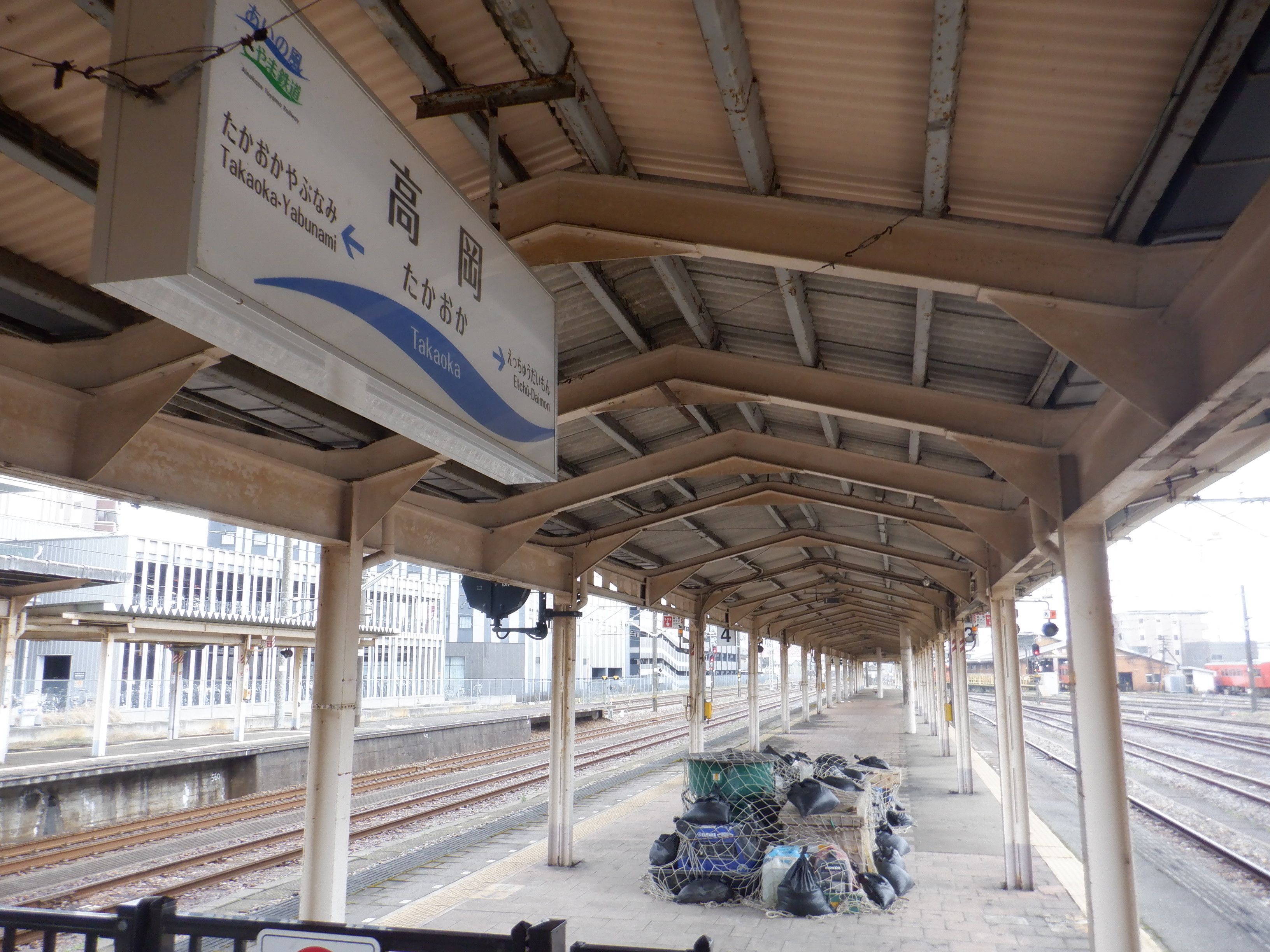 3・4番のりばの越中大門駅側。柵の外に何か資材が置かれています。