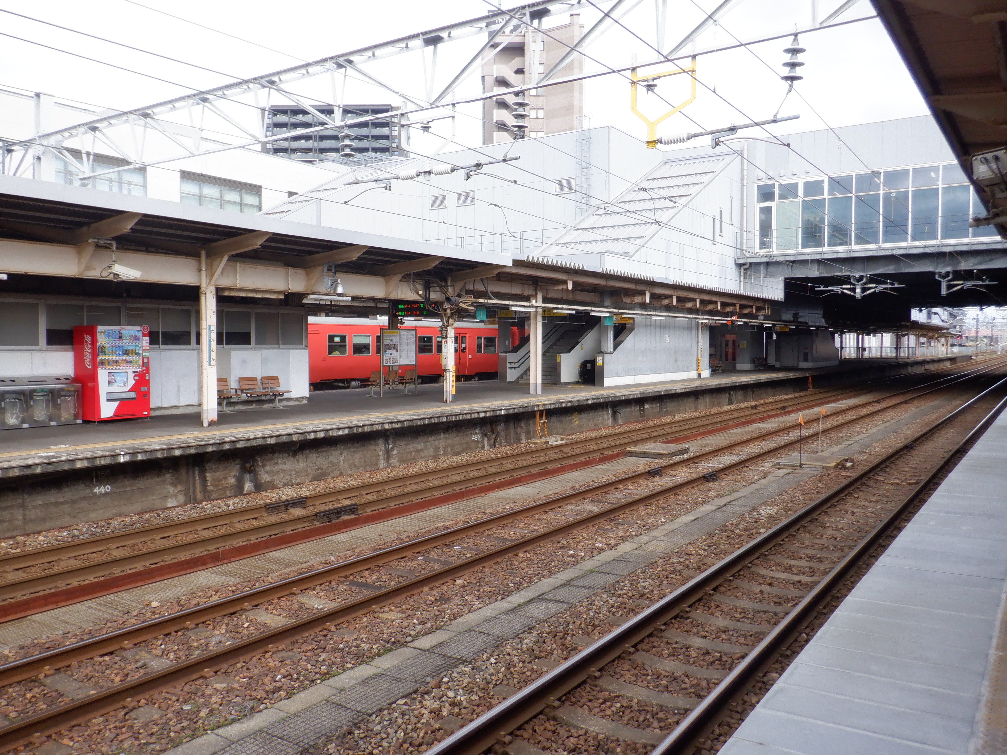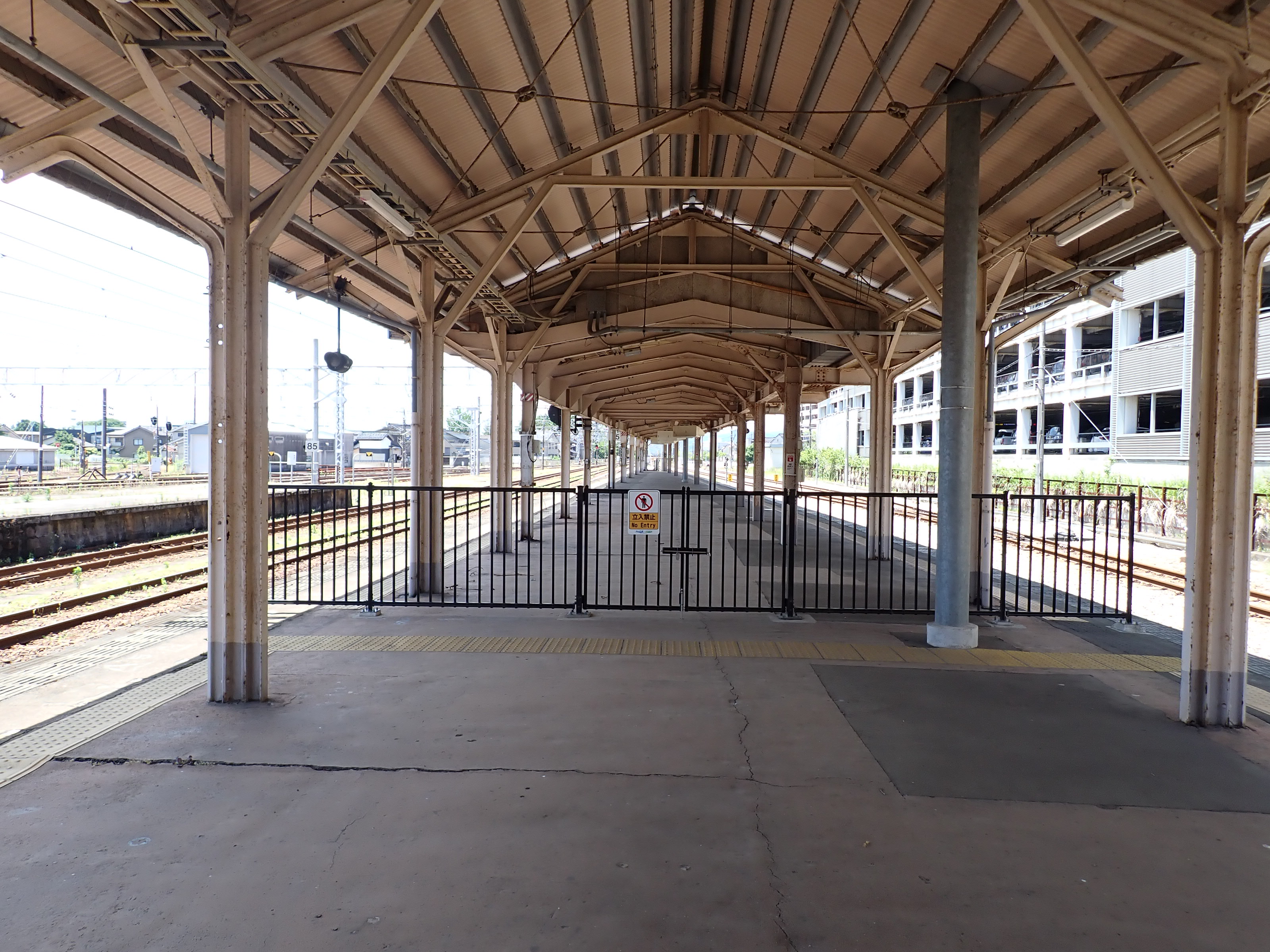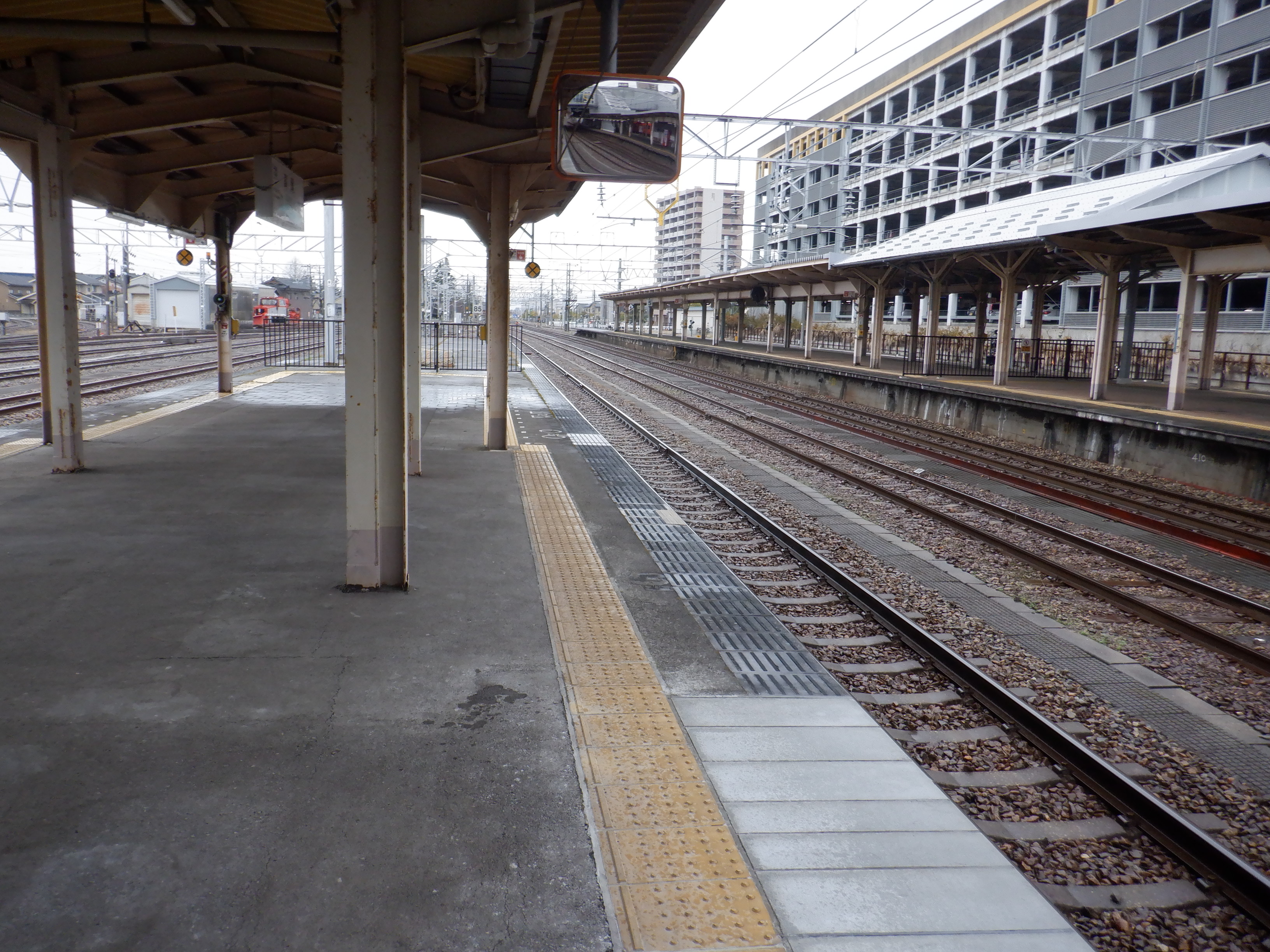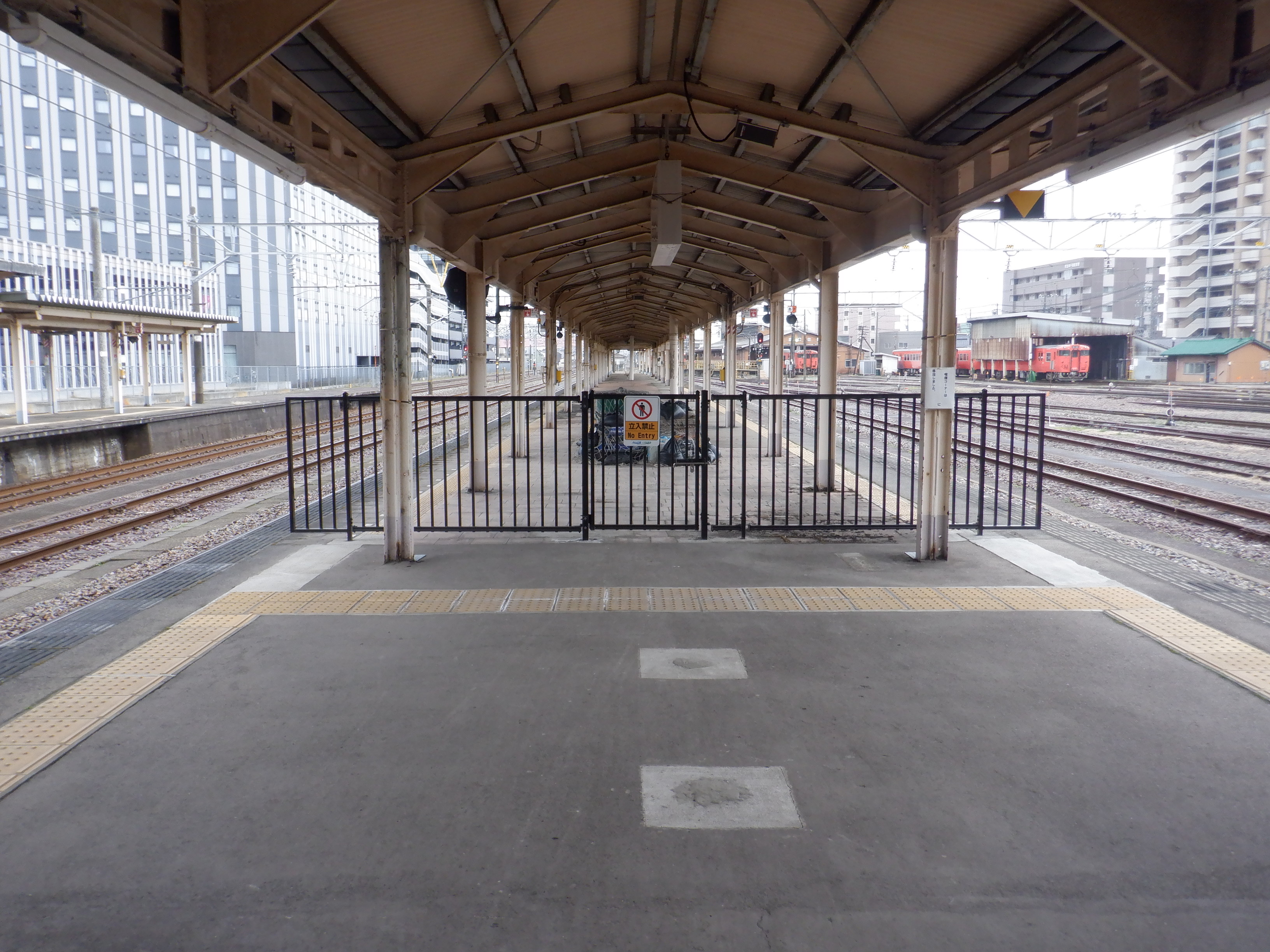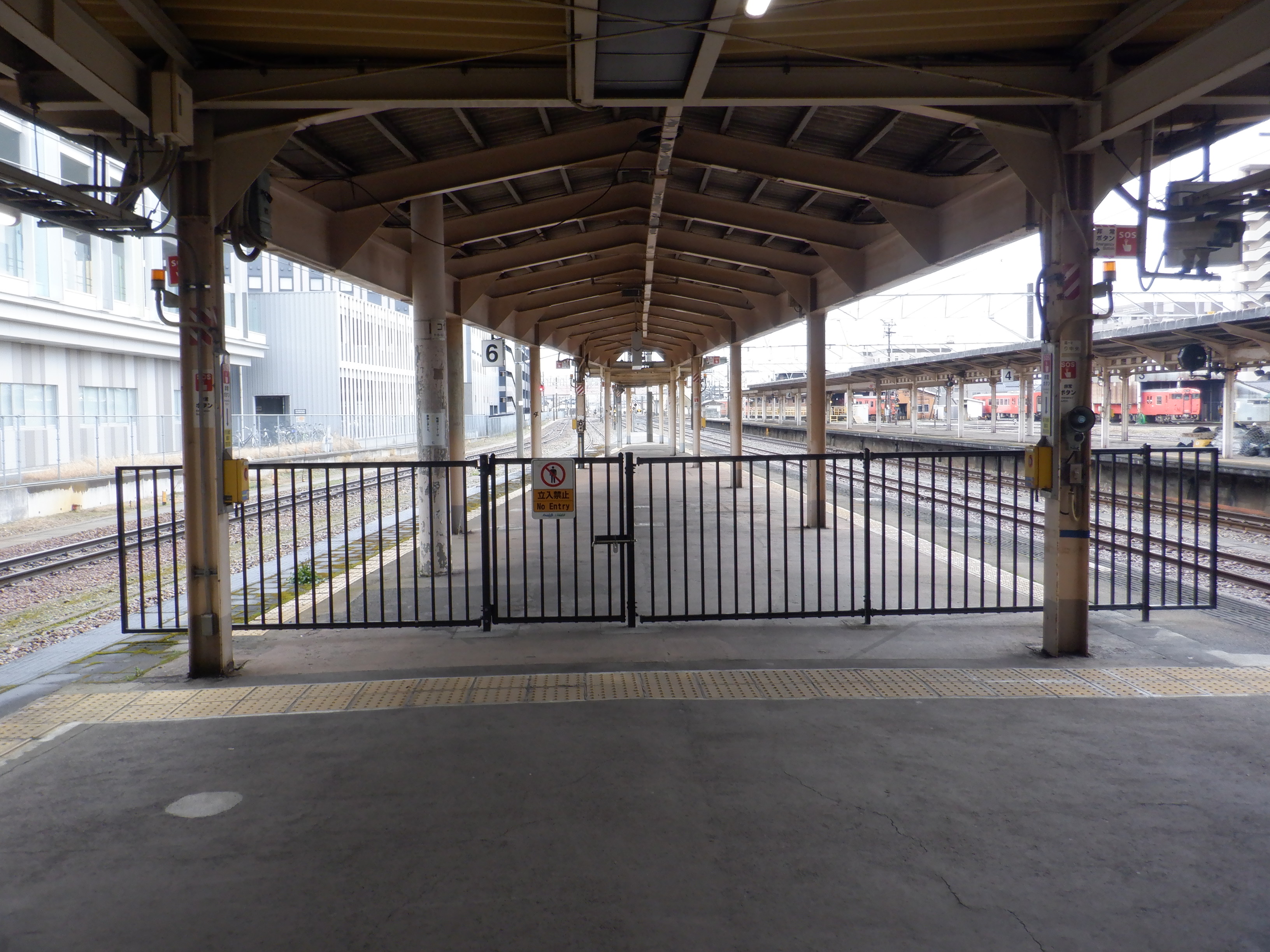 3・4番のりばの越中大門駅側。柵の外に何か資材が置かれています。